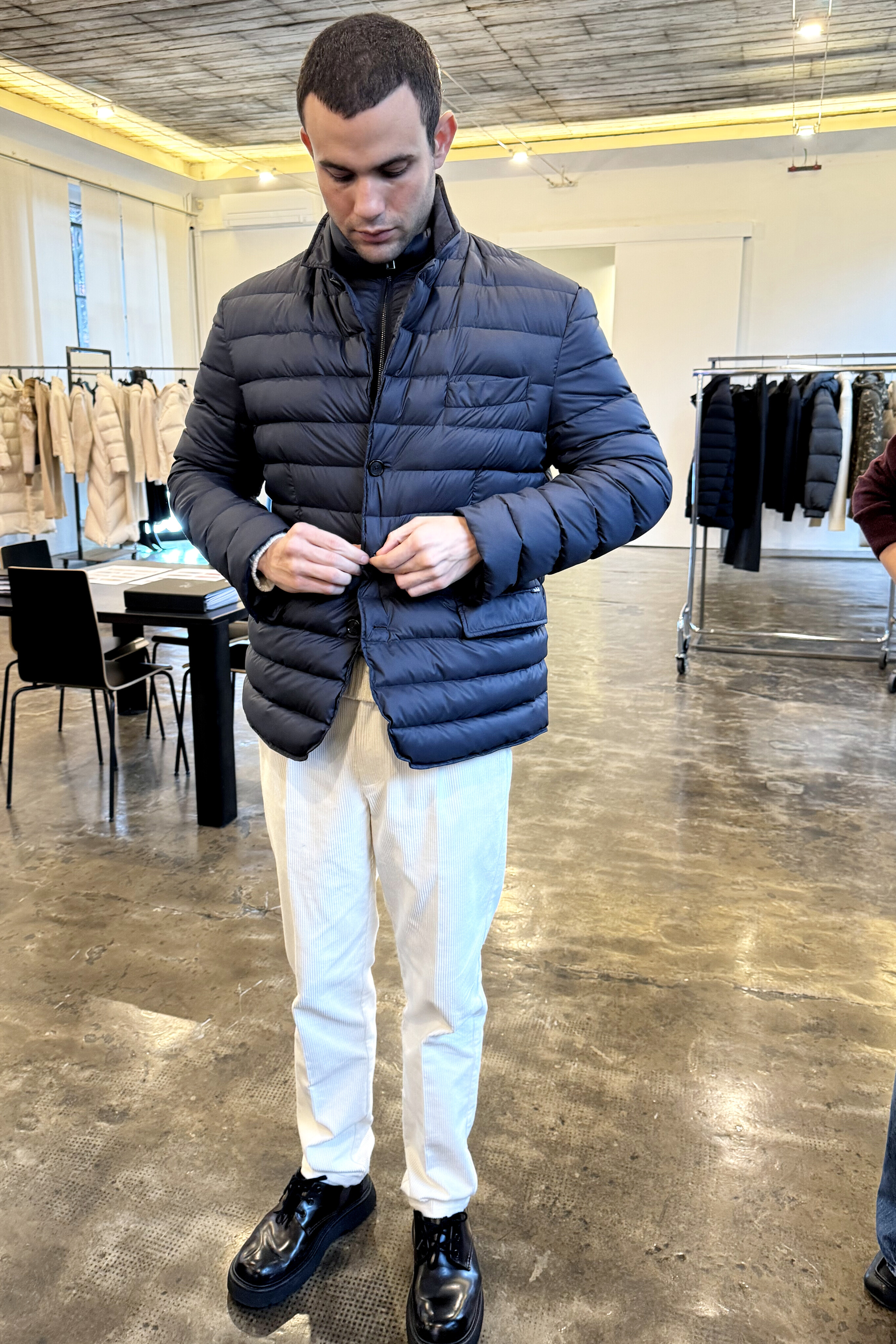 представляет собой стильное сочетание классического блейзера и функциональной стеганой куртки. Однобортная модель с лацканами, тремя пуговицами и карманами с клапанами. Встроенный воротник-стойка на молнии обеспечивает дополнительное тепло и современный многослойный образ. Идеально подходит для создания элегантного, но в то же время непринужденного образа в межсезонье.