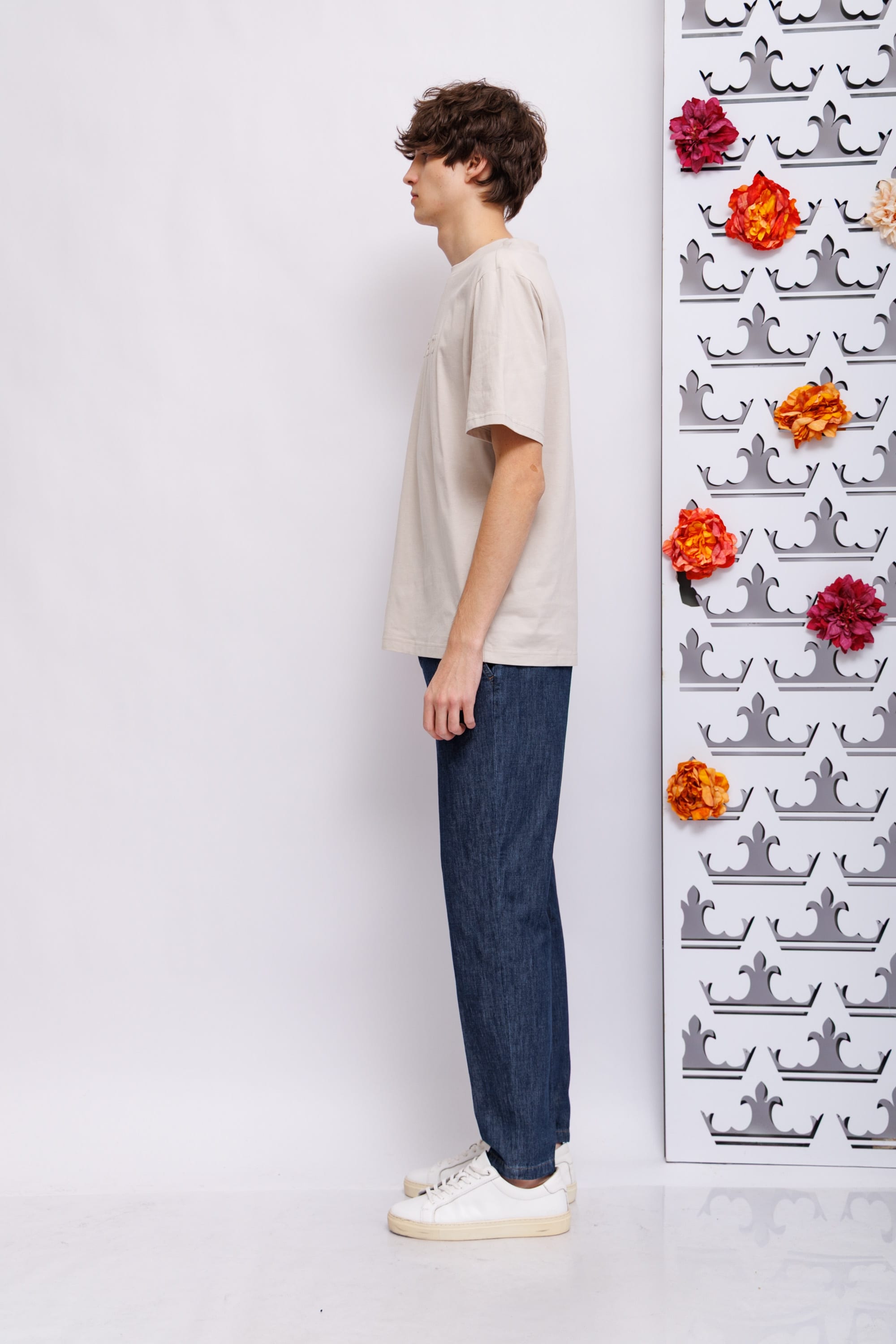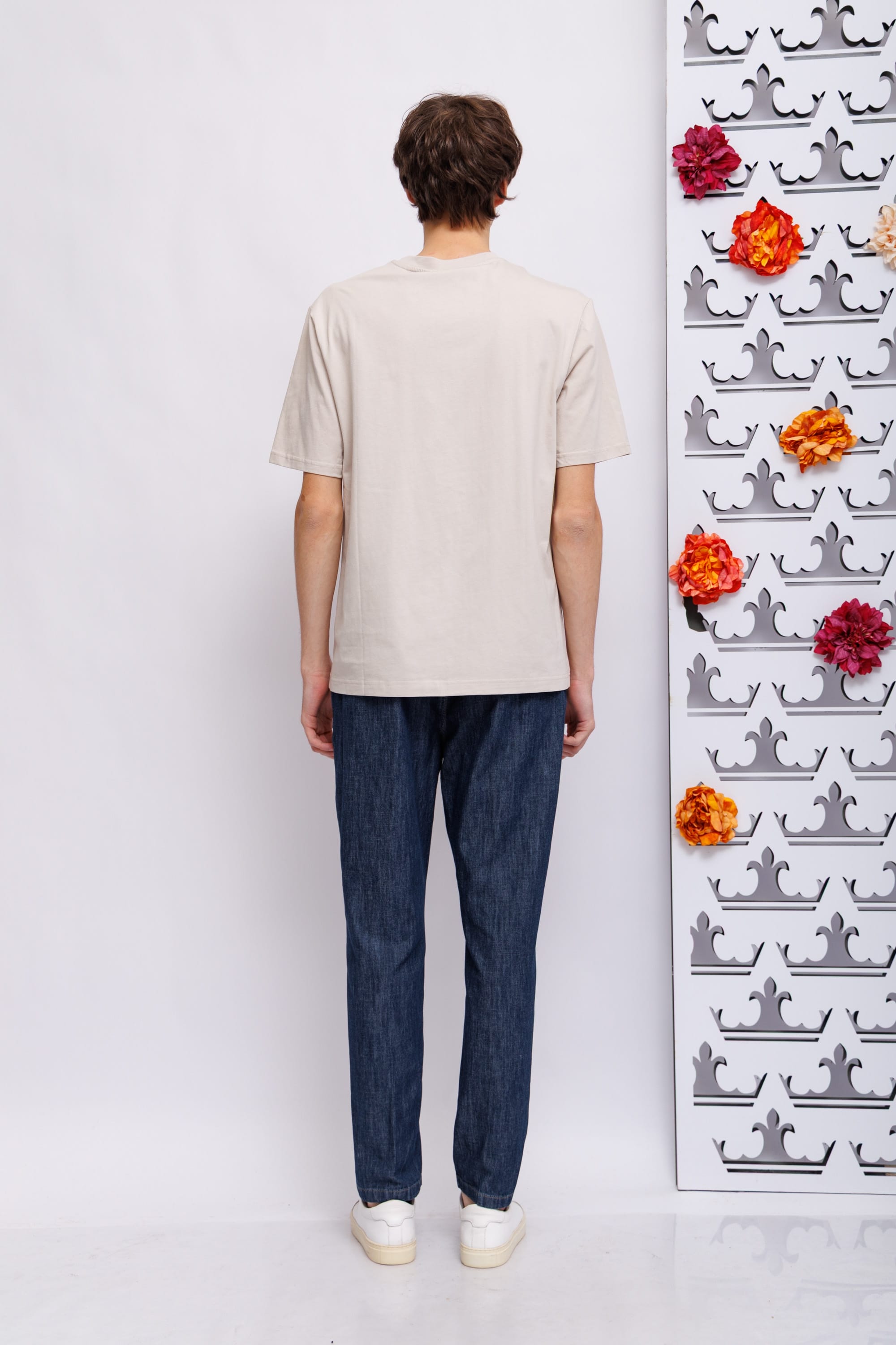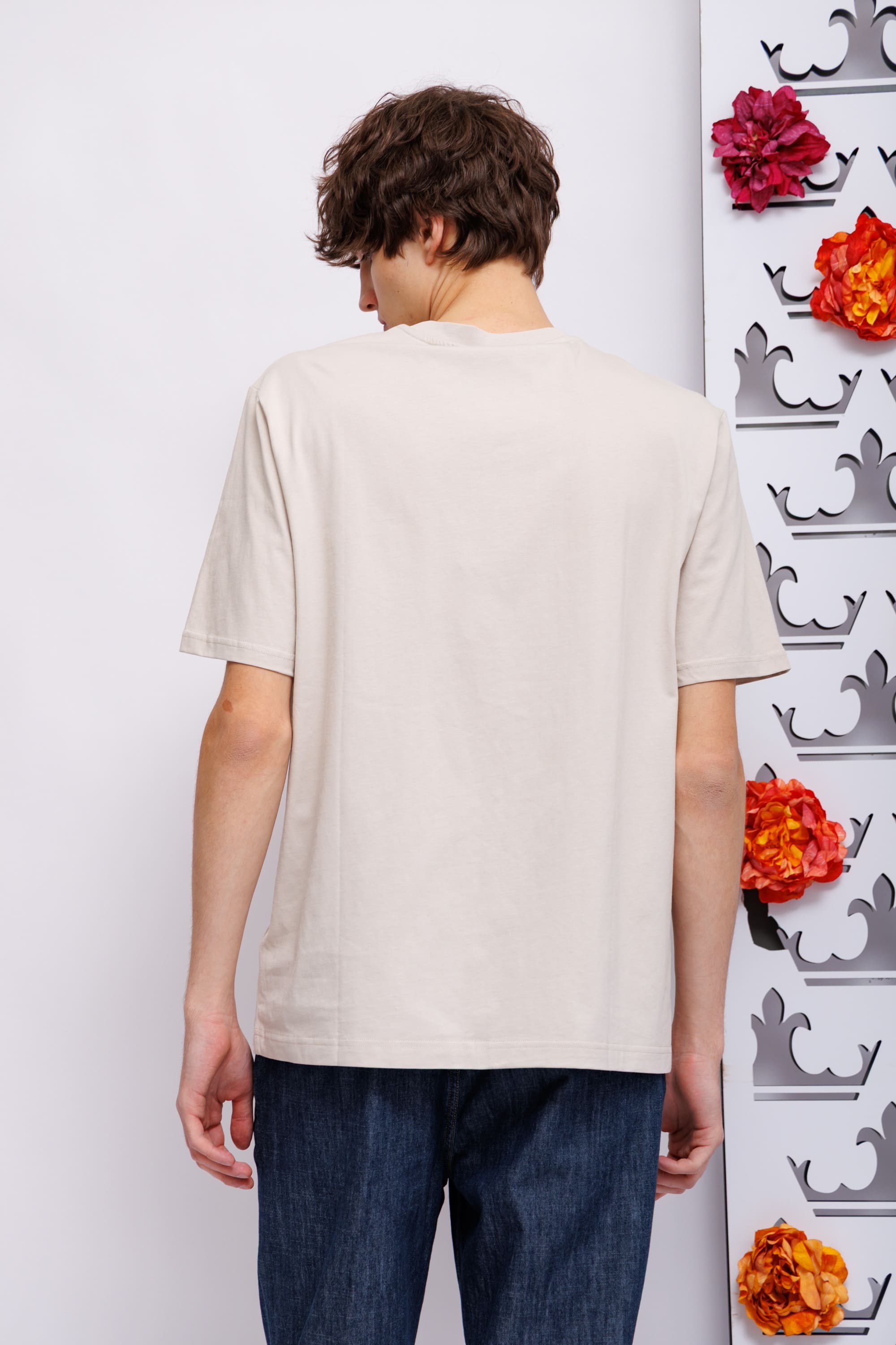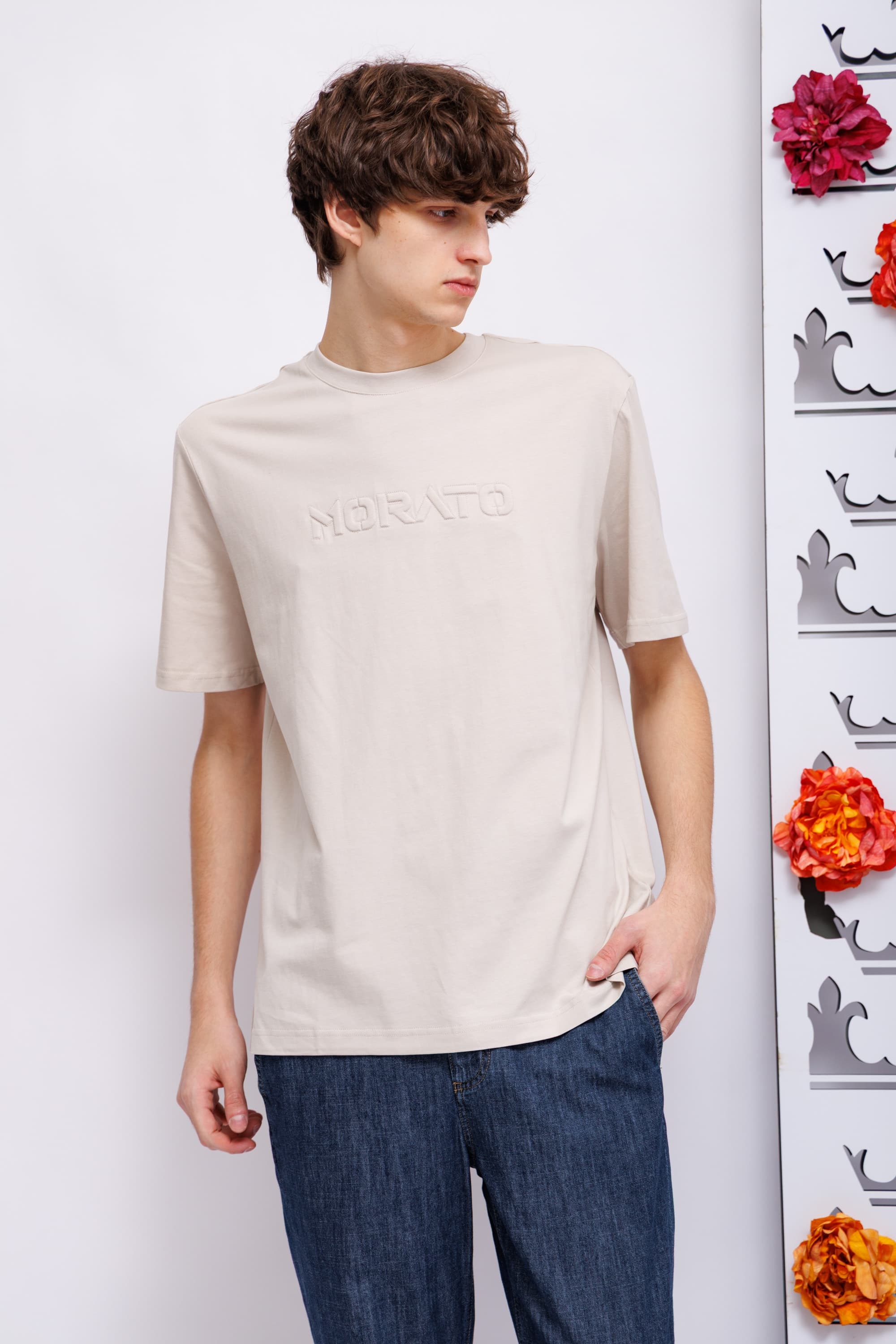 Футболка холодного бежевого цветаКруглый вырезКороткие рукаваПрямой кройНа груди- логотип