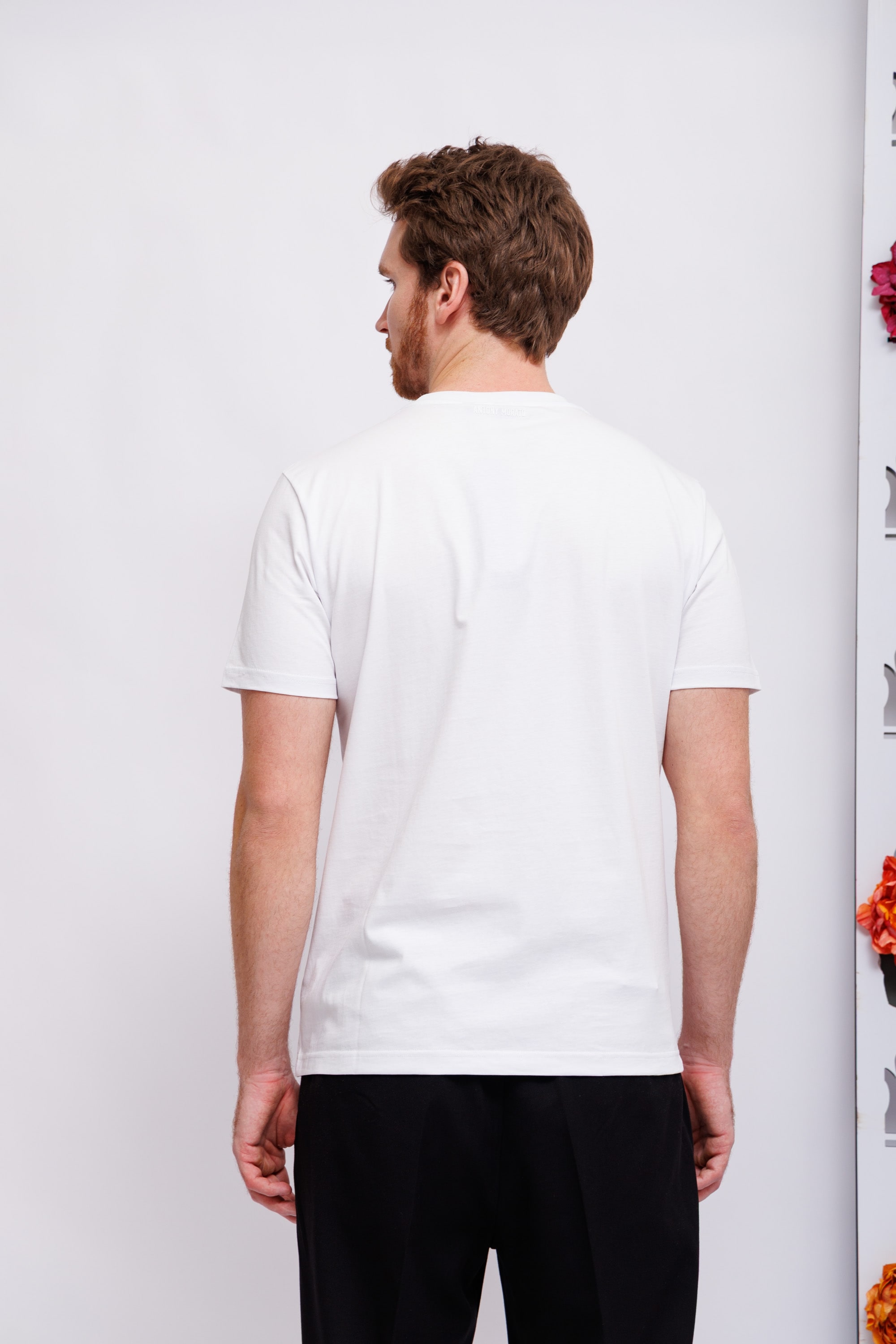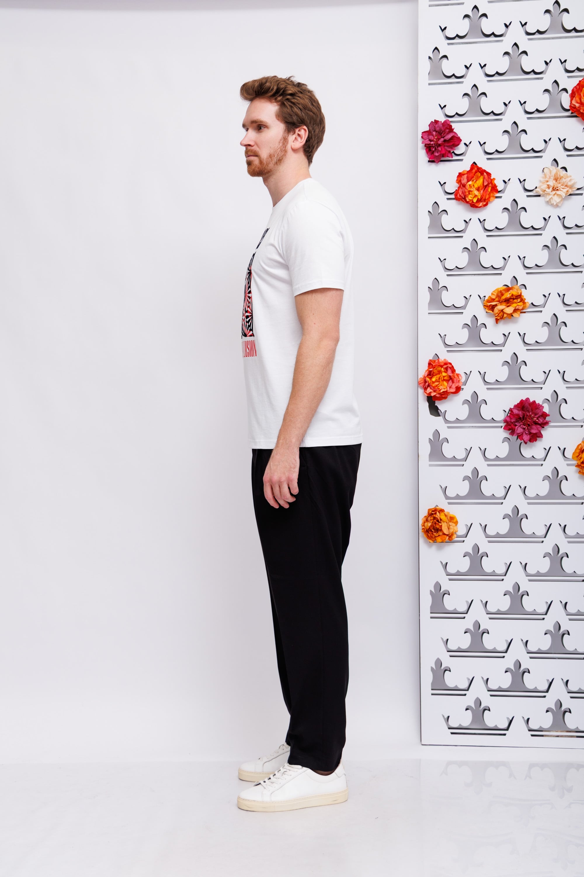 Футболка белая с чёрно-красным узором и надписью, посвящёнными легендарной группе Guns'n'RosesКруглый вырезКороткие рукаваСлегка приталенный крой