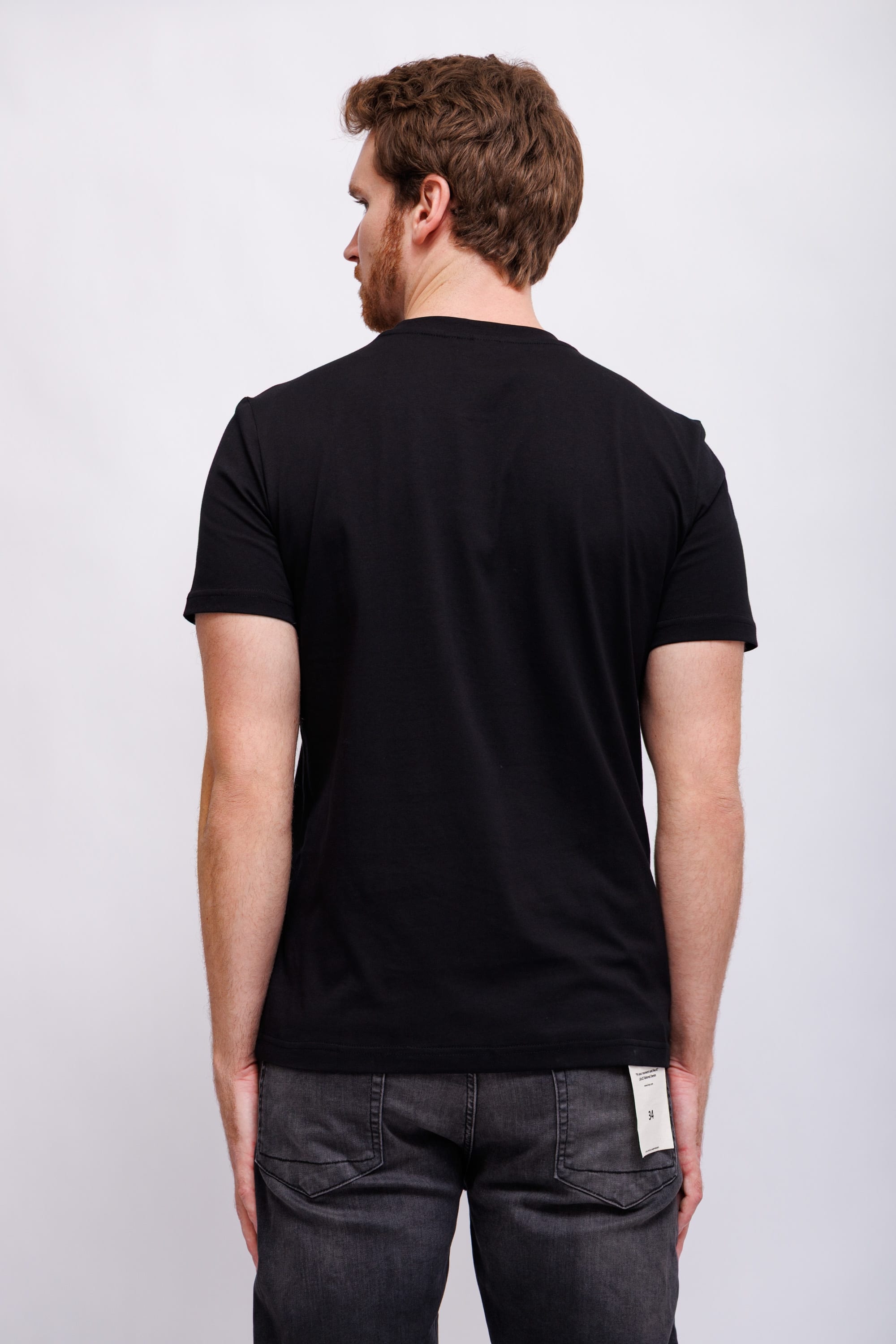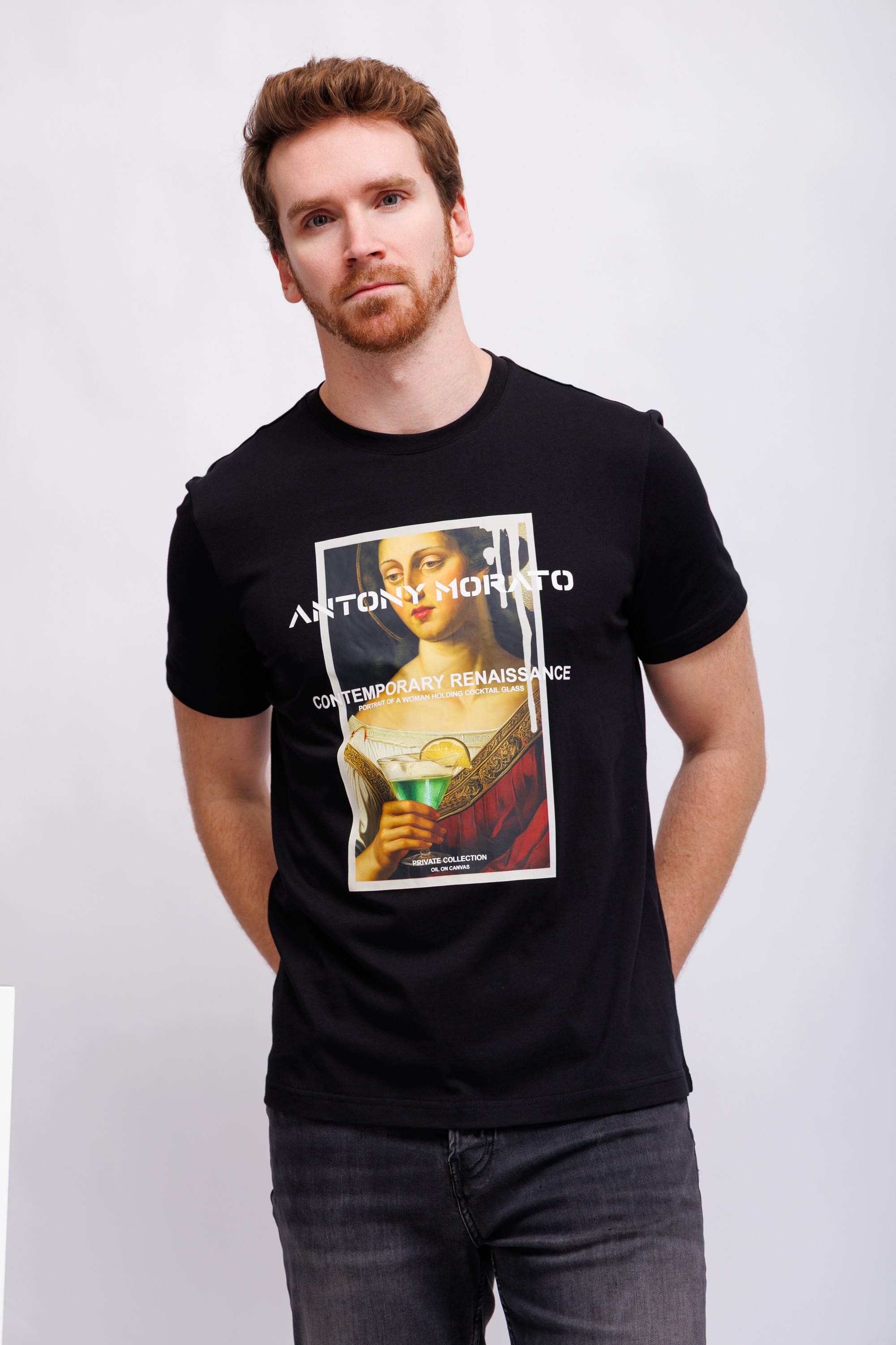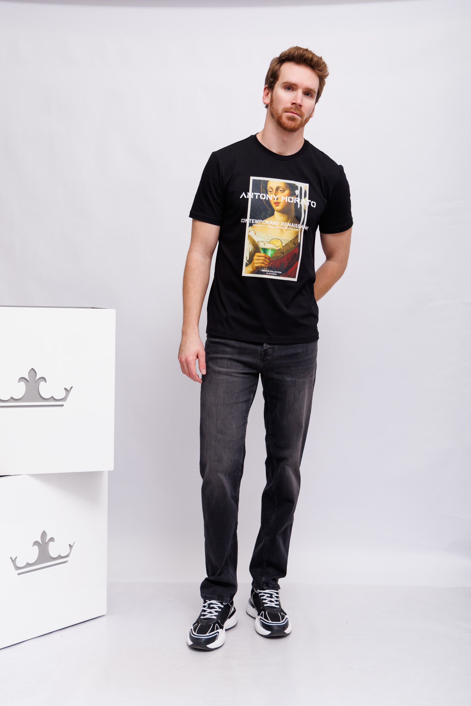 Футболка чёрная с картиной спереди Круглый вырезКороткие рукаваСлегка приталенный крой