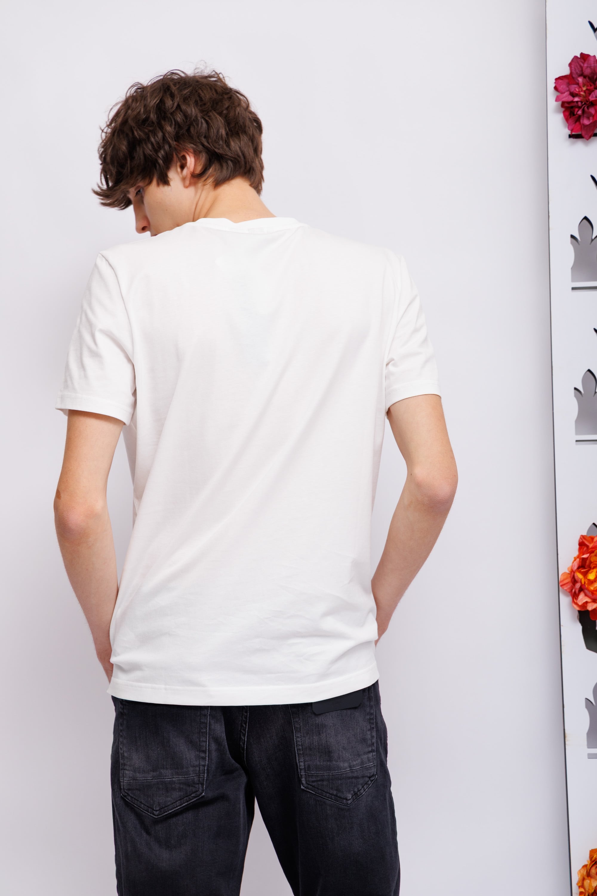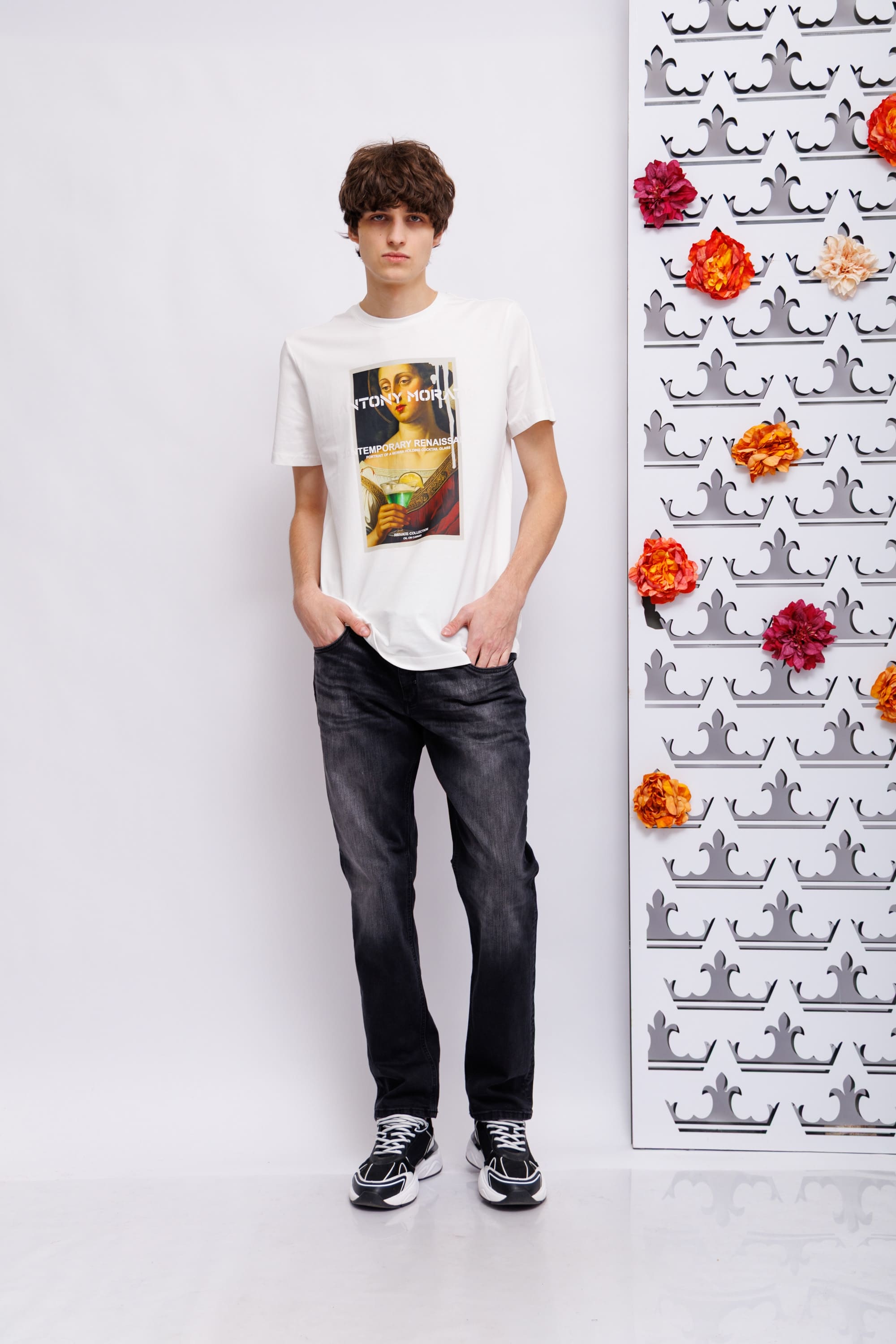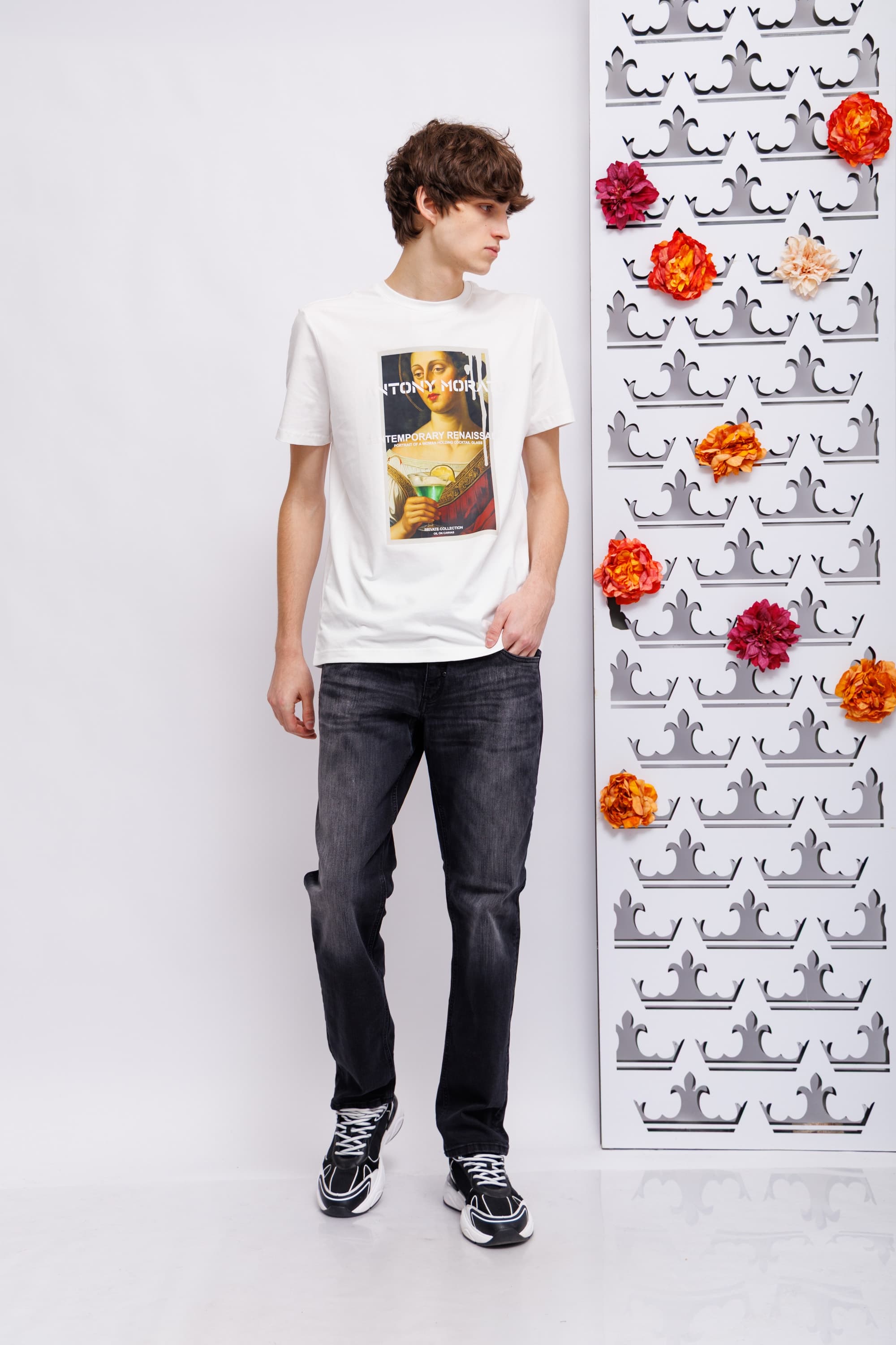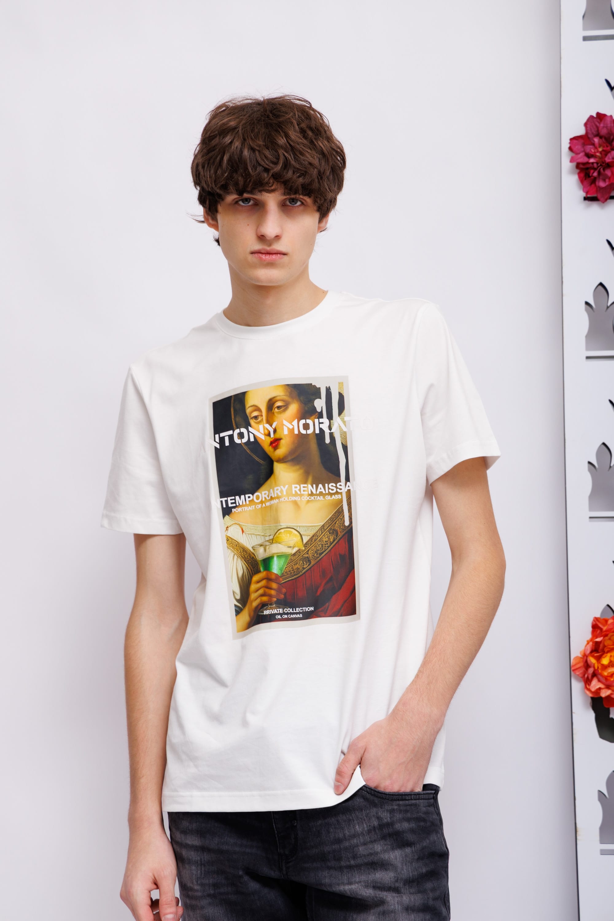 Футболка белая с картиной спереди Круглый вырезКороткие рукаваСлегка приталенный крой