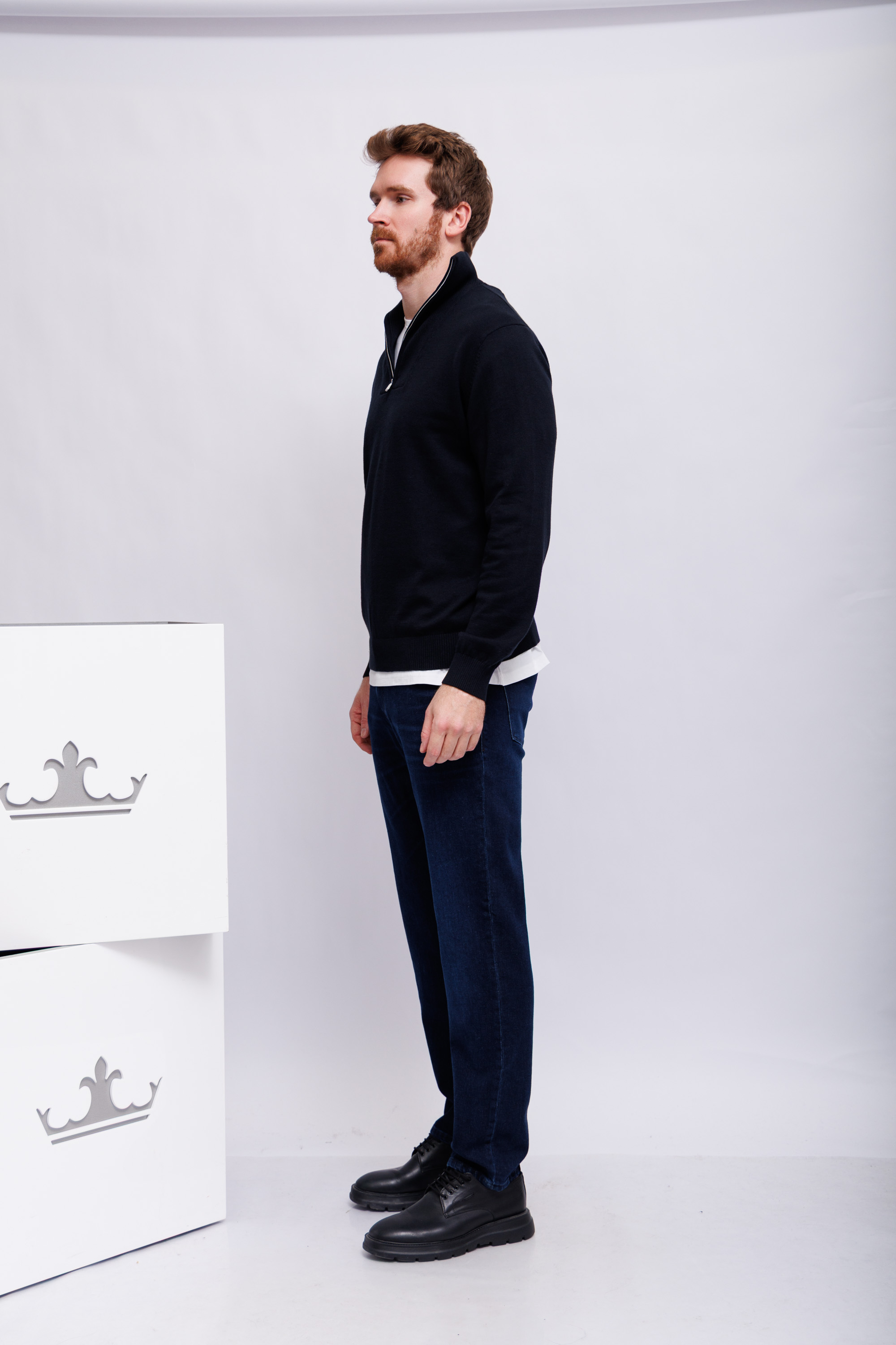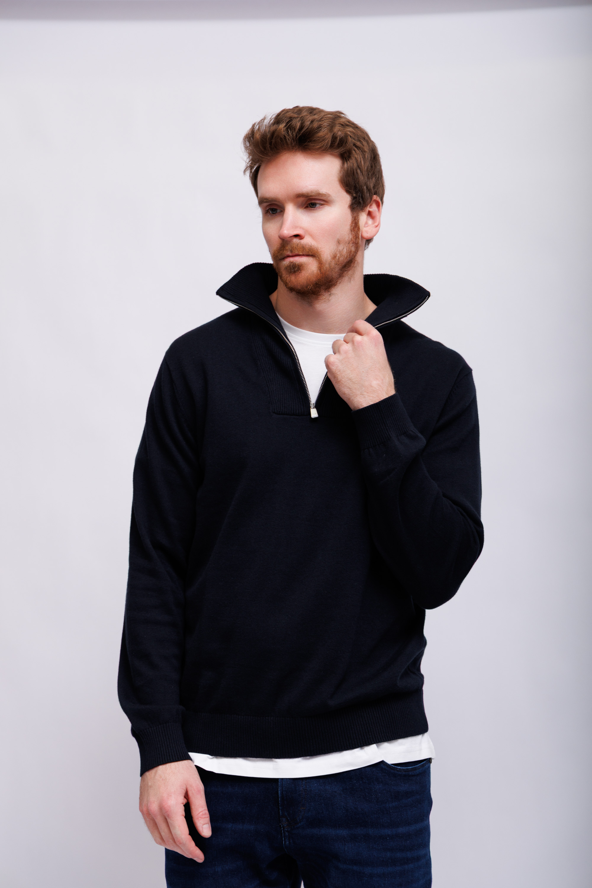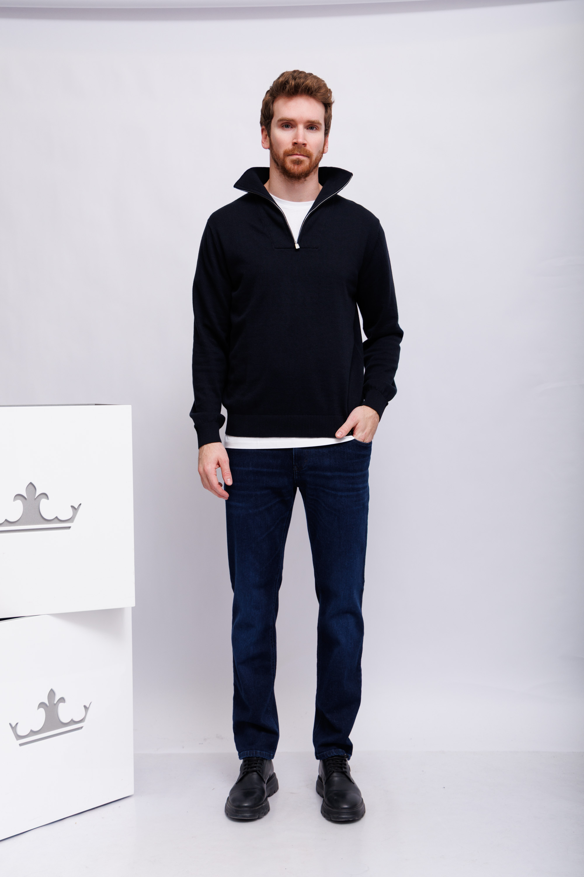 Свитер тёмно-синийВорот-стойка на молнииДлинные рукаваКрой прямойМанжеты,ворот и низ изделия-эластичный ребристый трикотаж