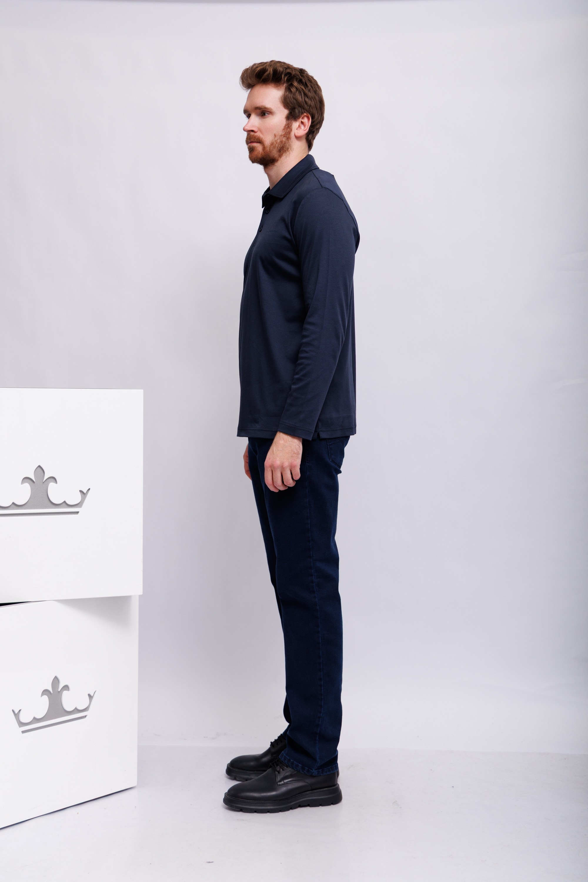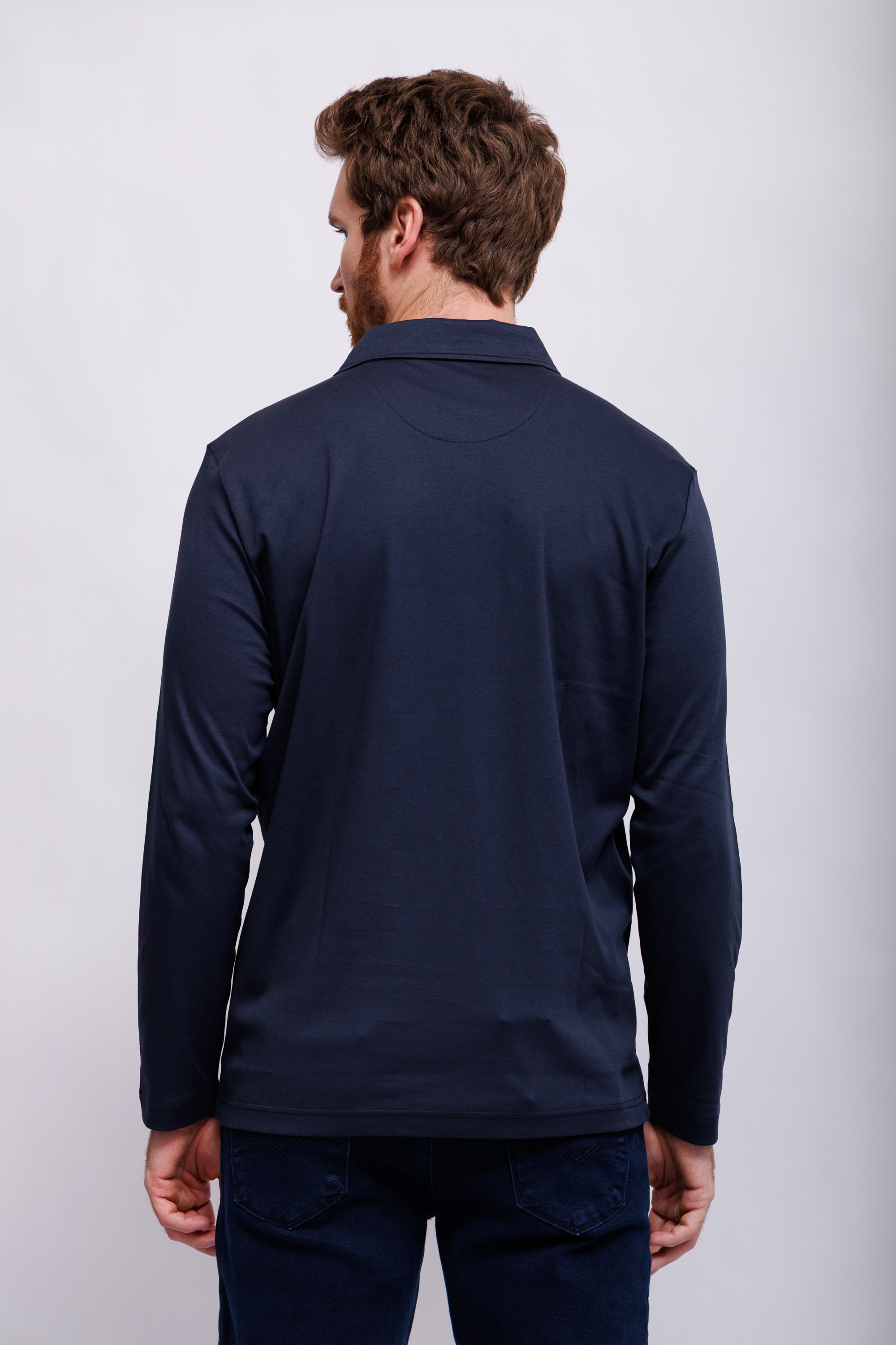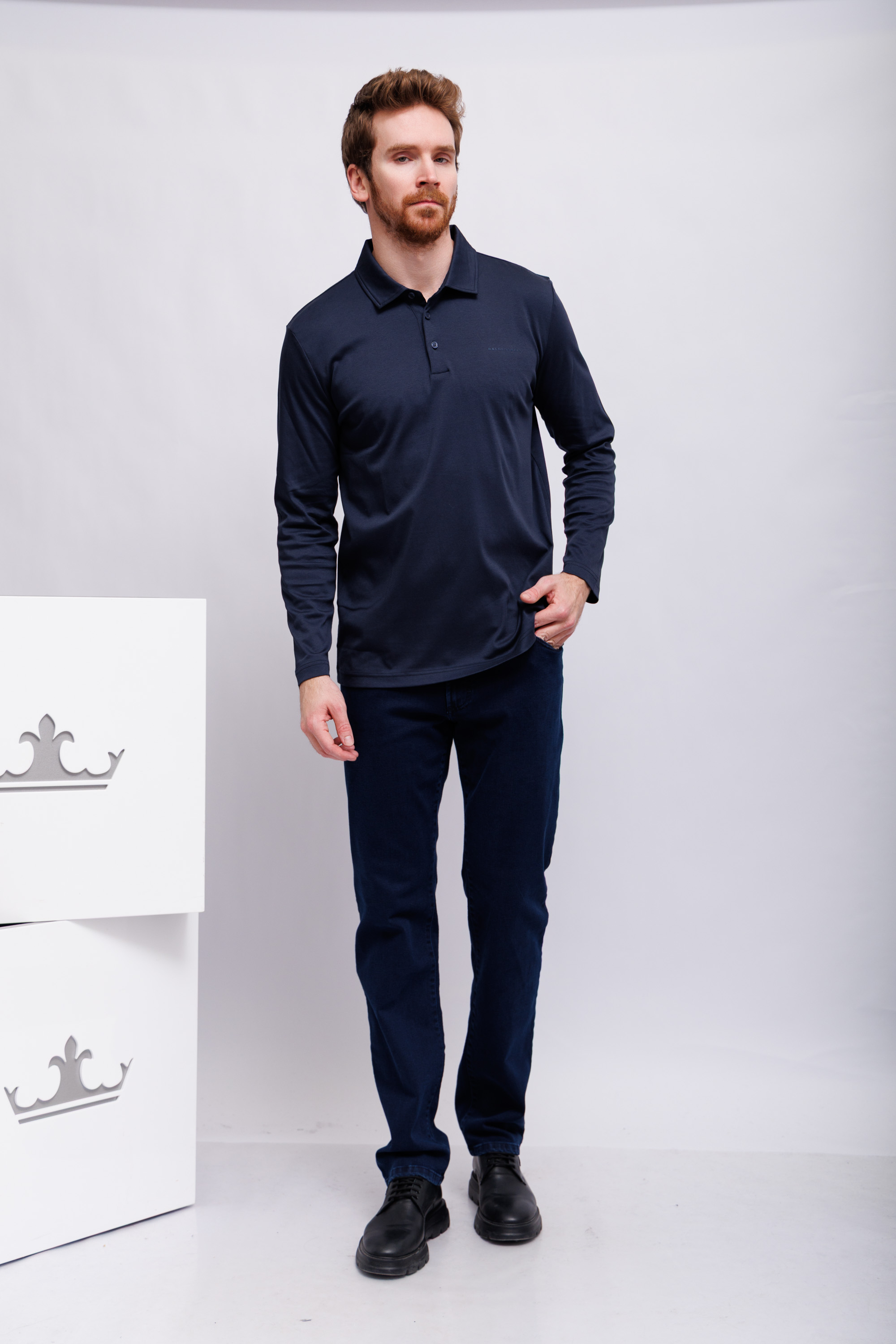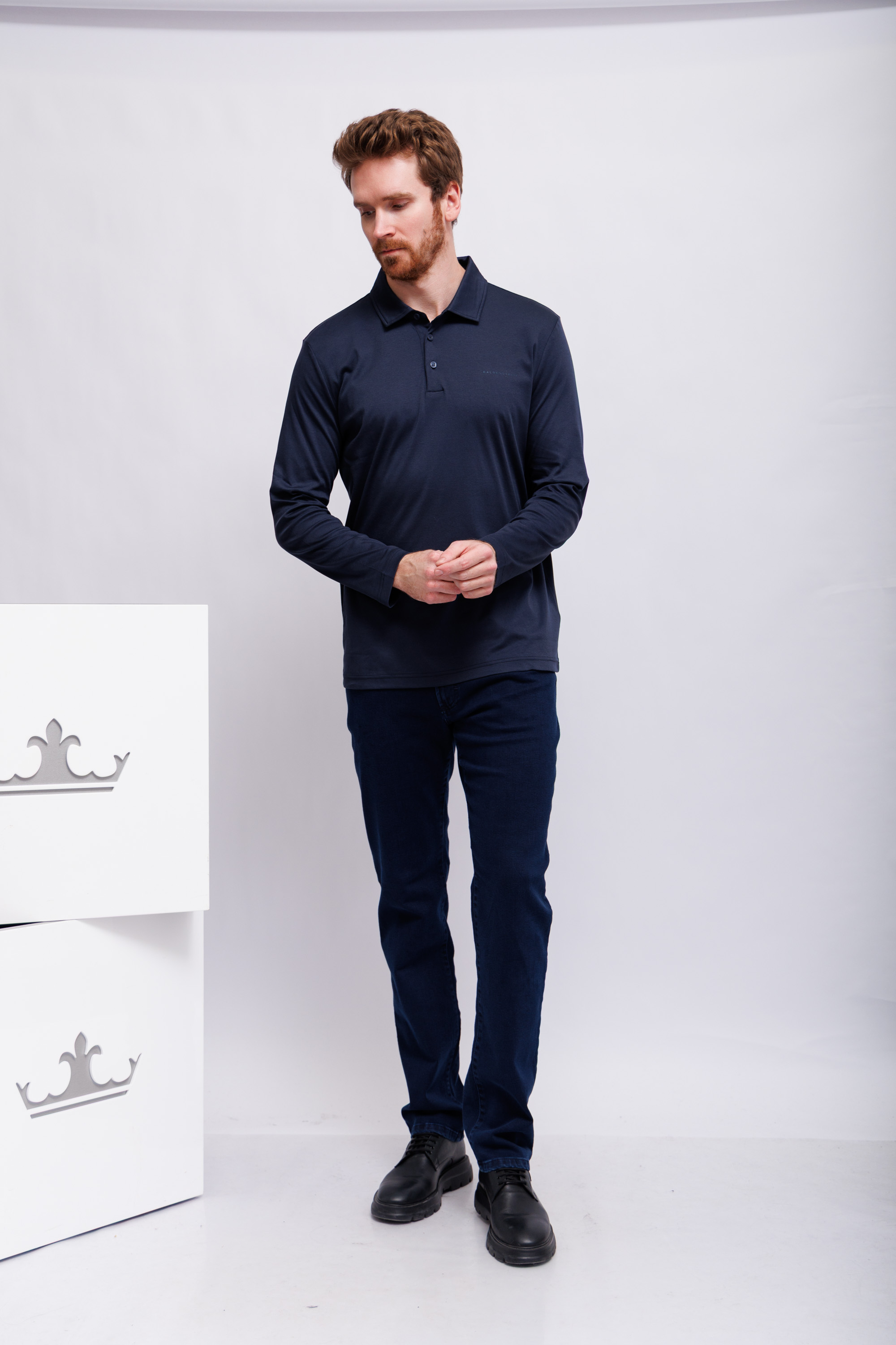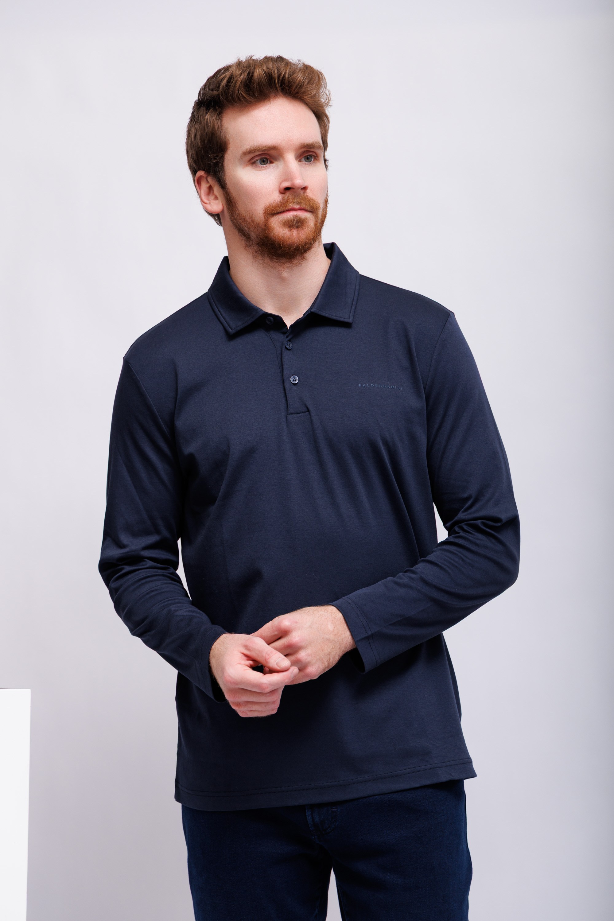 Поло тёмно-синие хлопковоеНа груди- логотип в тонПрямой кройВорот на пуговицахДлинные рукаваПо бокам-небольшие разрезы