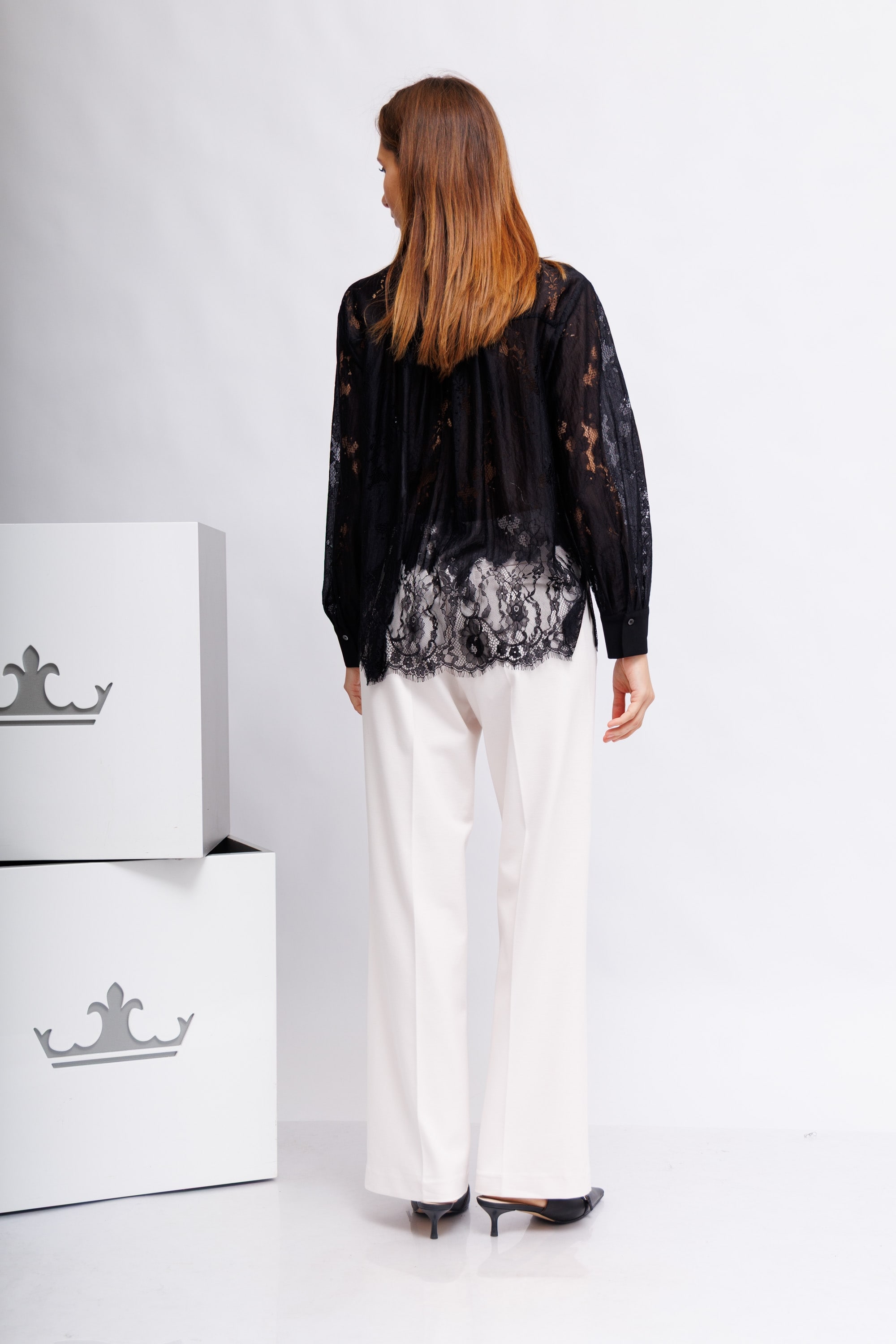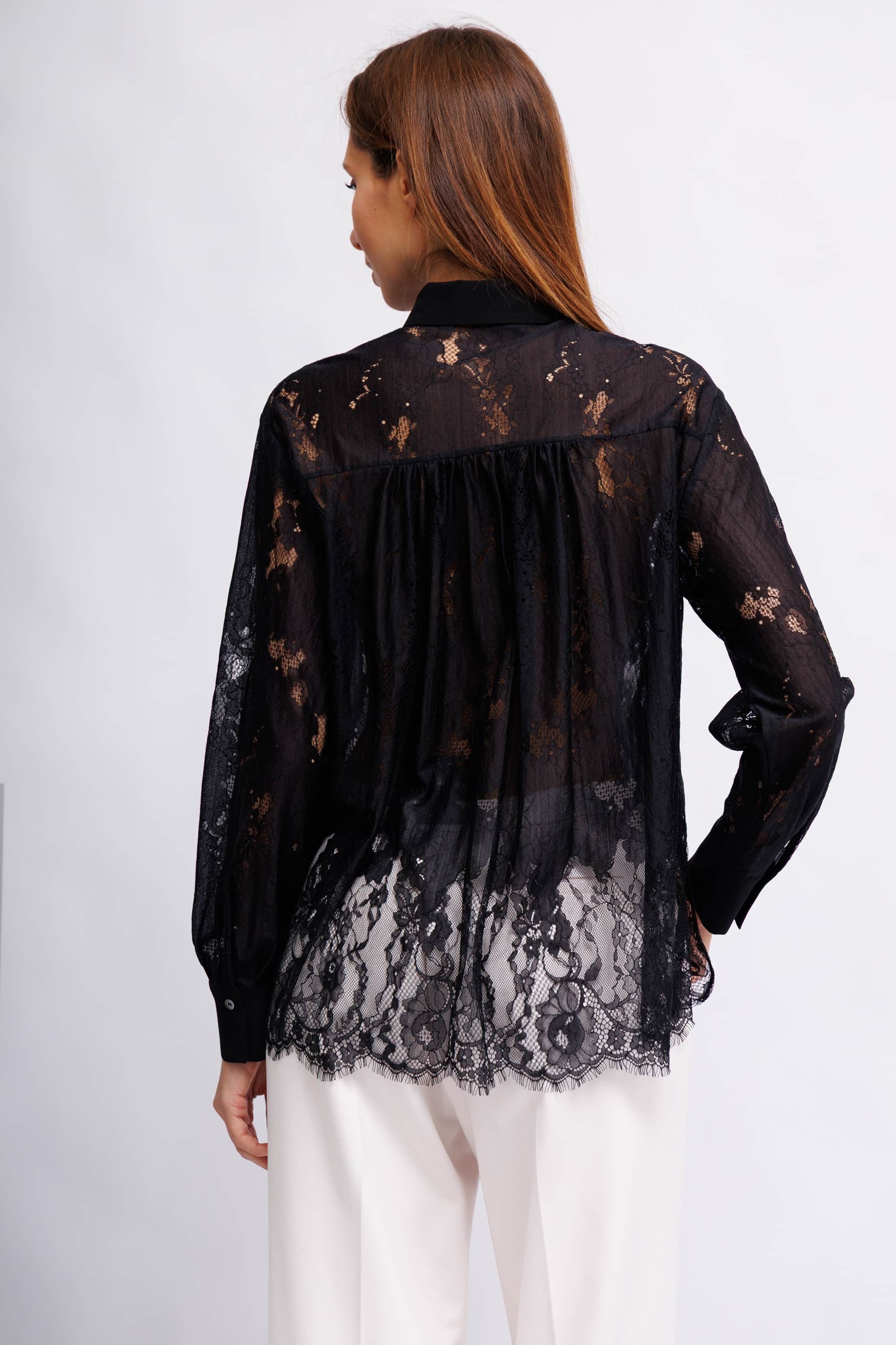 Эта рубашка с изысканным силуэтом изготовлена из кружева шантильи. Она имеет традиционный воротник, застежку спереди и манжеты из шелковой смеси в тон. Длинные рукава и кокетка на спине завершают дизайн. Идеально сочетается с любым нарядом из коллекции ,а также с простым черным низом