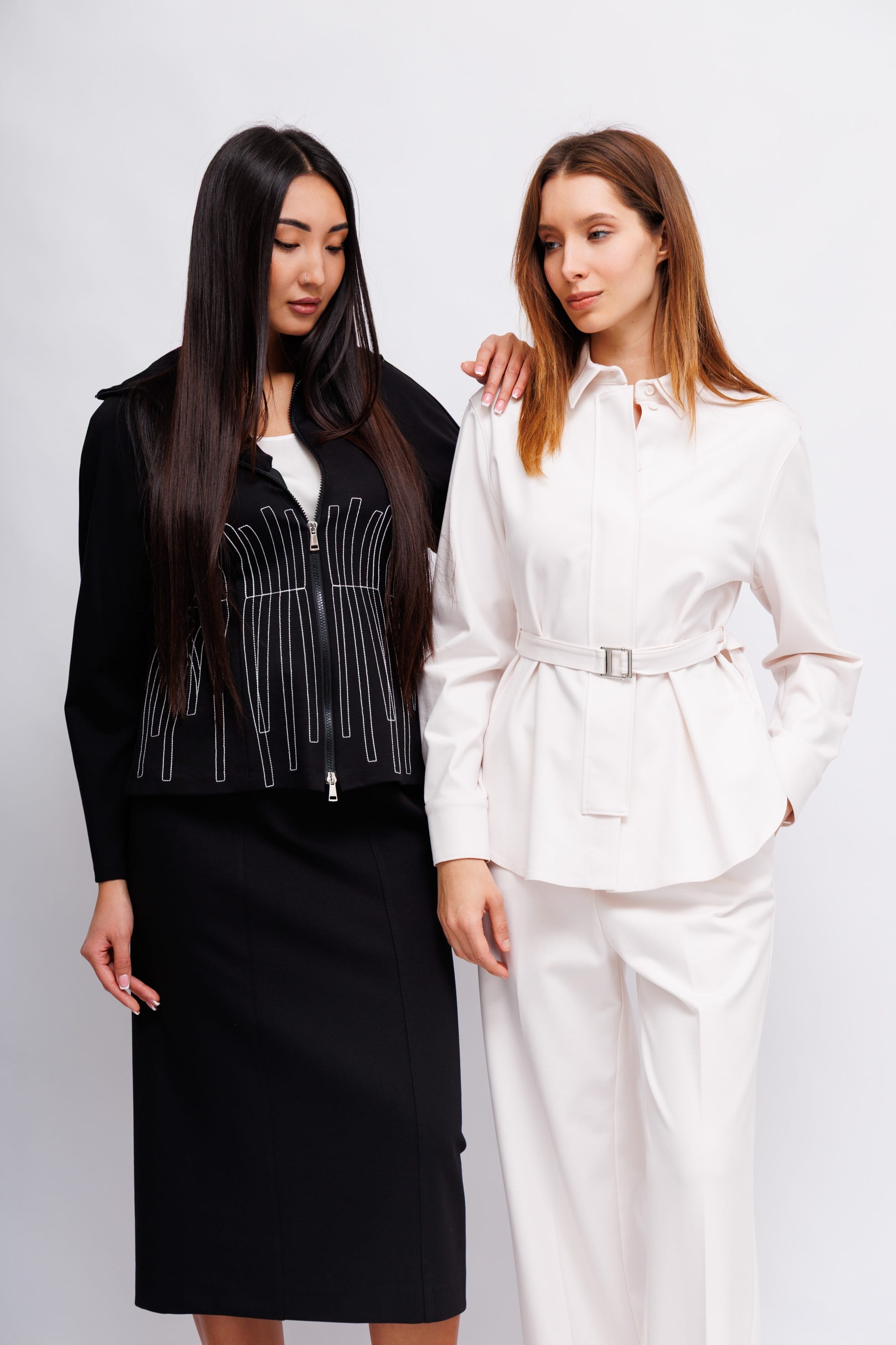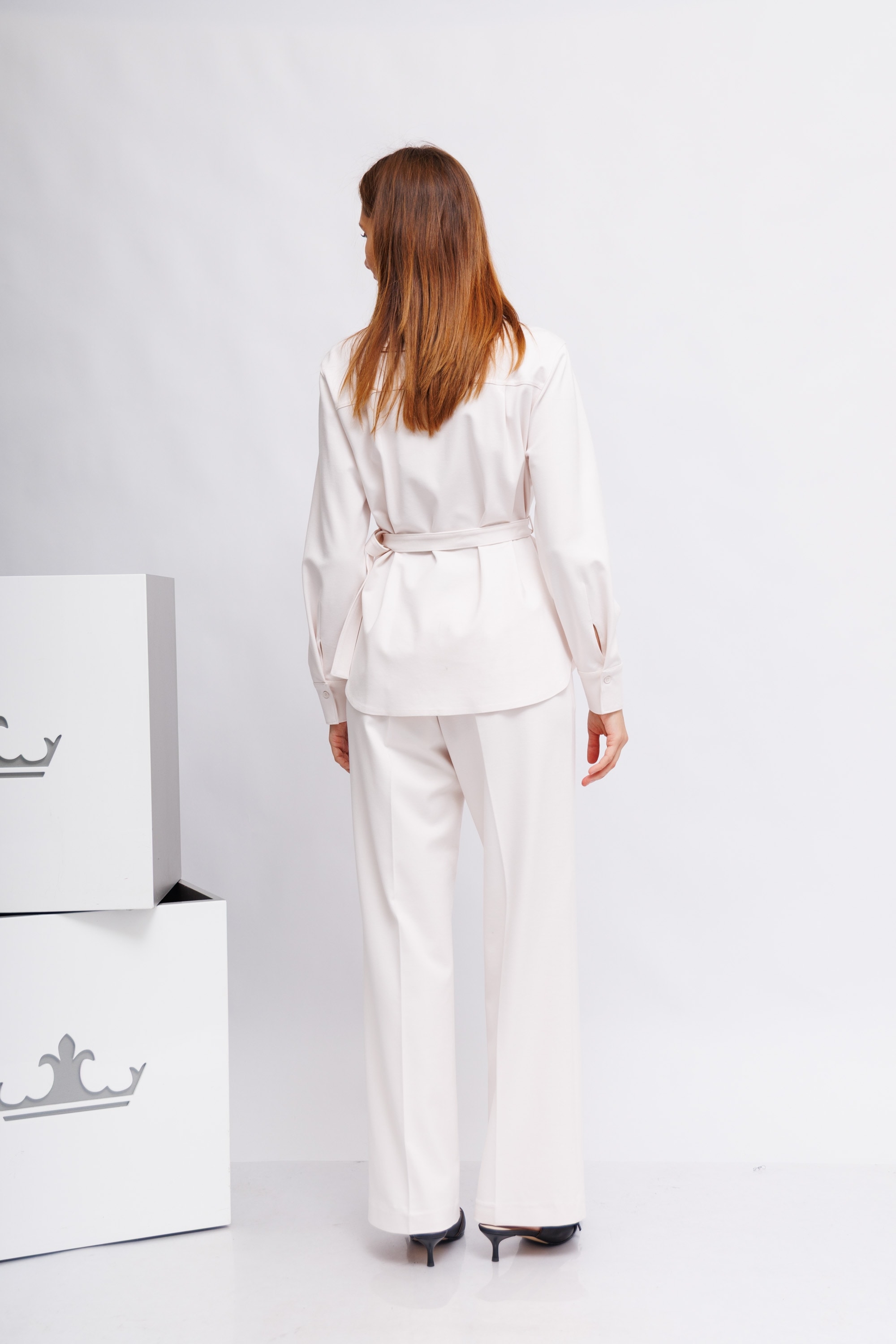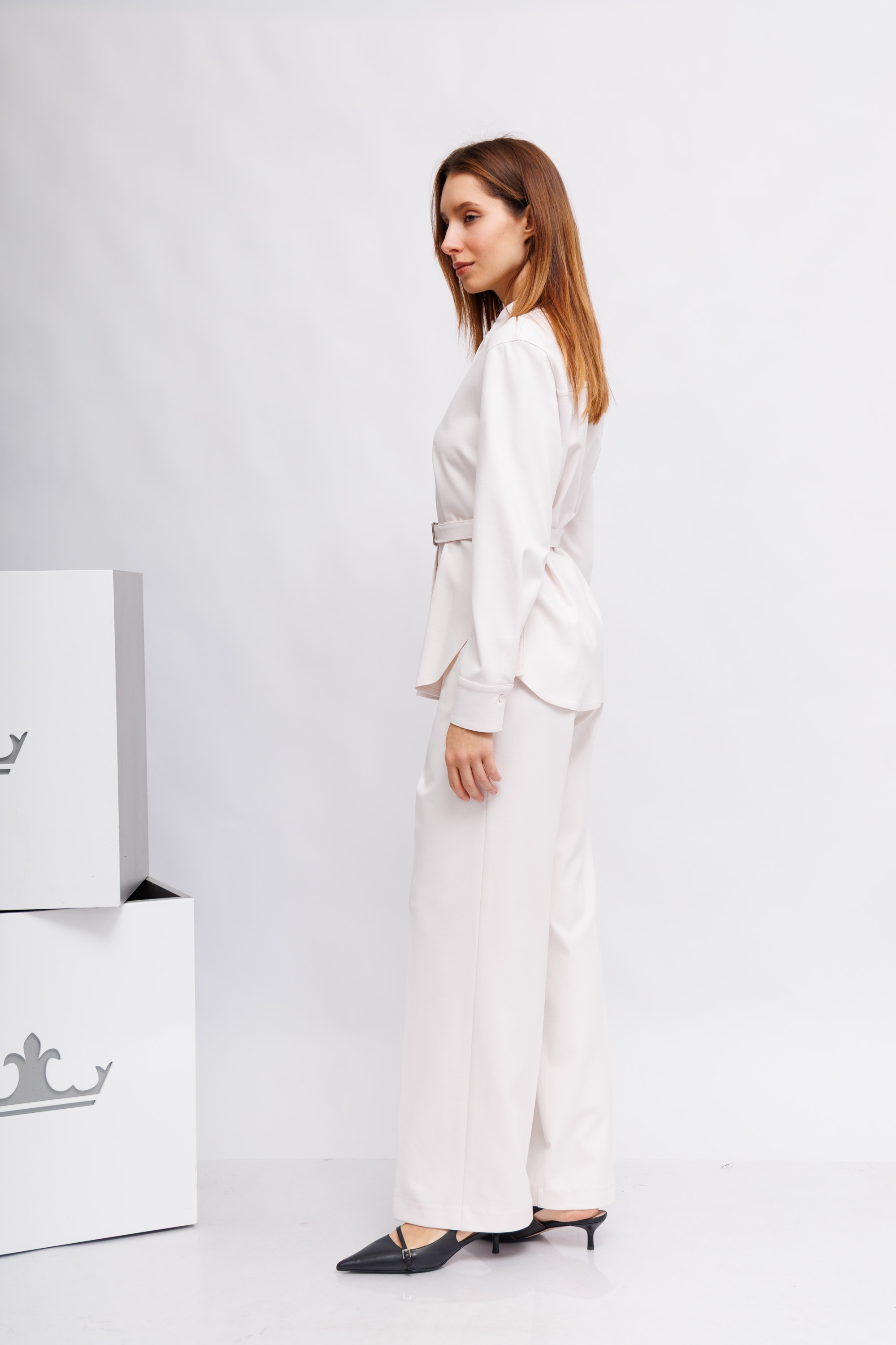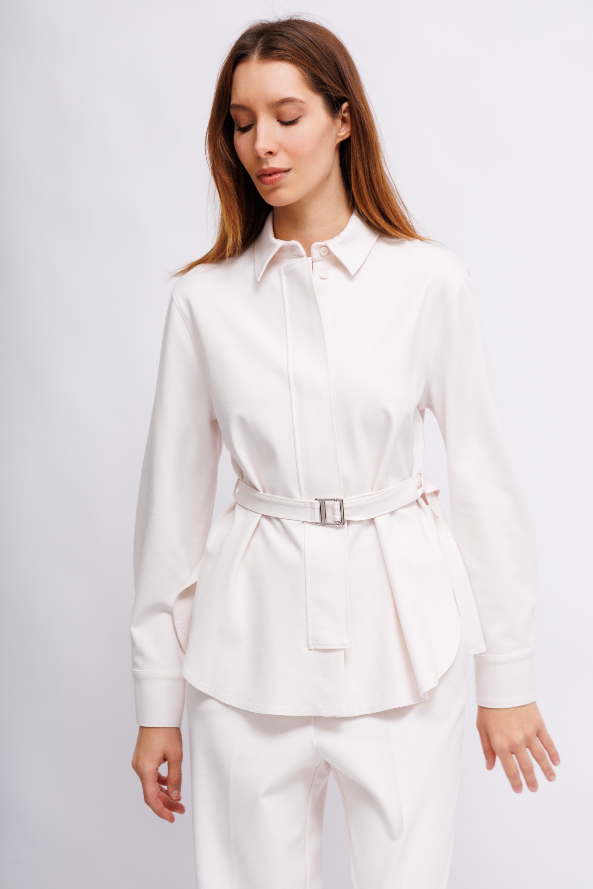 Классический ворот, застёжка сокрыта под планкой, длинные рукава с манжетами, силуэт можно регулировать ремнем в комплекте