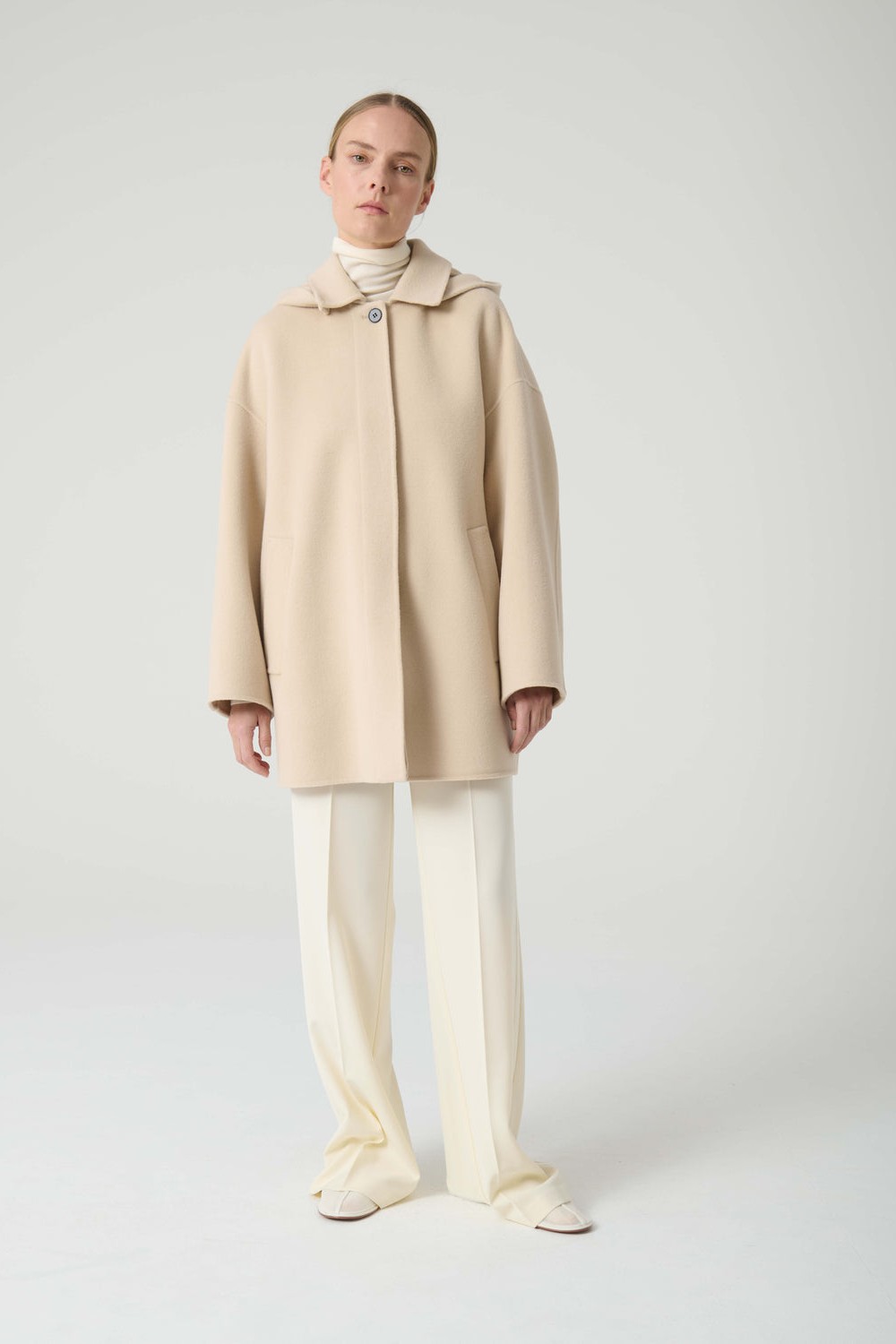 имеет застежку спереди на потайные пуговицы и капюшон. Прорезные карманы и длинные рукава со спущенными плечами дополняют дизайн.