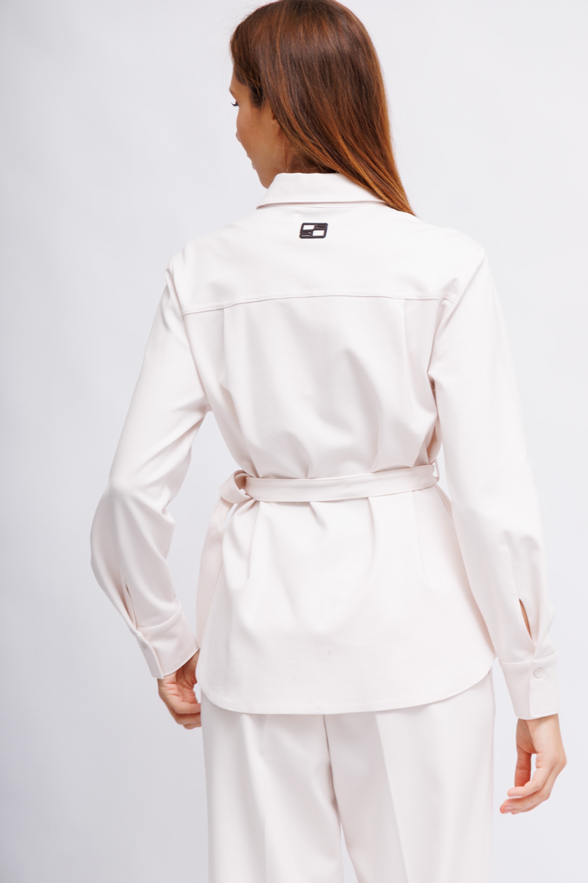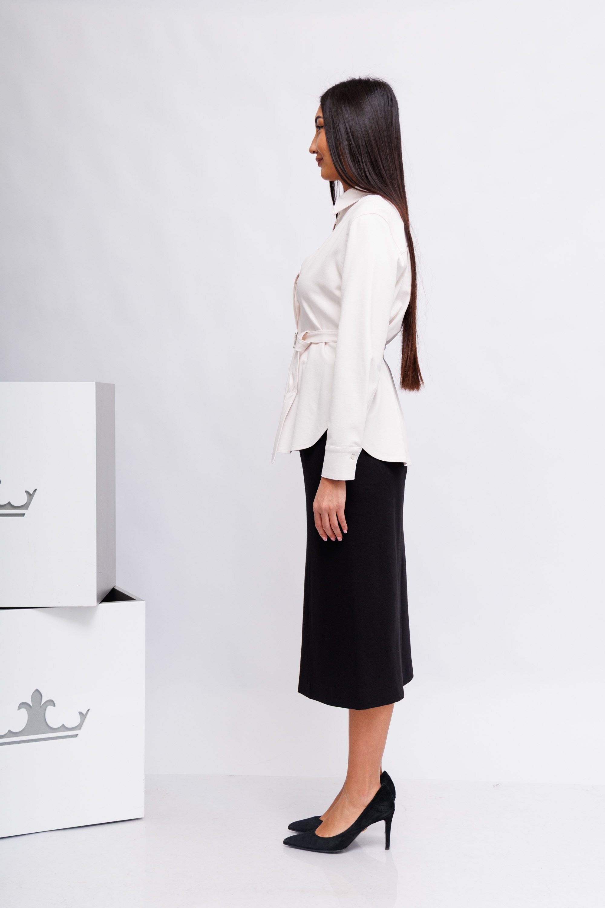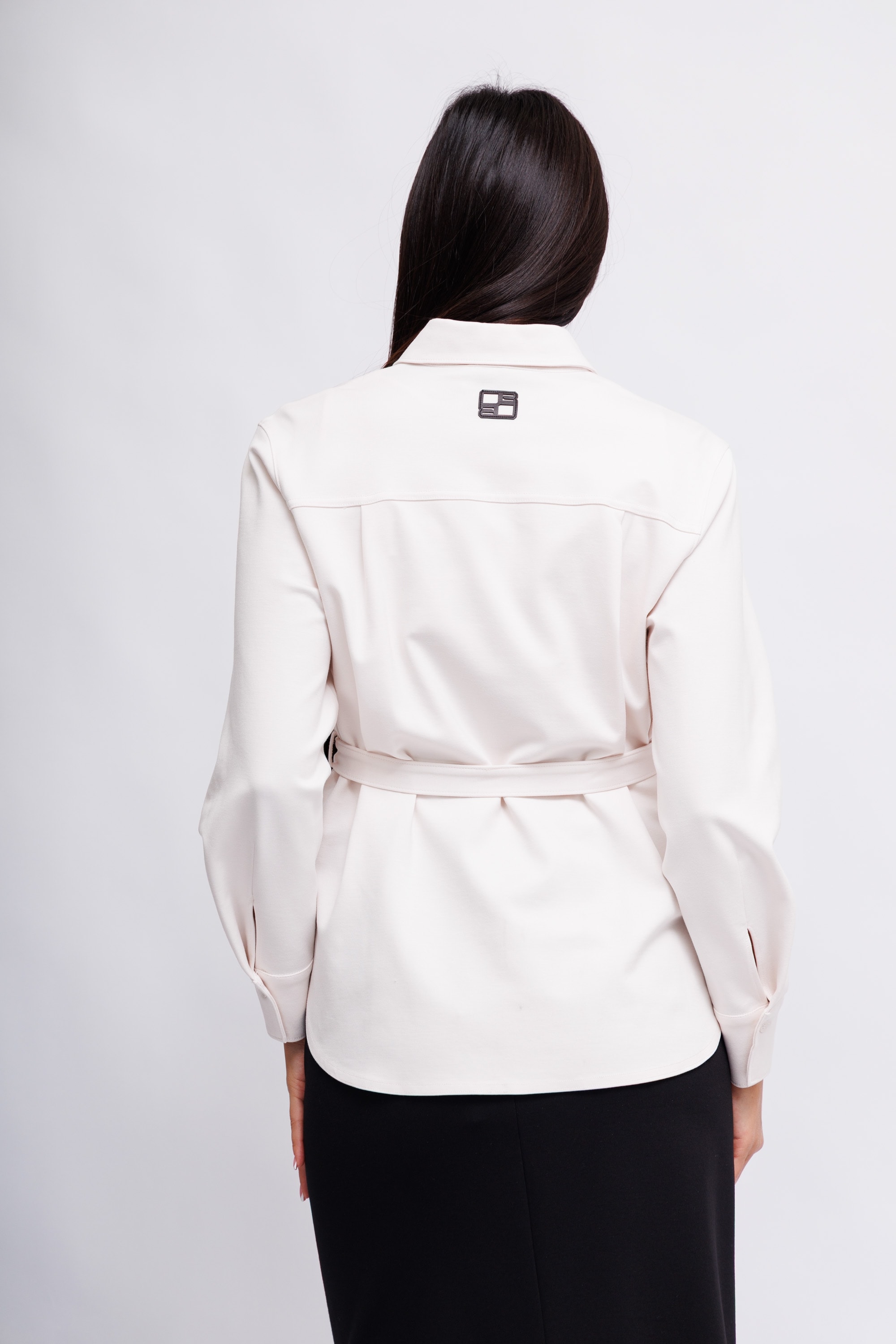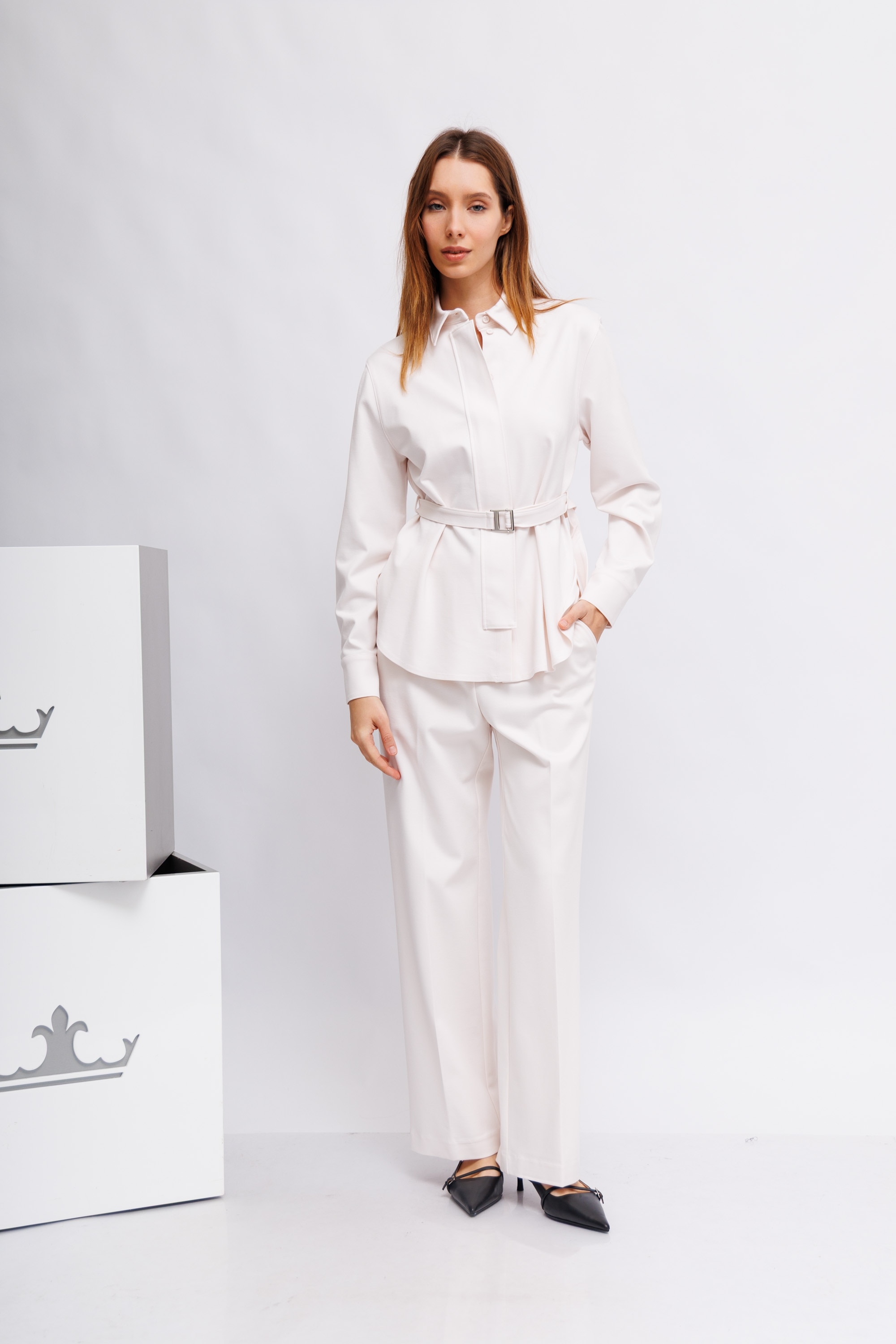 Классический ворот, застёжка сокрыта под планкой, длинные рукава с манжетами, силуэт можно регулировать ремнем в комплекте