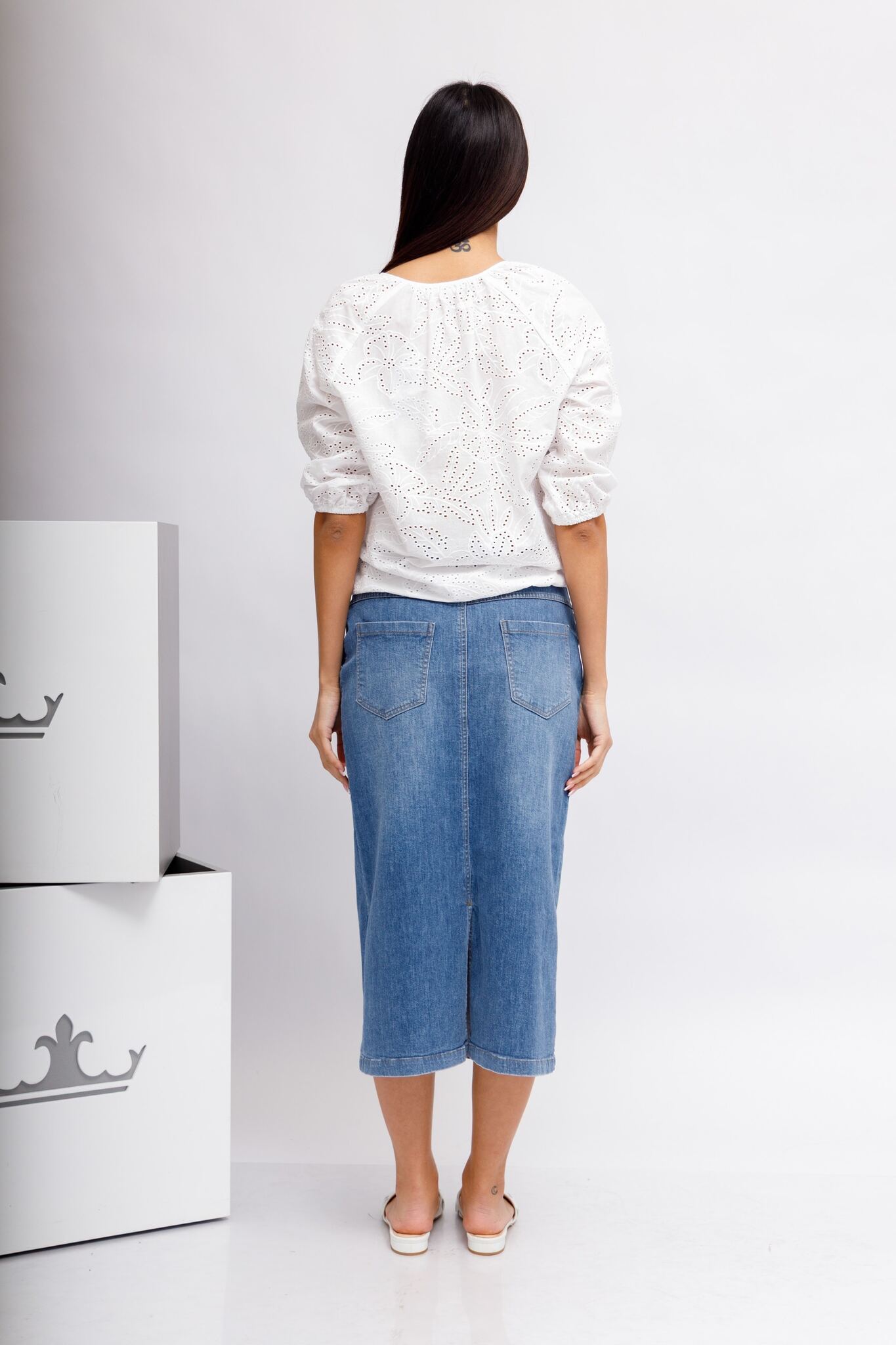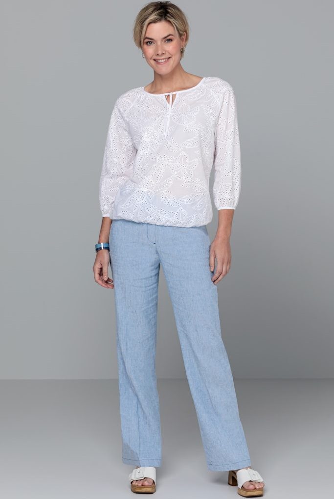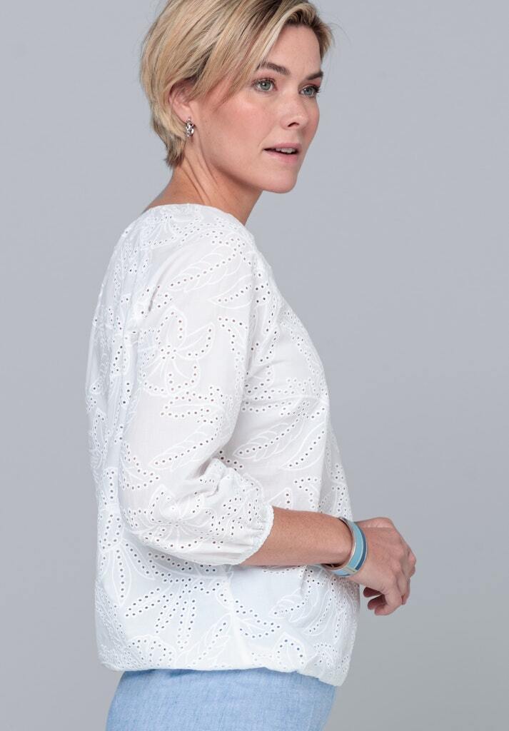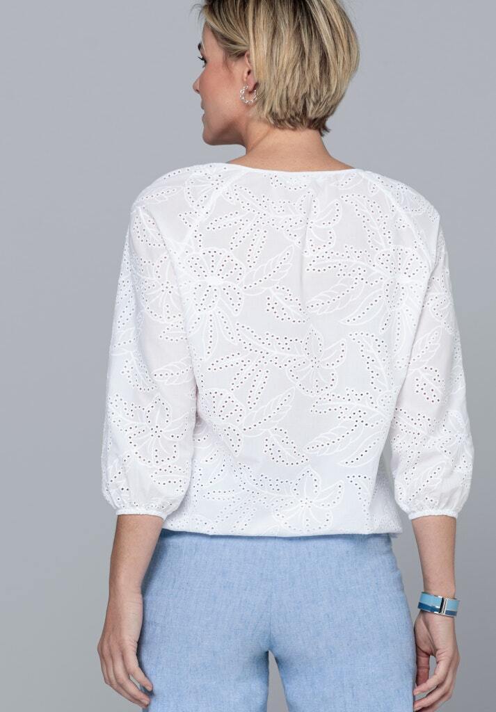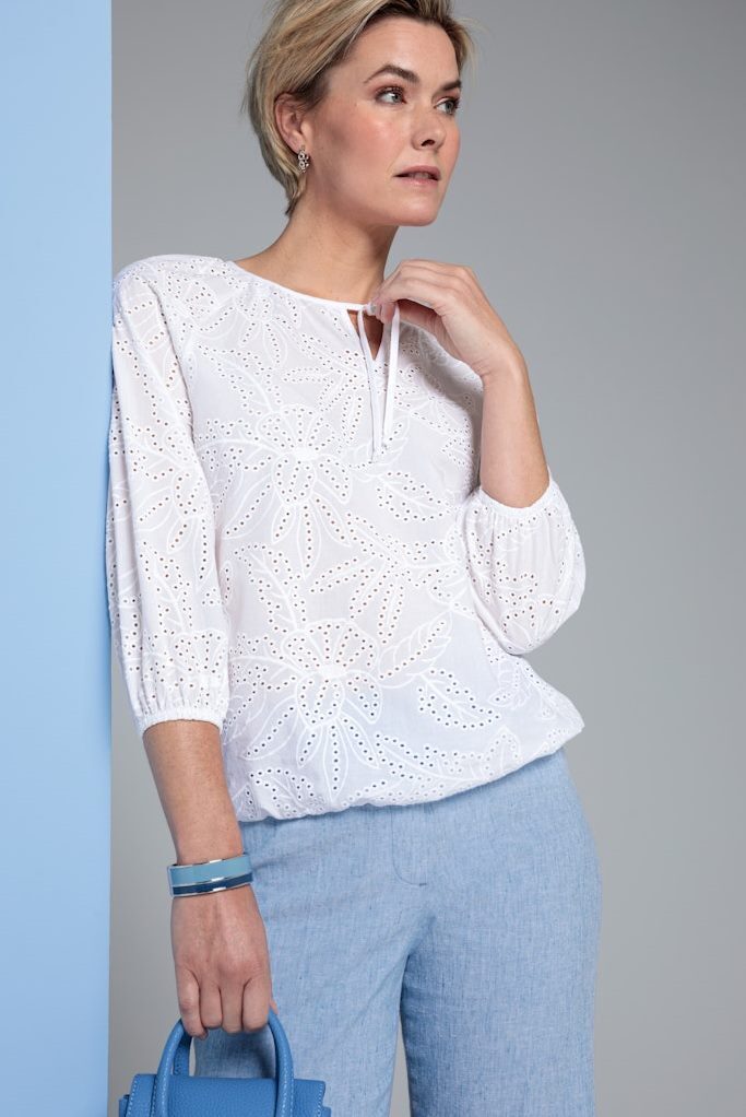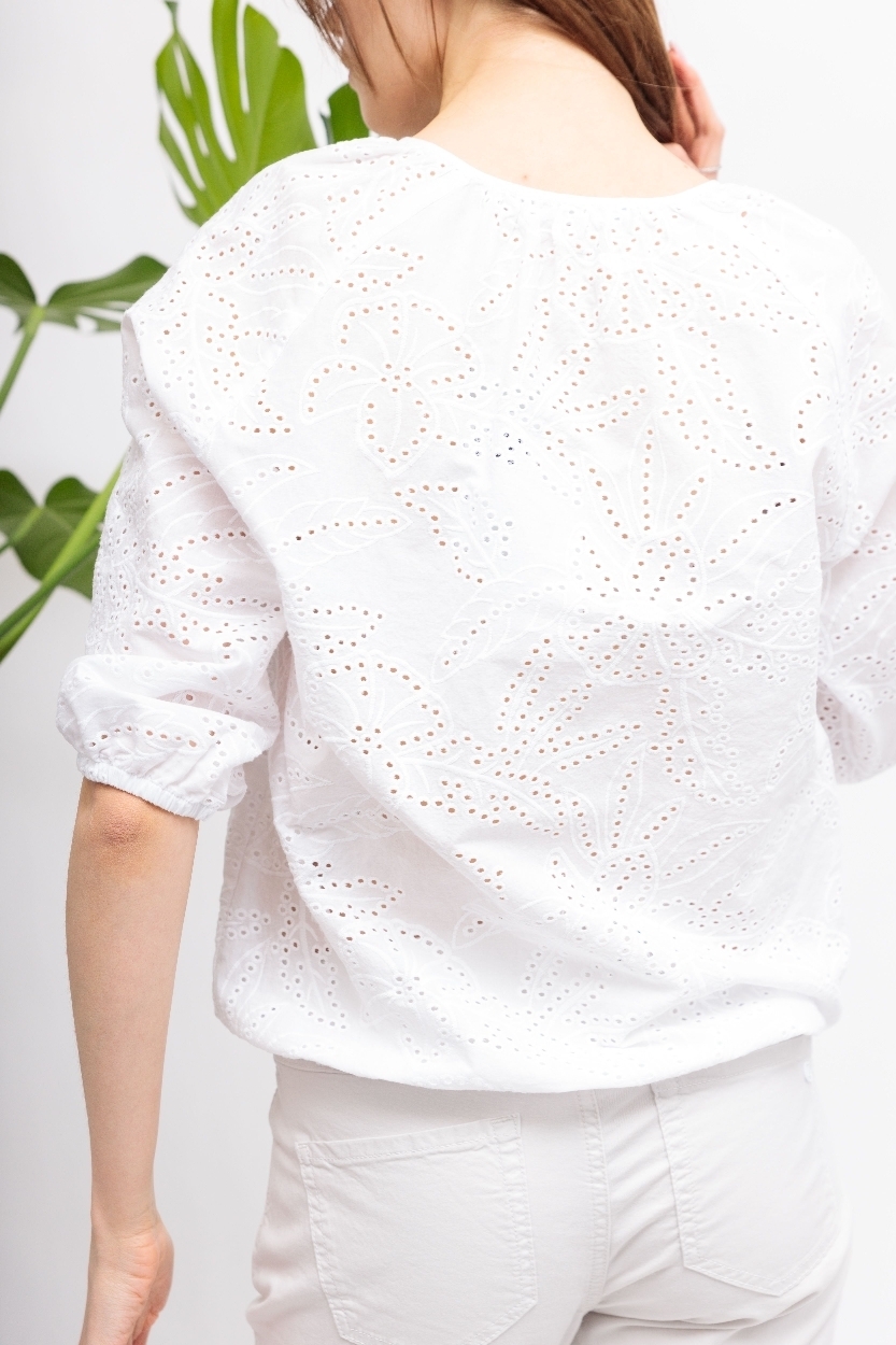 Изделие украшено детальной роскошной вышивкой Сангалло - летним хлопковым кружевом в сочетании с прошивом
