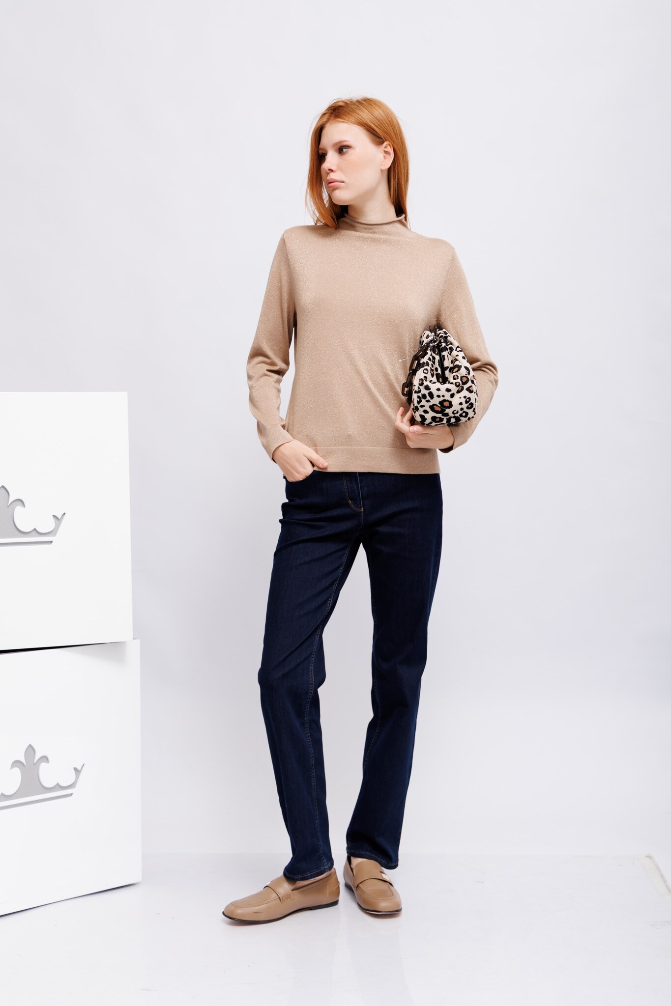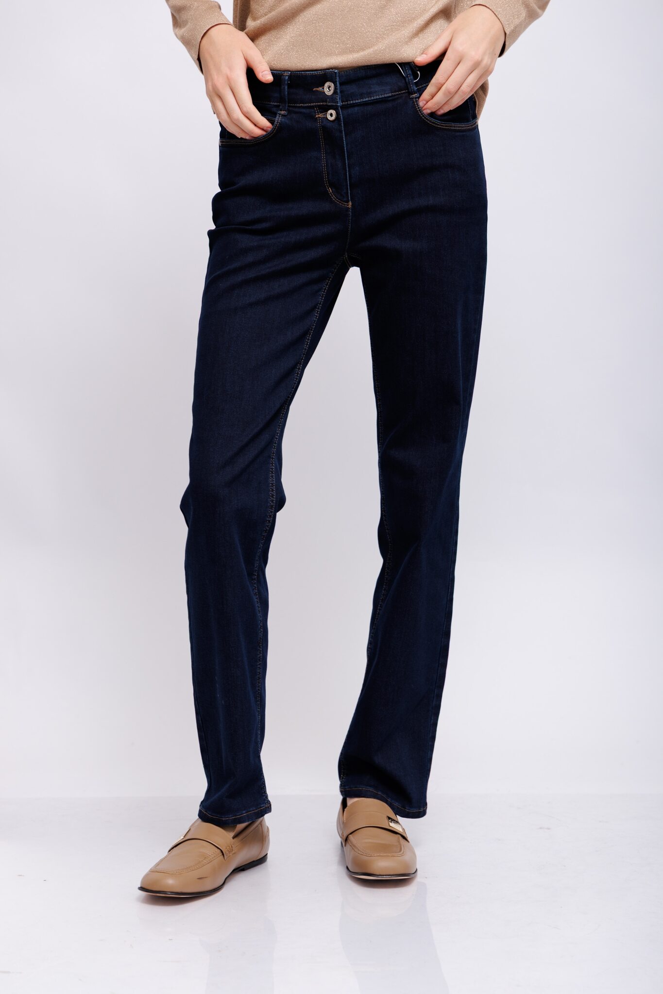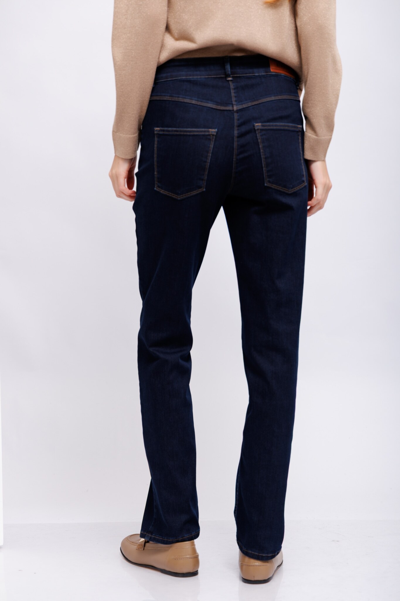 Джинсы синиеМодель "5 карманов"Гульфик на молнии и 2 металлических пуговицахСзади - кокеткаЗауженный кройОтстрочка в тонПолноценная длина