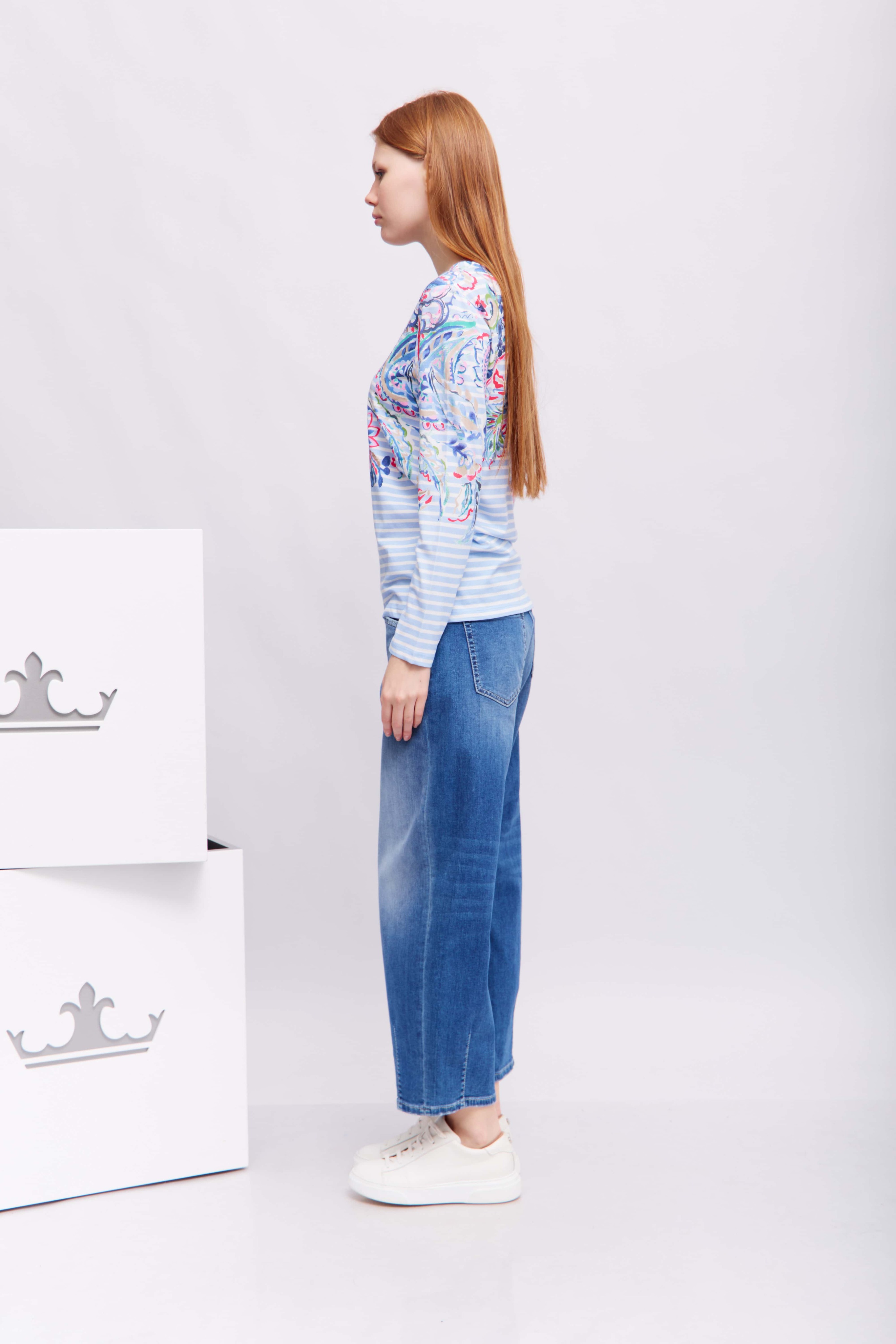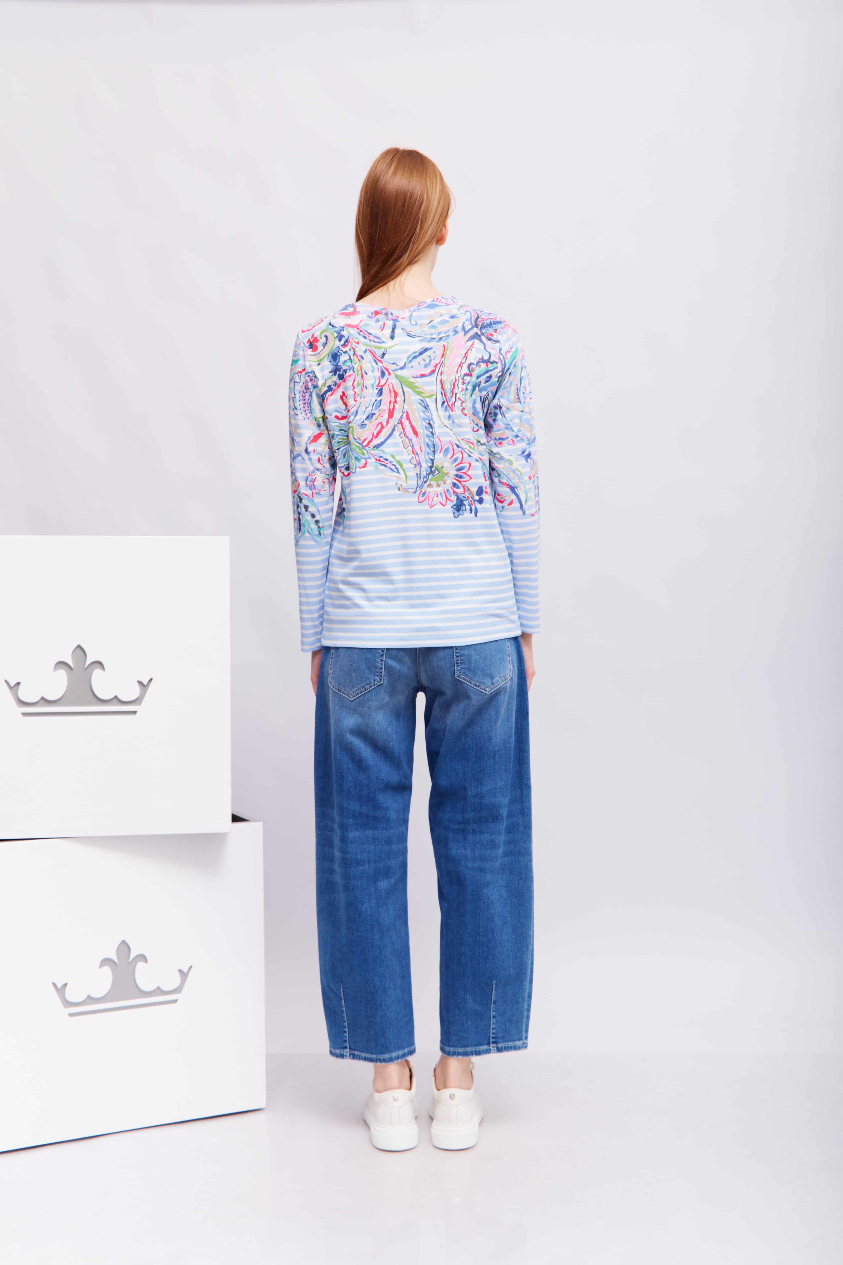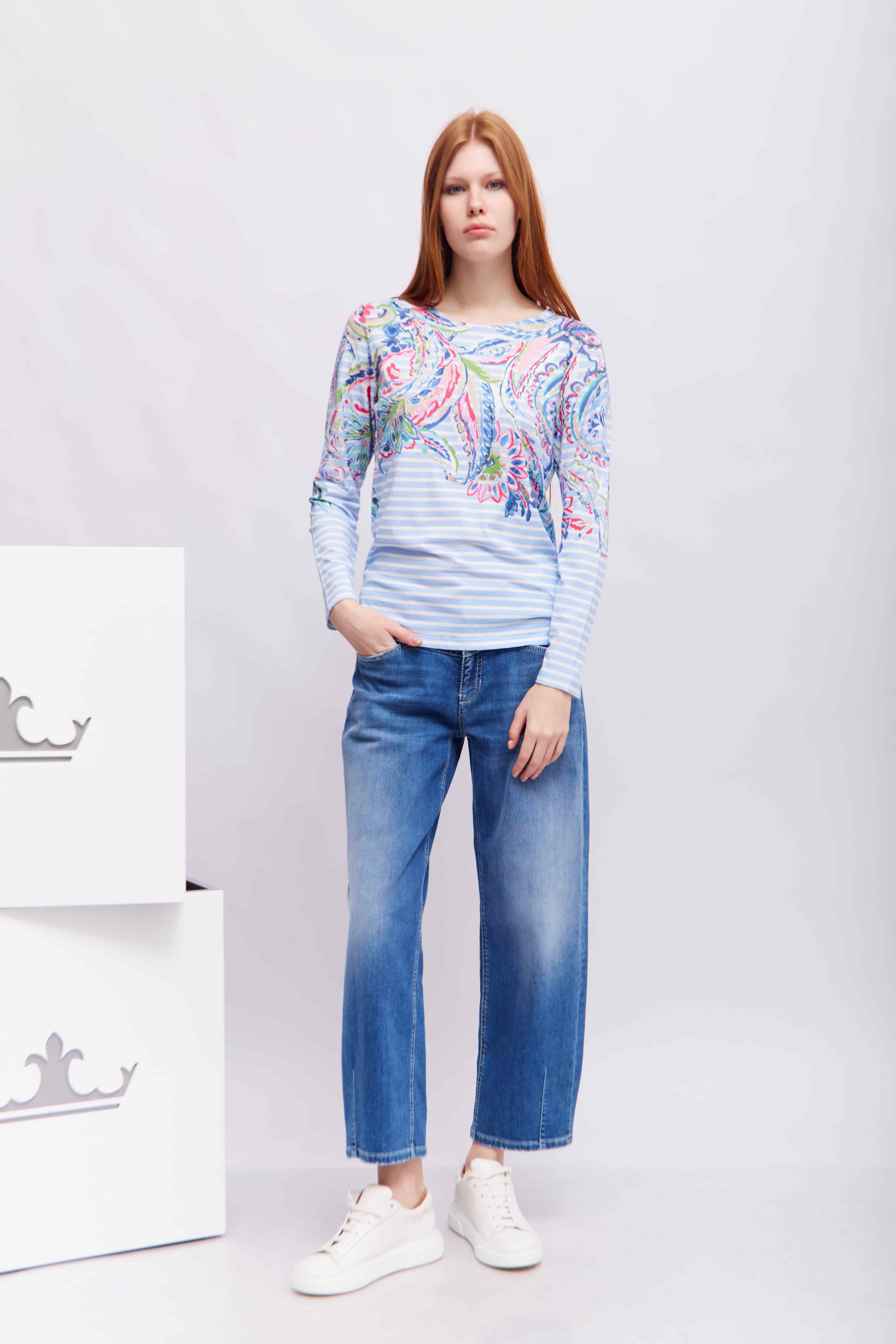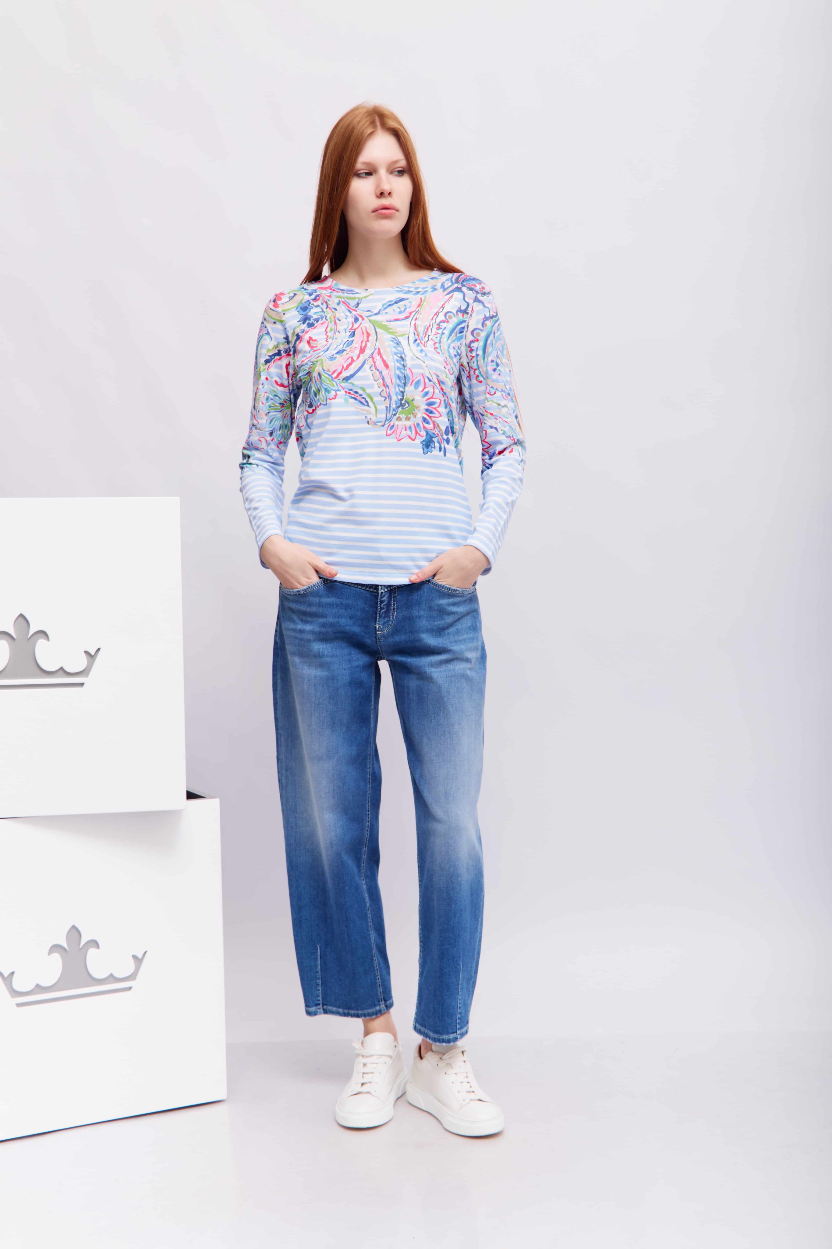 Наша модная рубашка с длинными рукавами Dami привнесет в ваш гардероб свежие весенние цвета. Полосатый дизайн с едва заметным узором «пейсли» добавляет современный, женственный штрих. Высококачественная смесь хлопка и модала обеспечивает исключительный комфорт, а прямой крой и свободная посадка создают привлекательный силуэт. Универсальная вещь для стильных повседневных образов.
