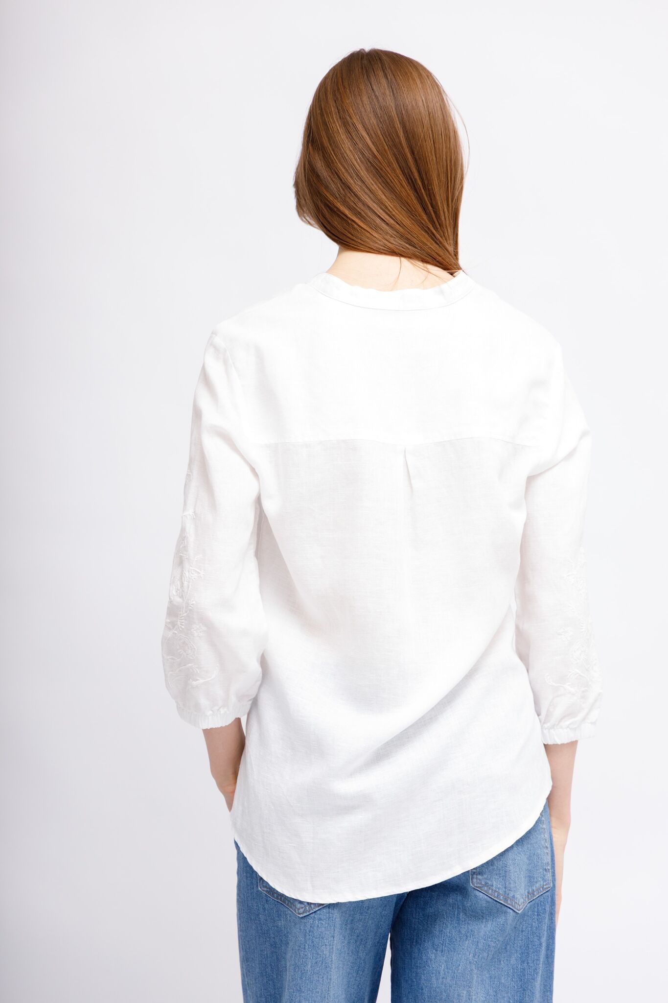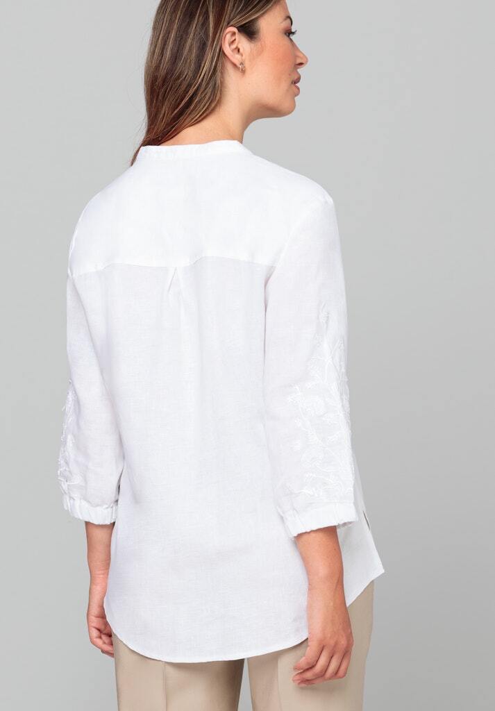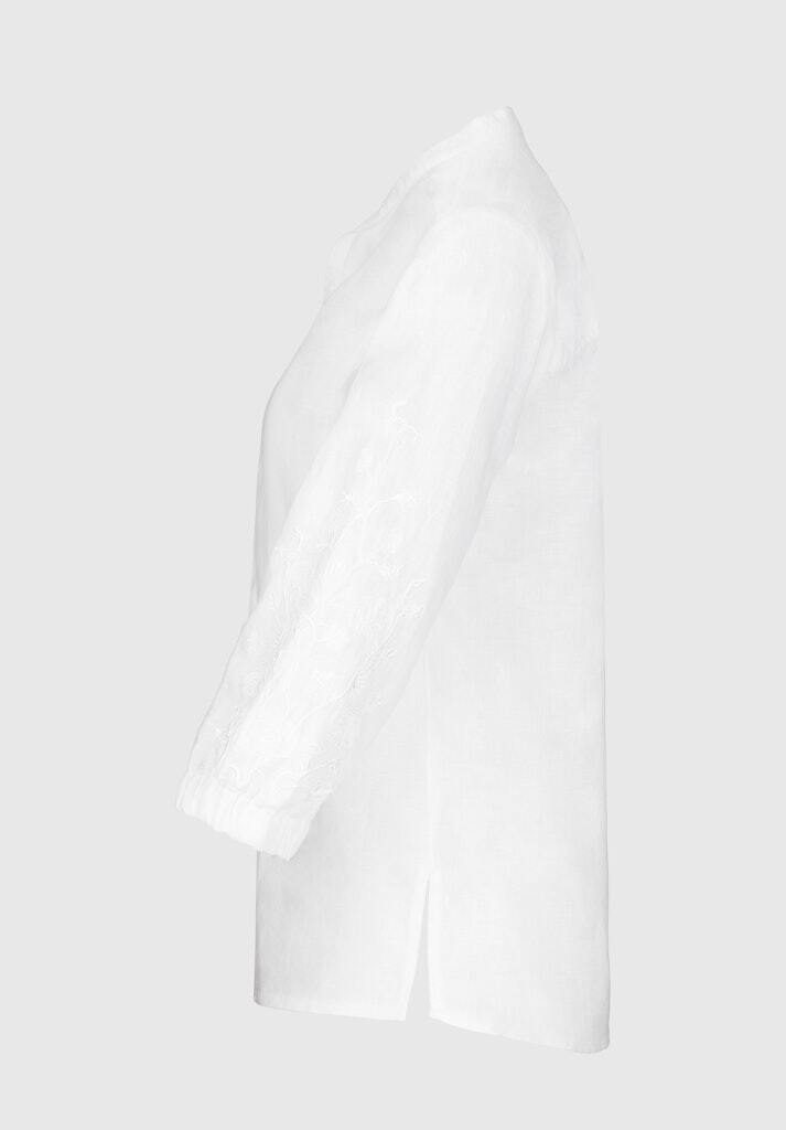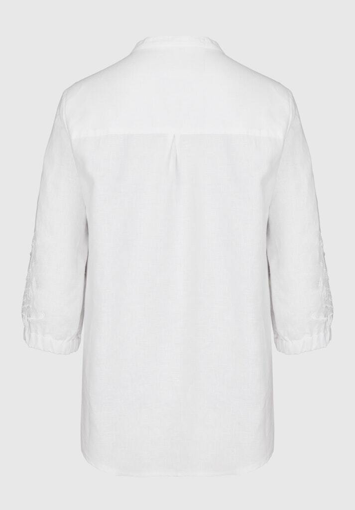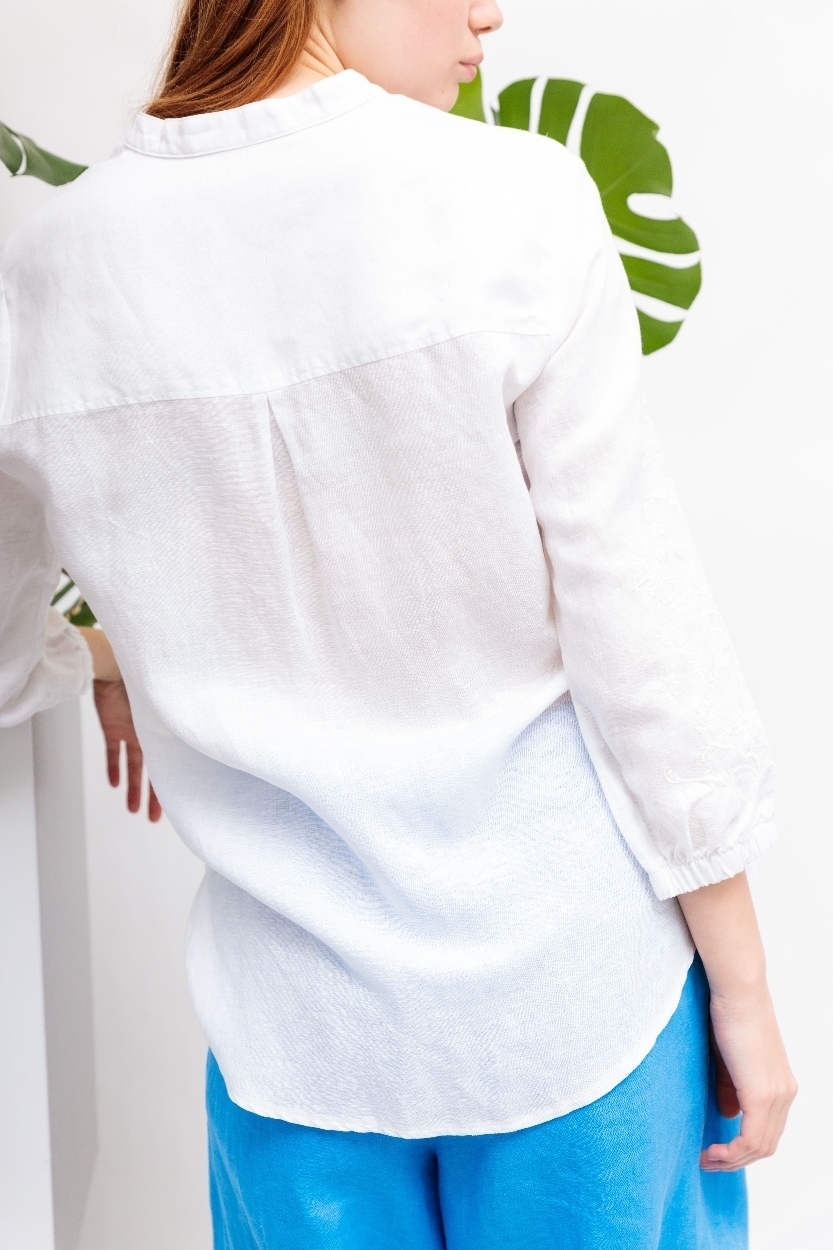 Рубашка белая изо льна,лиоцелла и хлопкаС вышивкой на рукавахСвободный кройРукава 7/8 на манжетахСложный вырез: комбинация ворота-стойки и V-вырезаСзади - кокеткой встречная складкаПо бокам- скруглённые разрезы