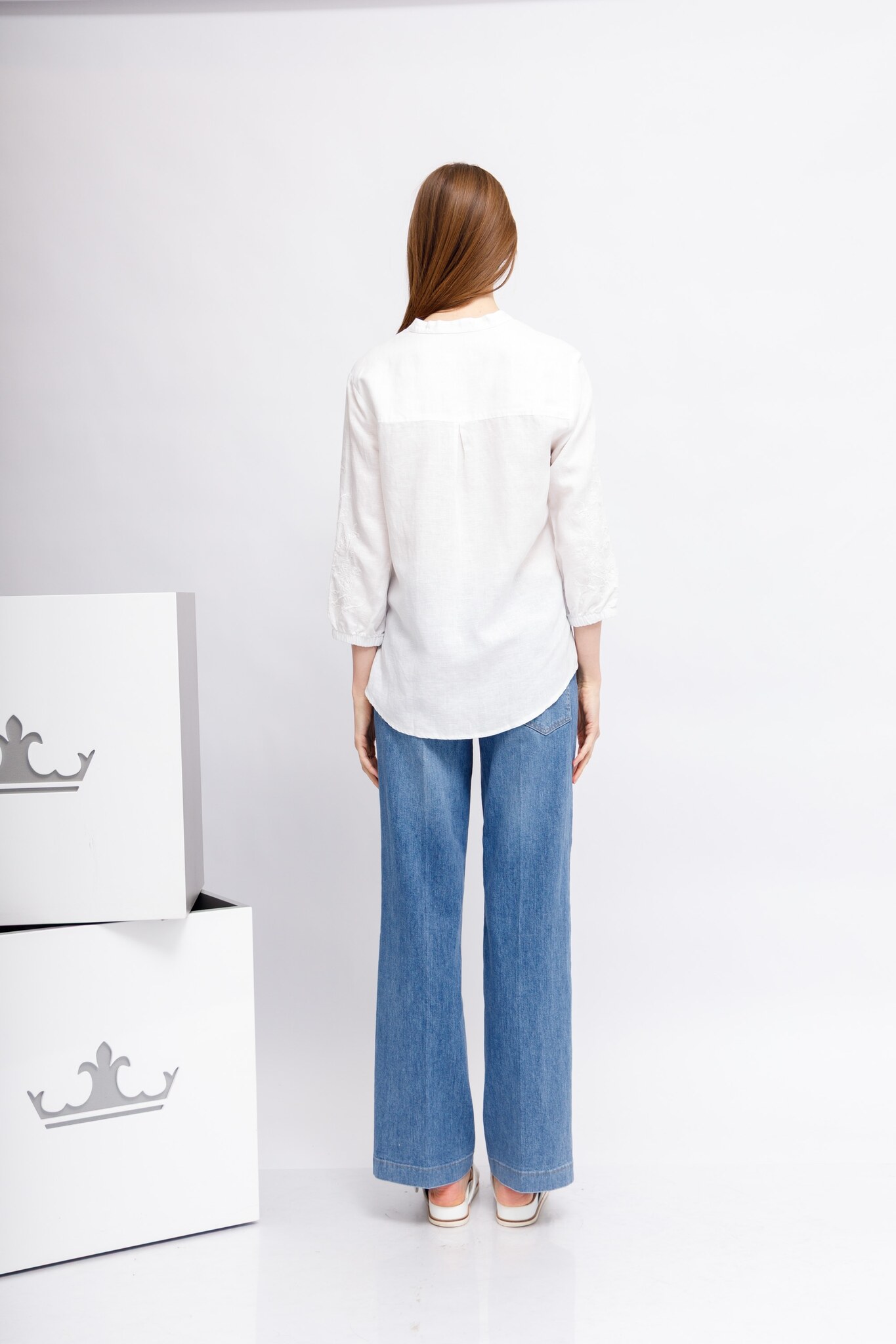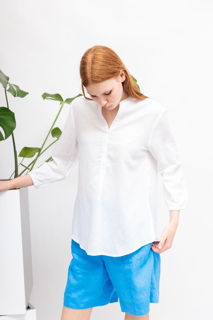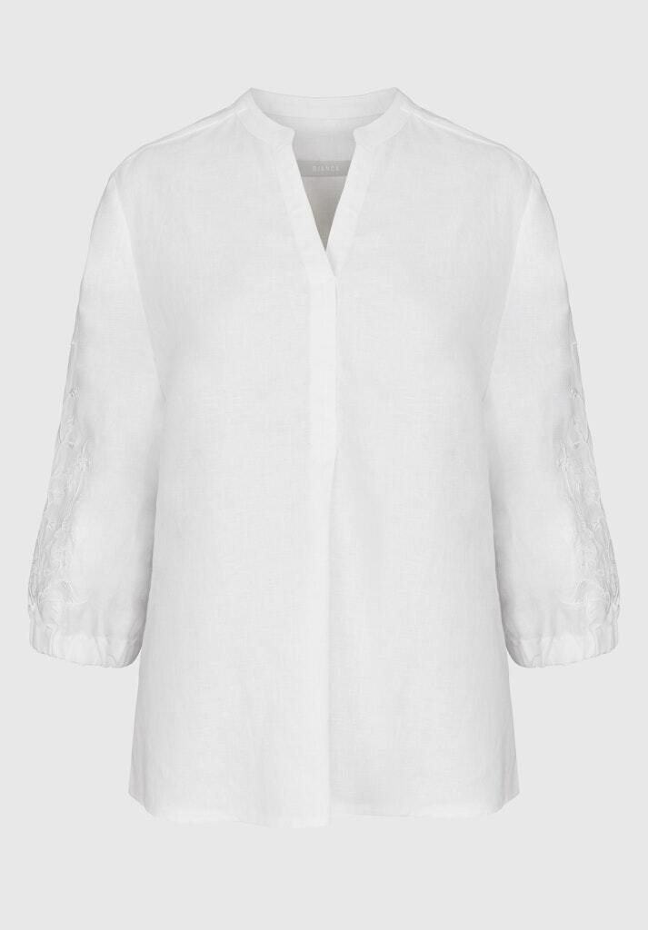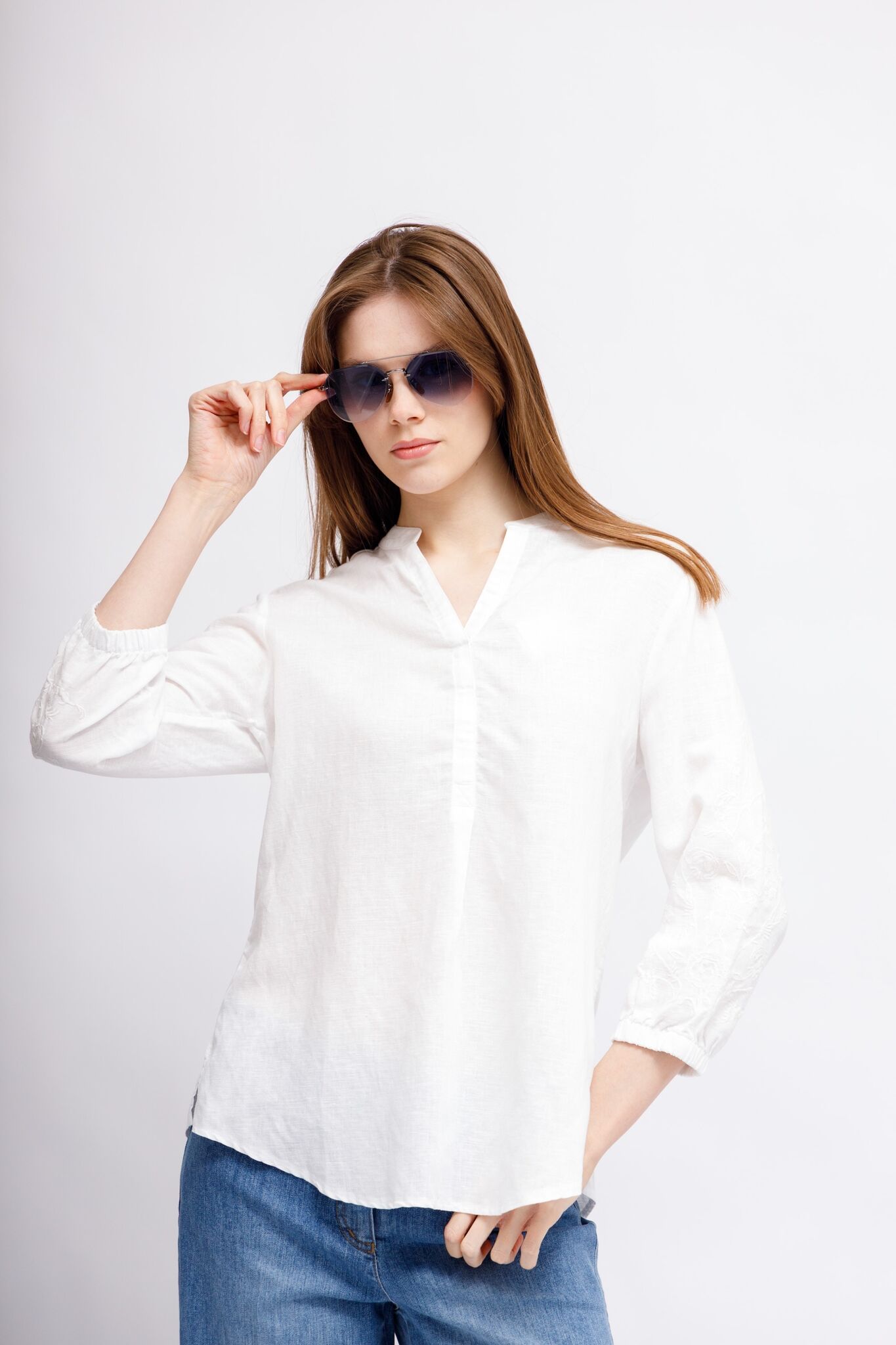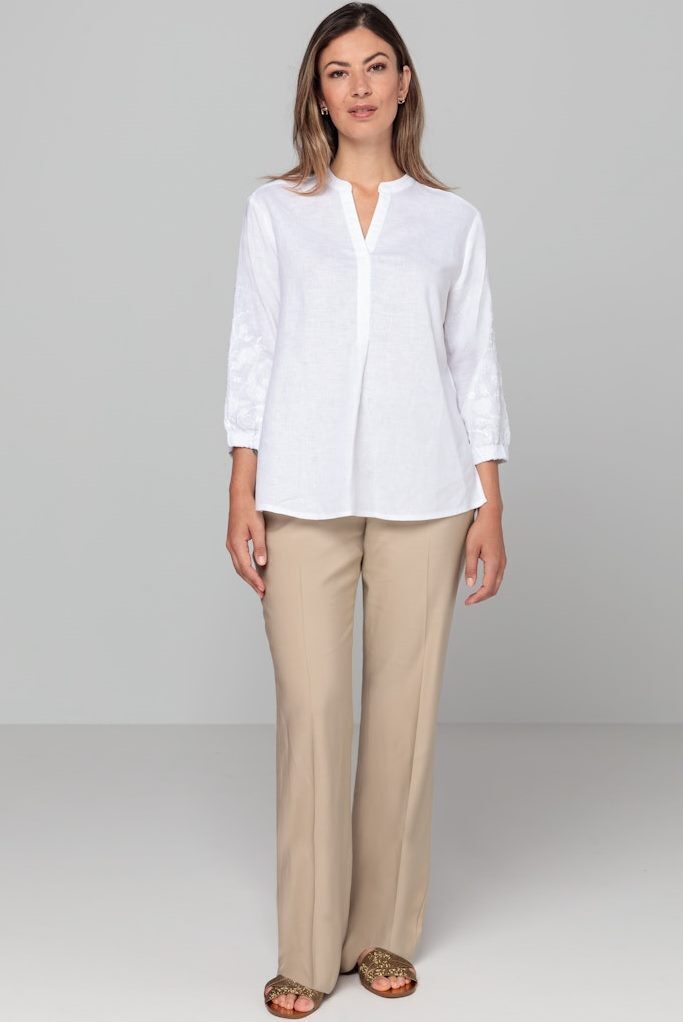 Рубашка белая изо льна,лиоцелла и хлопкаС вышивкой на рукавахСвободный кройРукава 7/8 на манжетахСложный вырез: комбинация ворота-стойки и V-вырезаСзади - кокеткой встречная складкаПо бокам- скруглённые разрезы