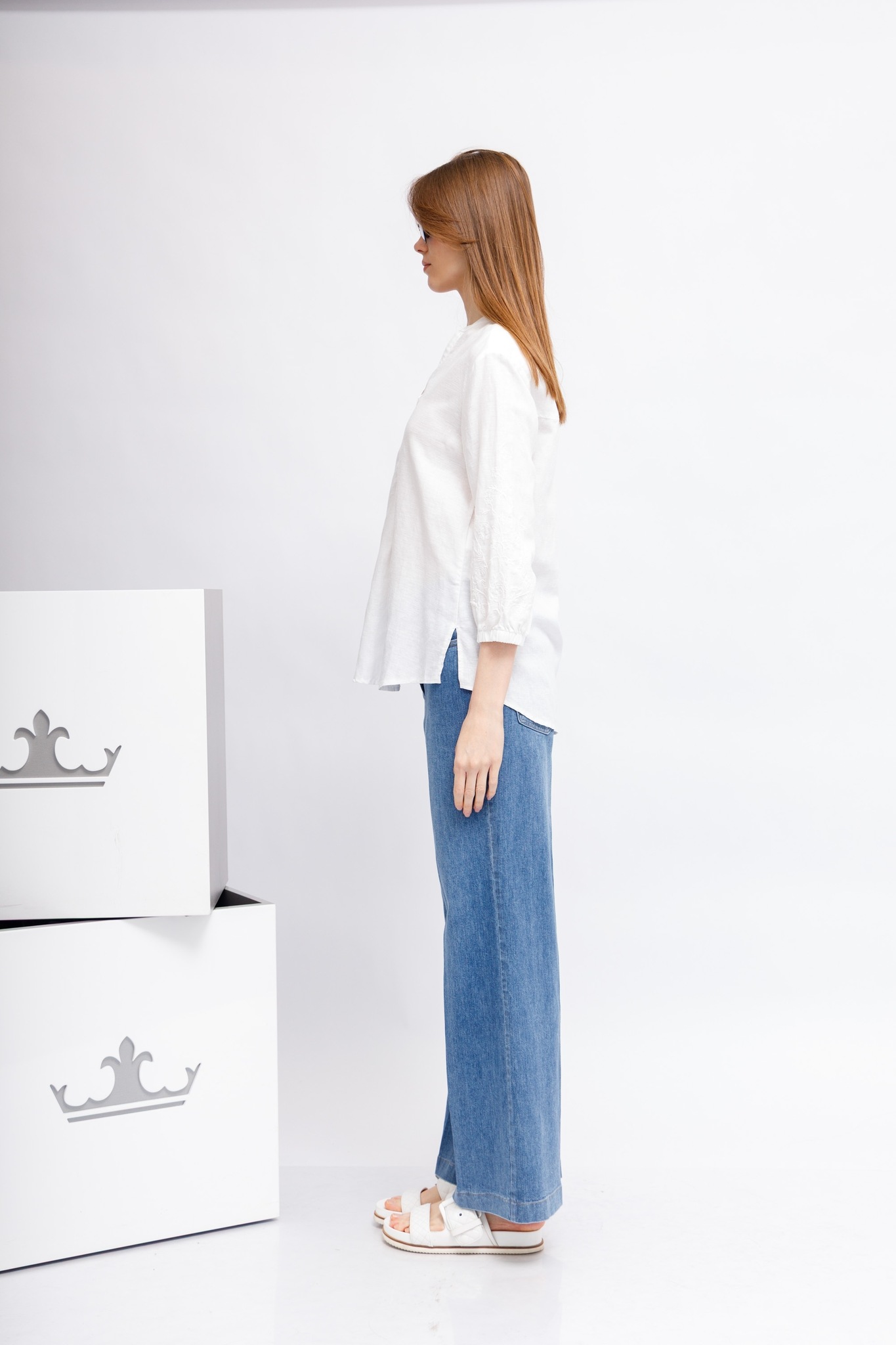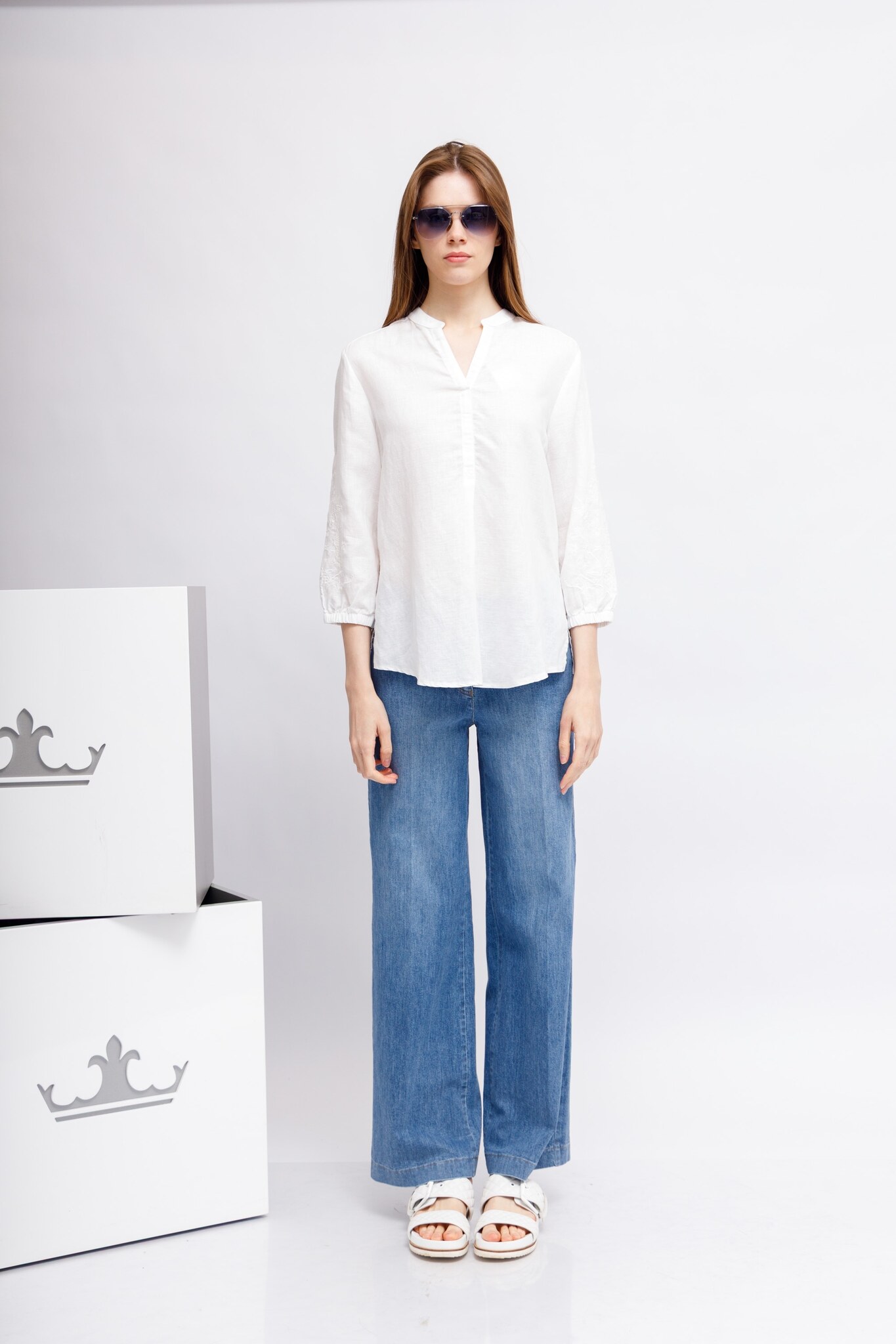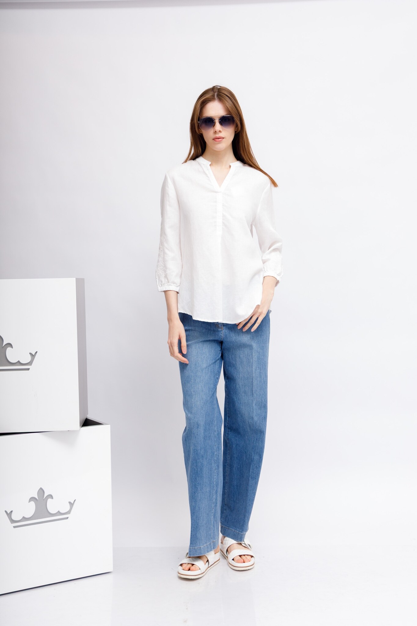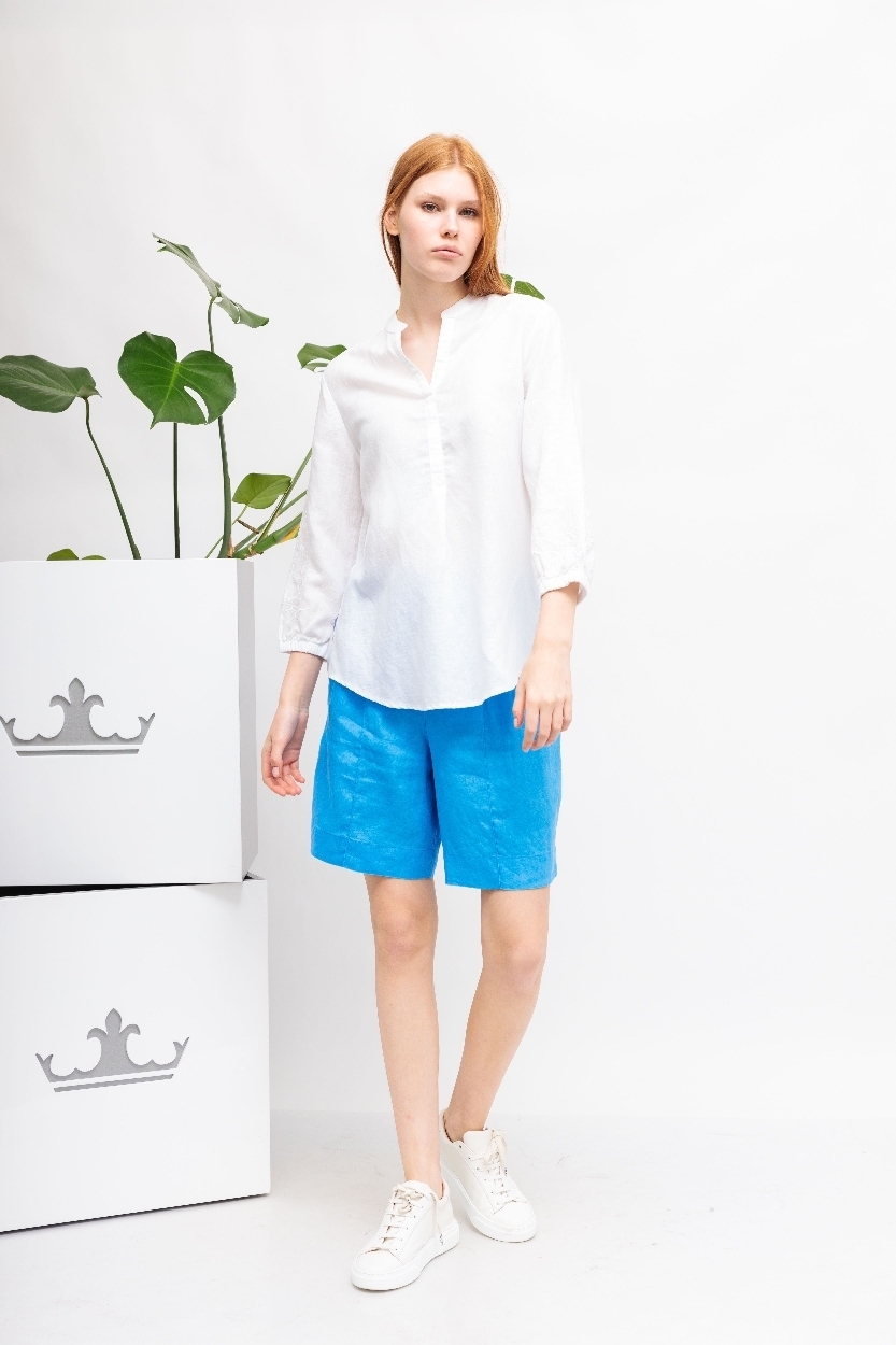 Рубашка белая изо льна,лиоцелла и хлопкаС вышивкой на рукавахСвободный кройРукава 7/8 на манжетахСложный вырез: комбинация ворота-стойки и V-вырезаСзади - кокеткой встречная складкаПо бокам- скруглённые разрезы
