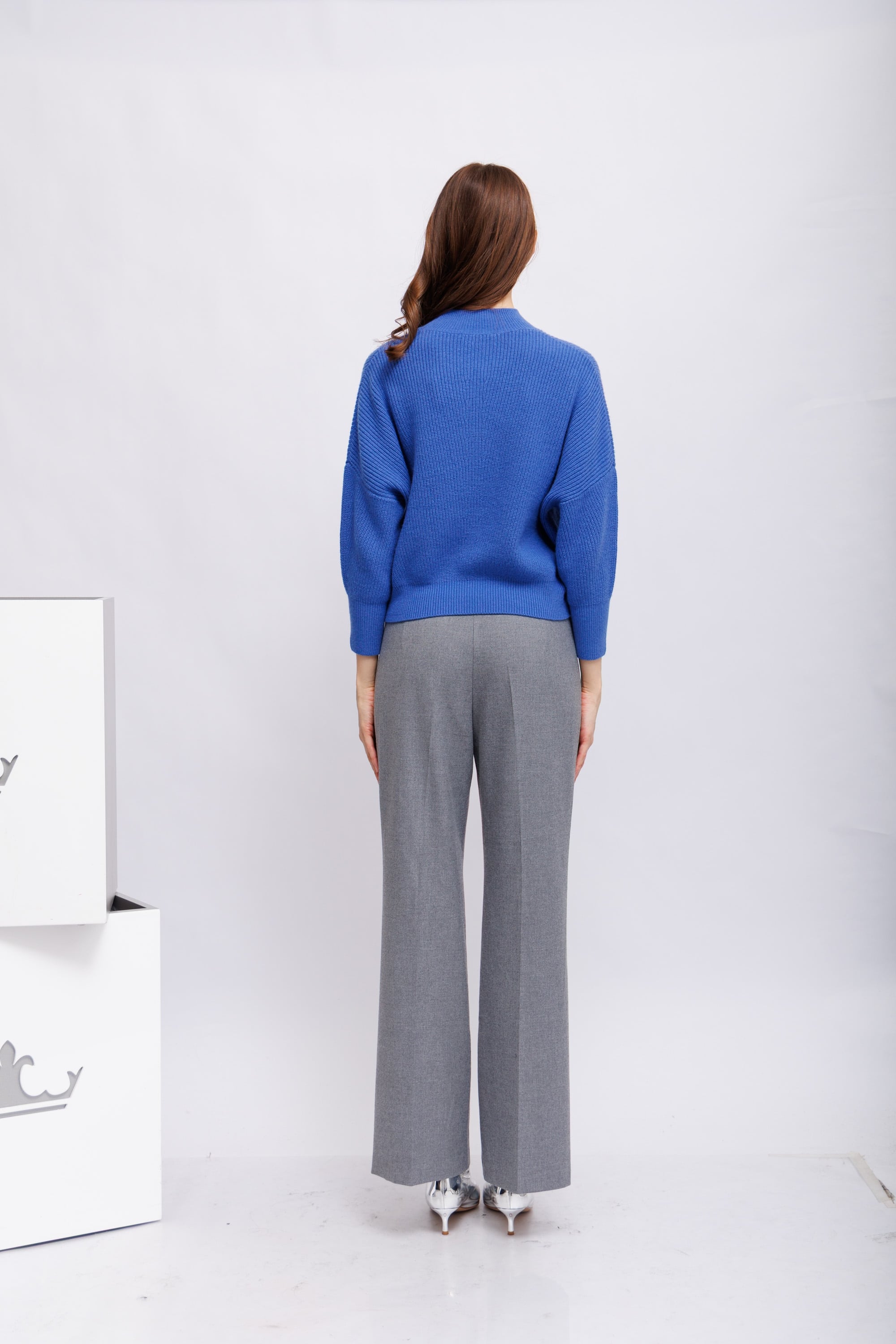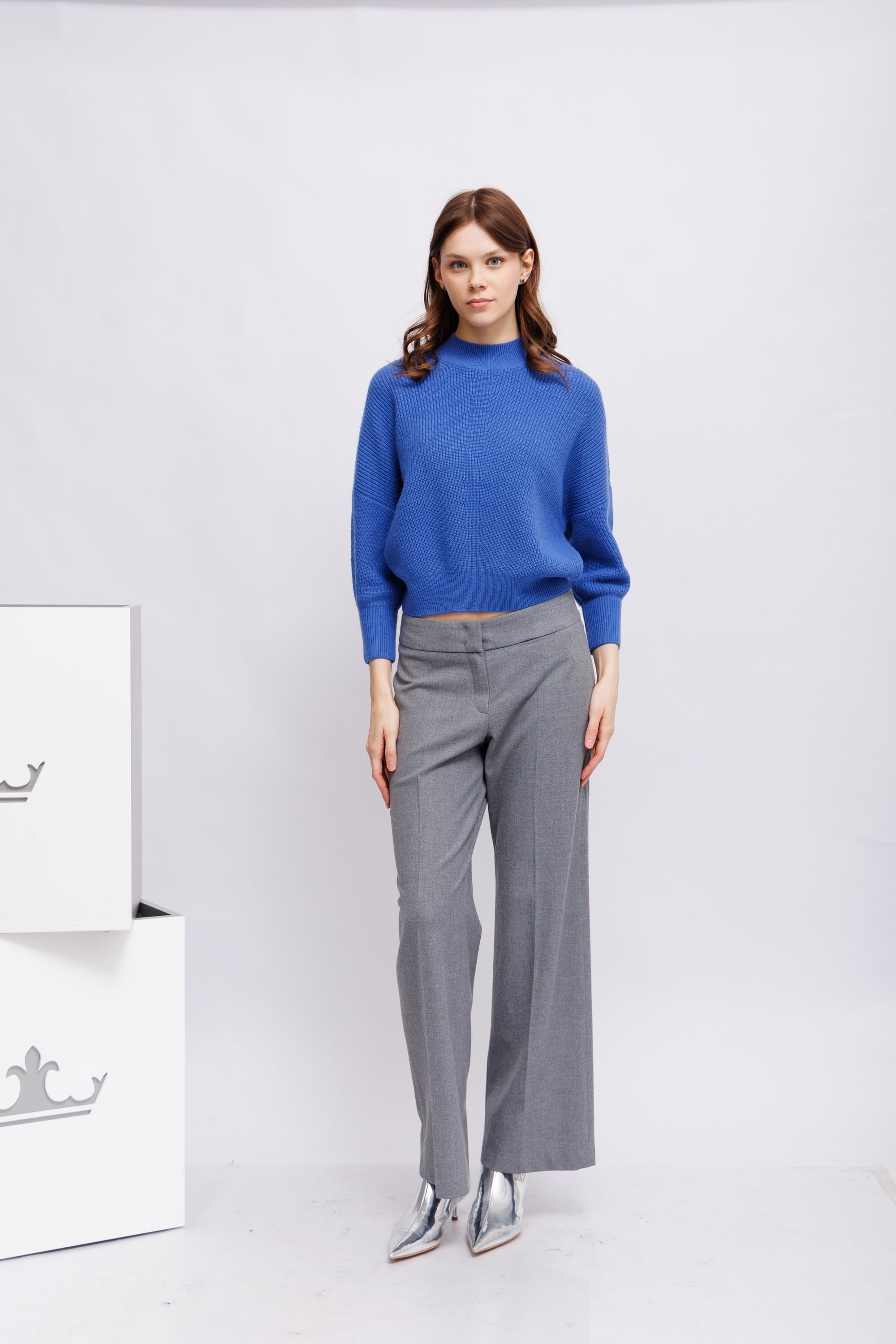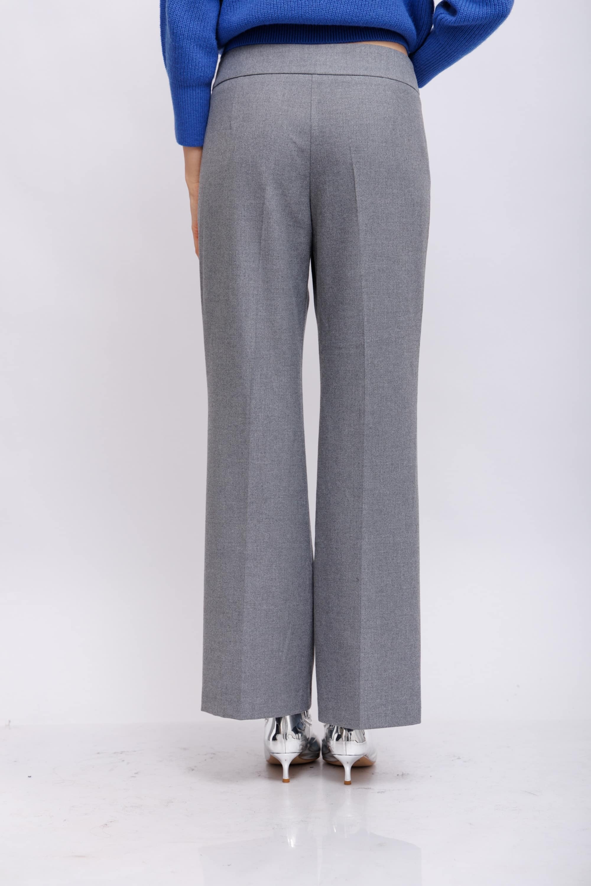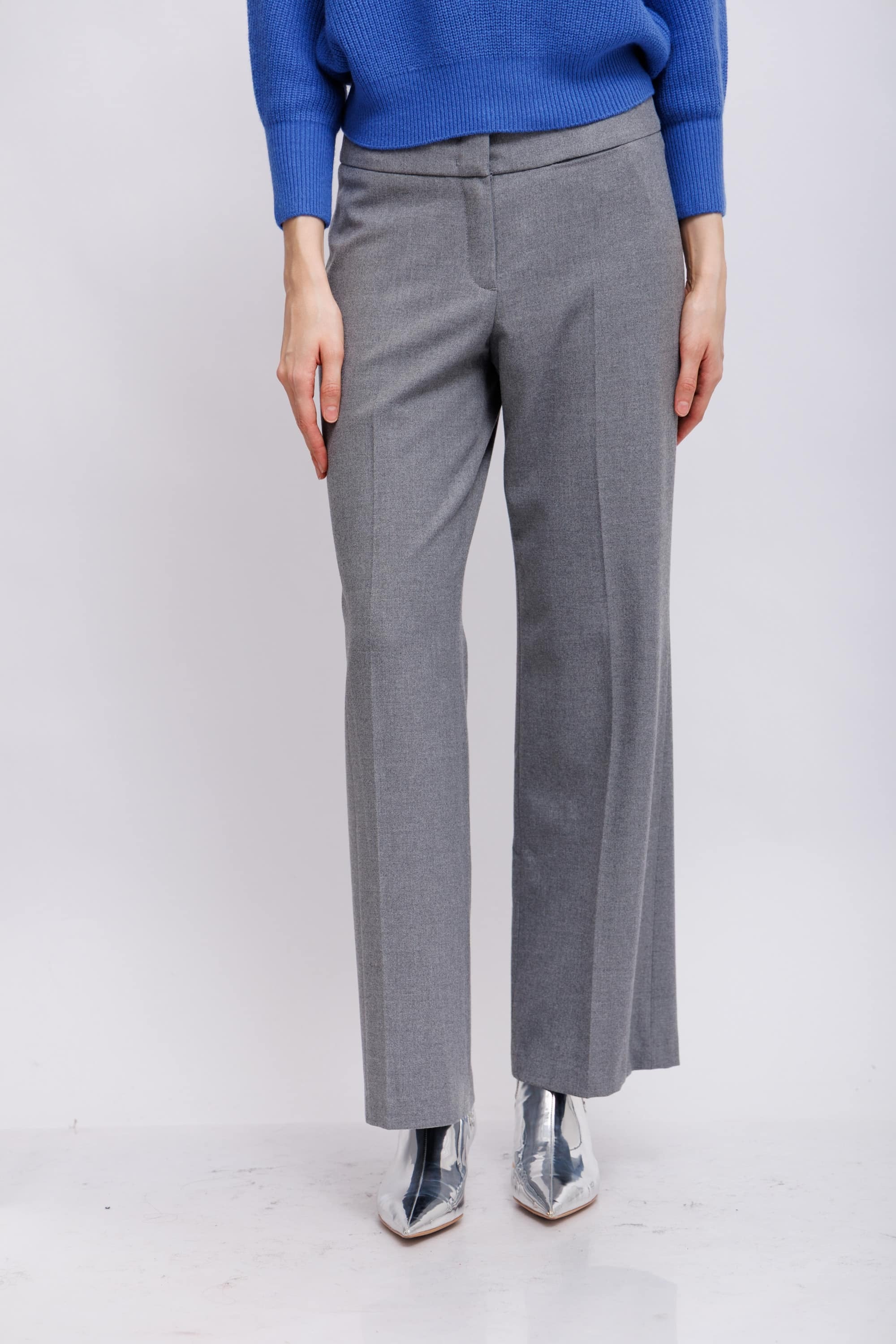 Брюки серые широкого крояПосадка средней высотыПояс отстроченный со шлевками под ременьДлина полноценнаяКарманы боковые прорезные