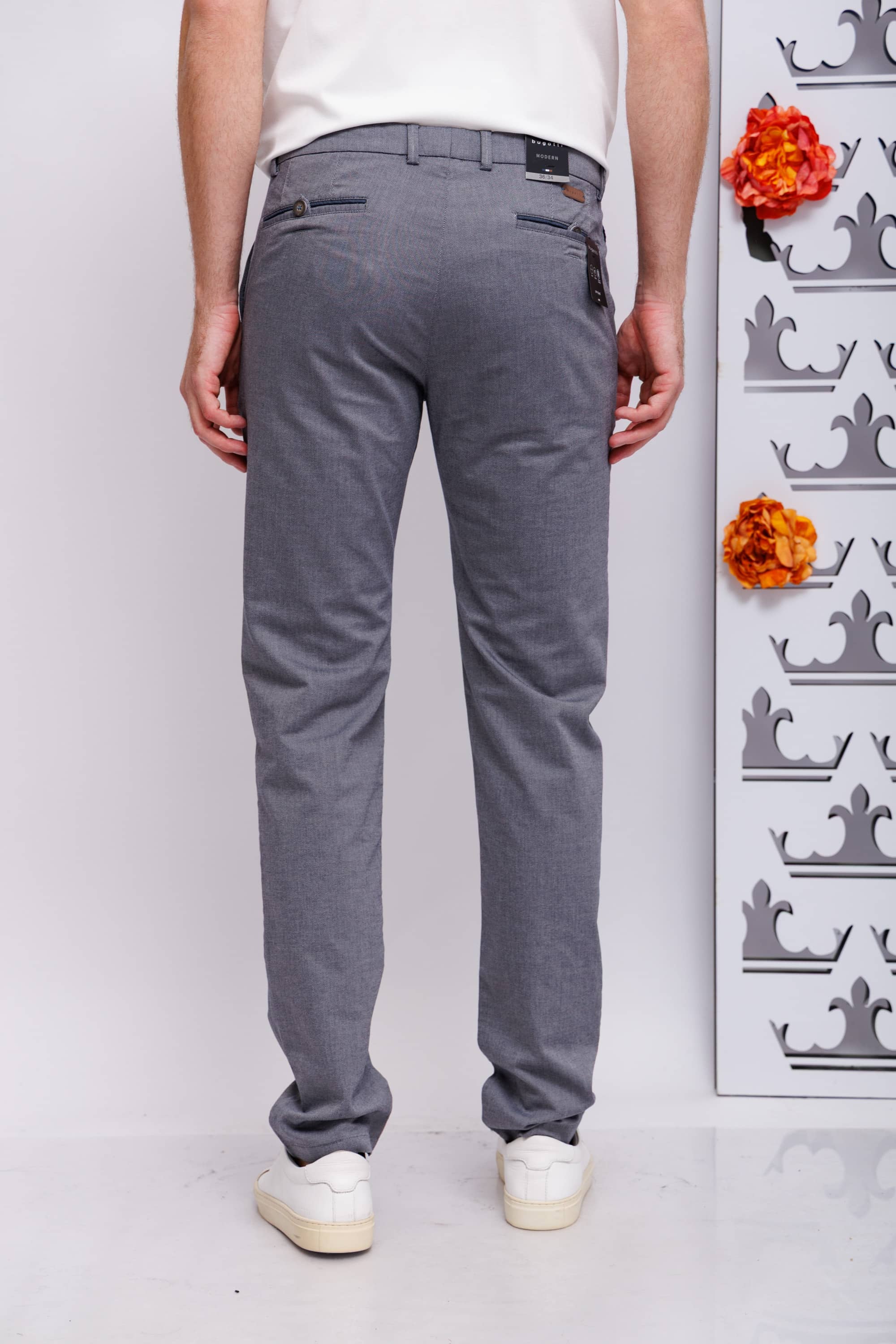Сзади карманы-рамки с контрастной отделкой, на пуговицах