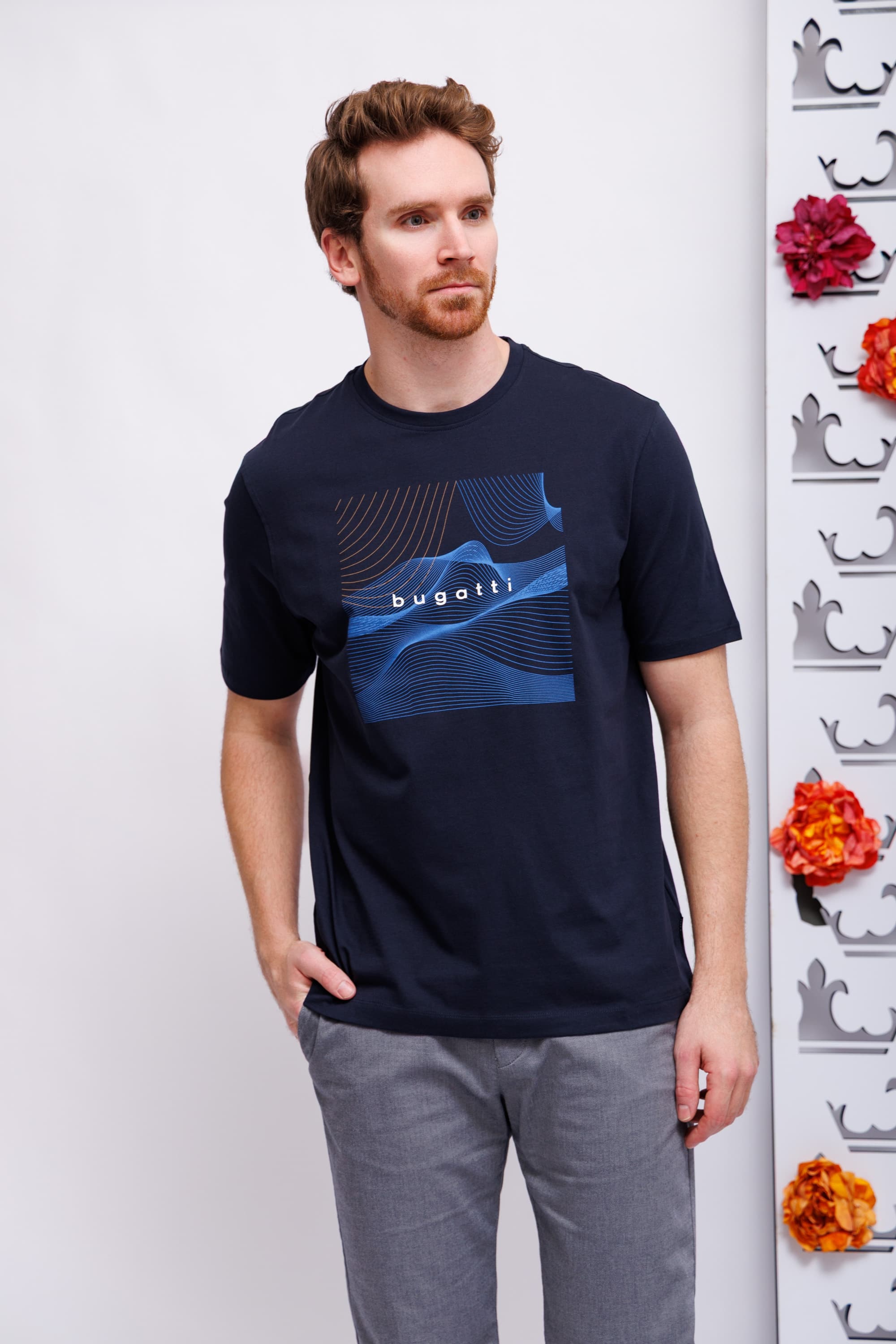 На груди- логотип и узор с абстрактными волнами в голубом цвете