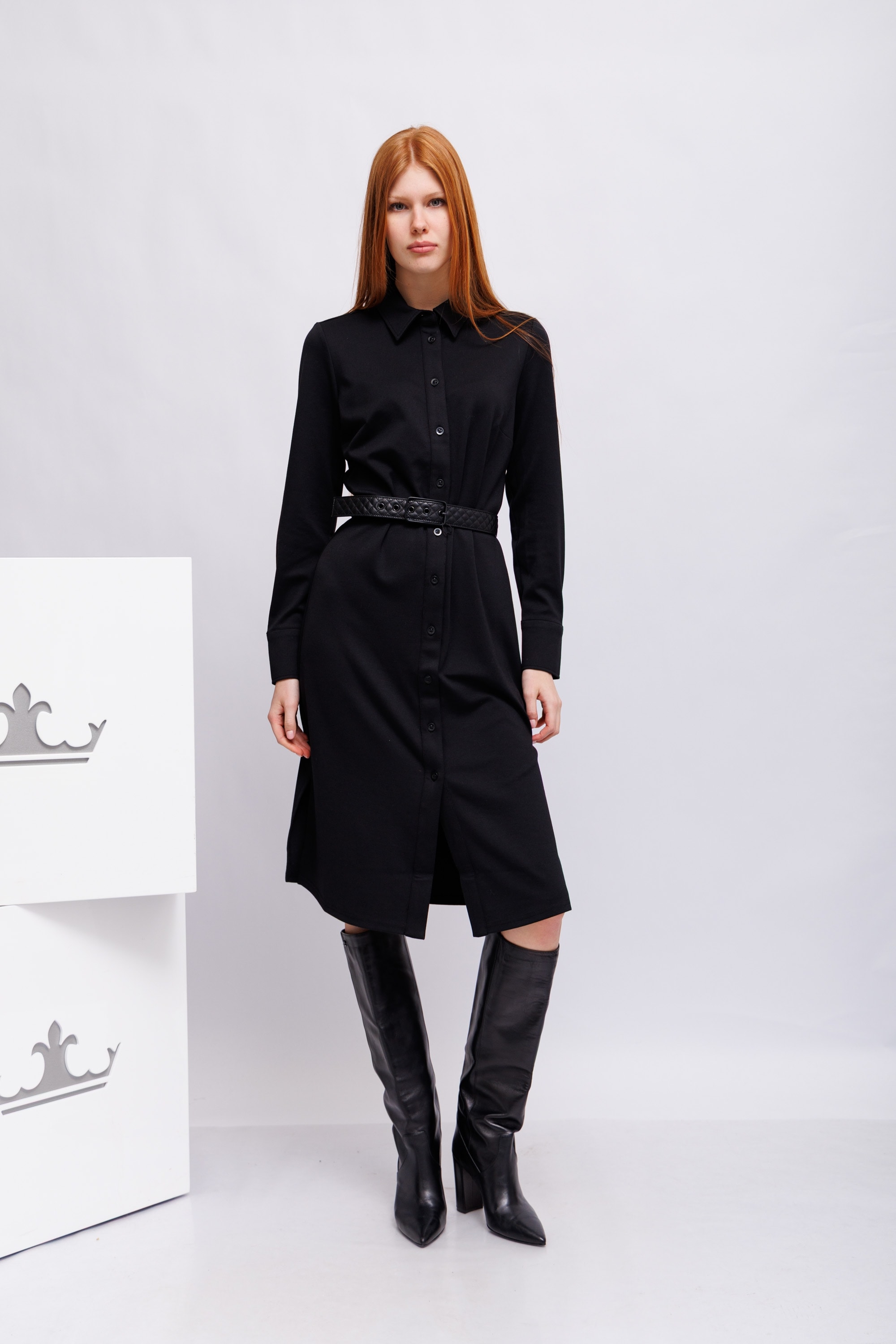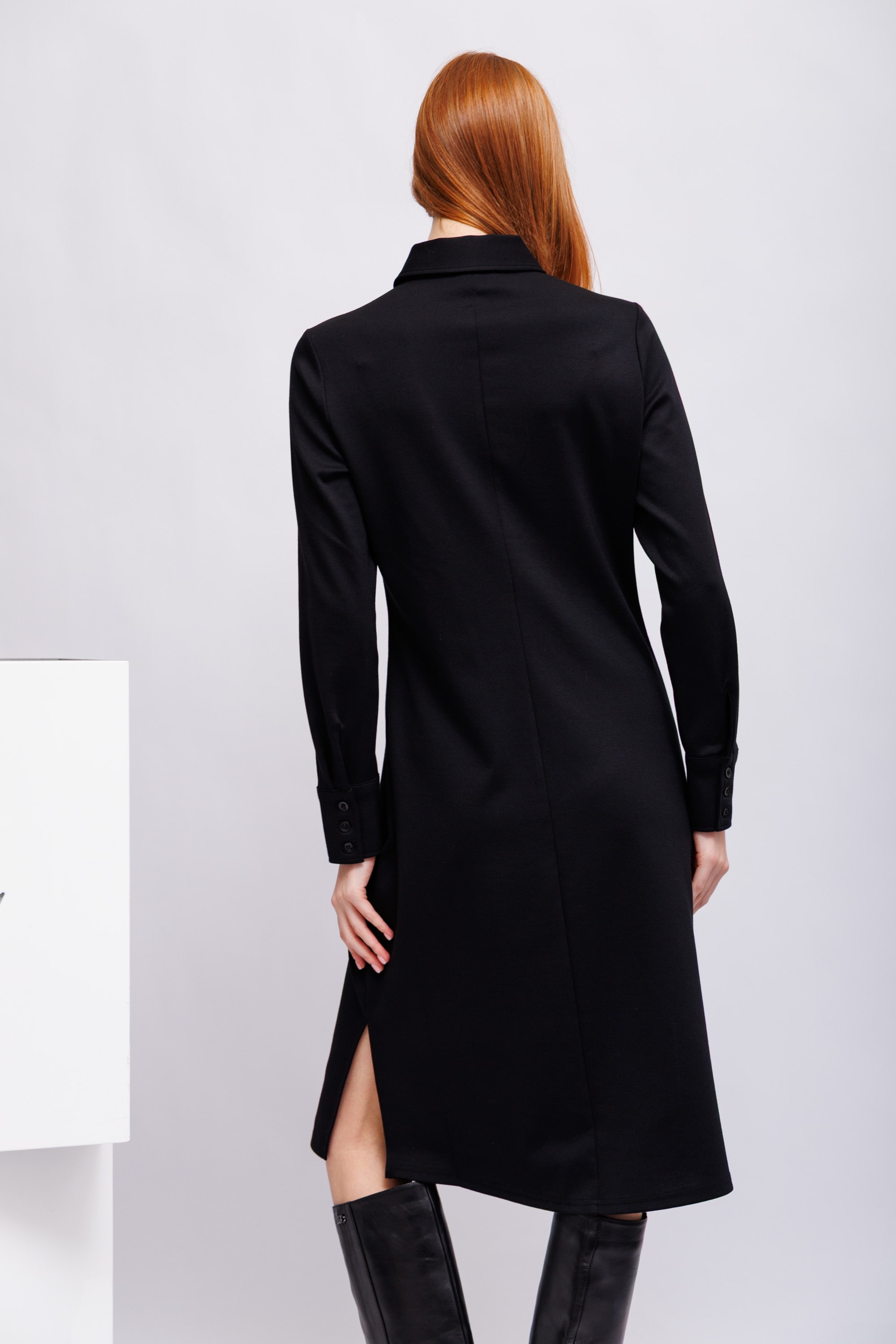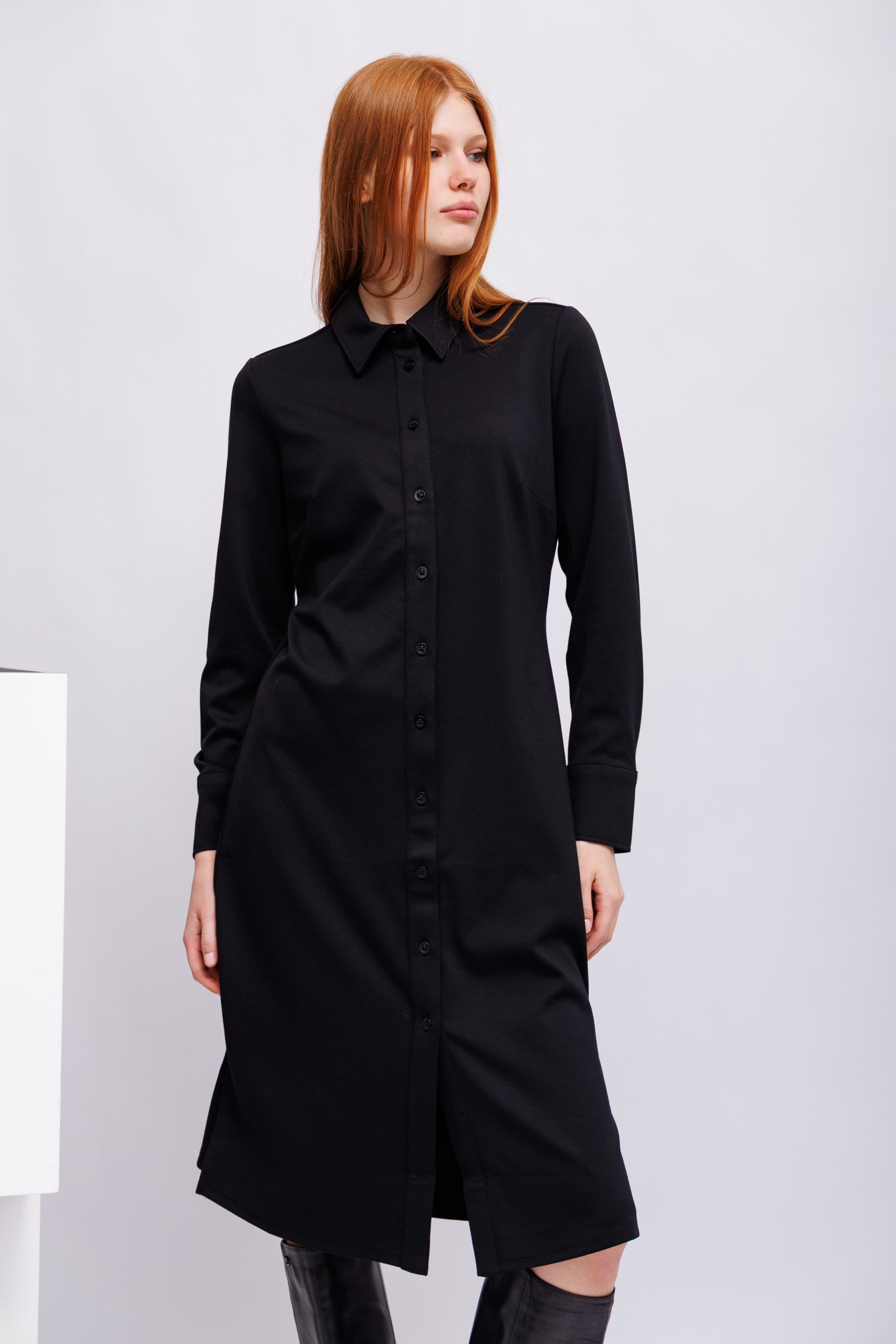 Платье-блузка из трикотажа с воротником-стойкой и эластичной вставкой, черного цвета.