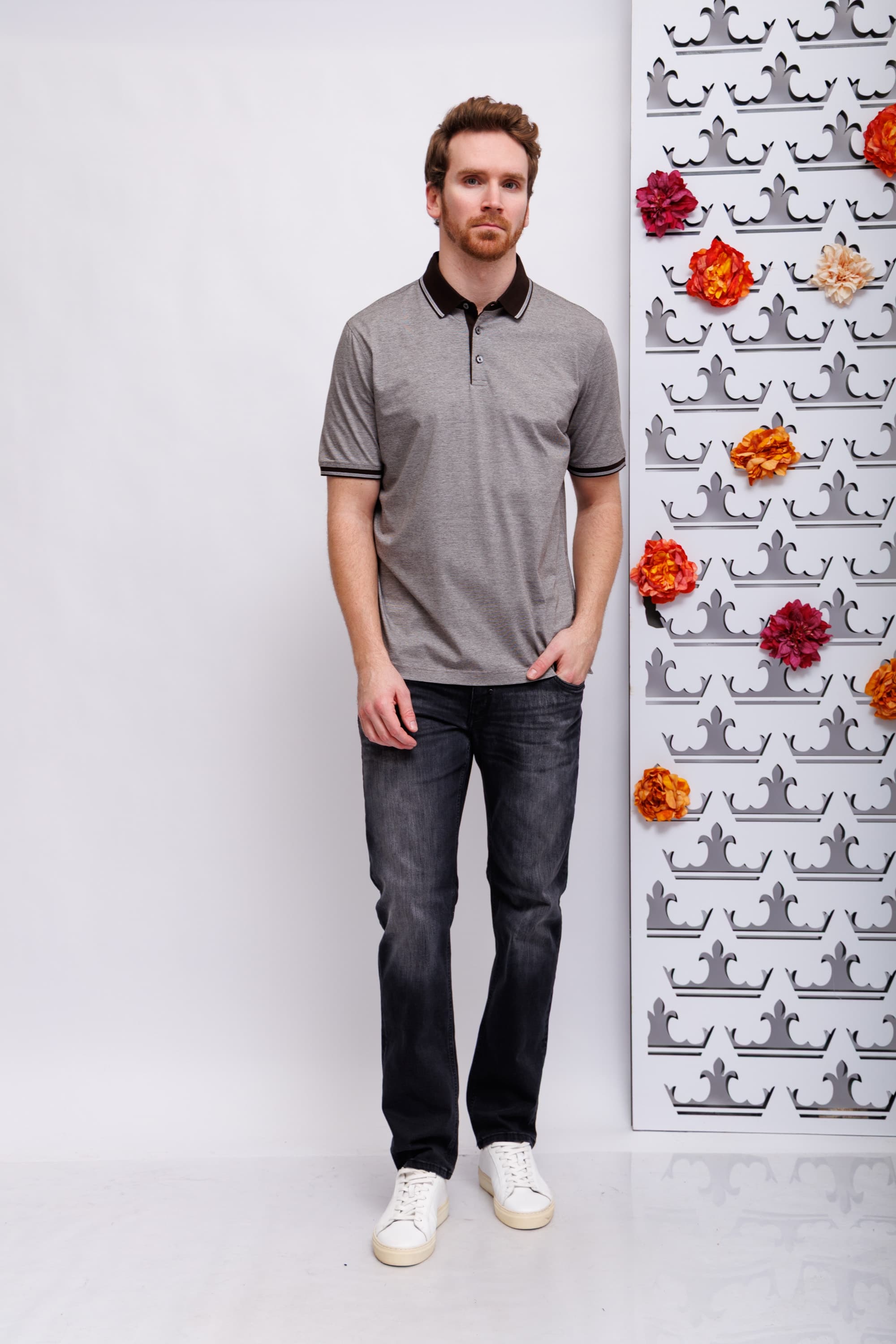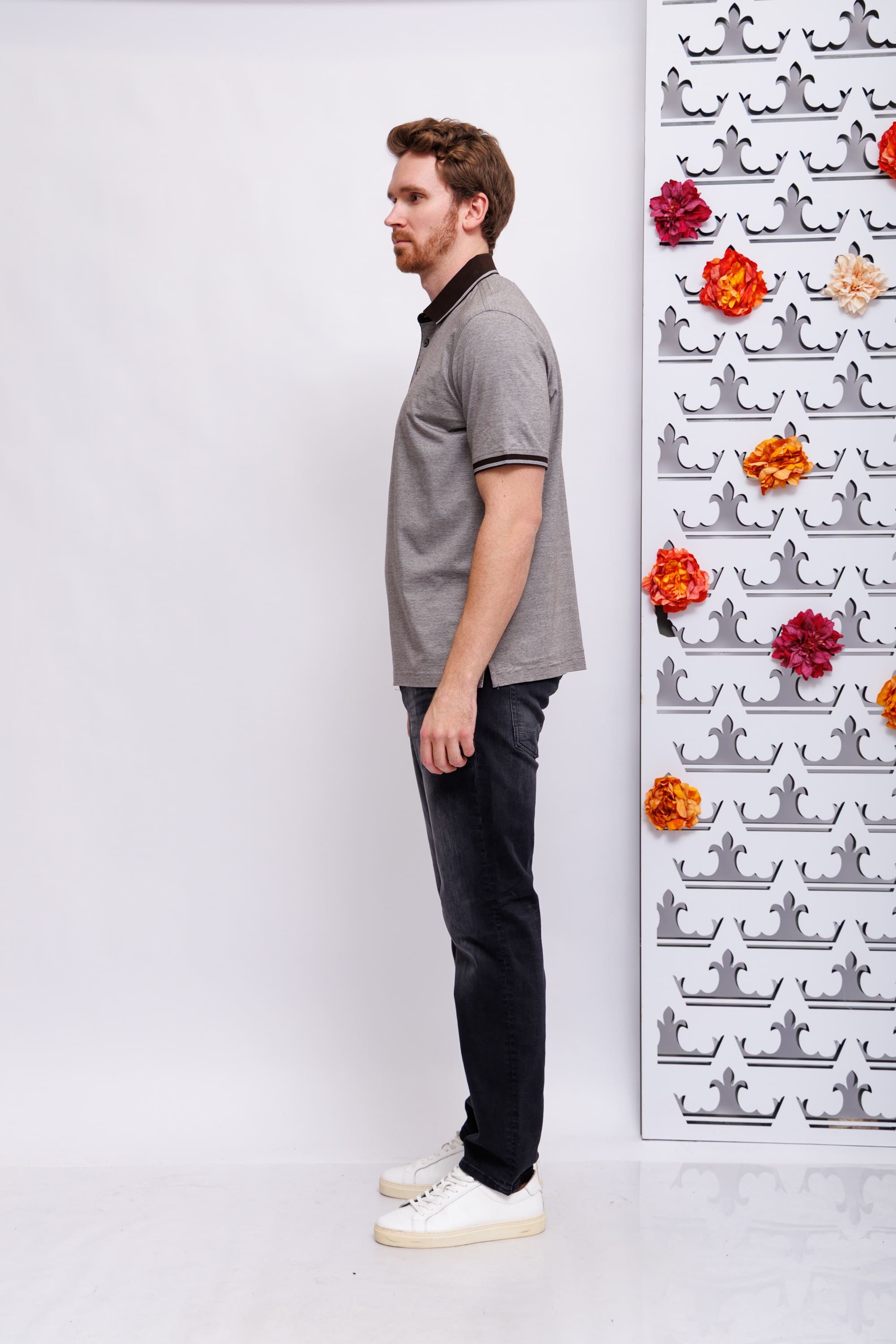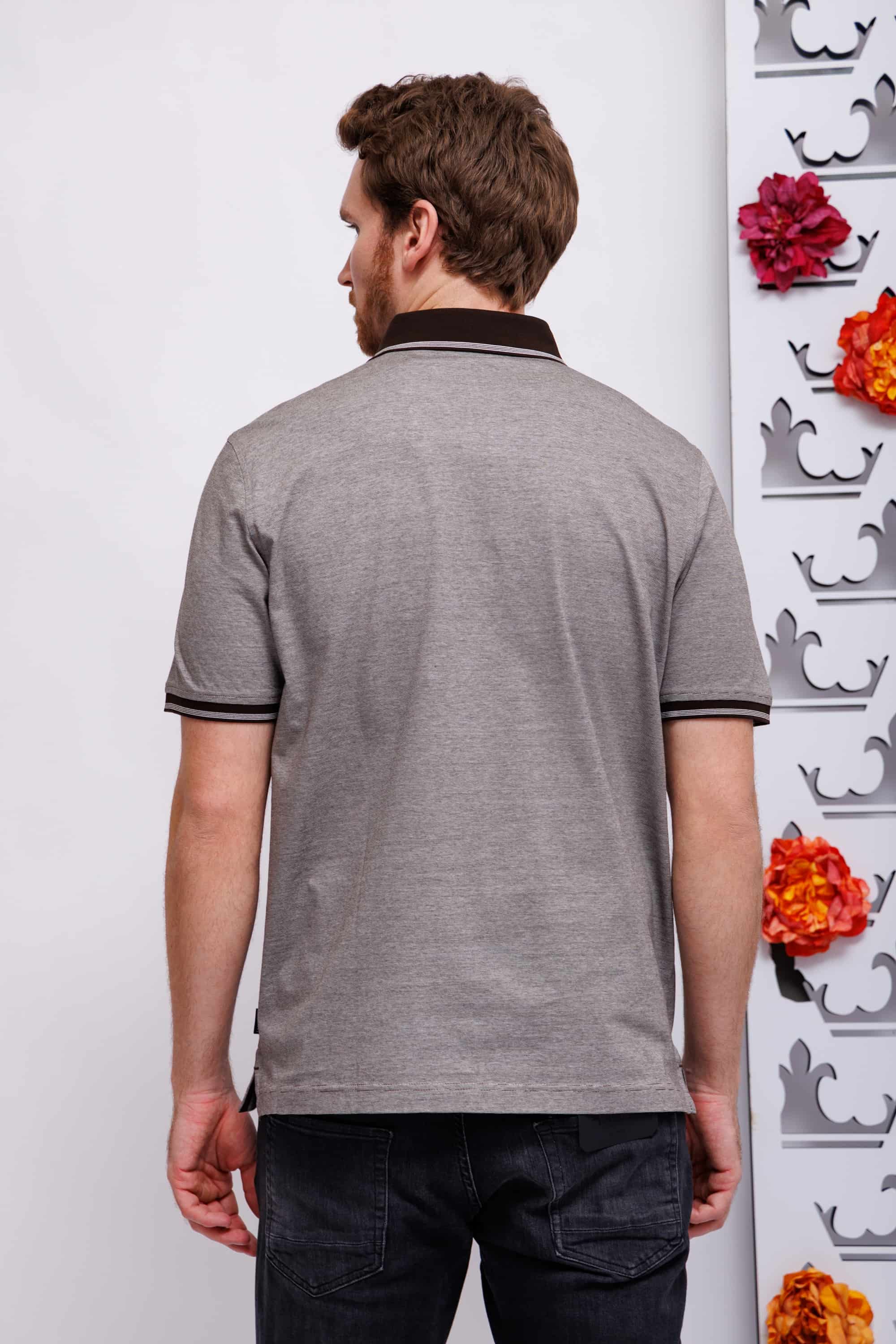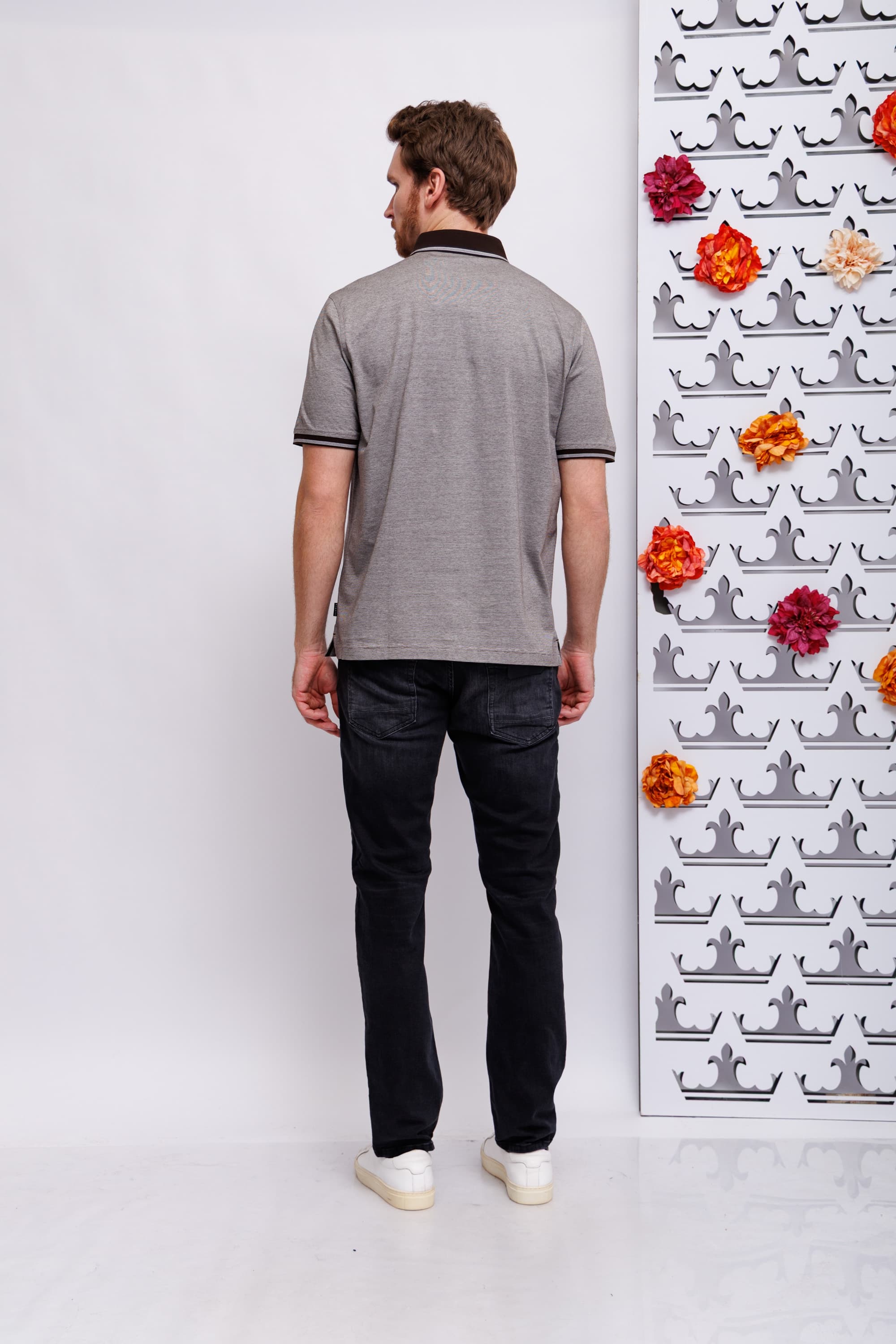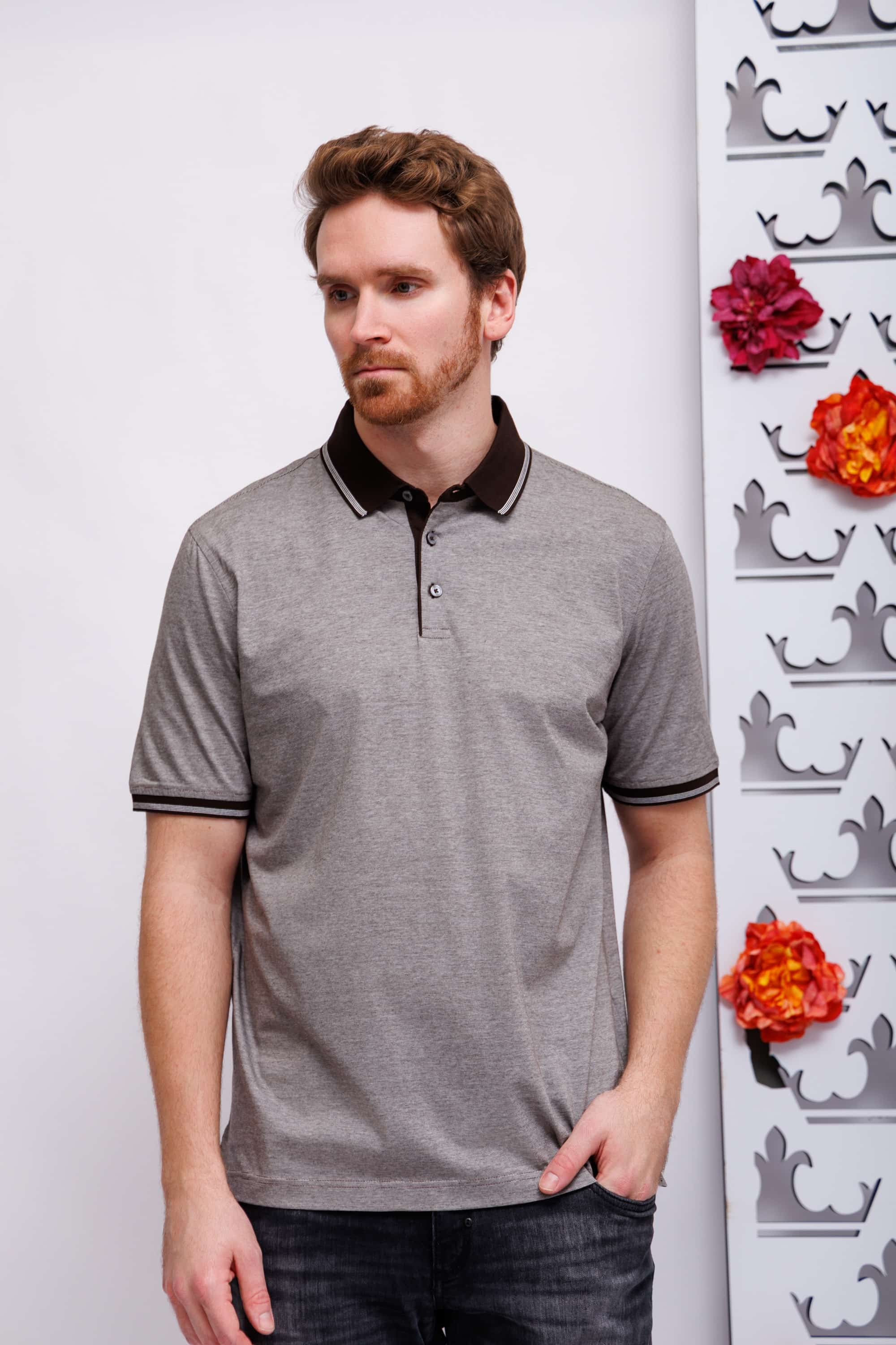 Поло хлопковое серо-бежевого цвета с акцентными деталями шоколадного цвета
