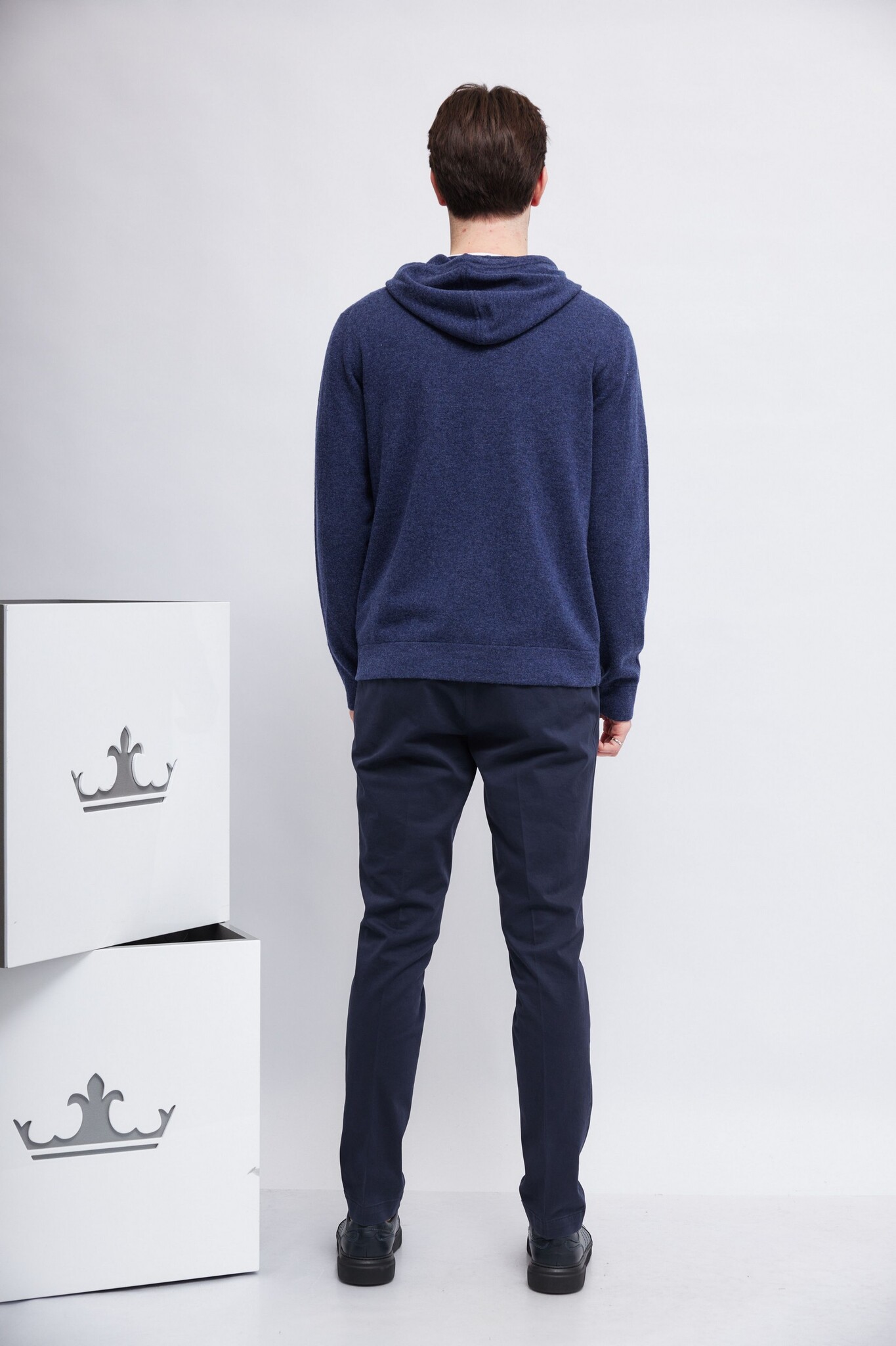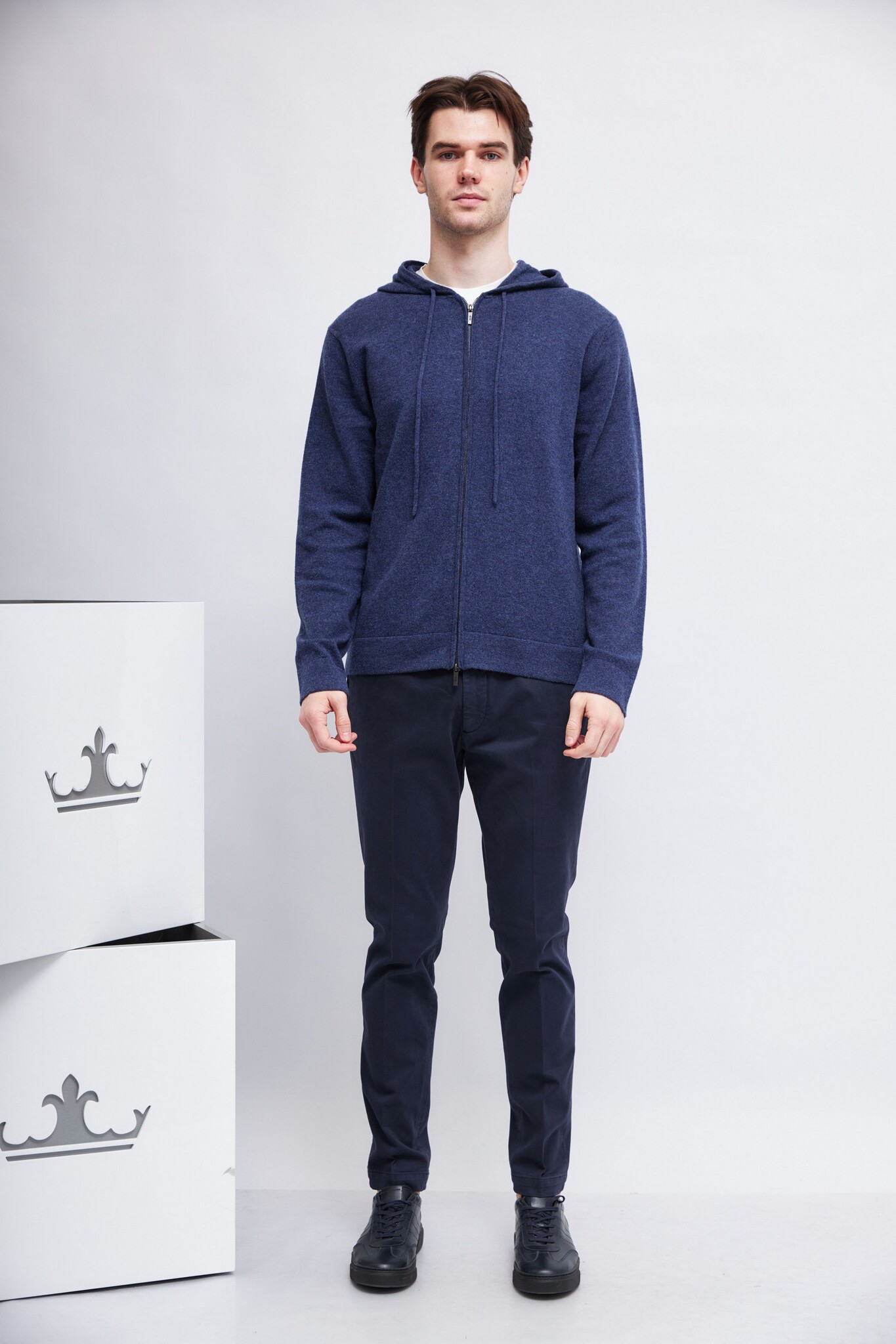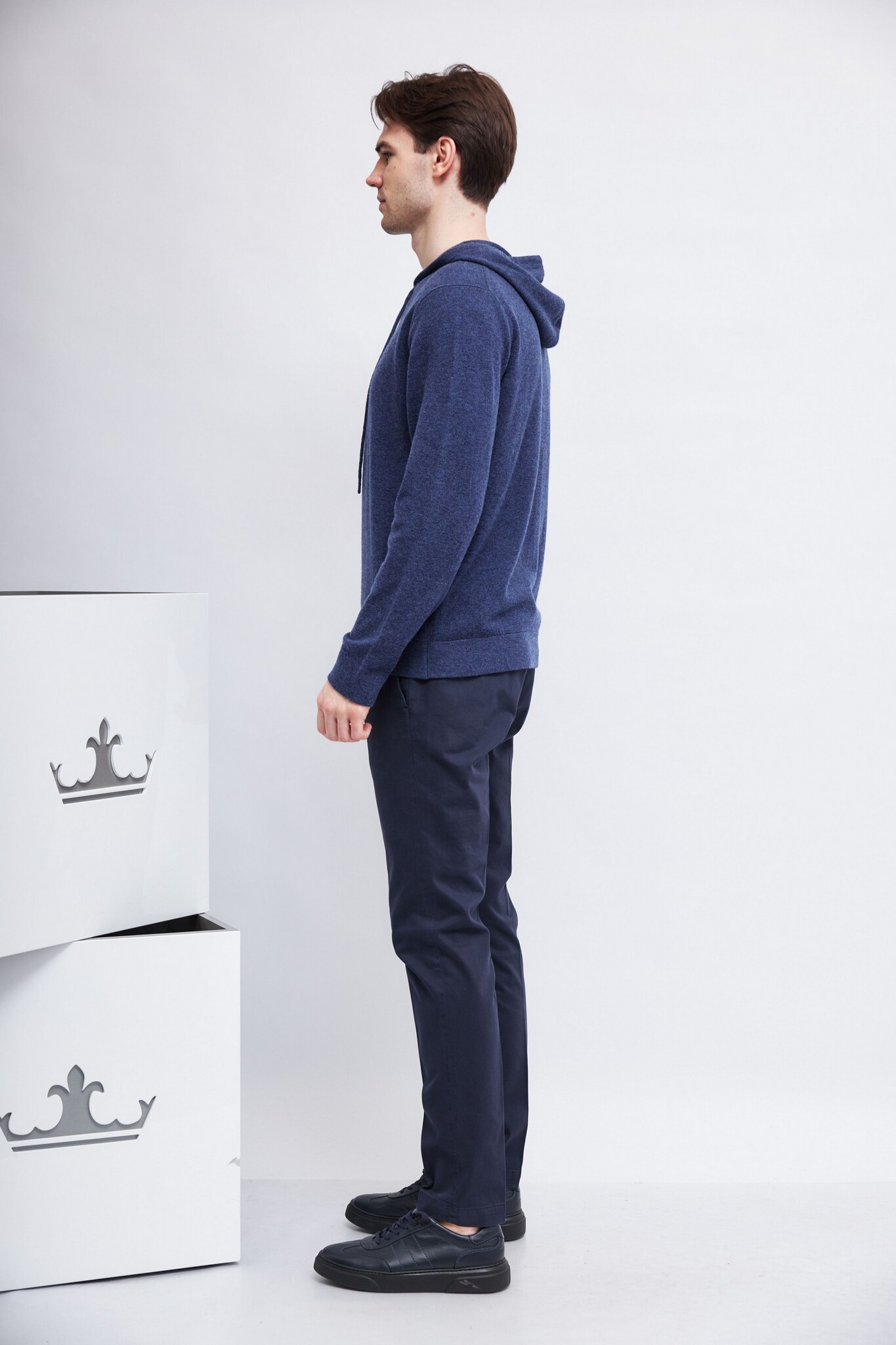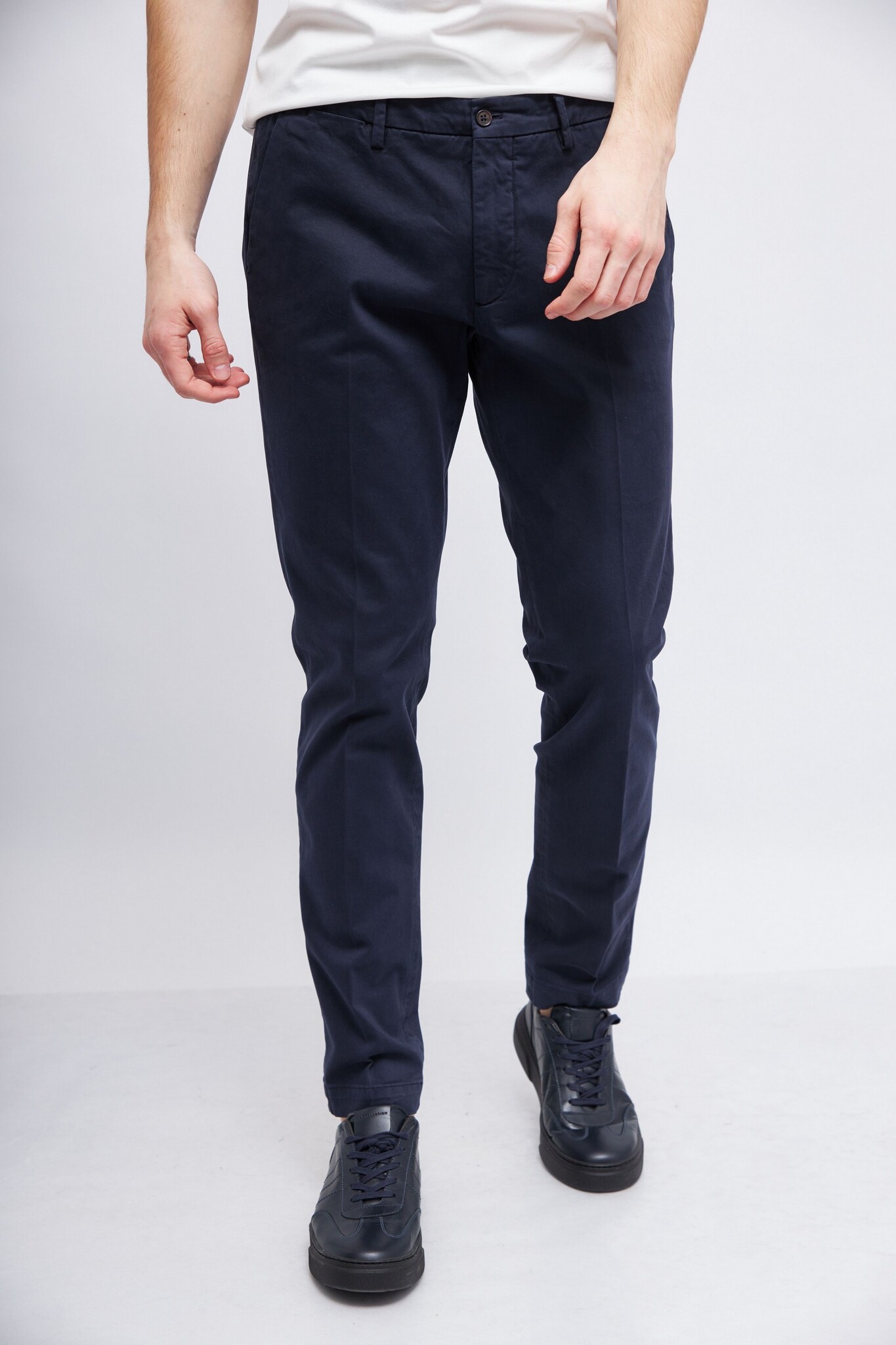 Брюки синего цвета с легким эффектом постиранностиКрой слегка зауженныйПояс со шлевкамиГульфик на скрытой молнии и пуговицеКосые боковые карманыСзади- карманы-рамки на пуговицах