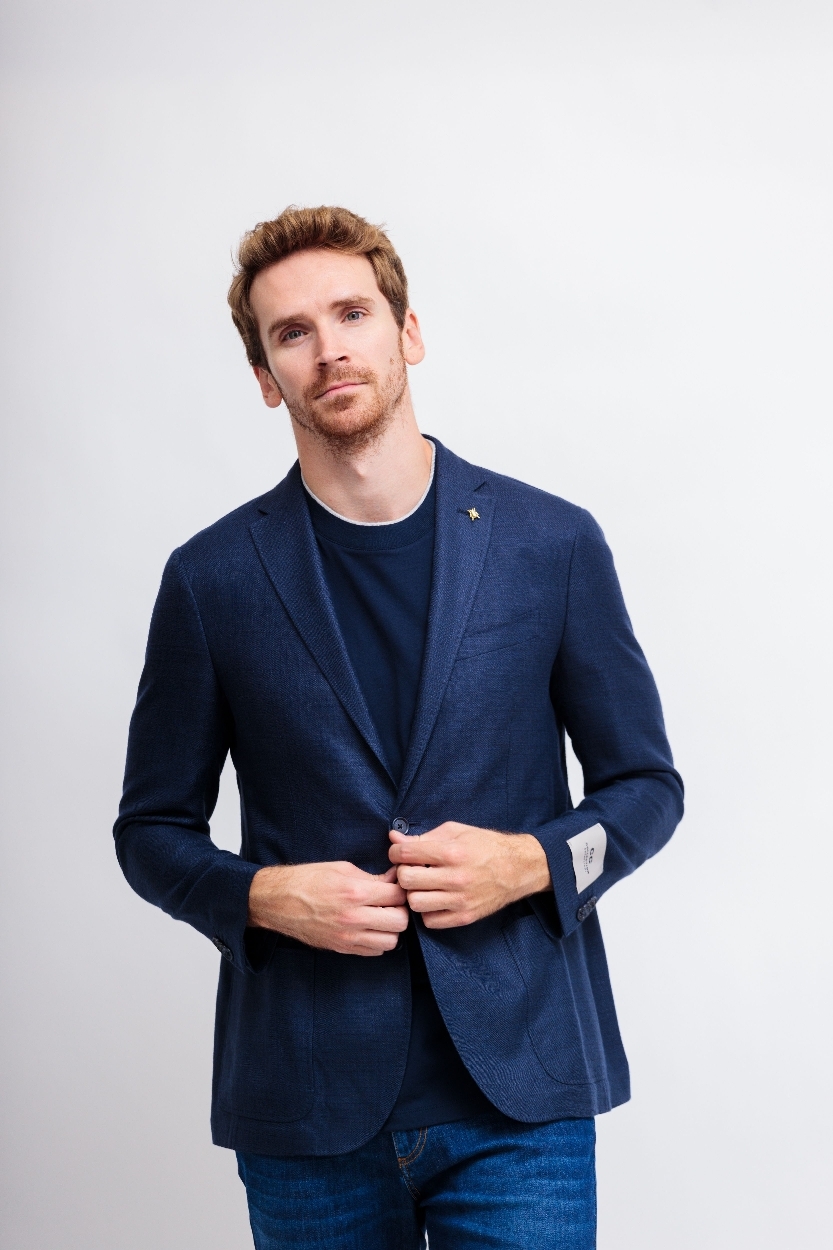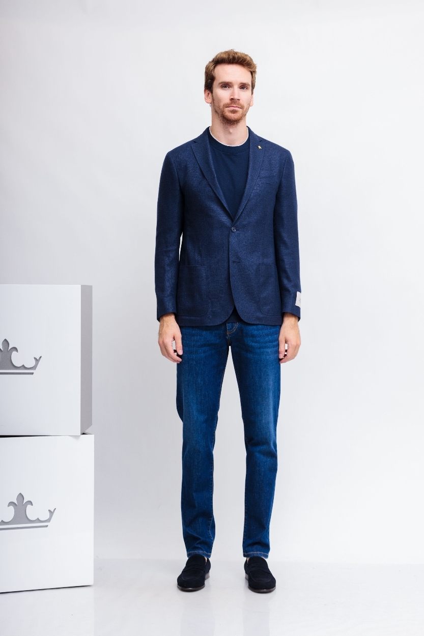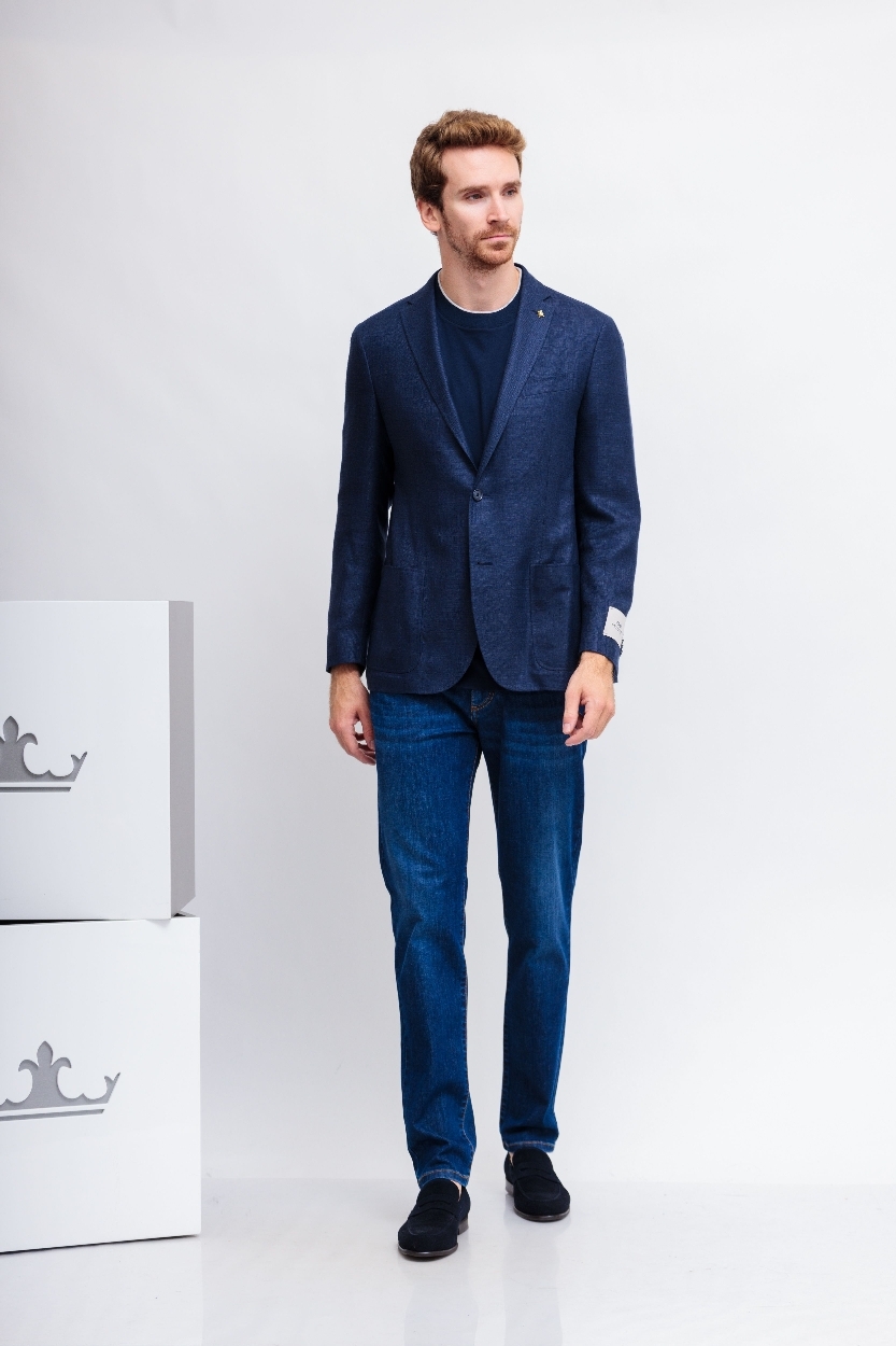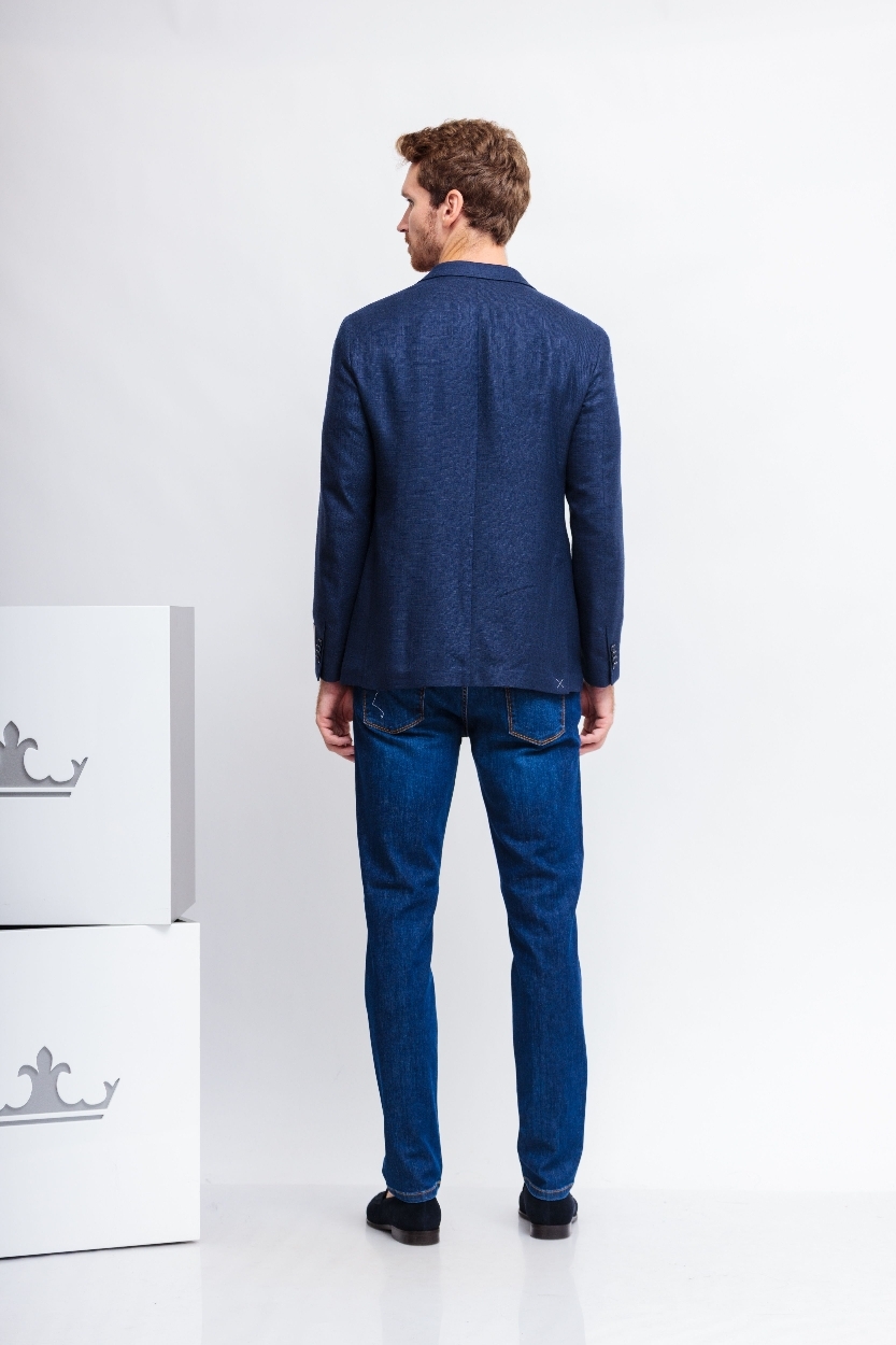 Пиджак синийСлегка приталенный кройЛацканы классические2 пуговицы2 шлицыКарманы накладныеНа груди- карман-листочкаНа рукавах- прорезные петли и "целующиеся"(соприкасающиеся) пуговицыПодклад В петлице- декоративный скарабей( символ марки)