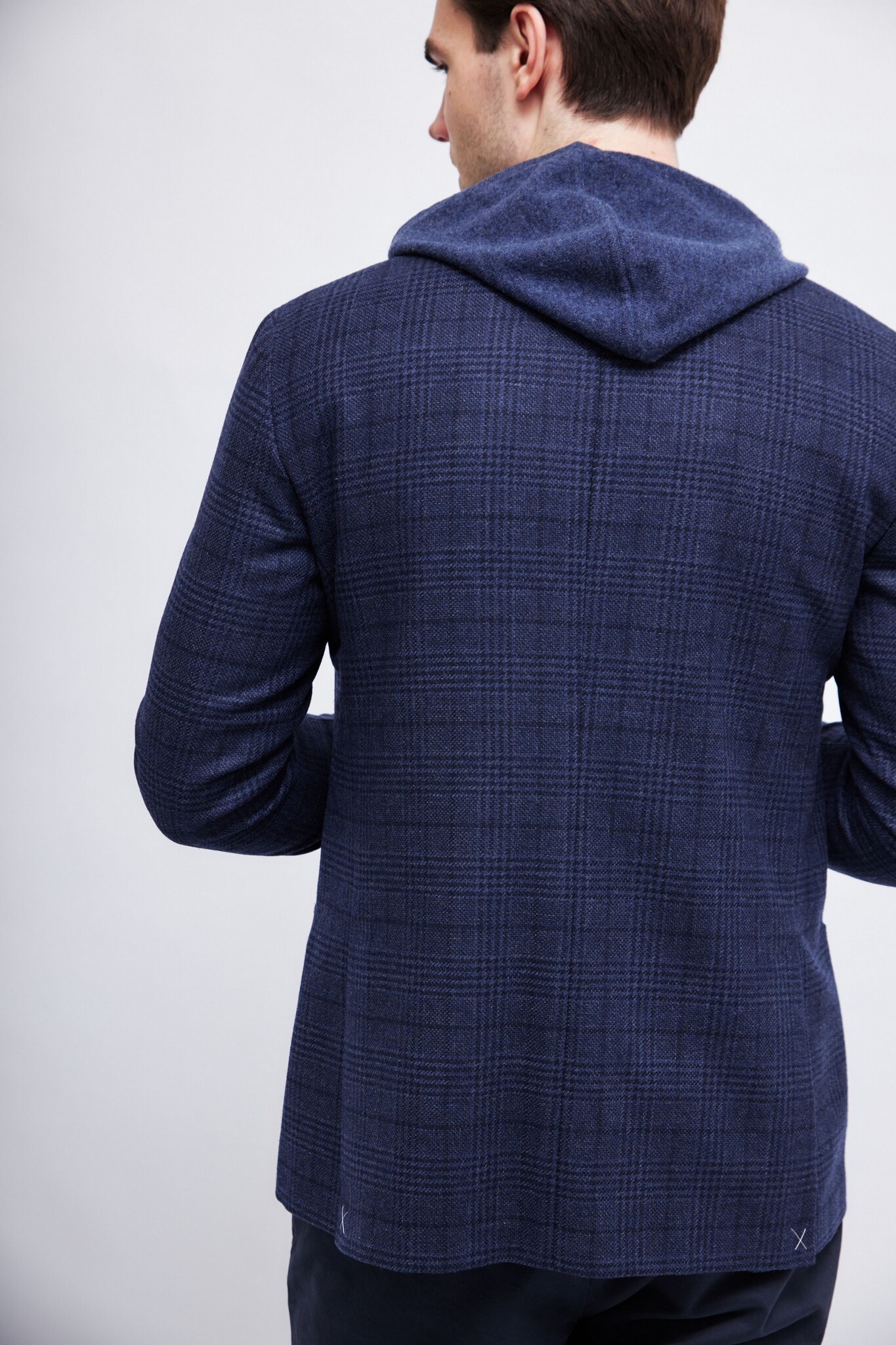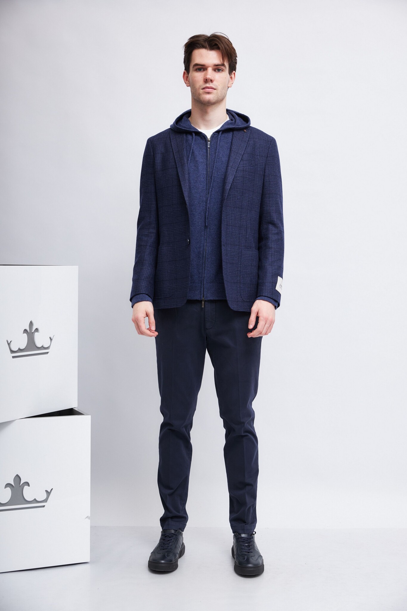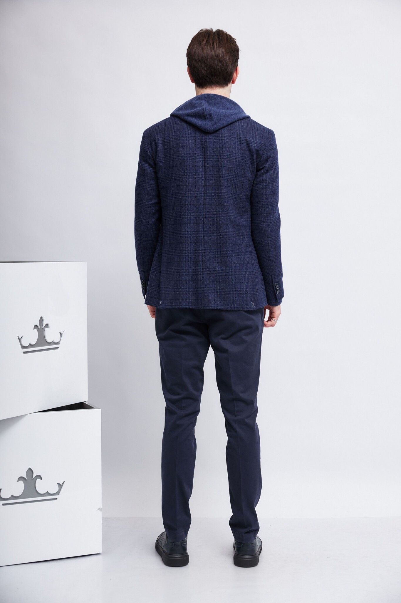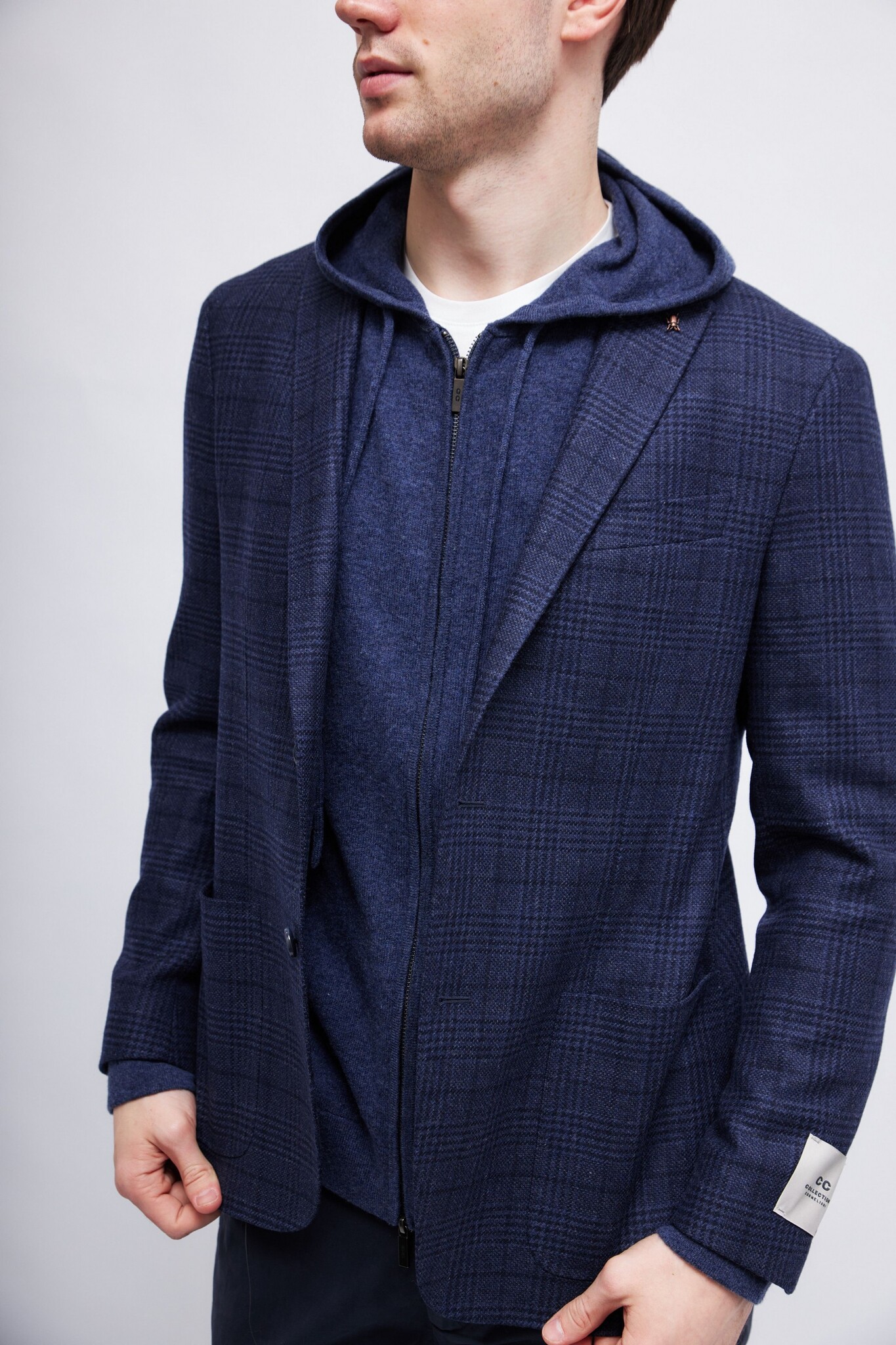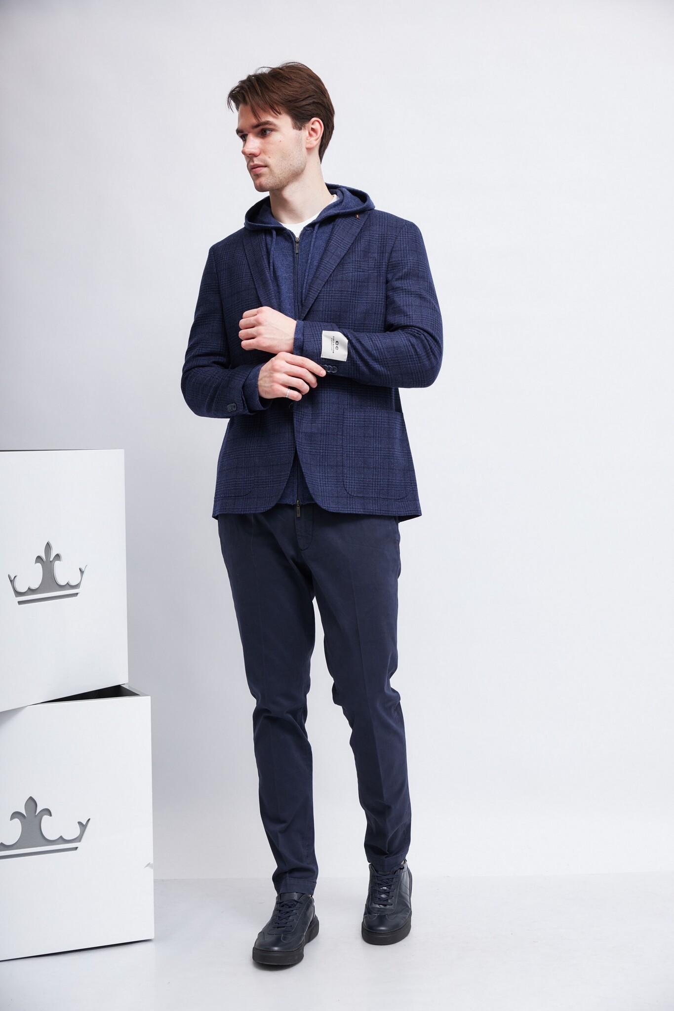 Пиджак синий в крупную множественную клеткуПрямой кройЛацканы классические со скарабеем( символ марки) в петлице2 пуговицы2 шлицыКарманы накладныеНа груди- карман-листочкаНа рукавах- прорезные петли и "целущиеся"(соприкасающиеся) пуговицыЧастичный подклад