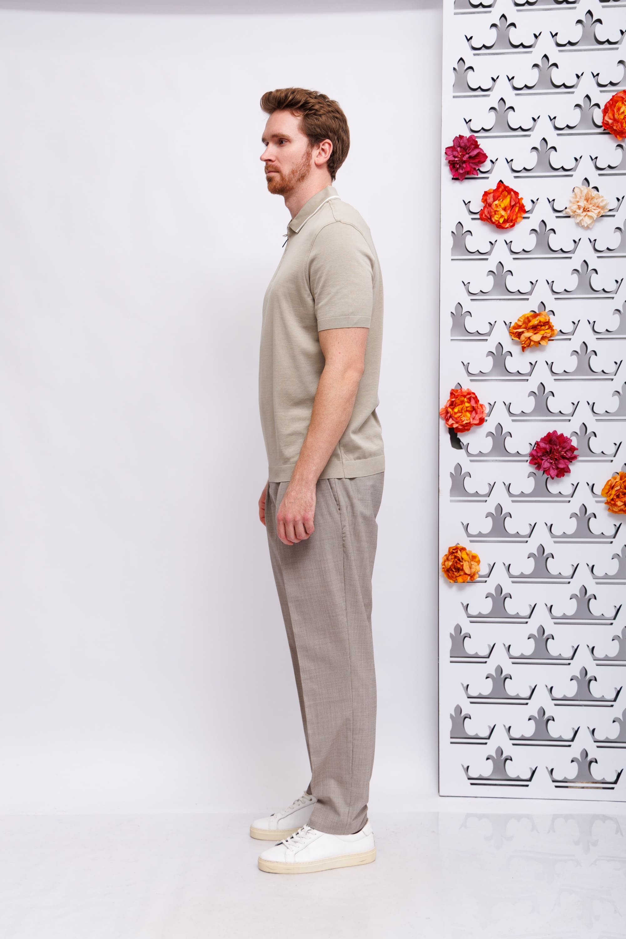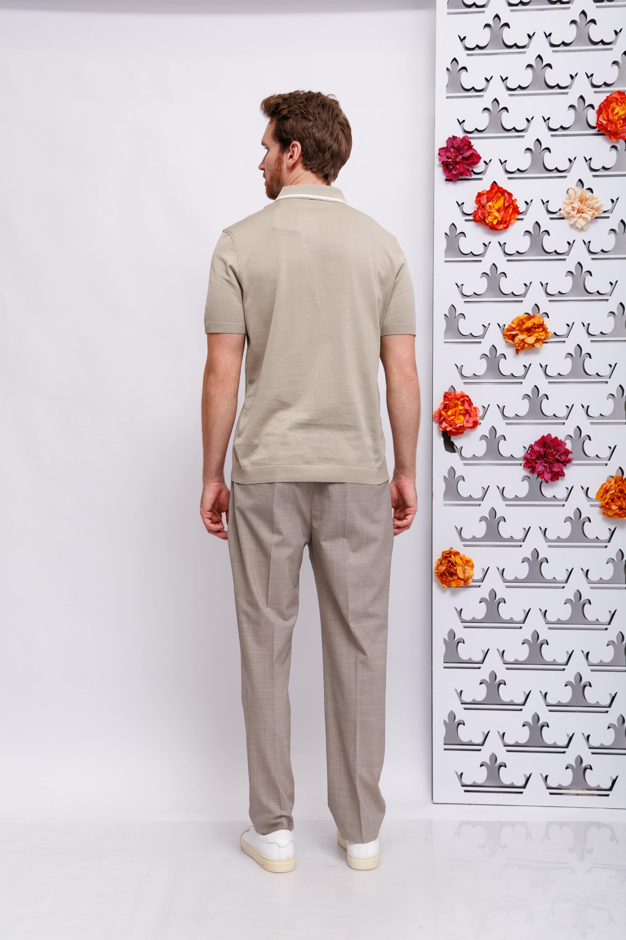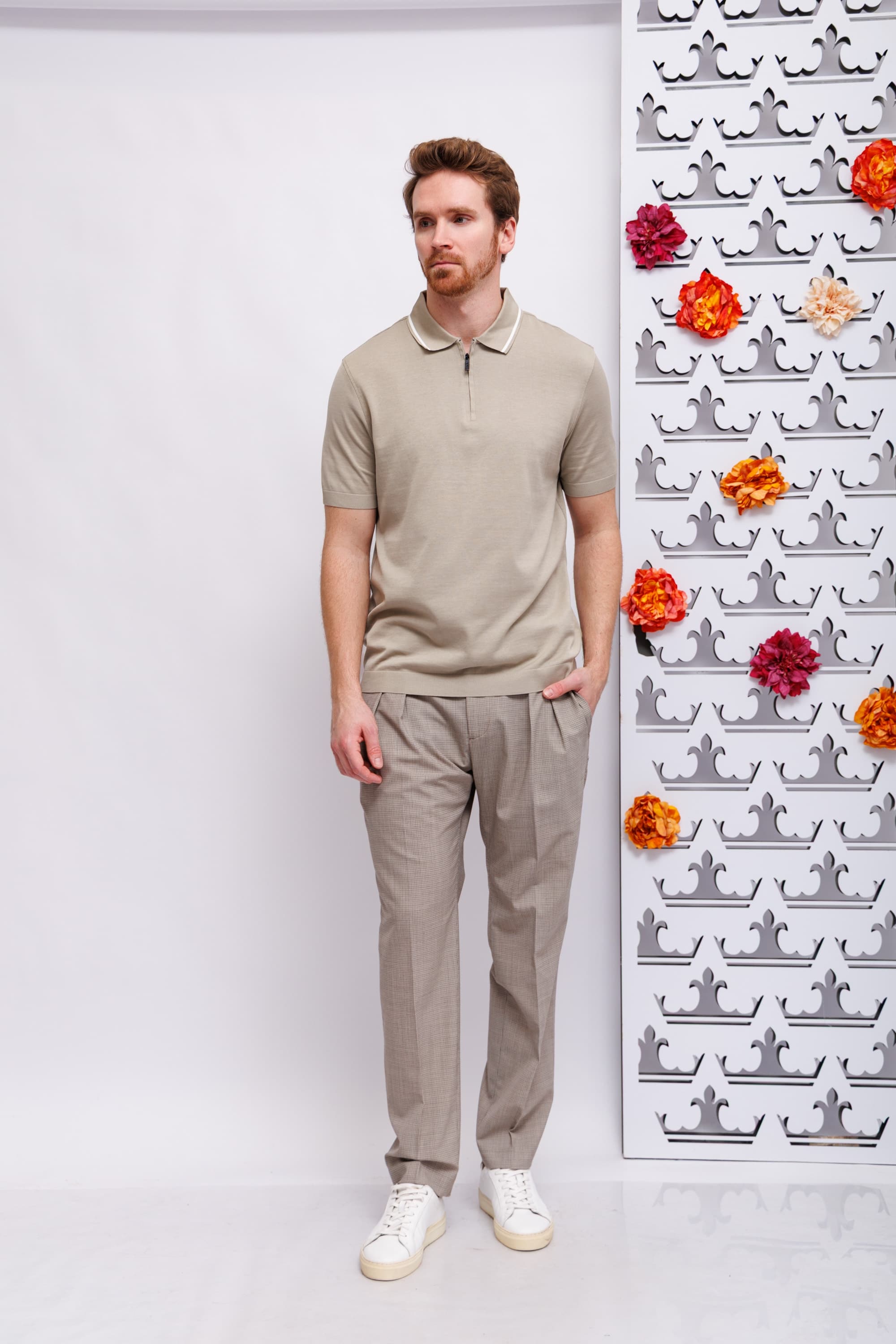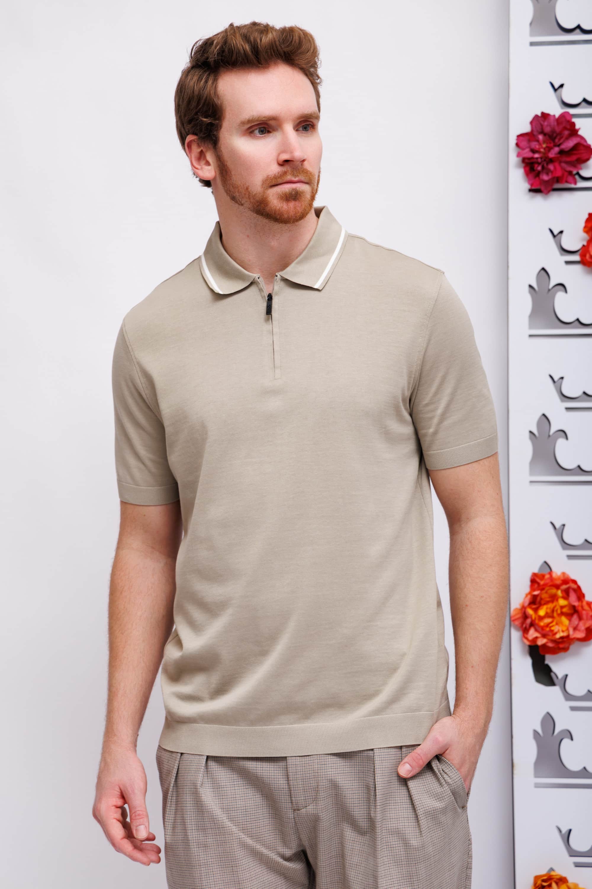 Поло бежевоеСлегка приталенный кройВорот на молнии с контрастной отделкой-полоскойМанжеты рукавов и низ изделия -трикотажная резинка