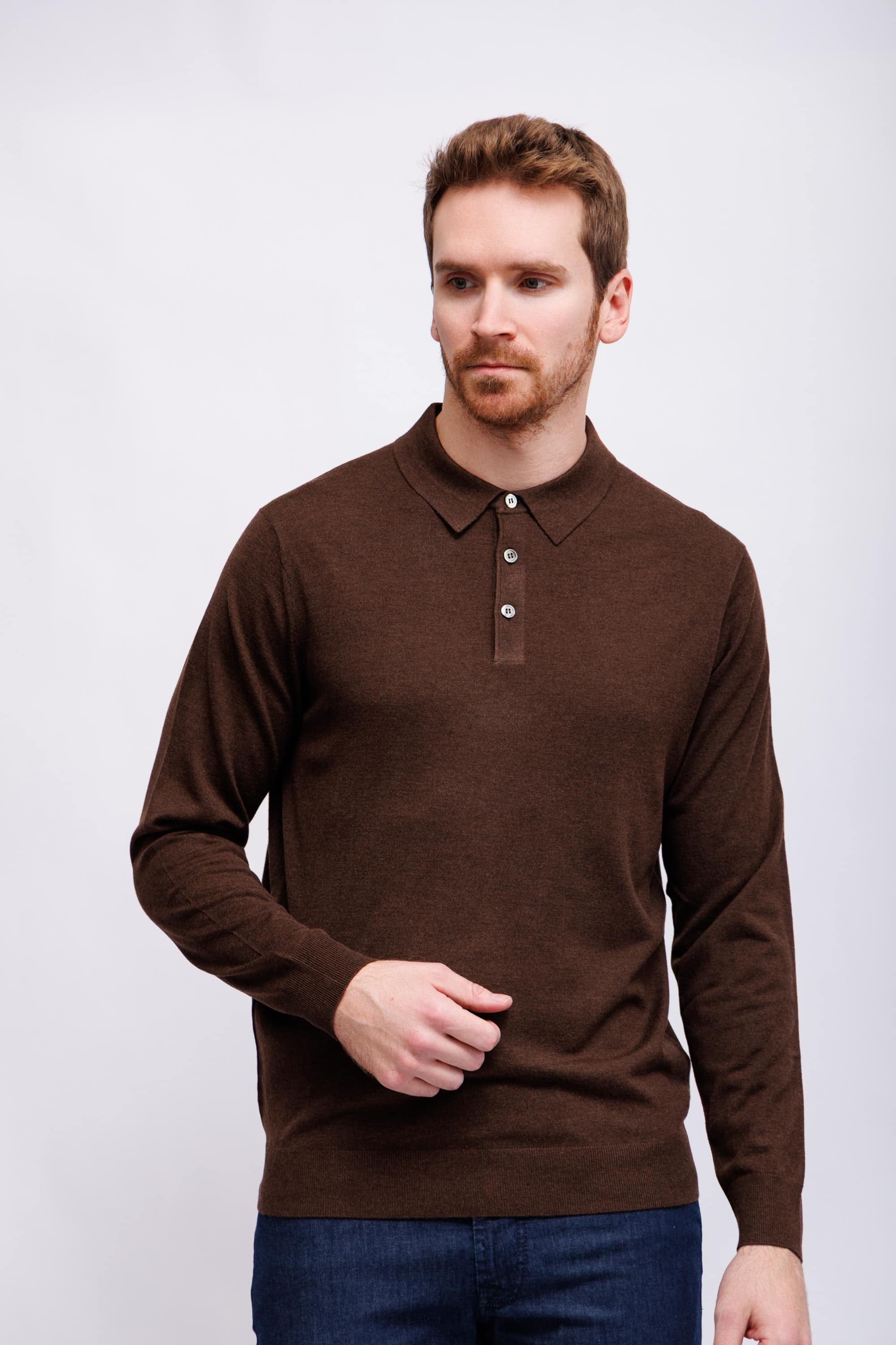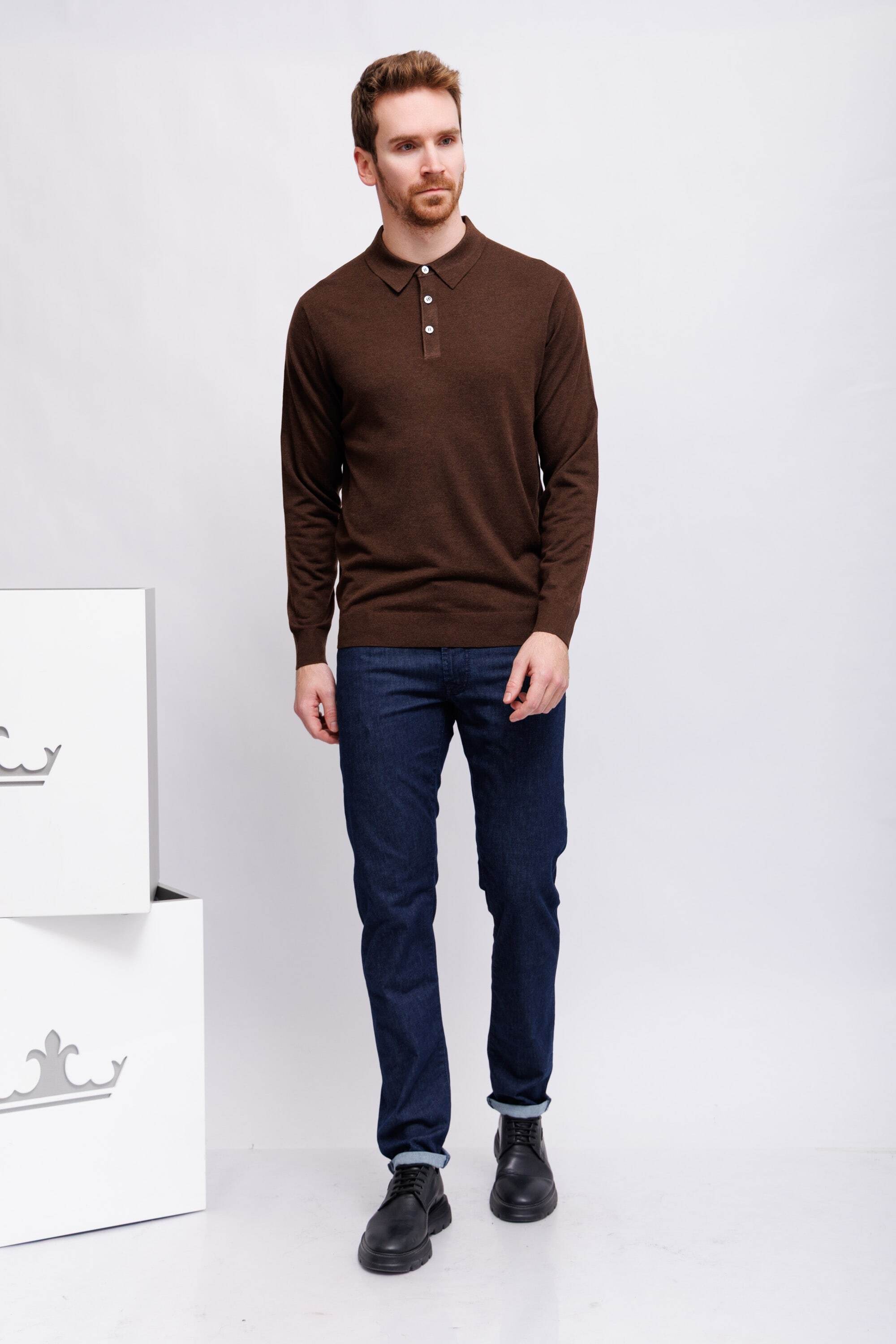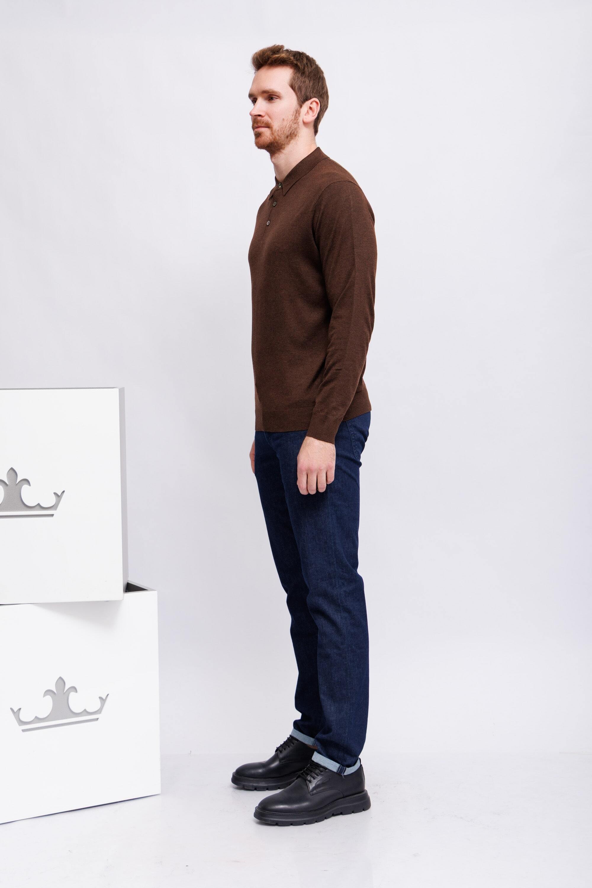 Поло коричневое трикотажноеСлегка приталенный кройВорот на пуговицахМанжеты длинных рукавов -трикотажная резинка
