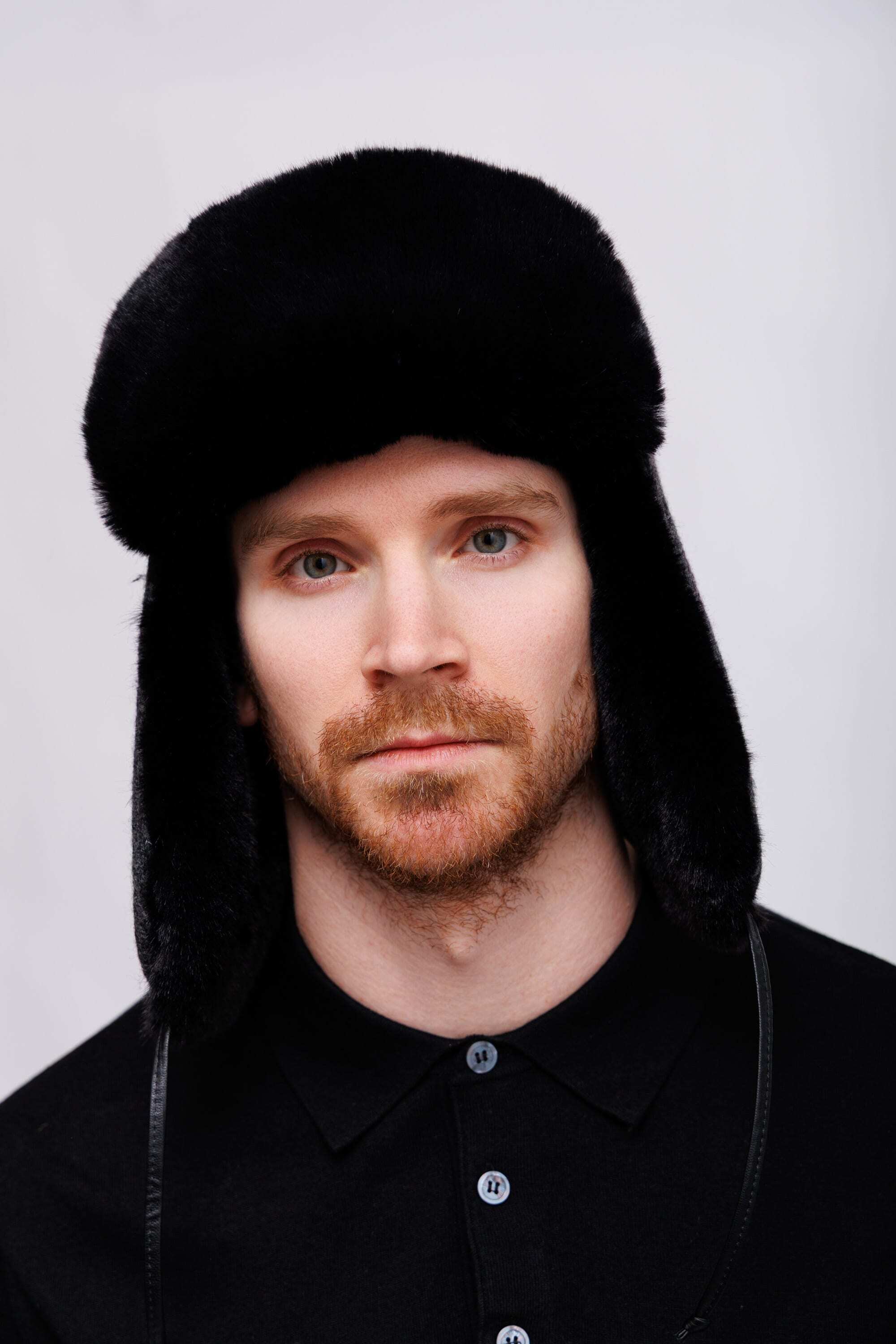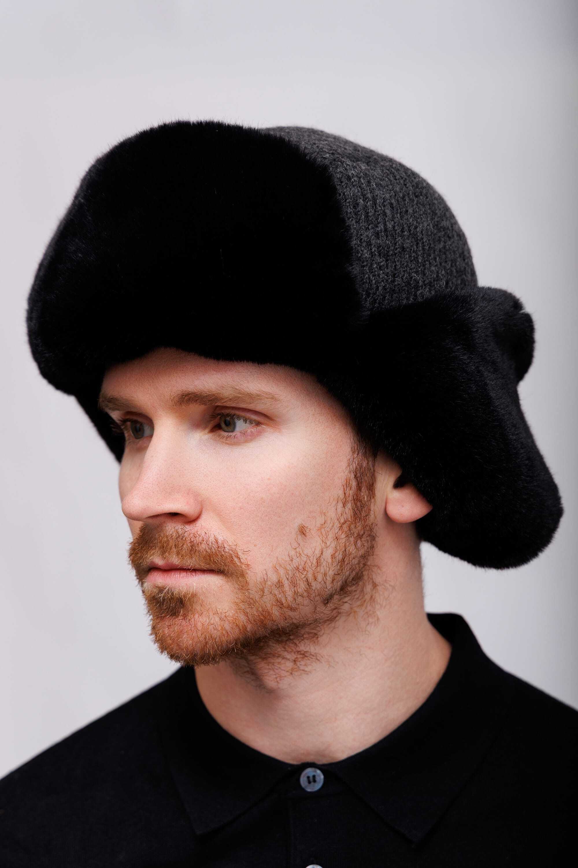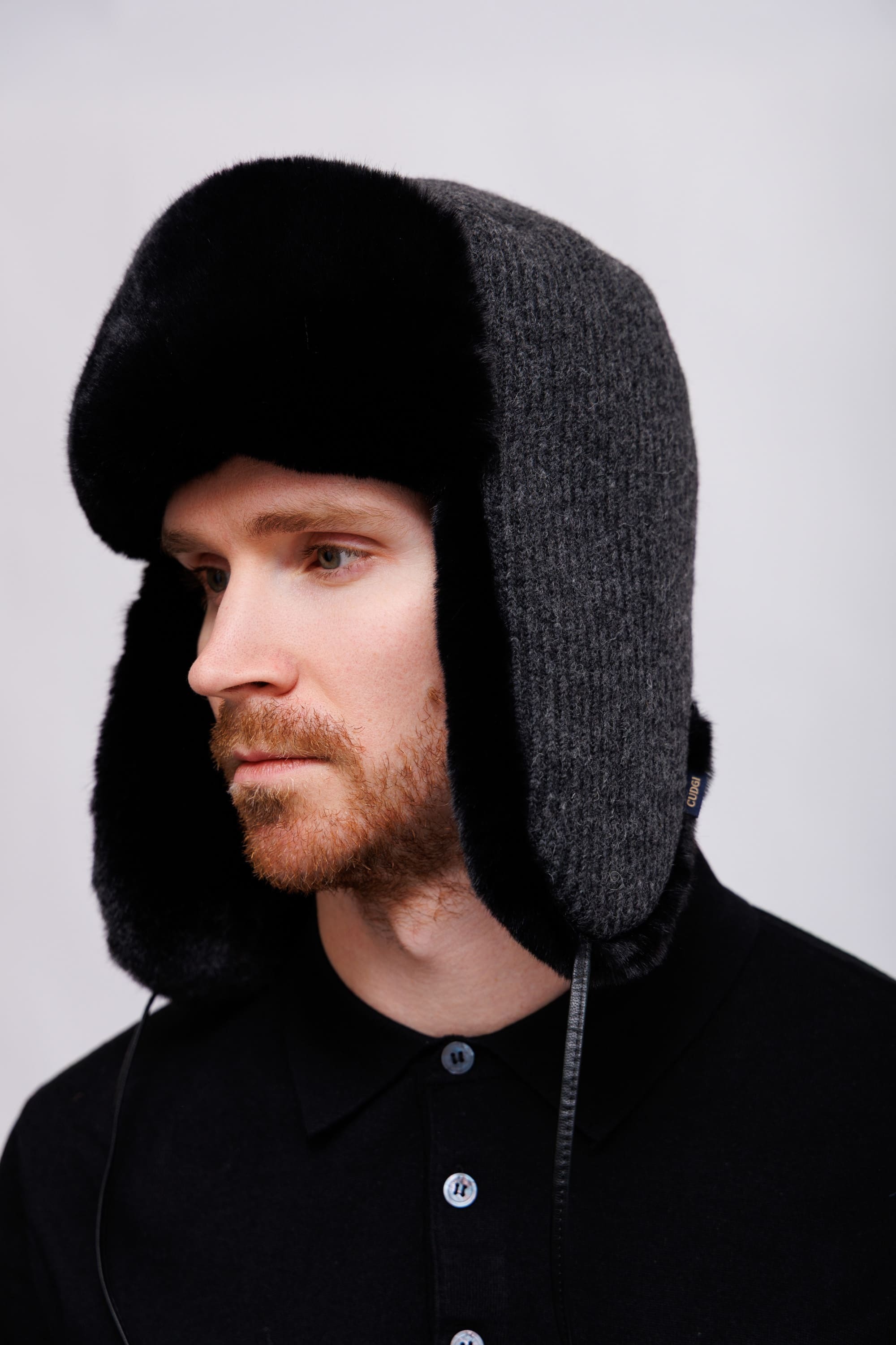 Шапка-ушанка вязанаяСераяОтделана мехомУшки фиксируются на завязках