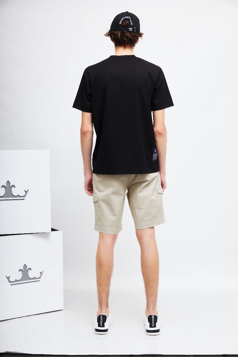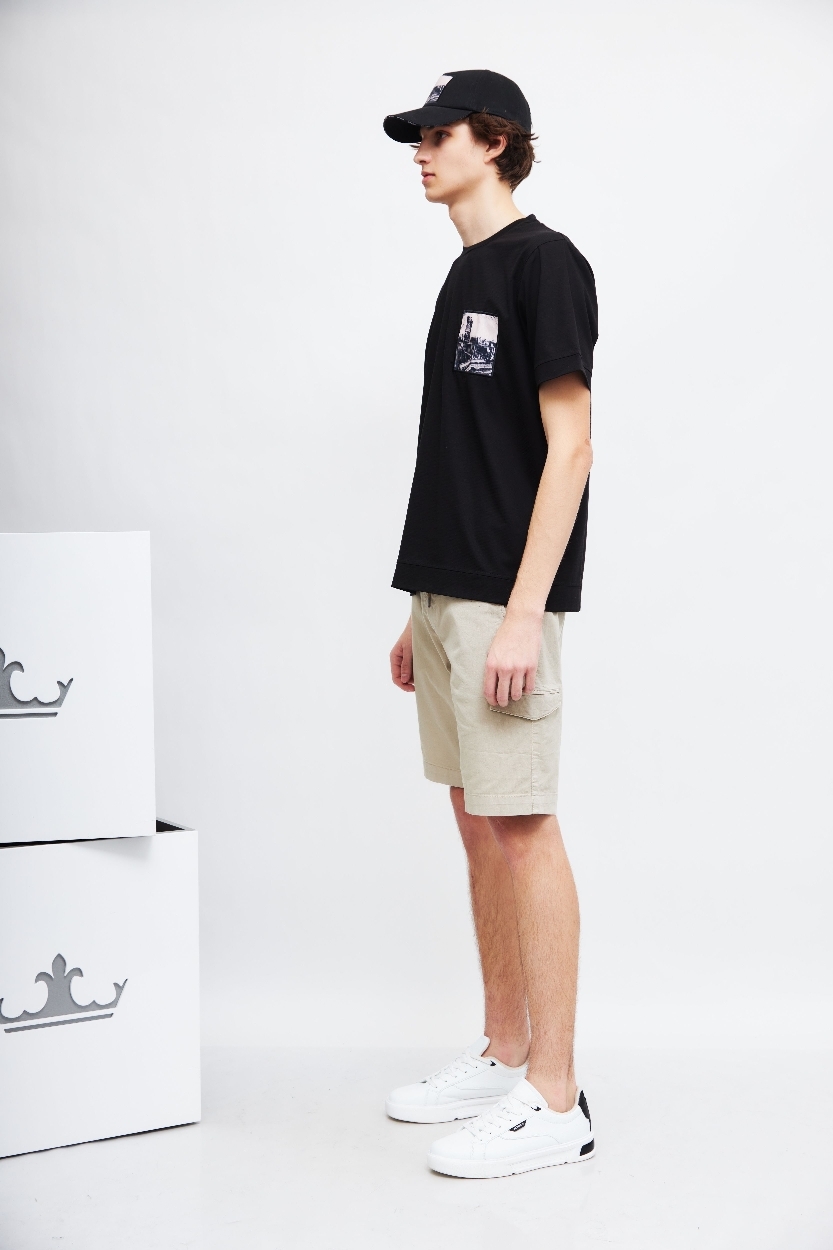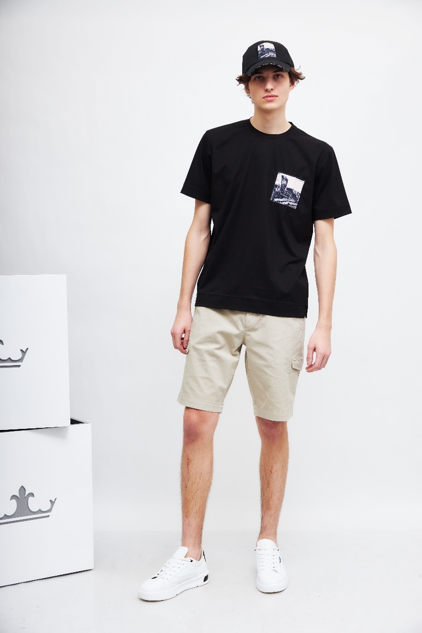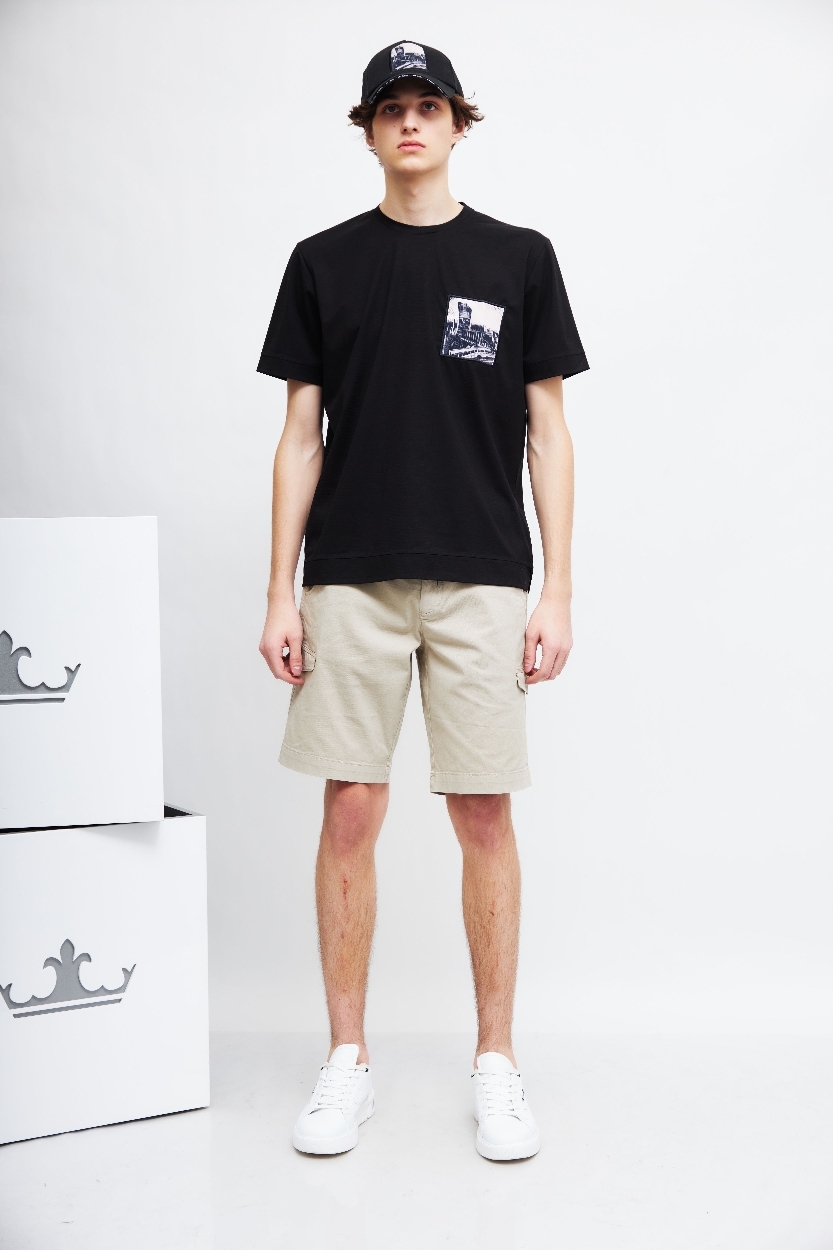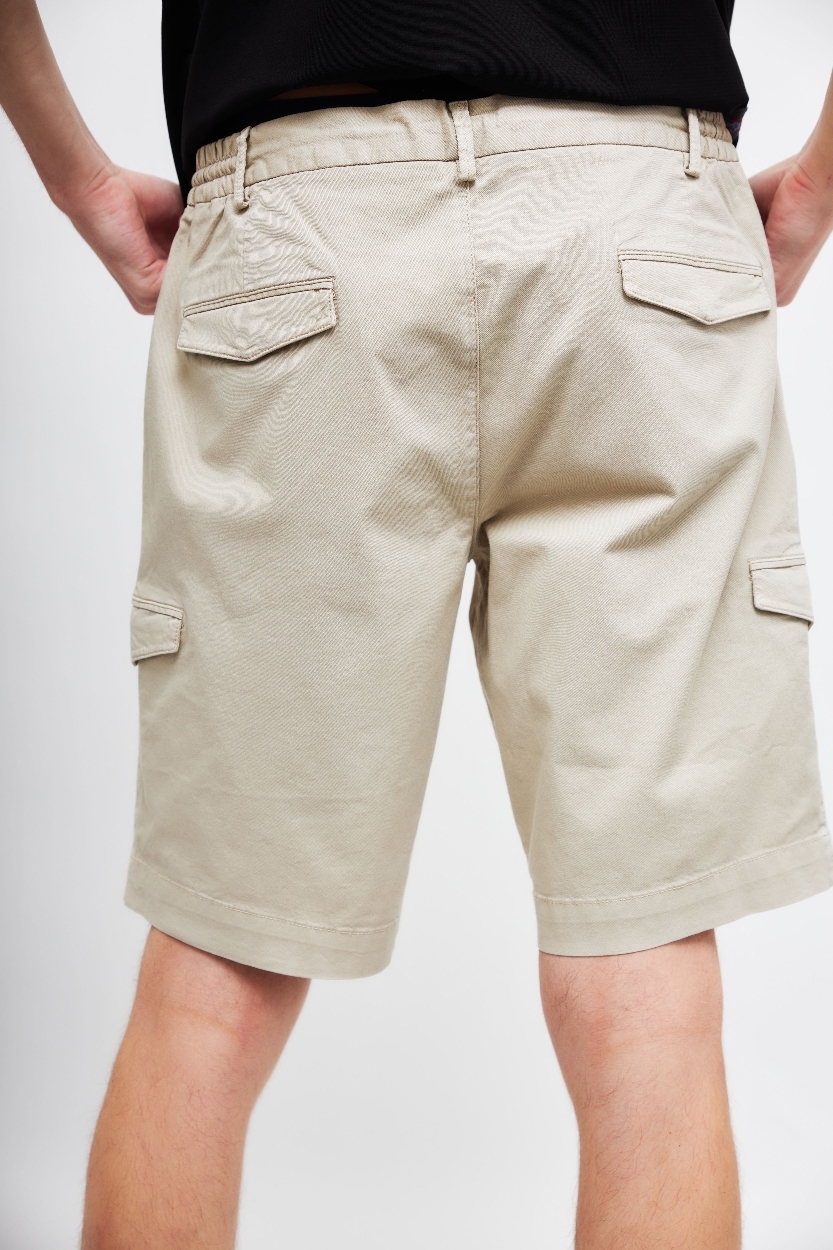 Шорты светло-бежевого цветаПояс со шлевками под ремень и на кулискеГульфик на молнии и пуговицеКосые боковые карманыСзади- карманыНа брючинах-накладные карманыДлина - выше колен