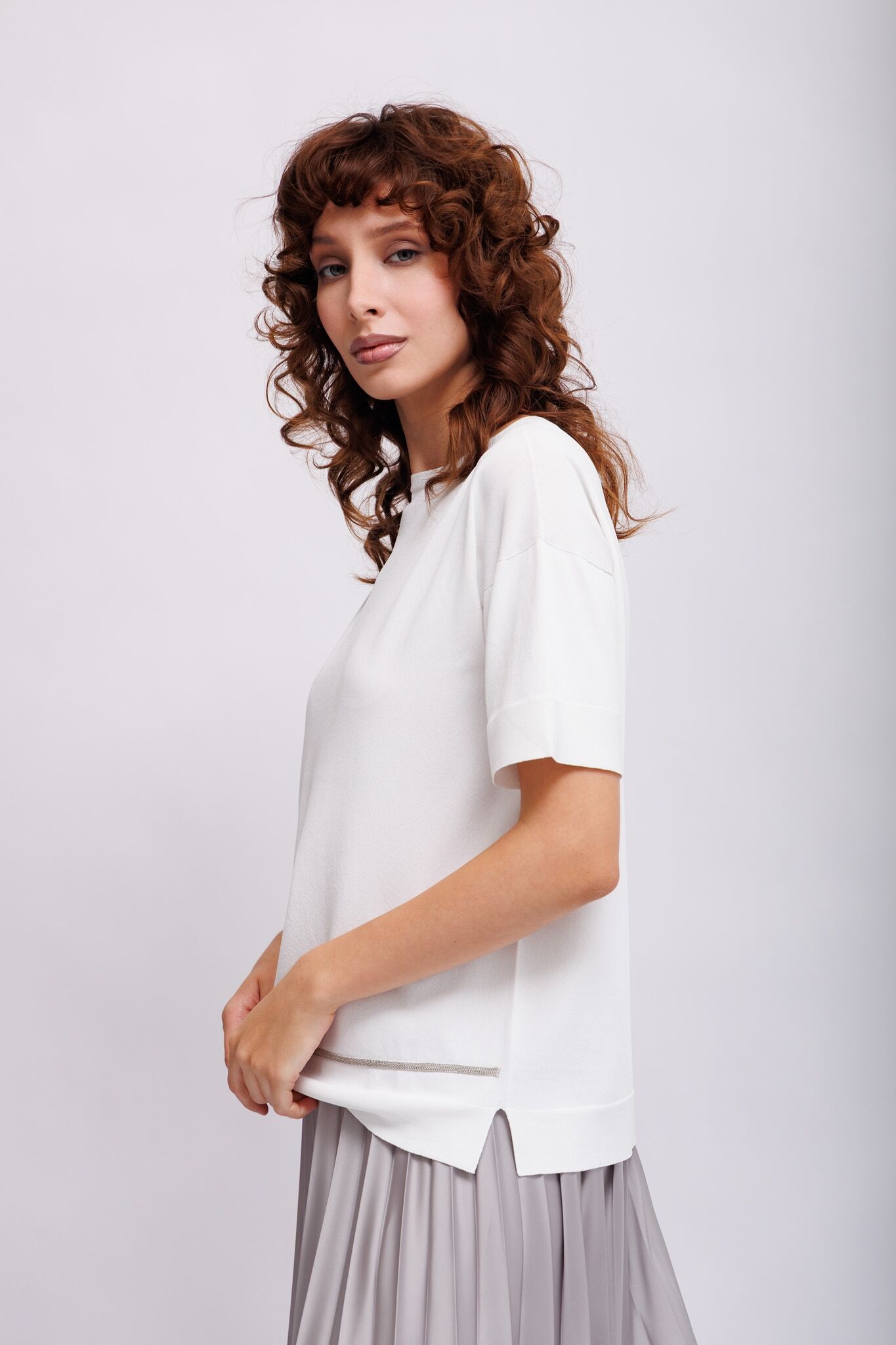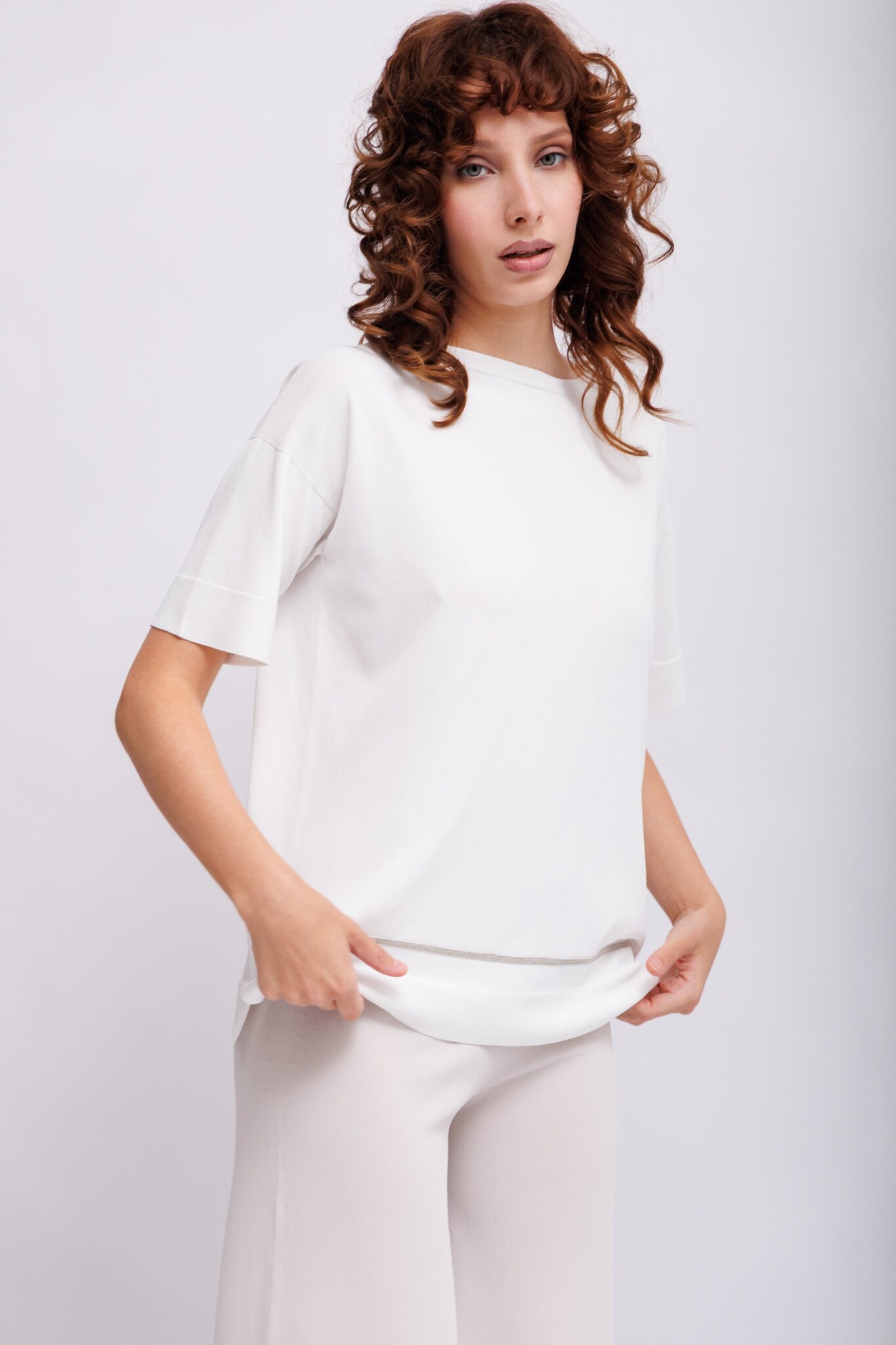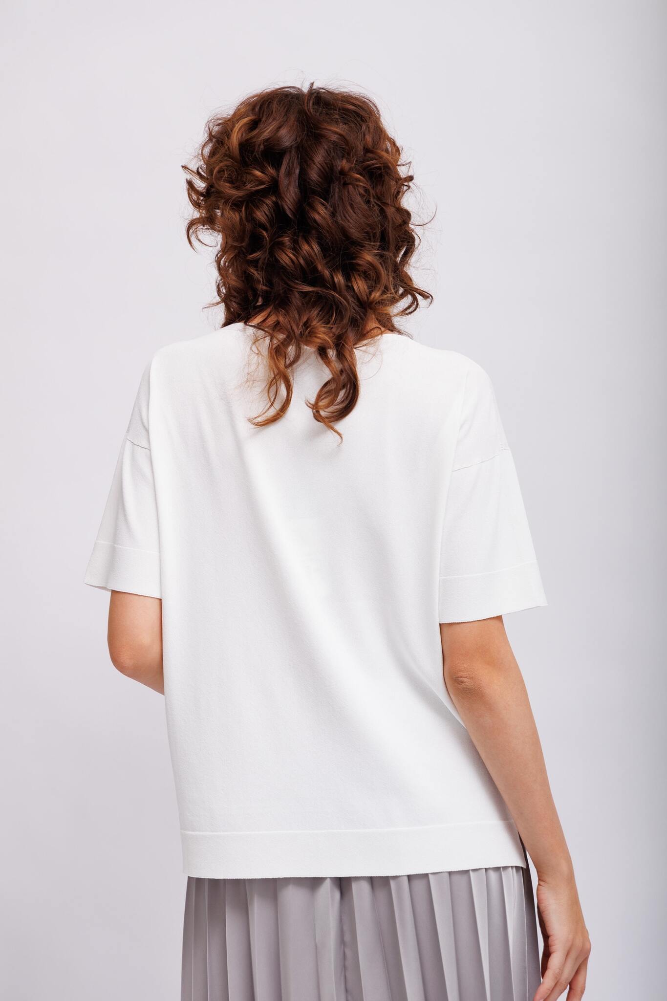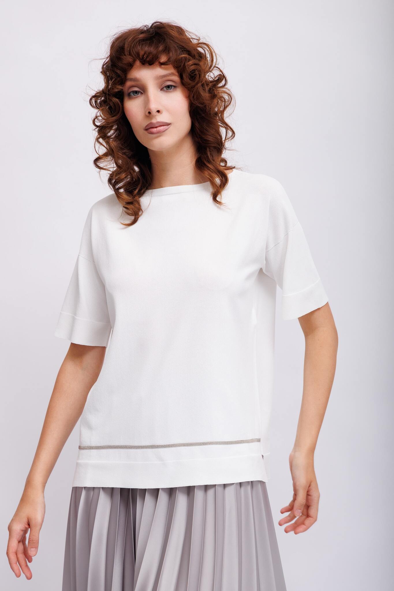 Джемпер белый тонкий с блестящей отделкой Круглый вырезКороткие рукаваСвободный слегка удлинённый крой