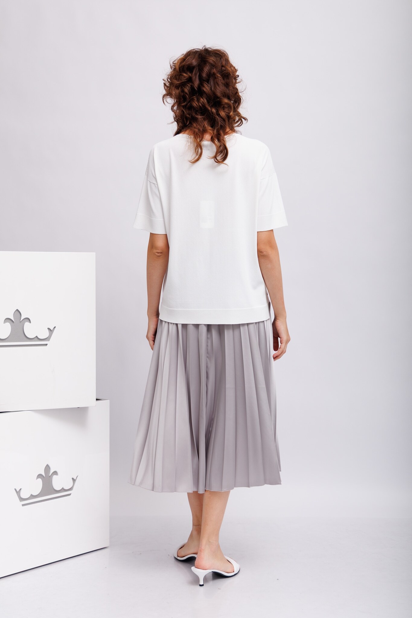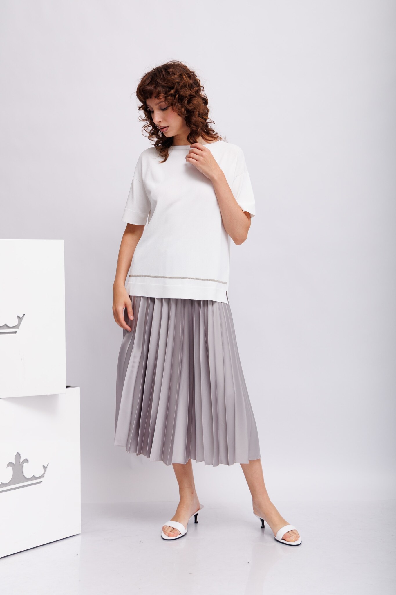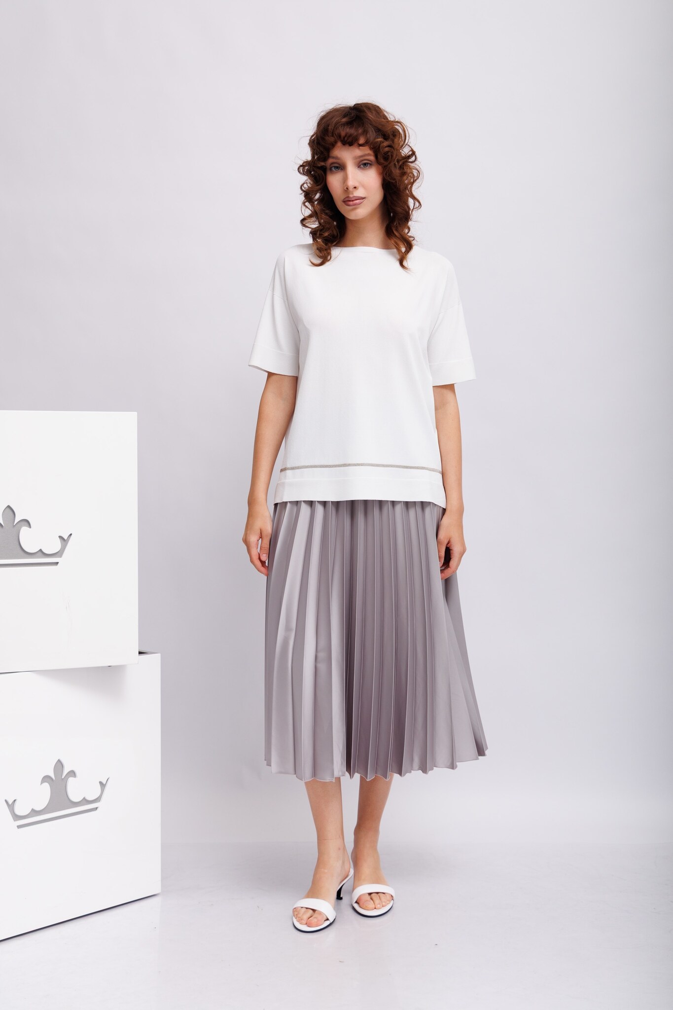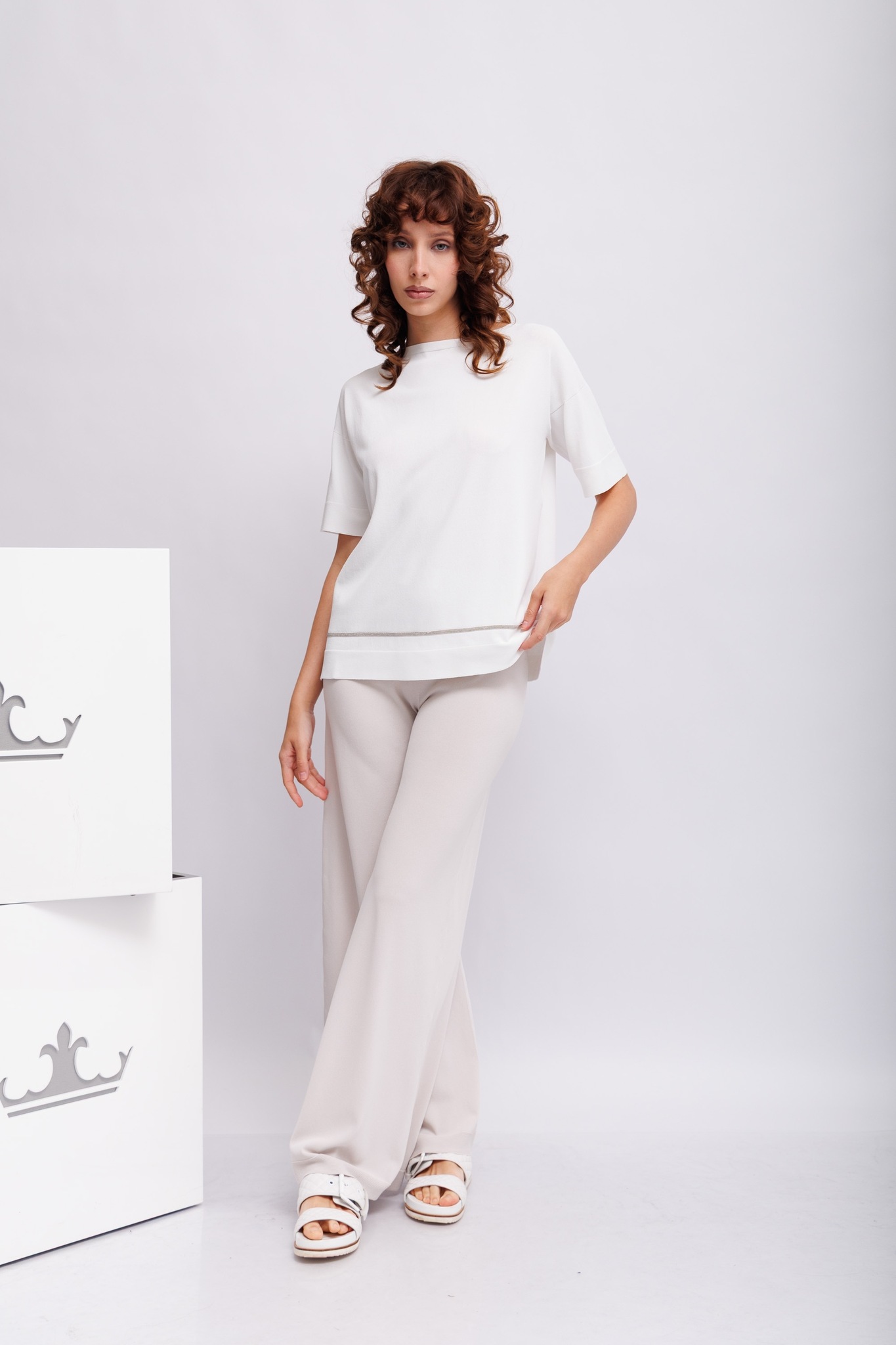 Джемпер белый тонкий с блестящей отделкой Круглый вырезКороткие рукаваСвободный слегка удлинённый крой