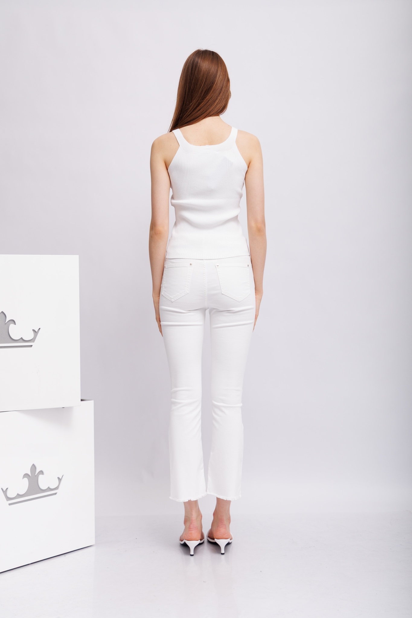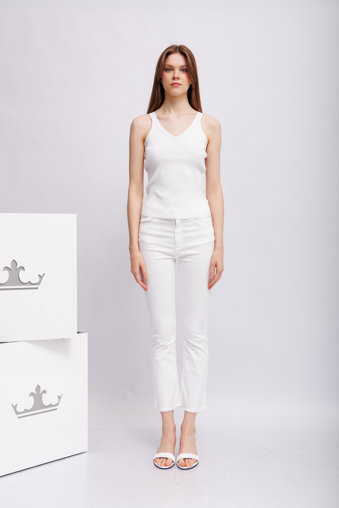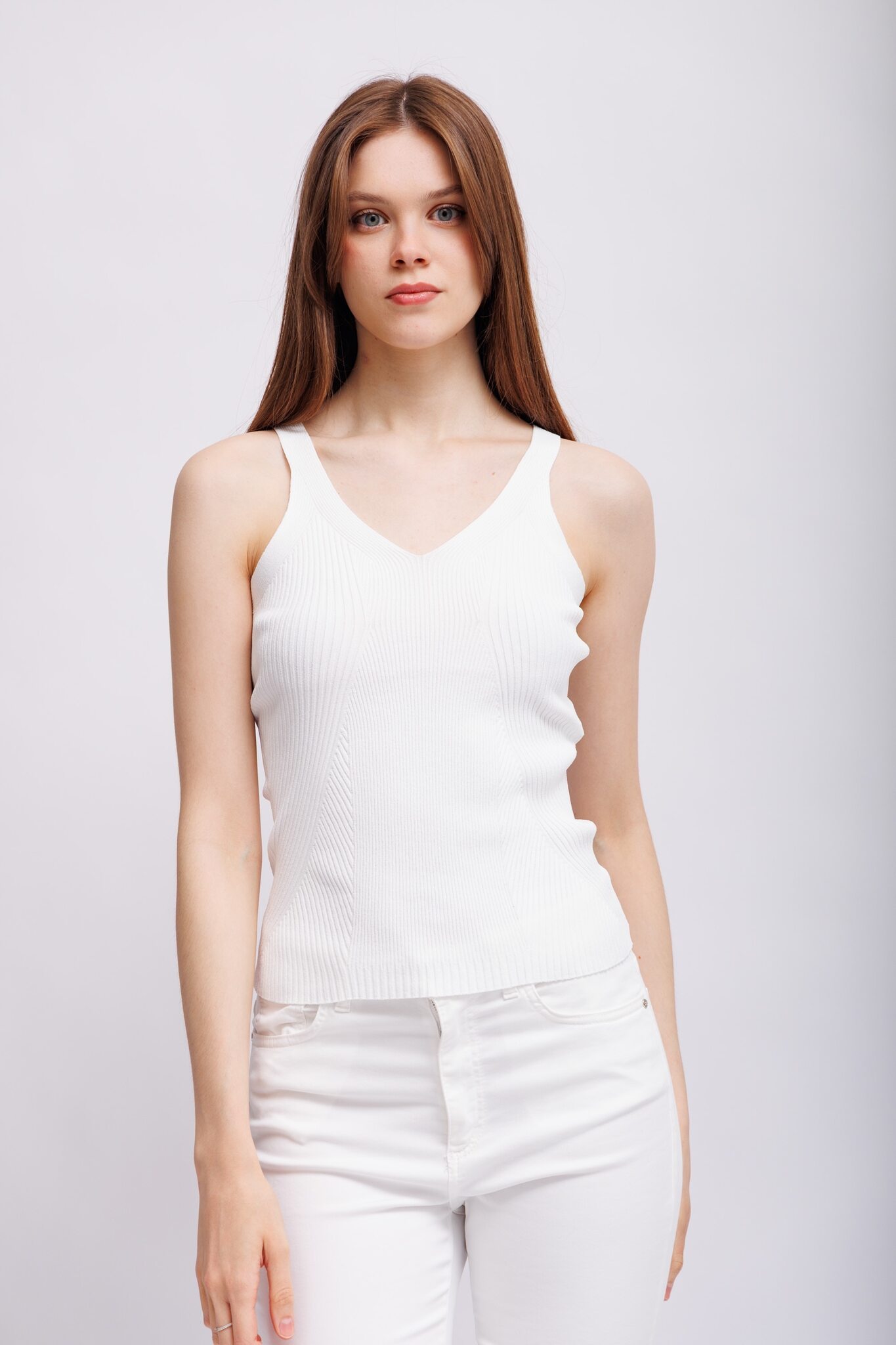 Топ-майка из ребристого трикотажабелыйV- вырезШирокие лямкиОблегающий крой