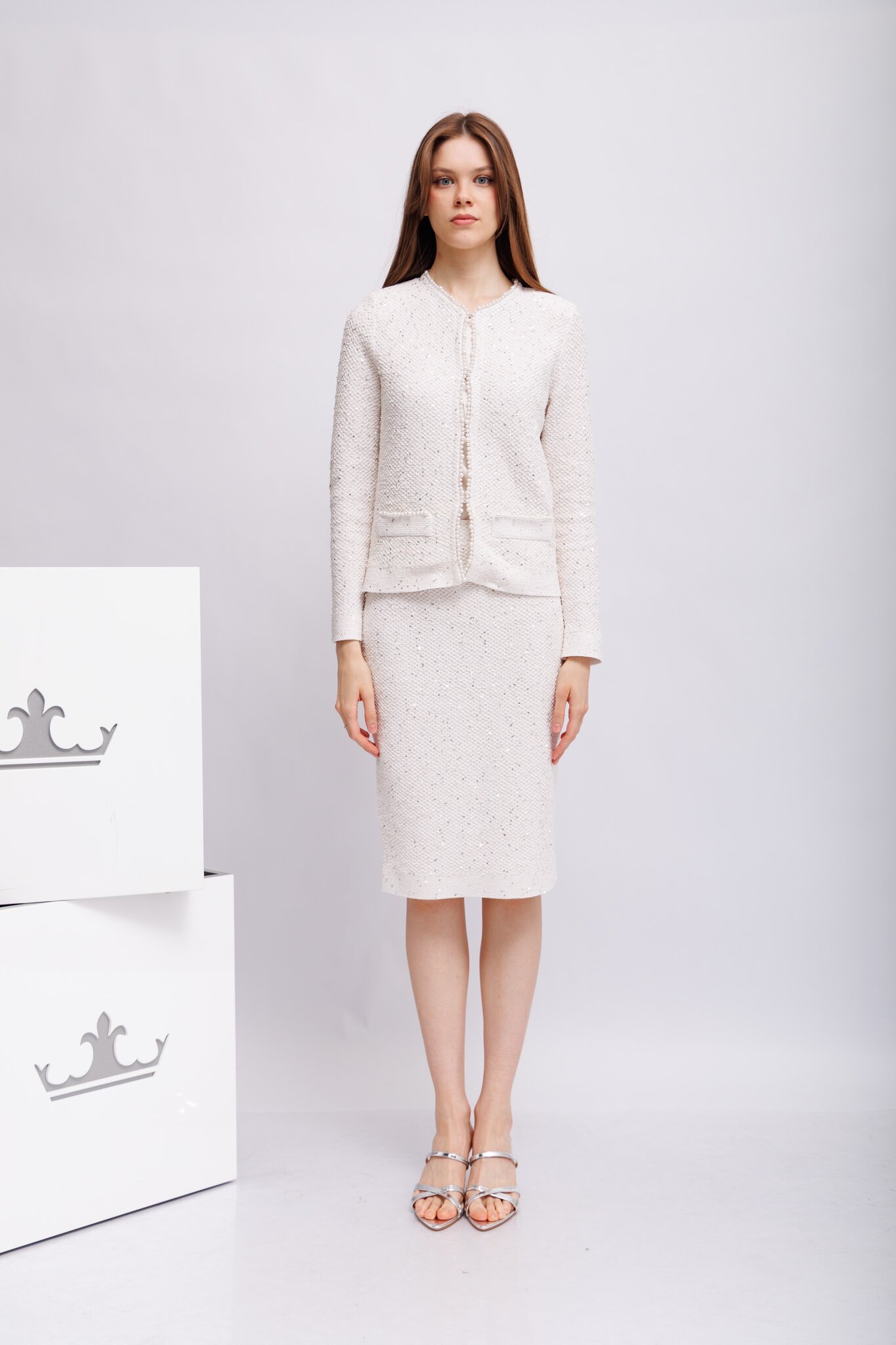 ЖакетОтделка бусинами-жемчужинамиКремовый цветДлинные рукаваСпереди - карманы-листочкиПолуприлегающий силуэтЗастёжки на скрытых крючках