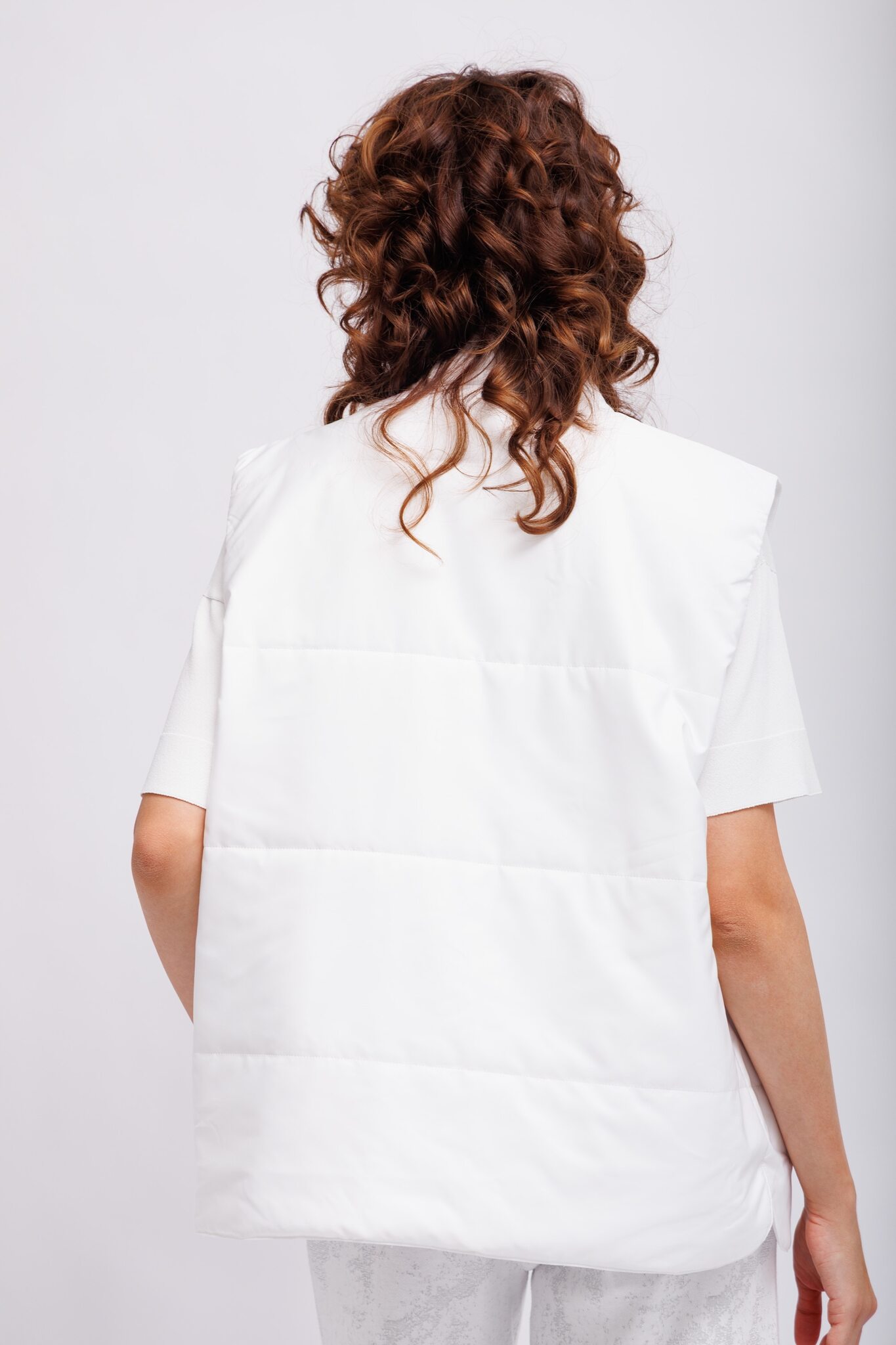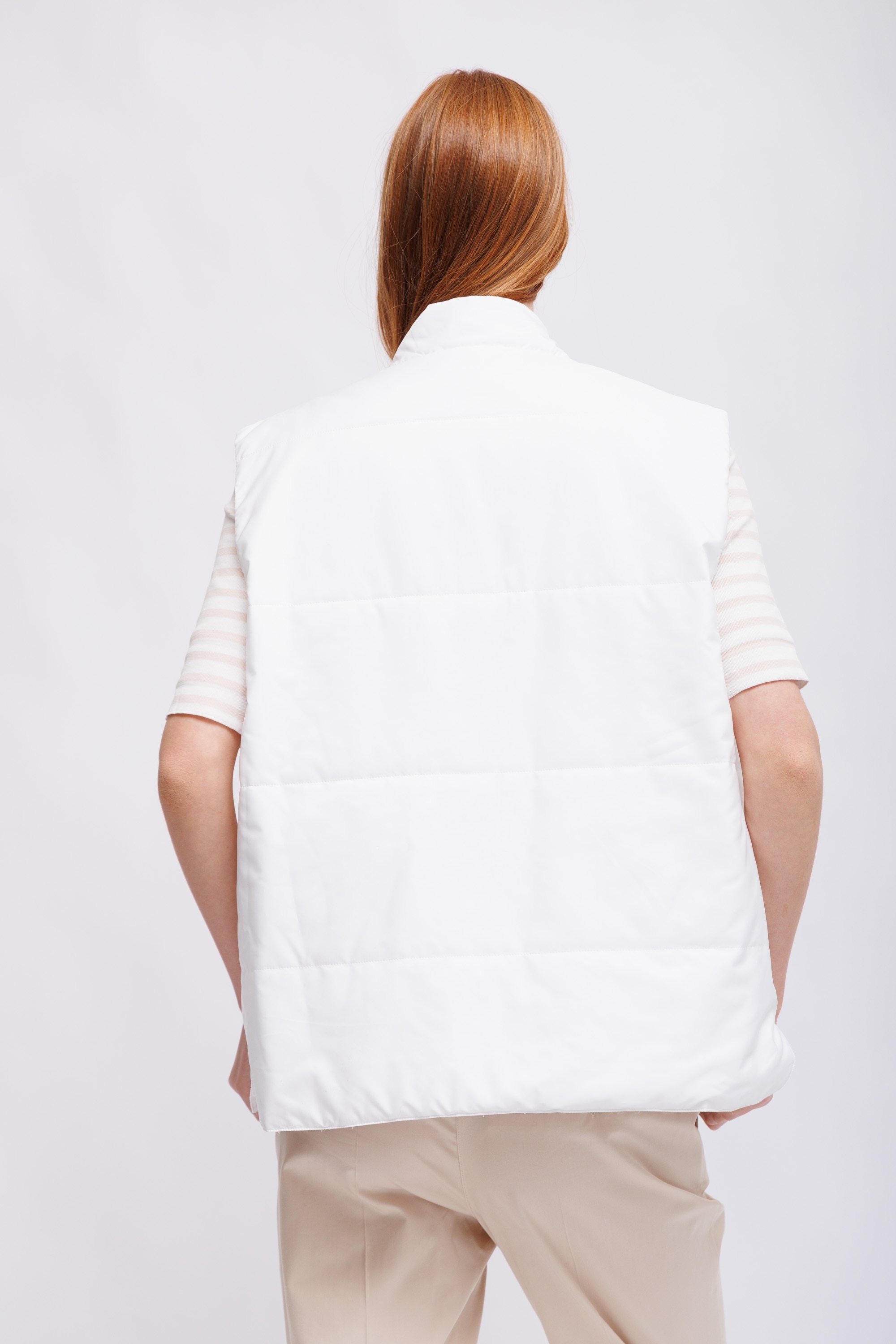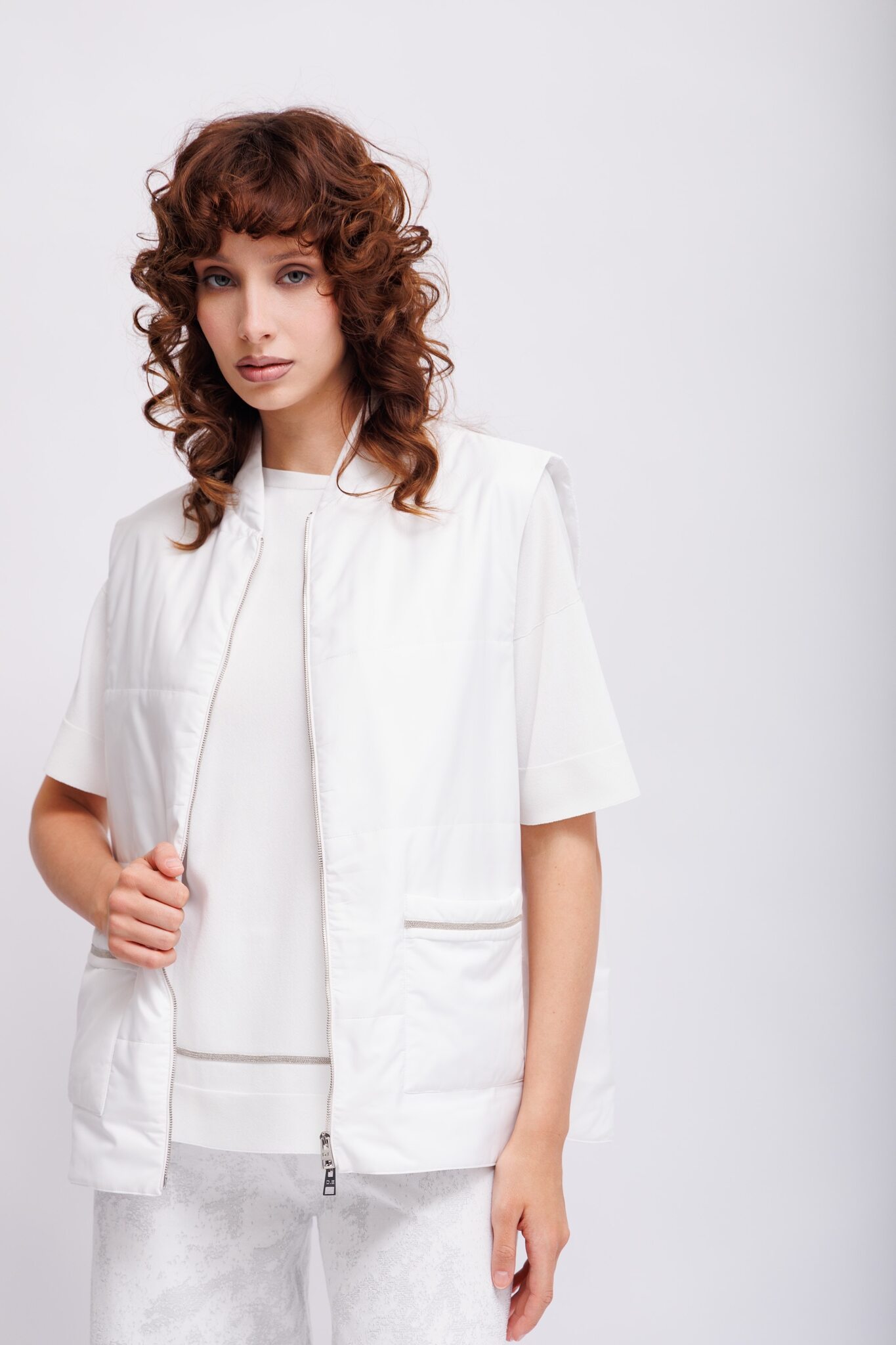 Жилет лёгкий утепленный стеганыйБелый цветВорот-стойкаИзделие на молнииКарманы накладные с декоративными деталямиКрой прямой