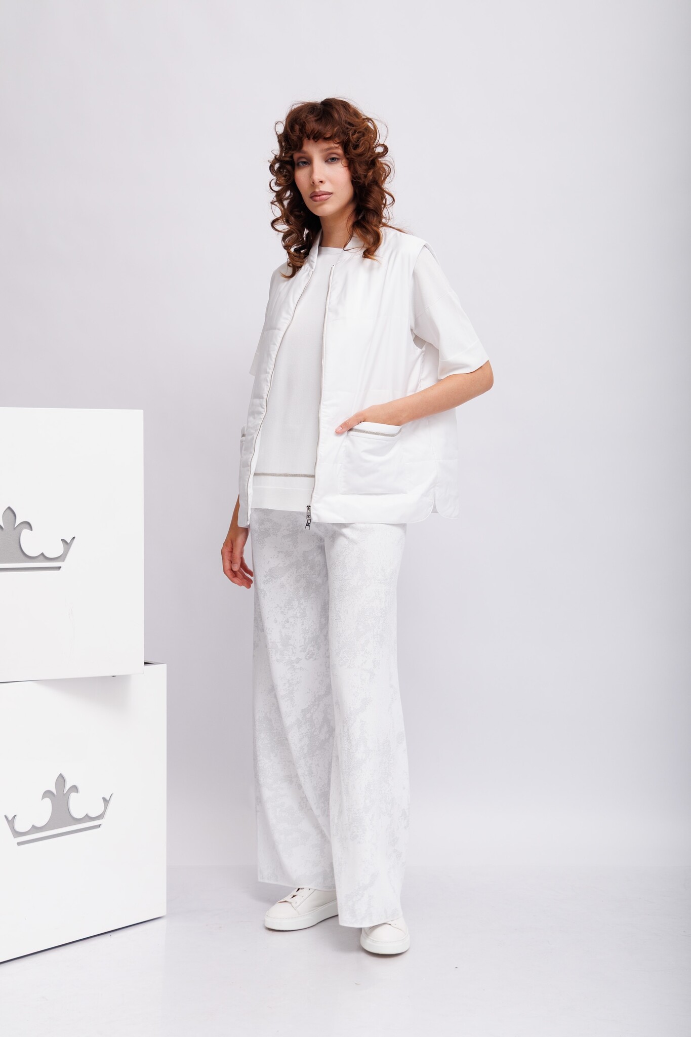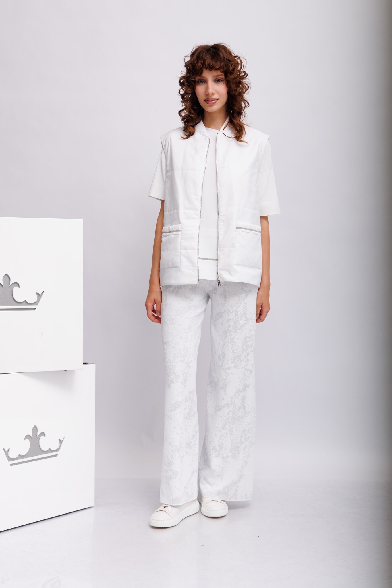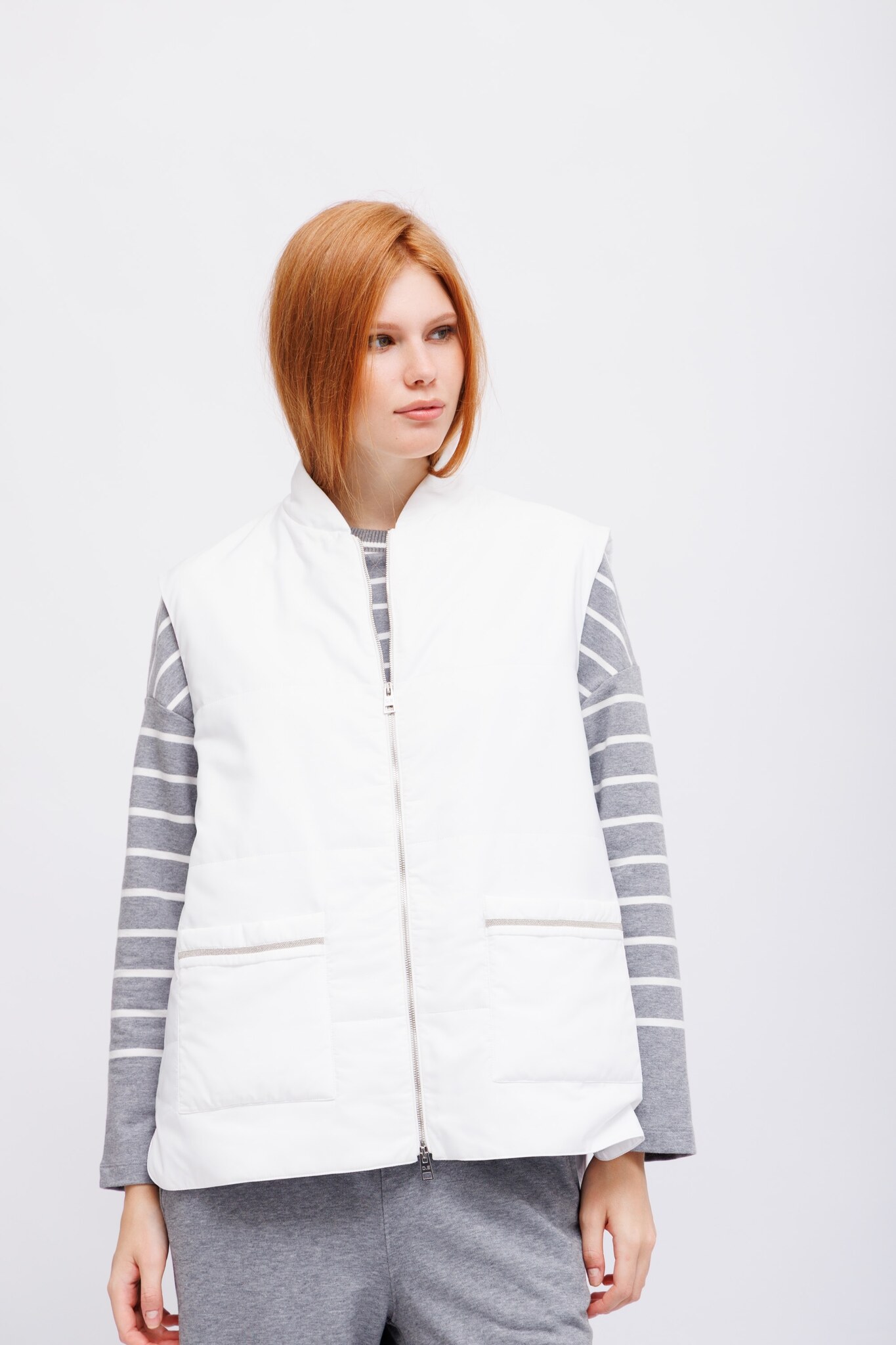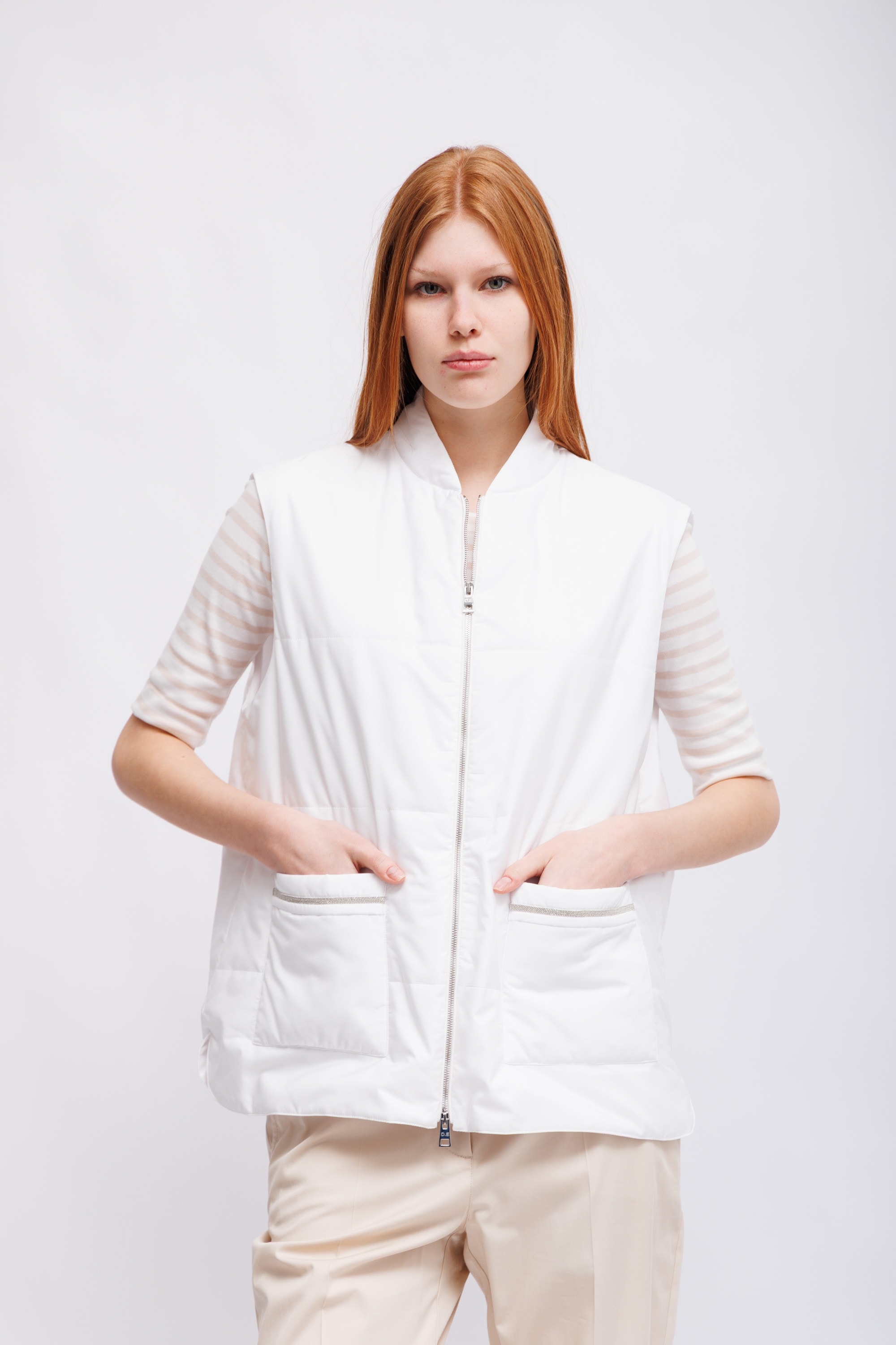 Жилет лёгкий утепленный стеганыйБелый цветВорот-стойкаИзделие на молнииКарманы накладные с декоративными деталямиКрой прямой