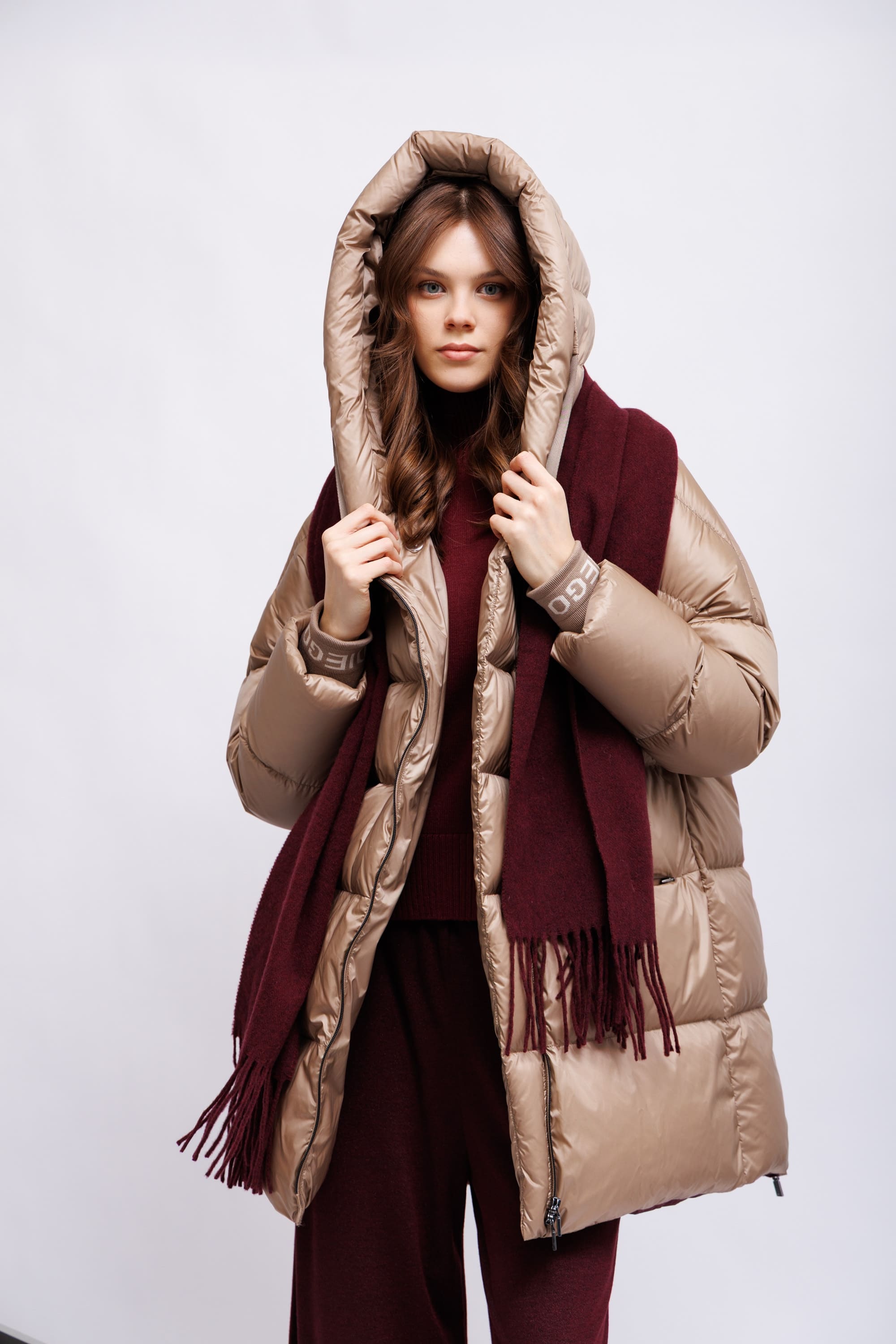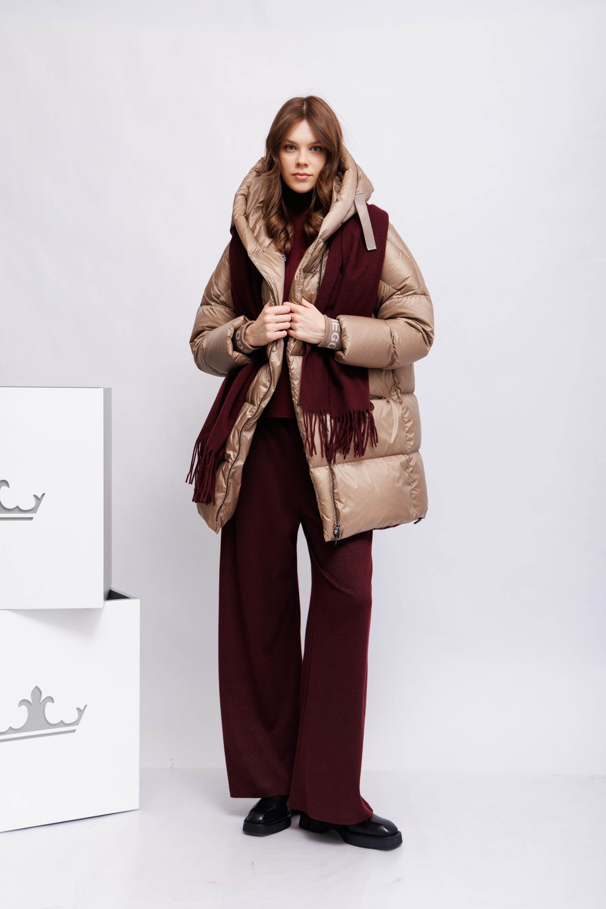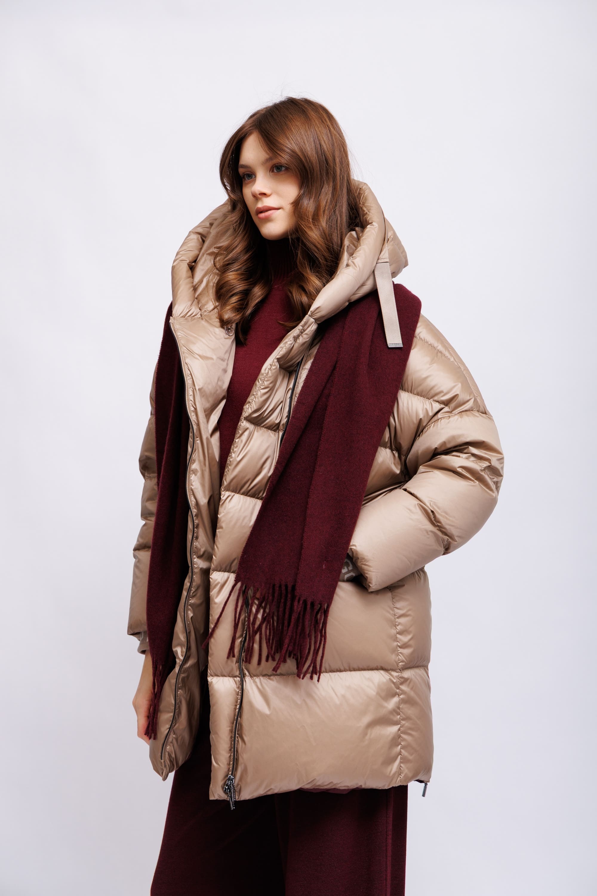 Капюшон на регулируемых стяжках и пуговице расстегивается вдоль,чтобы эффектно лежать на плечах