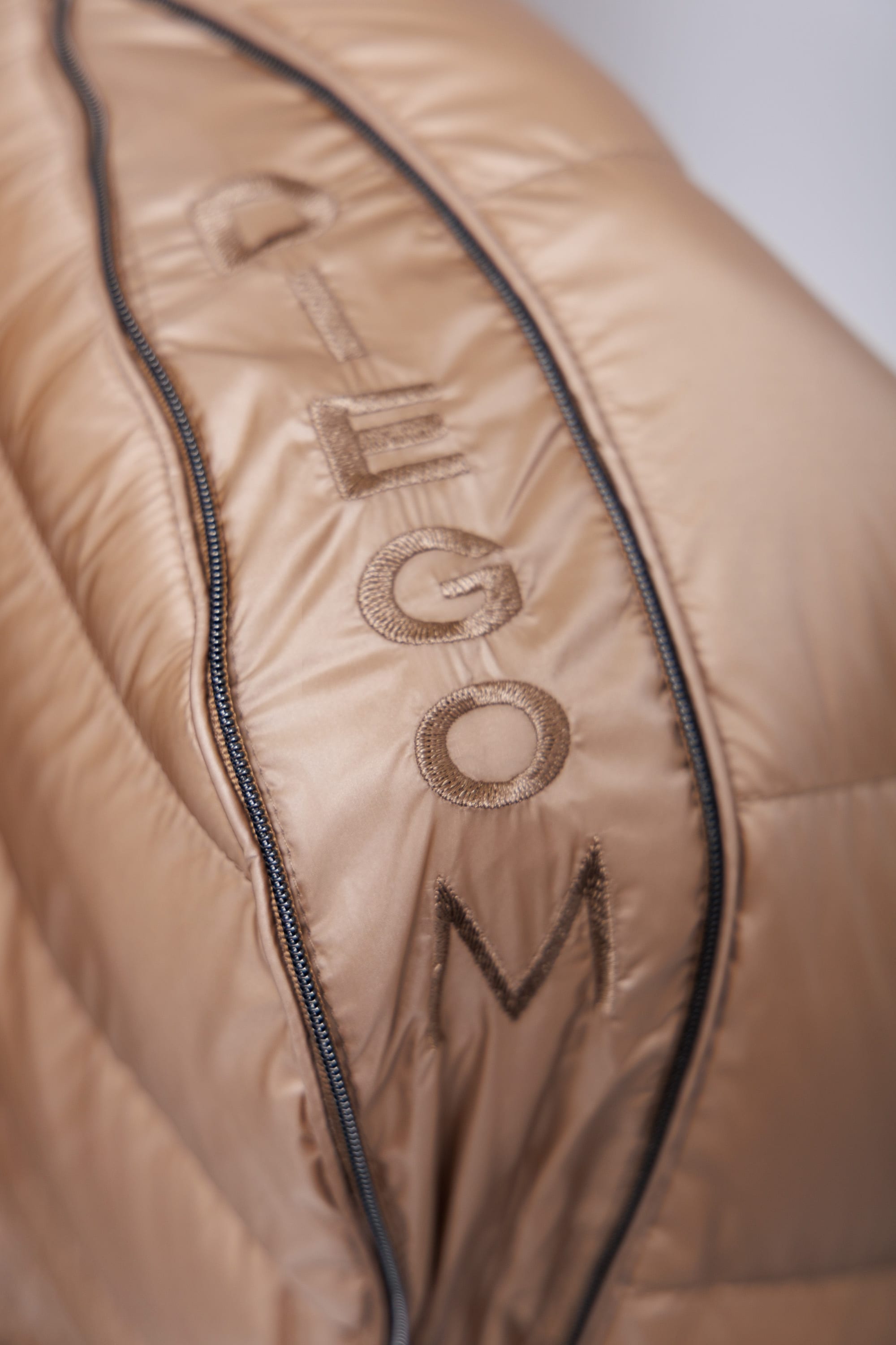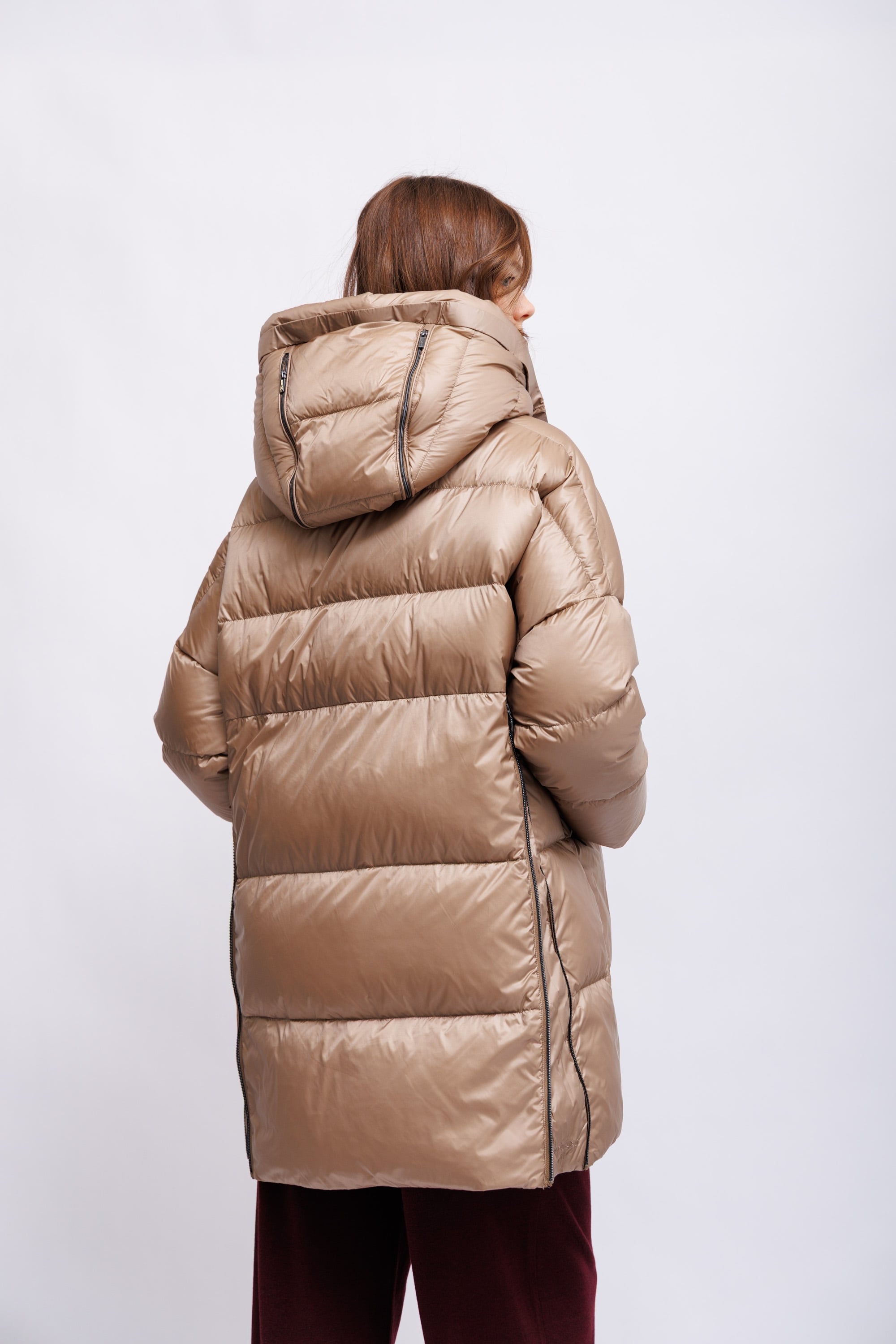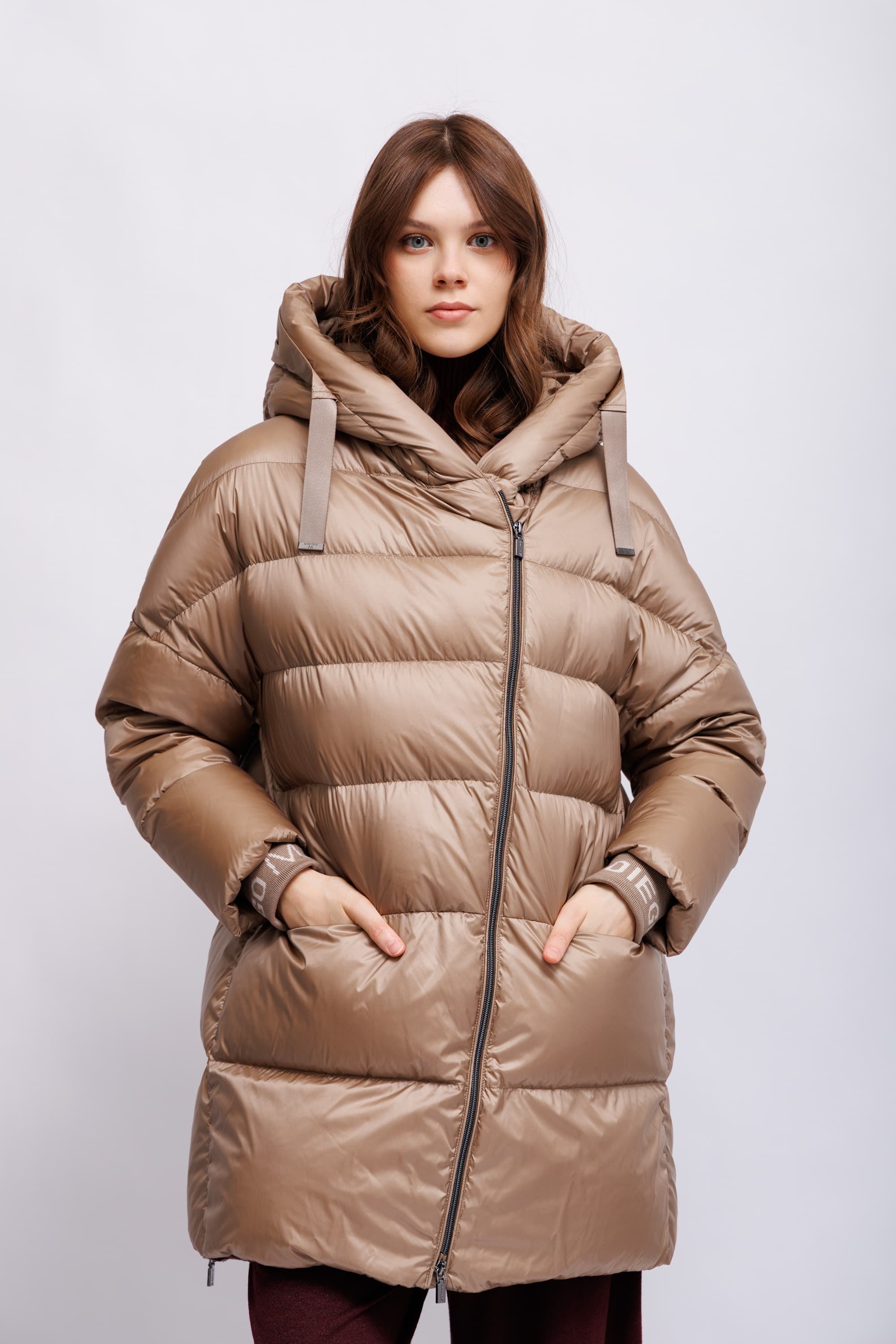 Капюшон на регулируемых стяжках и пуговице расстегивается вдоль,чтобы эффектно лежать на плечах