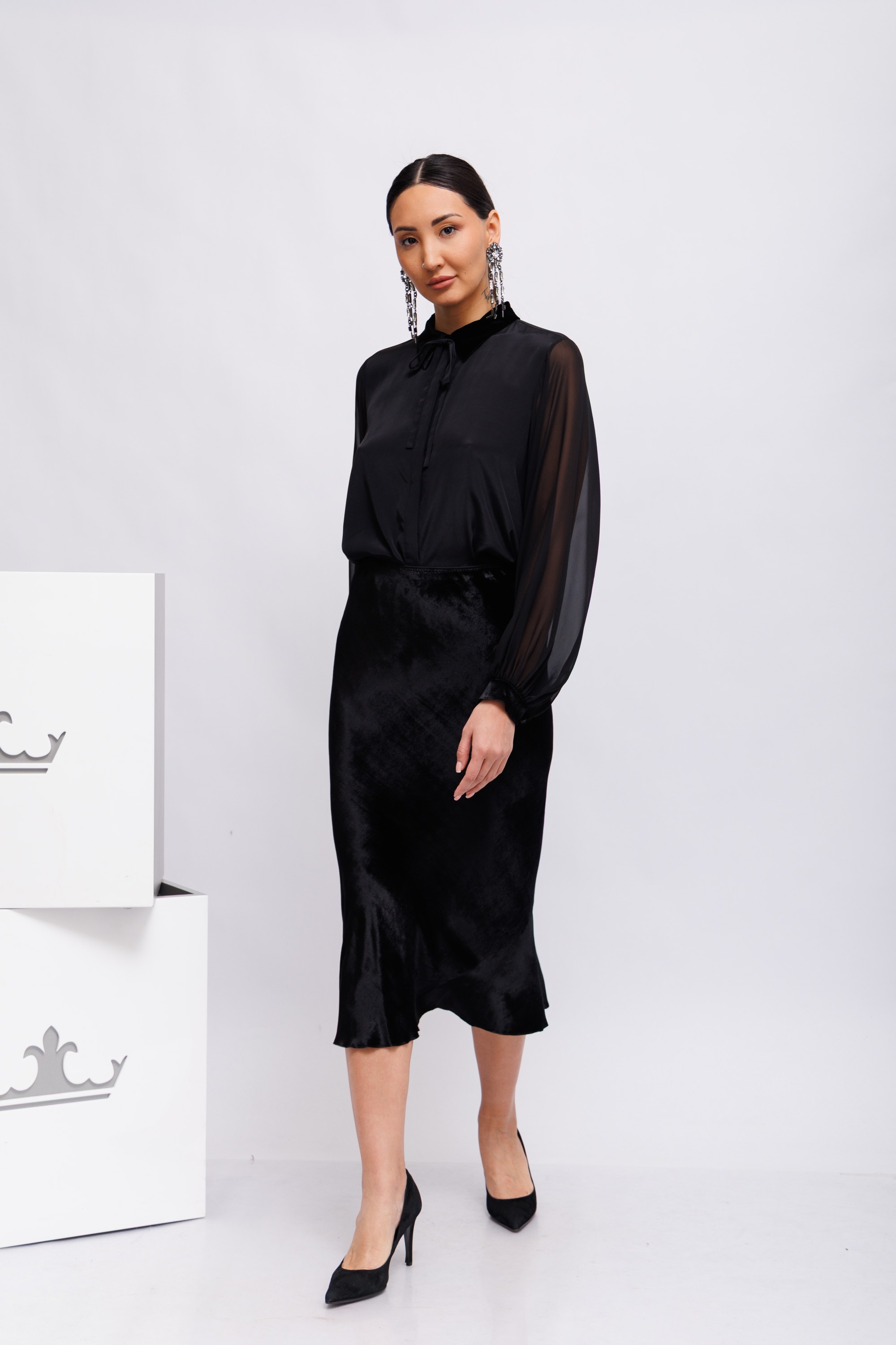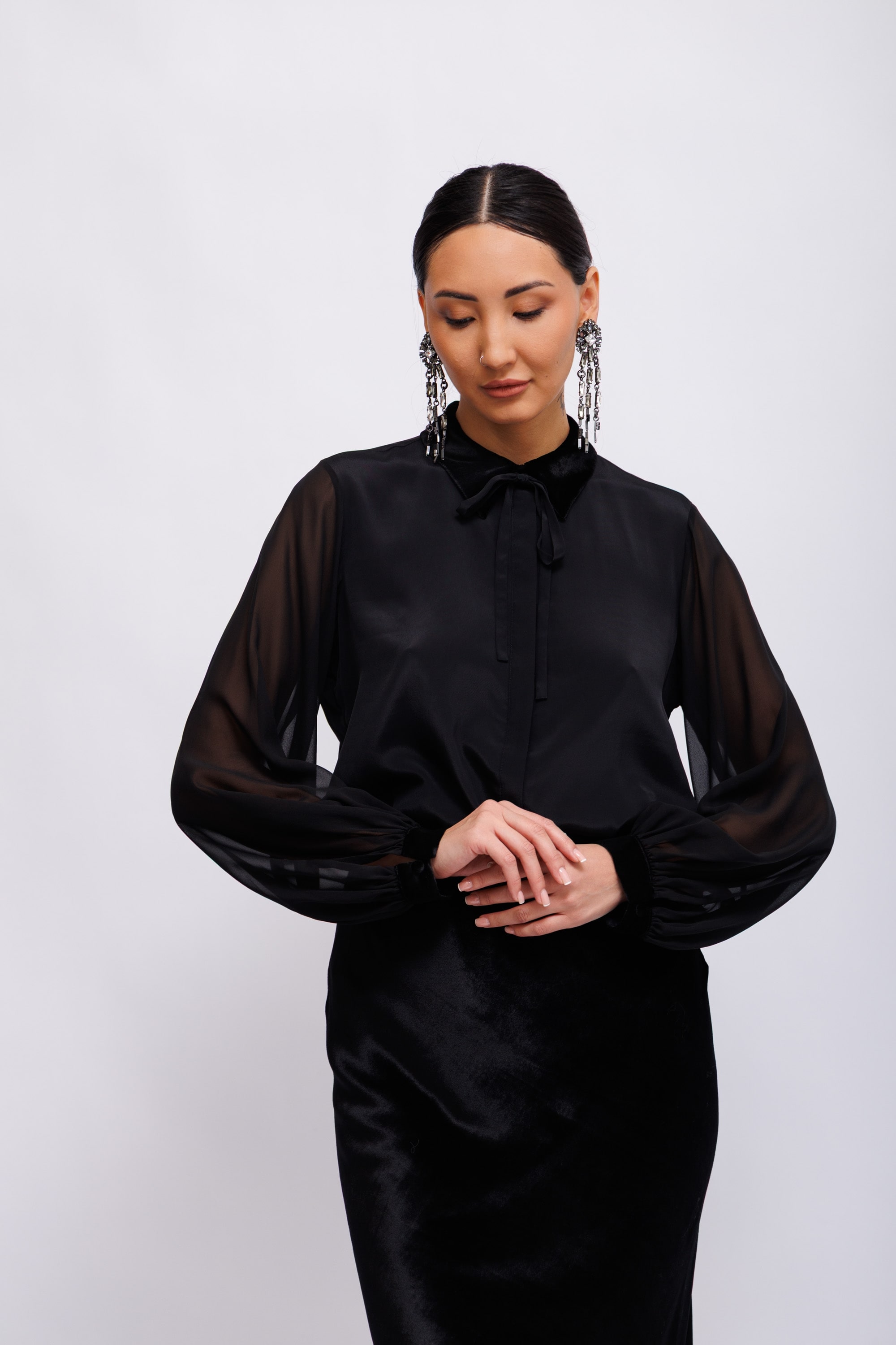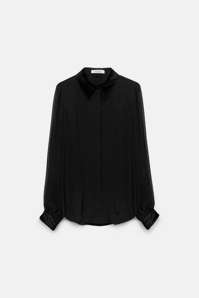 Блузка выполнена из ткани в тон, с эффектом прозрачности, и имеет блестящий бархатный воротник. Блузку можно носить в комплекте с подходящей юбкой, скроенной по косой.