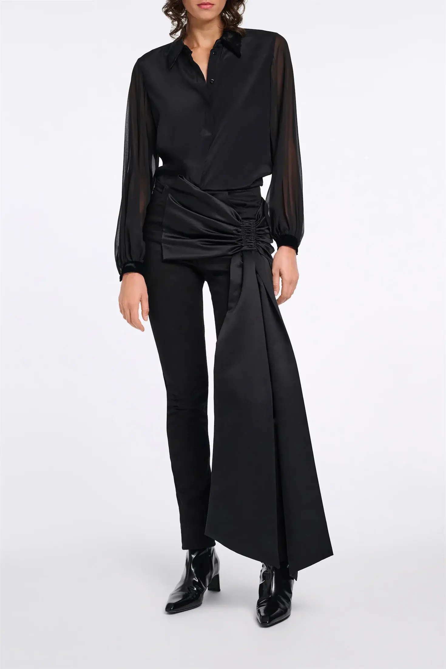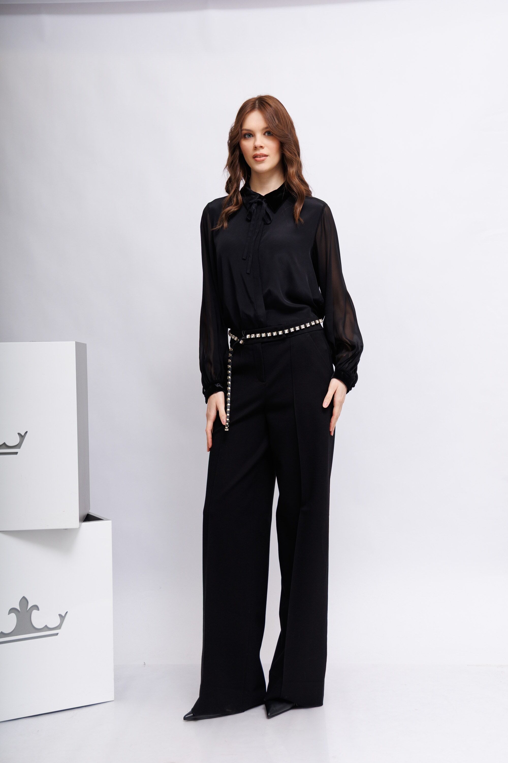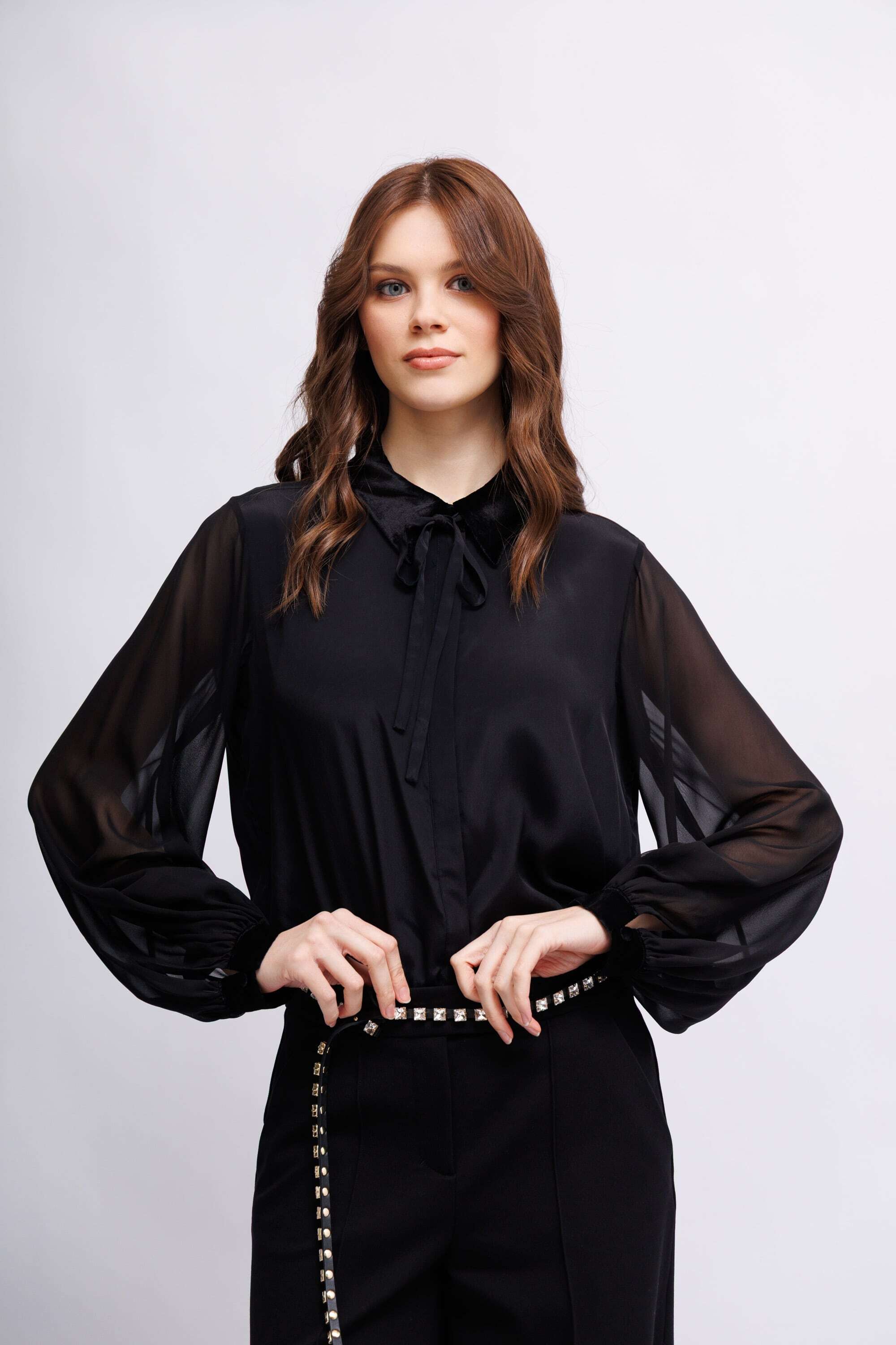 Блузка выполнена из ткани в тон, с эффектом прозрачности, и имеет блестящий бархатный воротник. Блузку можно носить в комплекте с подходящей юбкой, скроенной по косой.