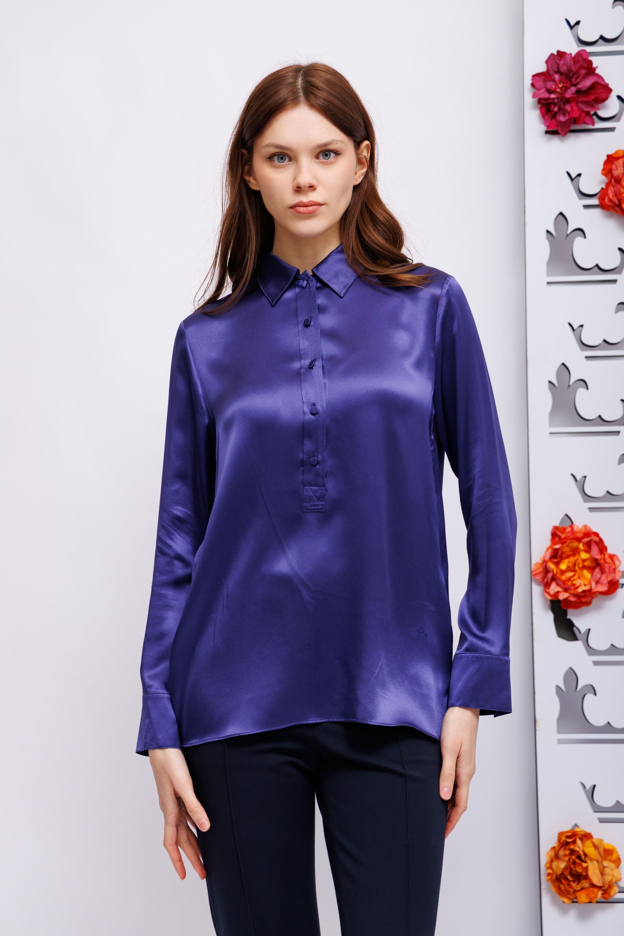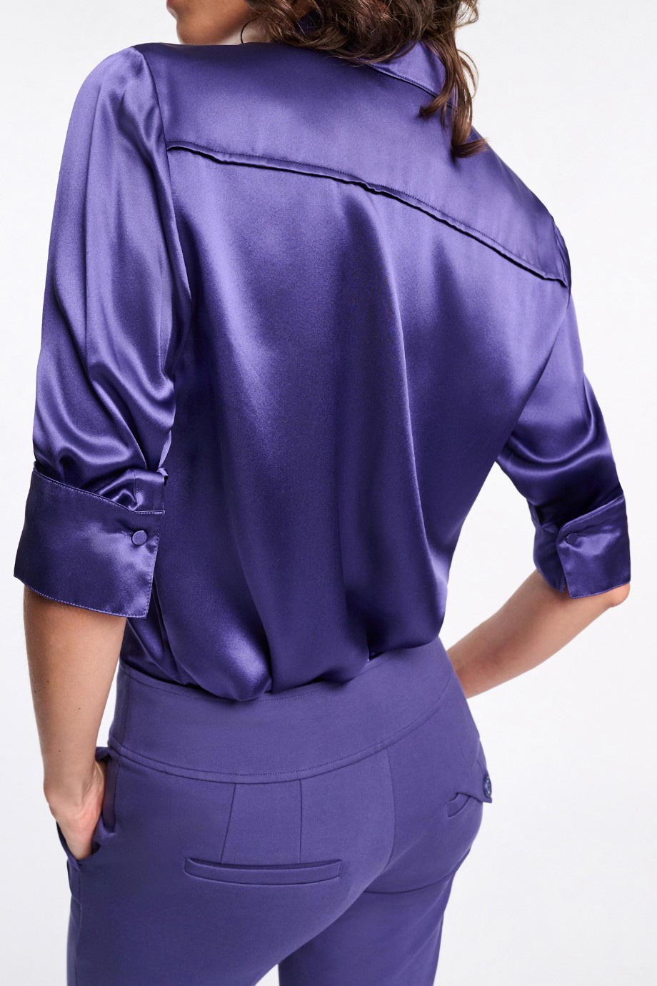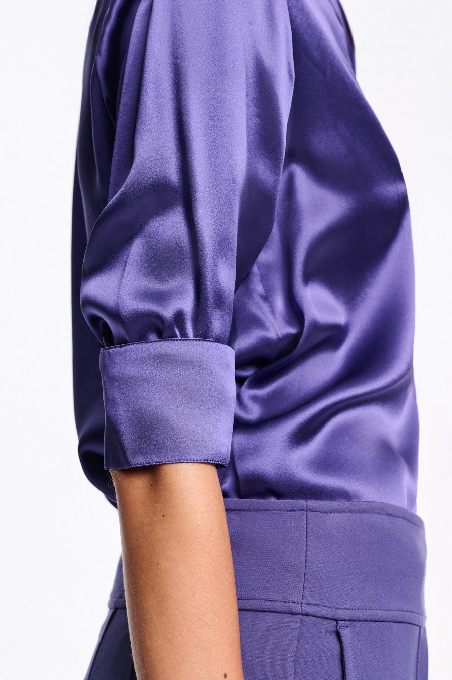 Блуза темно-сиреневаяБлузка выполнена из шелкового атласа и имеет свободный крой.