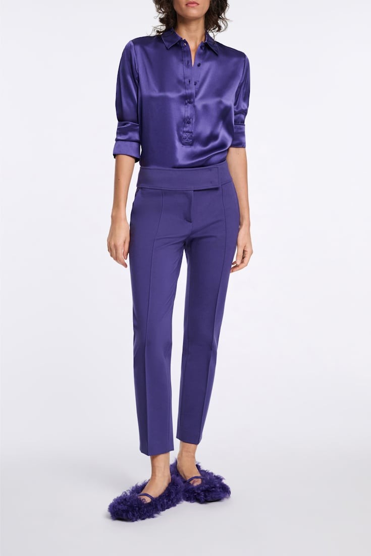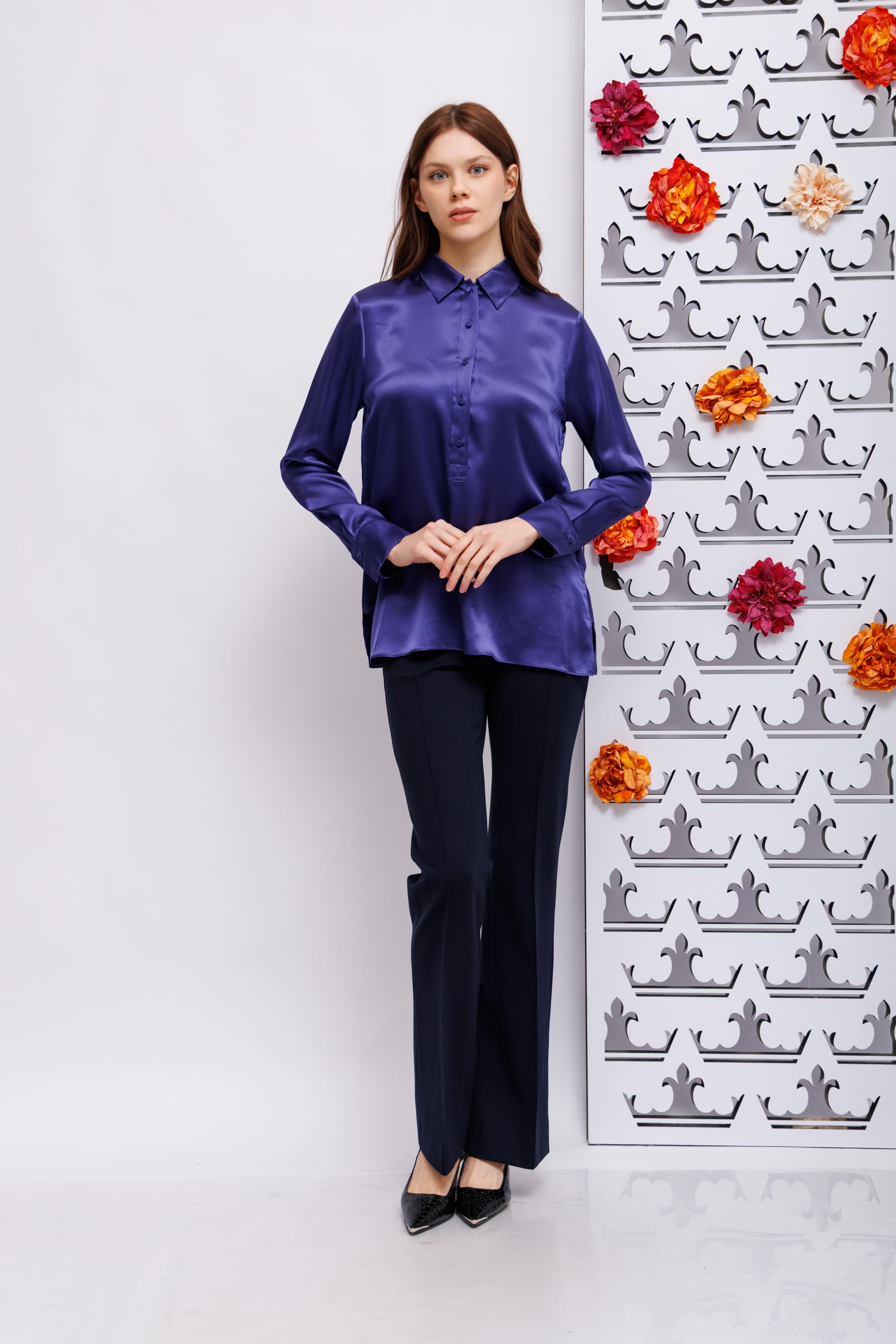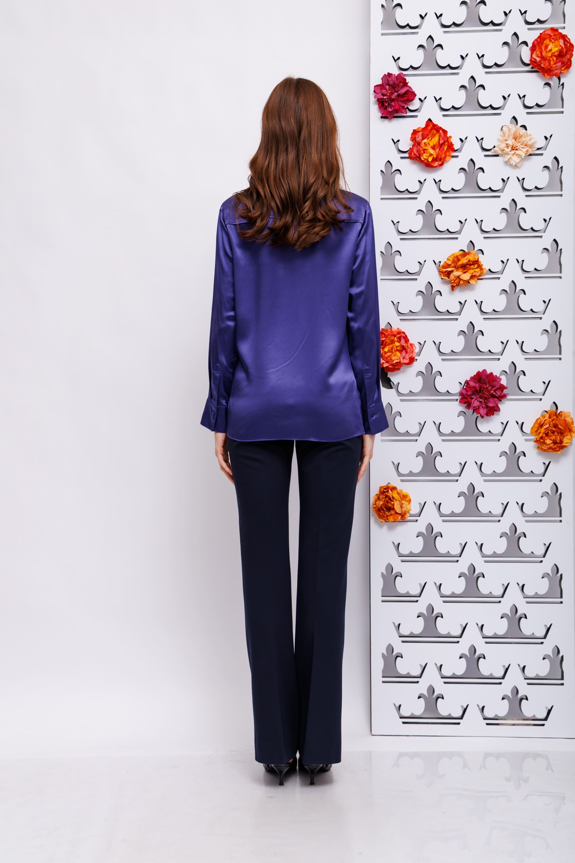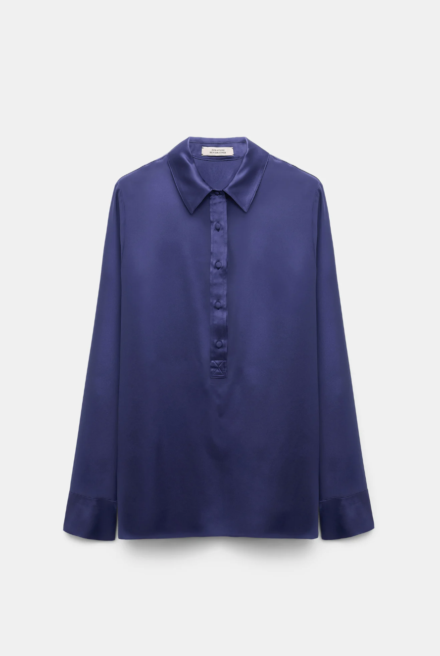 Блуза темно-сиреневаяБлузка выполнена из шелкового атласа и имеет свободный крой.