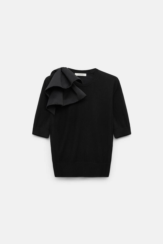 Пуловер с коротким рукавом связан из мягкой натуральной мериносовой шерсти и украшен съемным атласным бантом большого размера на одном плече.