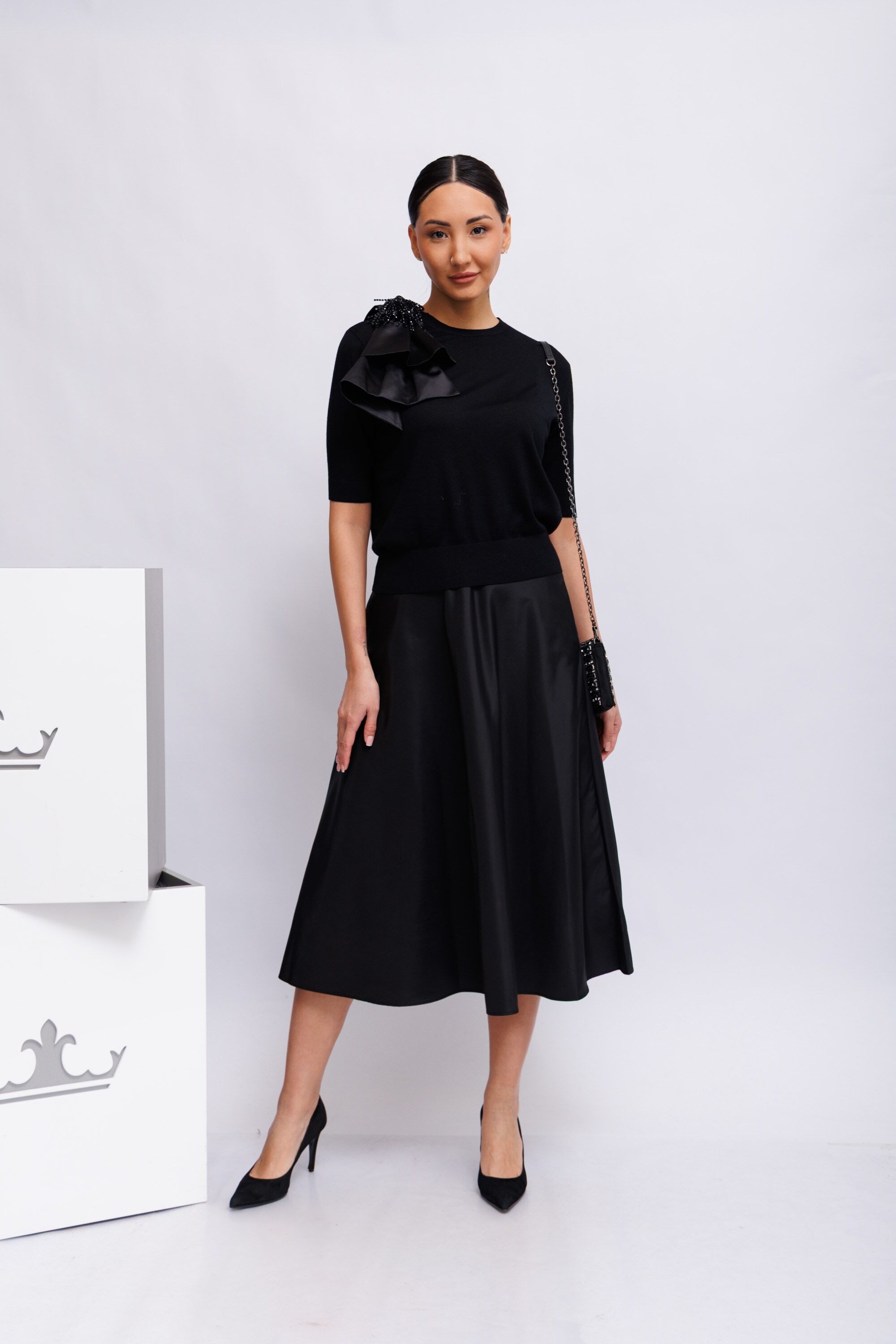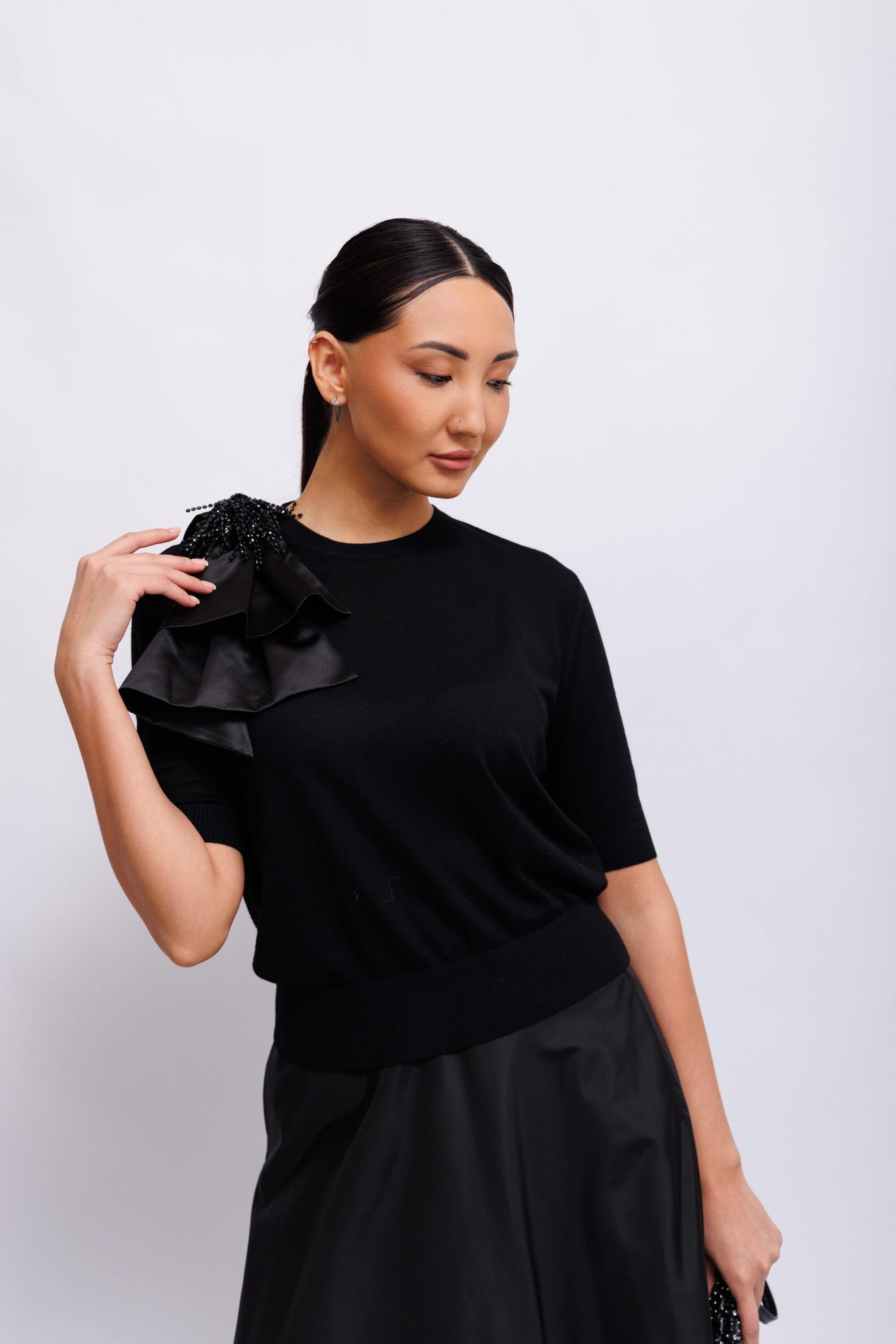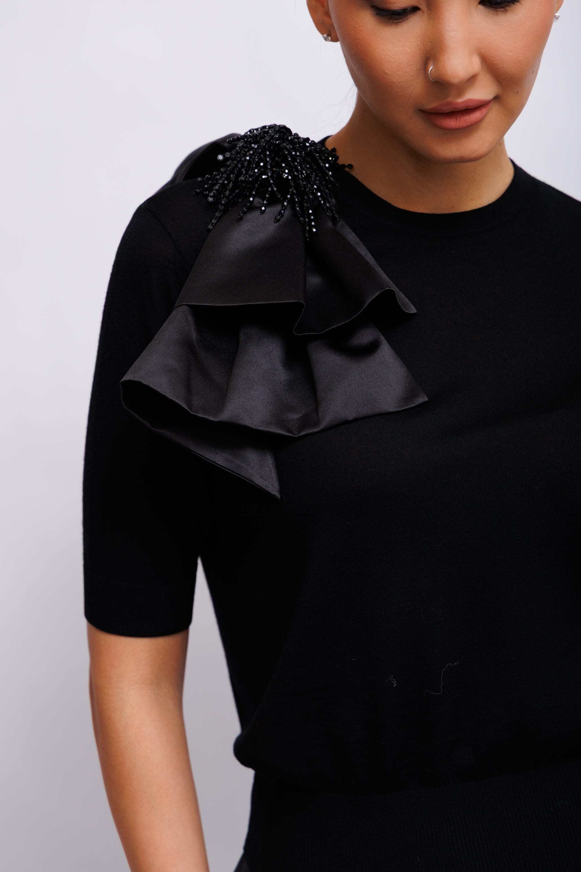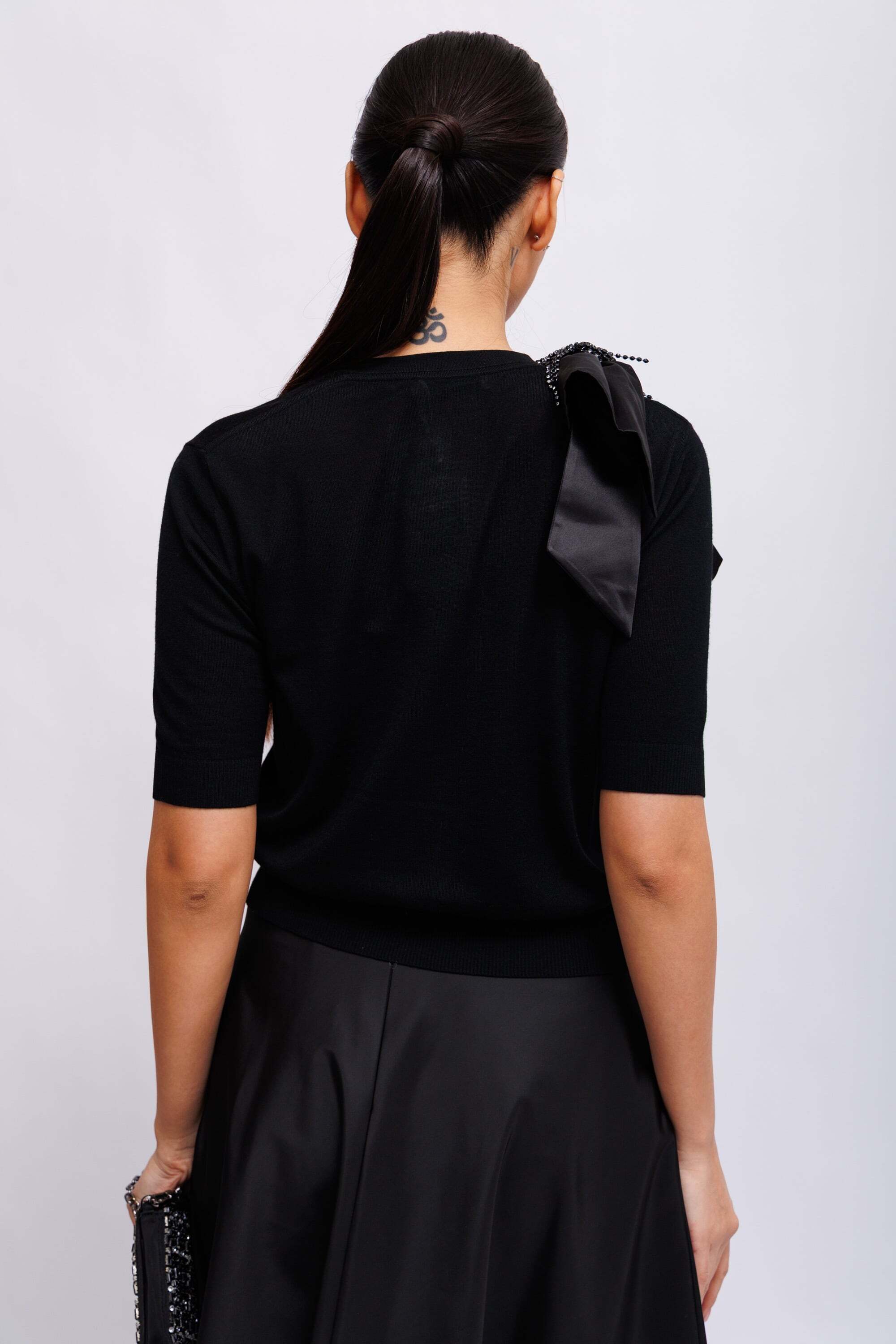 Пуловер черный из натуральной мериносовой шерсти с атласным бантом