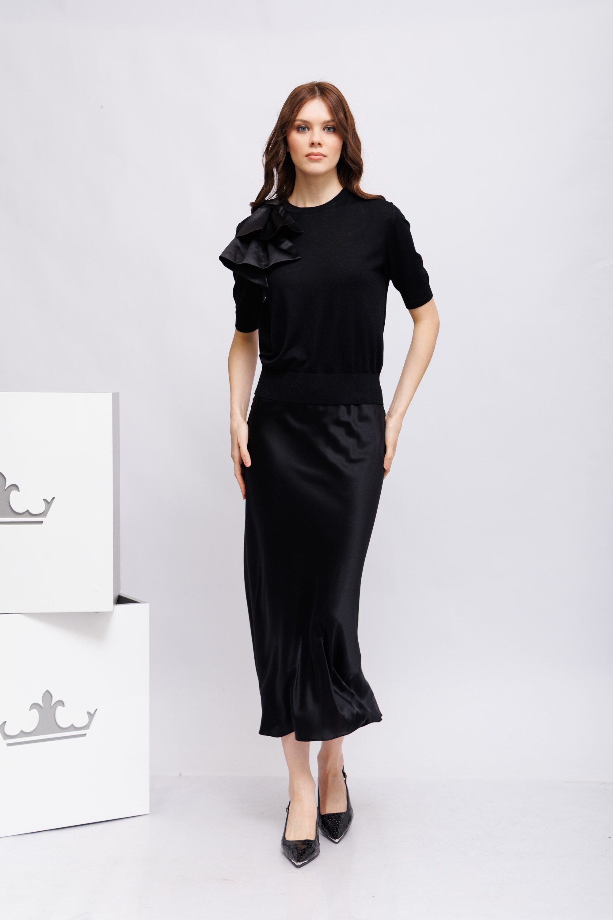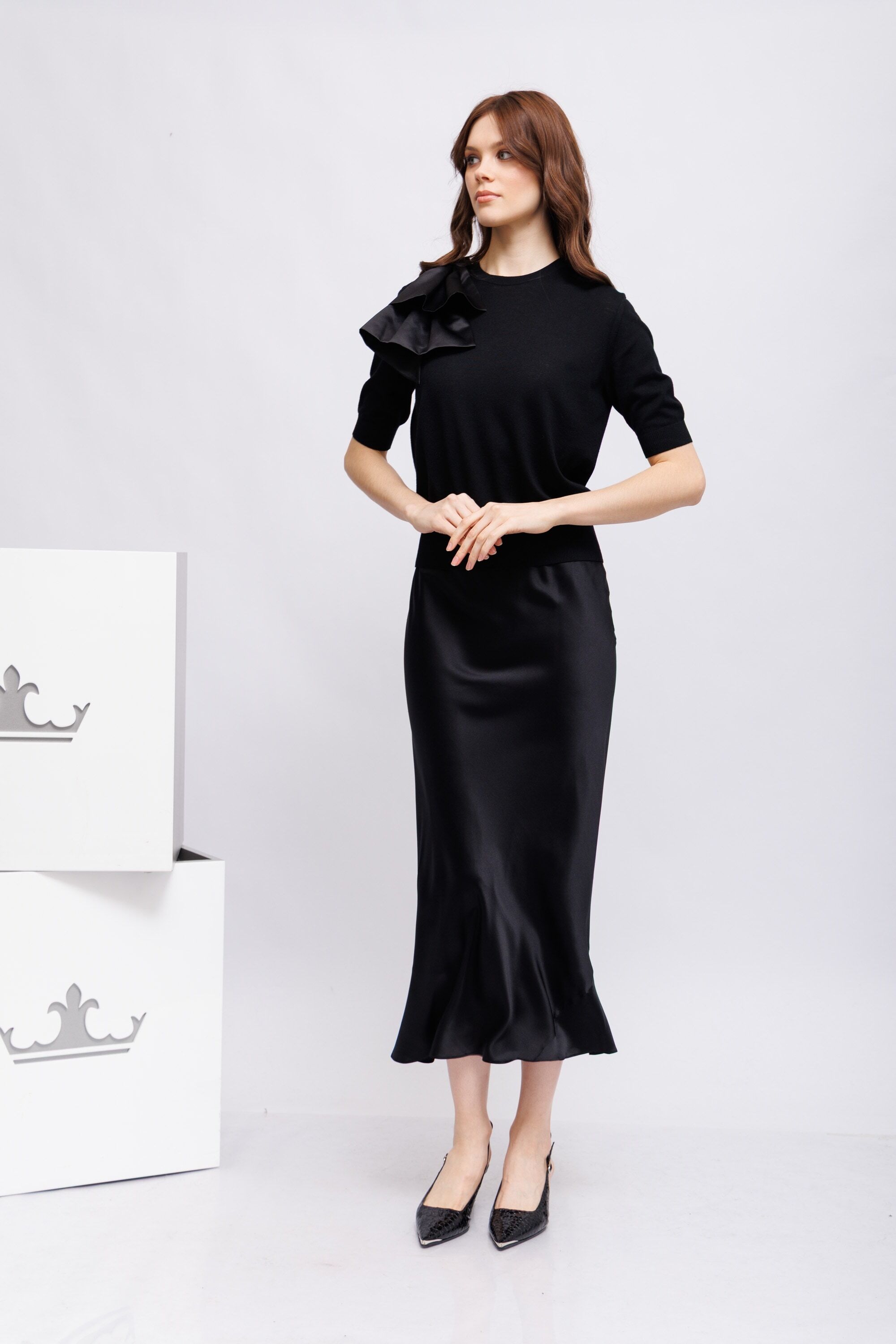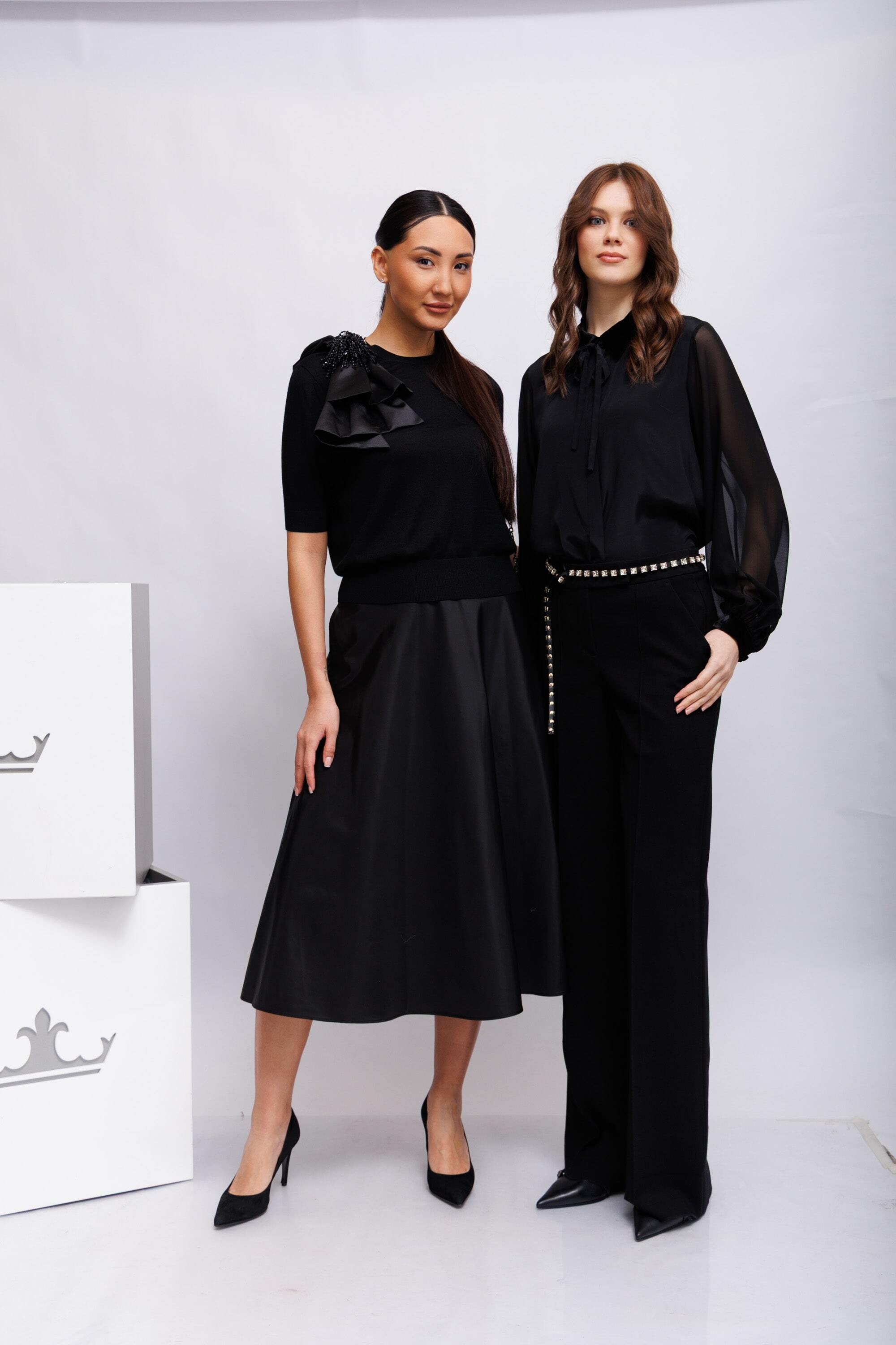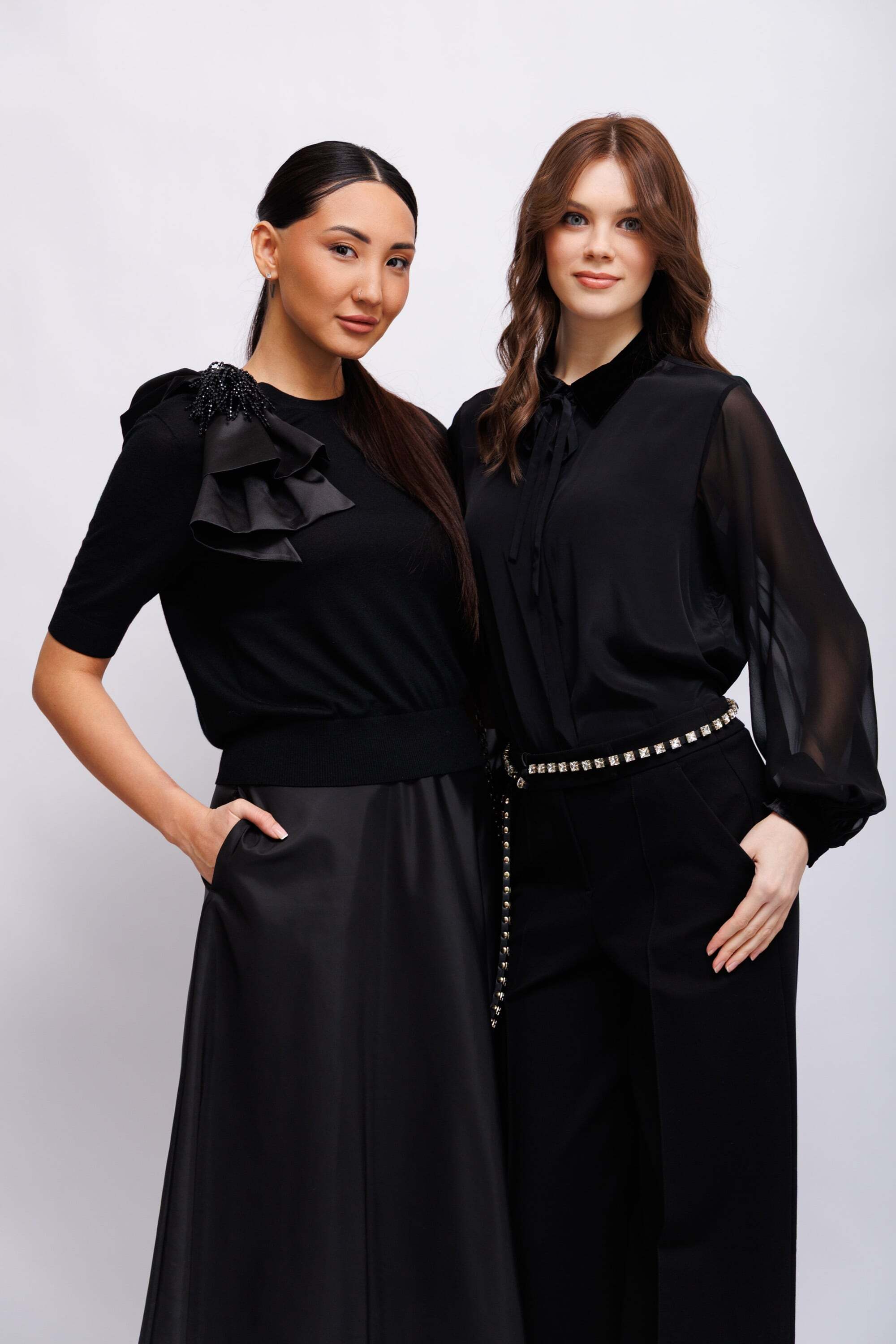 Пуловер черный из натуральной мериносовой шерсти с атласным бантом