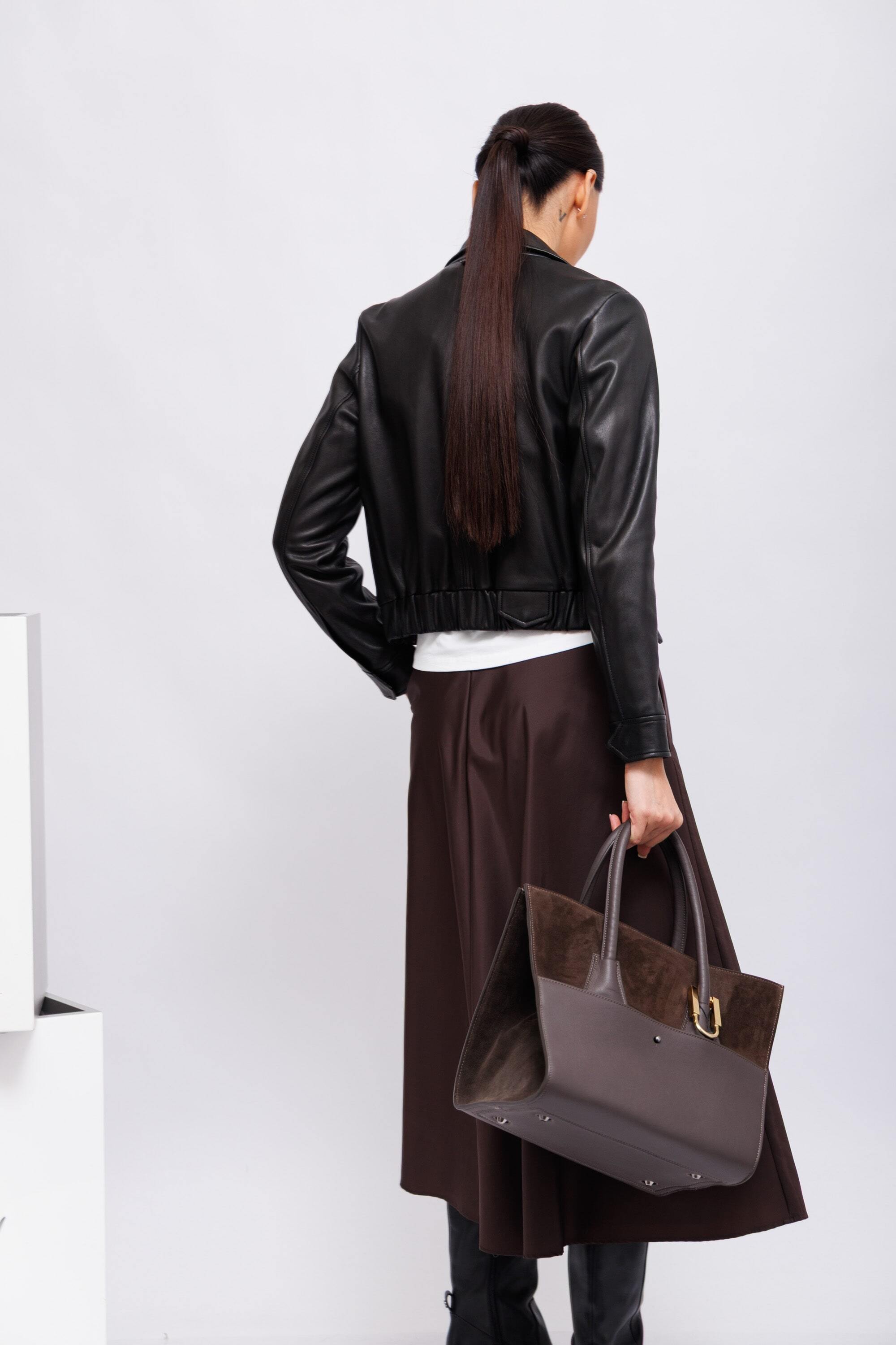 Свободный укороченный фасон имеет плиссированные карманы с клапанами со скрытыми застежками на кнопках и скрытые застежки на кнопках на манжетах. Куртка имеет эластичный подол и петлю для подвешивания на затылке.
