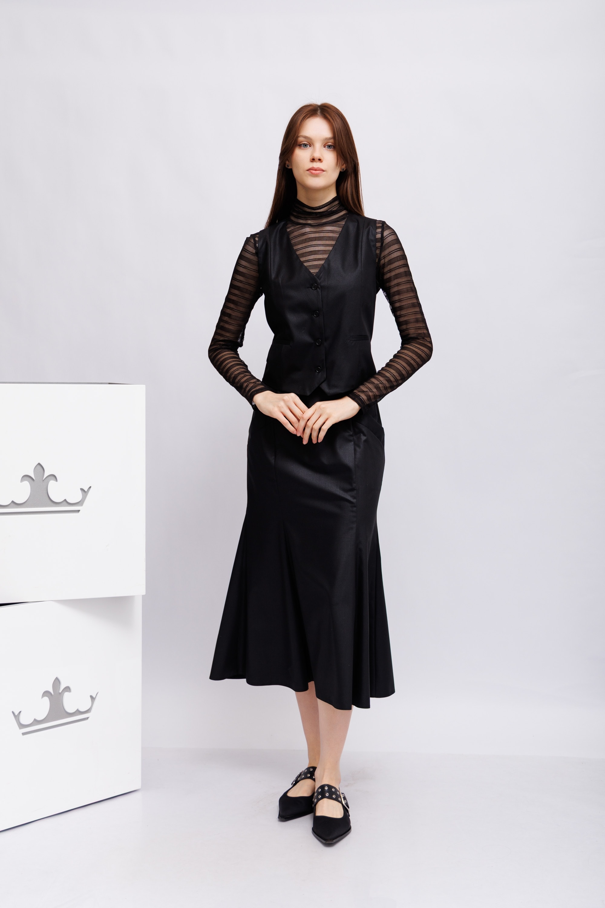 Сетчатая полупрозрачная водолазка черного цвета с длинными рукавами в горизонтальные полосы. Ворот высокий. Узкий крой. Сзади- вырез — капля и три пуговицы