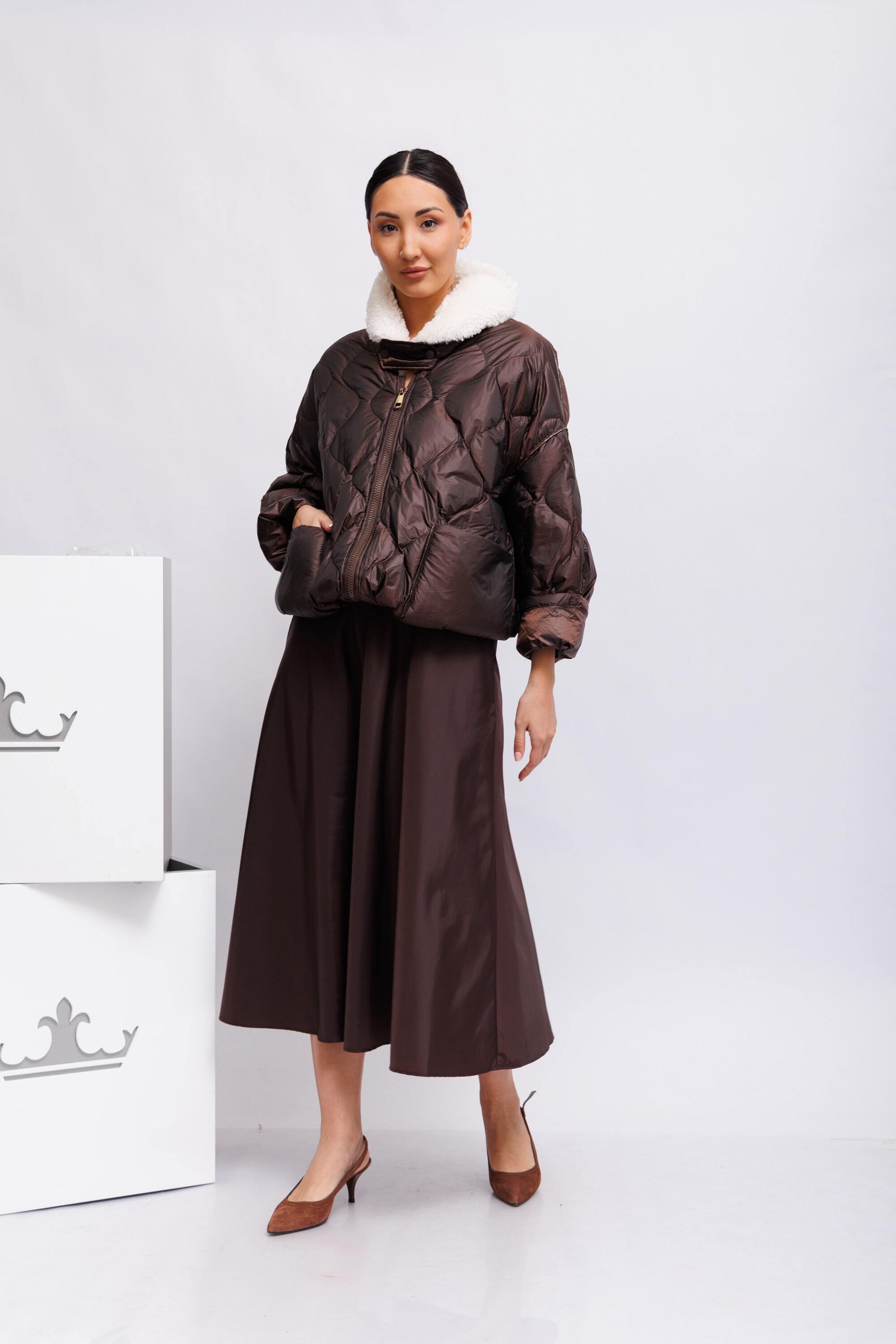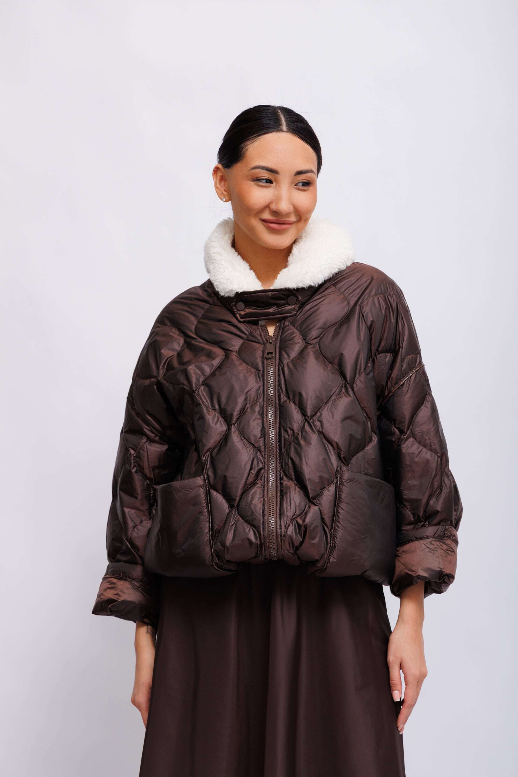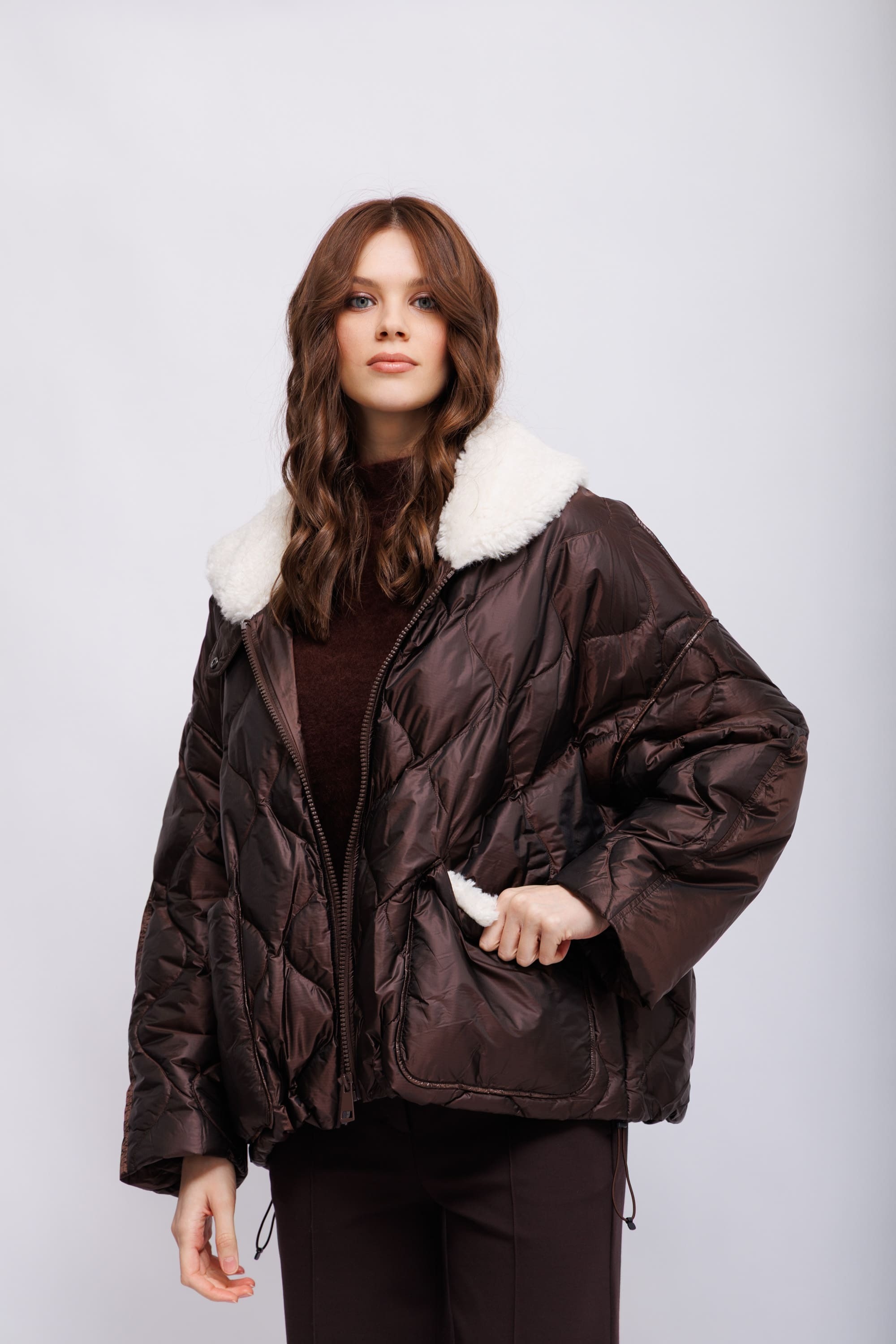 Стеганая пуховая куртка слегка свободного кроя имеет контрастный воротник-шаль из искусственного меха. Уютная модель застегивается на молнию спереди и имеет шнурки на поясе. Карманы внутри также отделаны теплым эко-мехом, чтобы Ваши нежные руки всегда были согреты