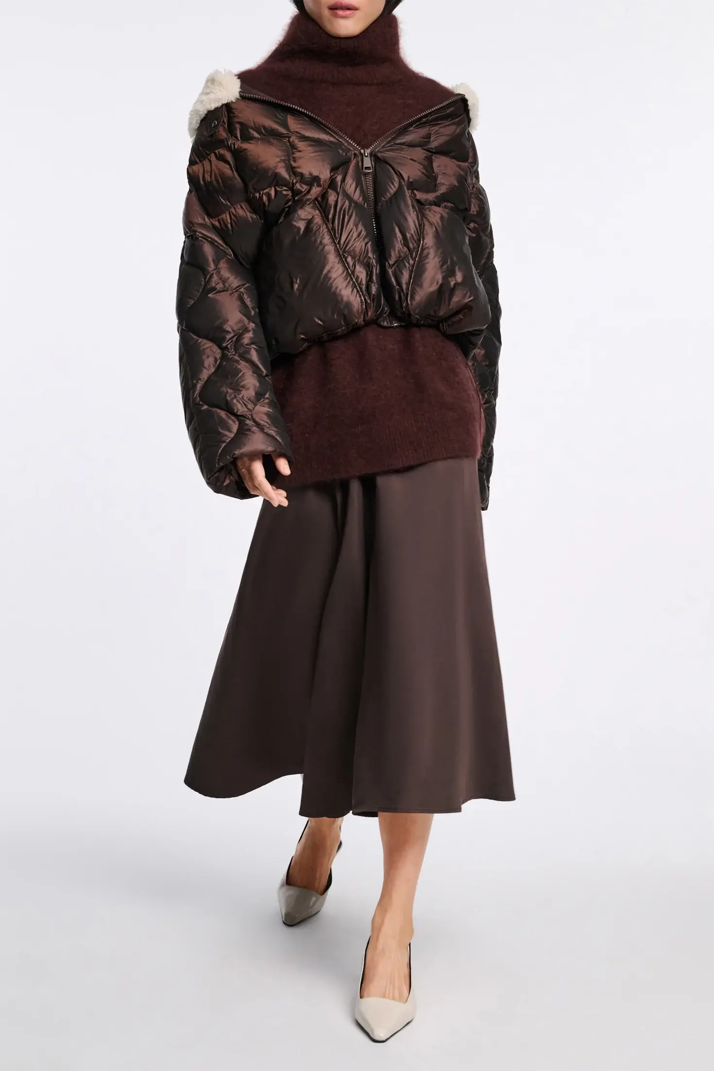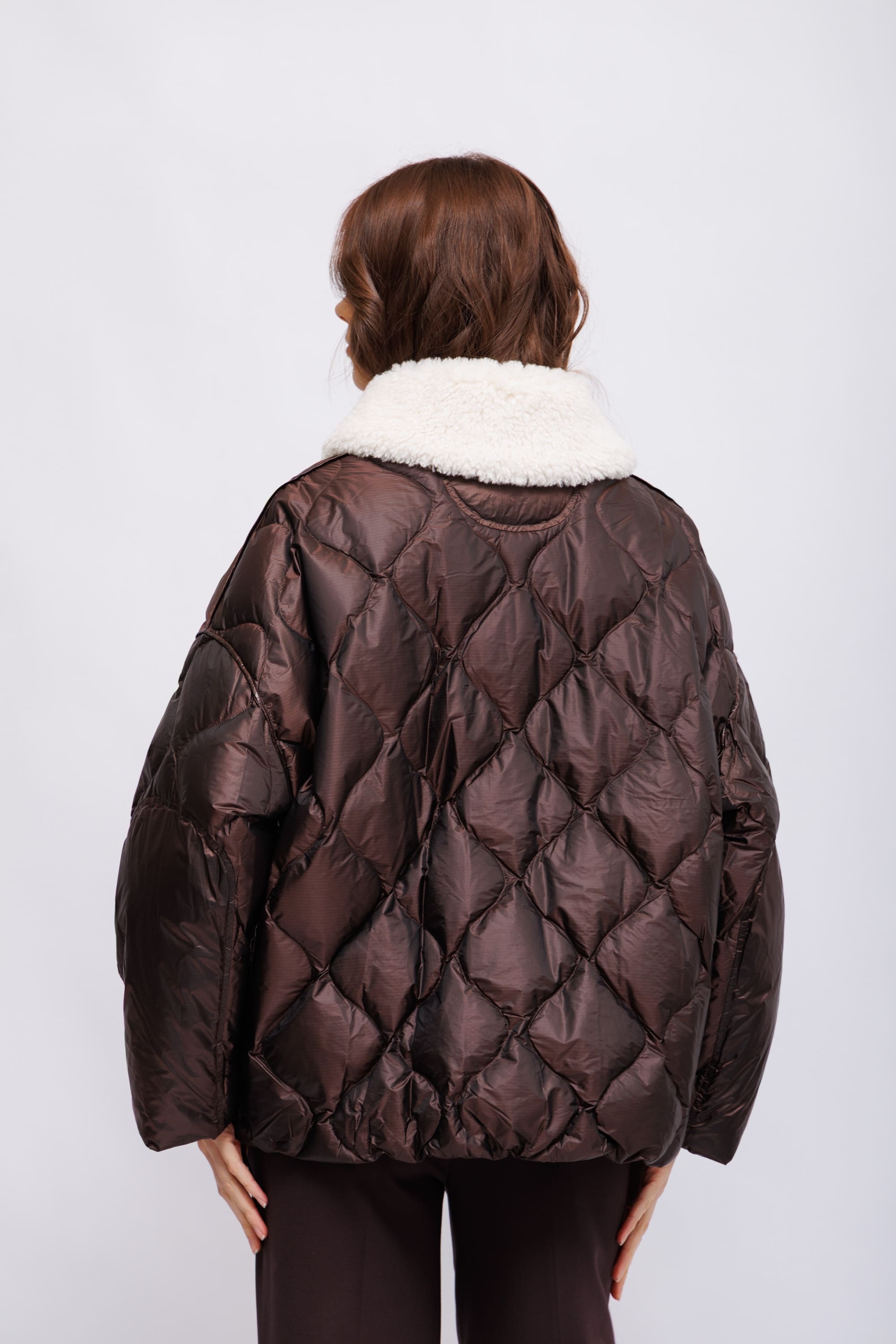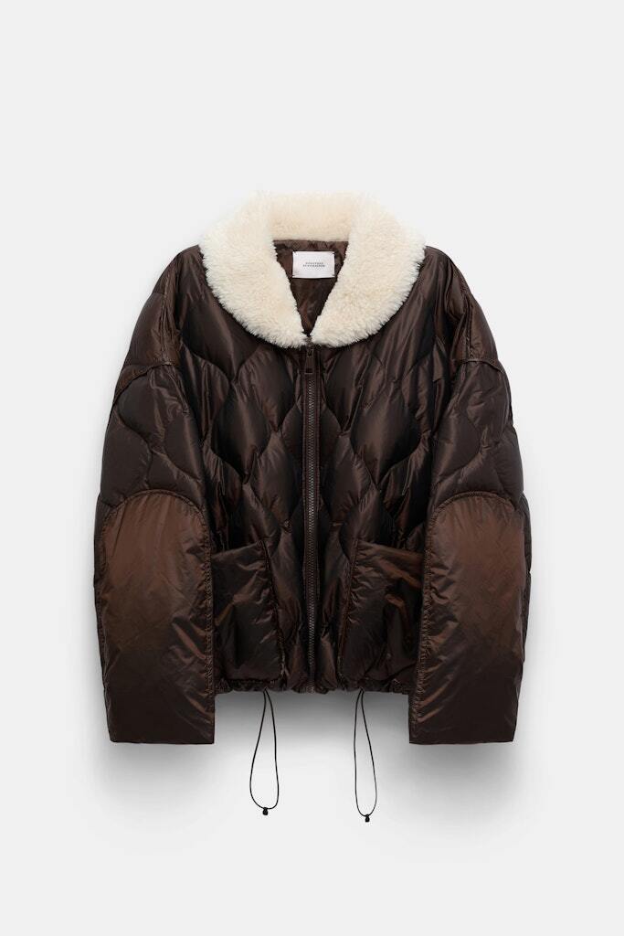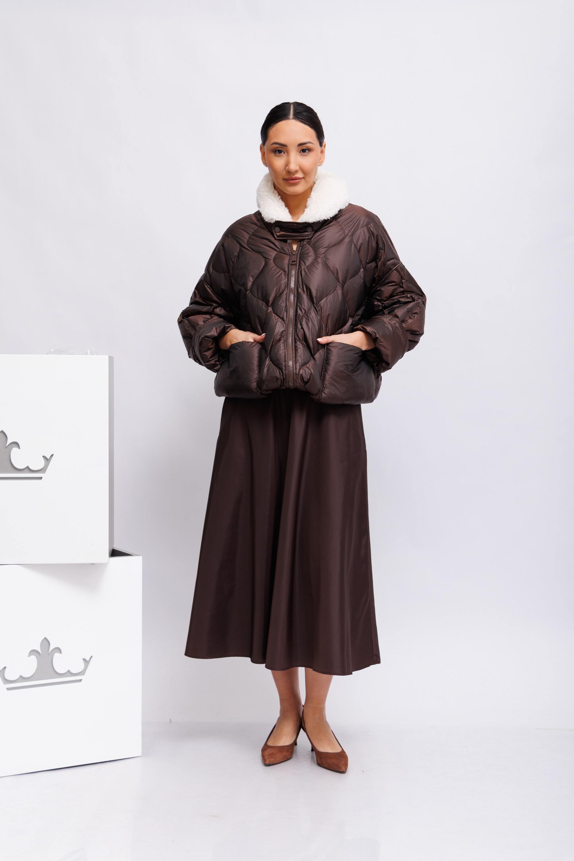 Стеганая пуховая куртка слегка свободного кроя имеет контрастный воротник-шаль из искусственного меха. Уютная модель застегивается на молнию спереди и имеет шнурки на поясе. Карманы внутри также отделаны теплым эко-мехом, чтобы Ваши нежные руки всегда были согреты