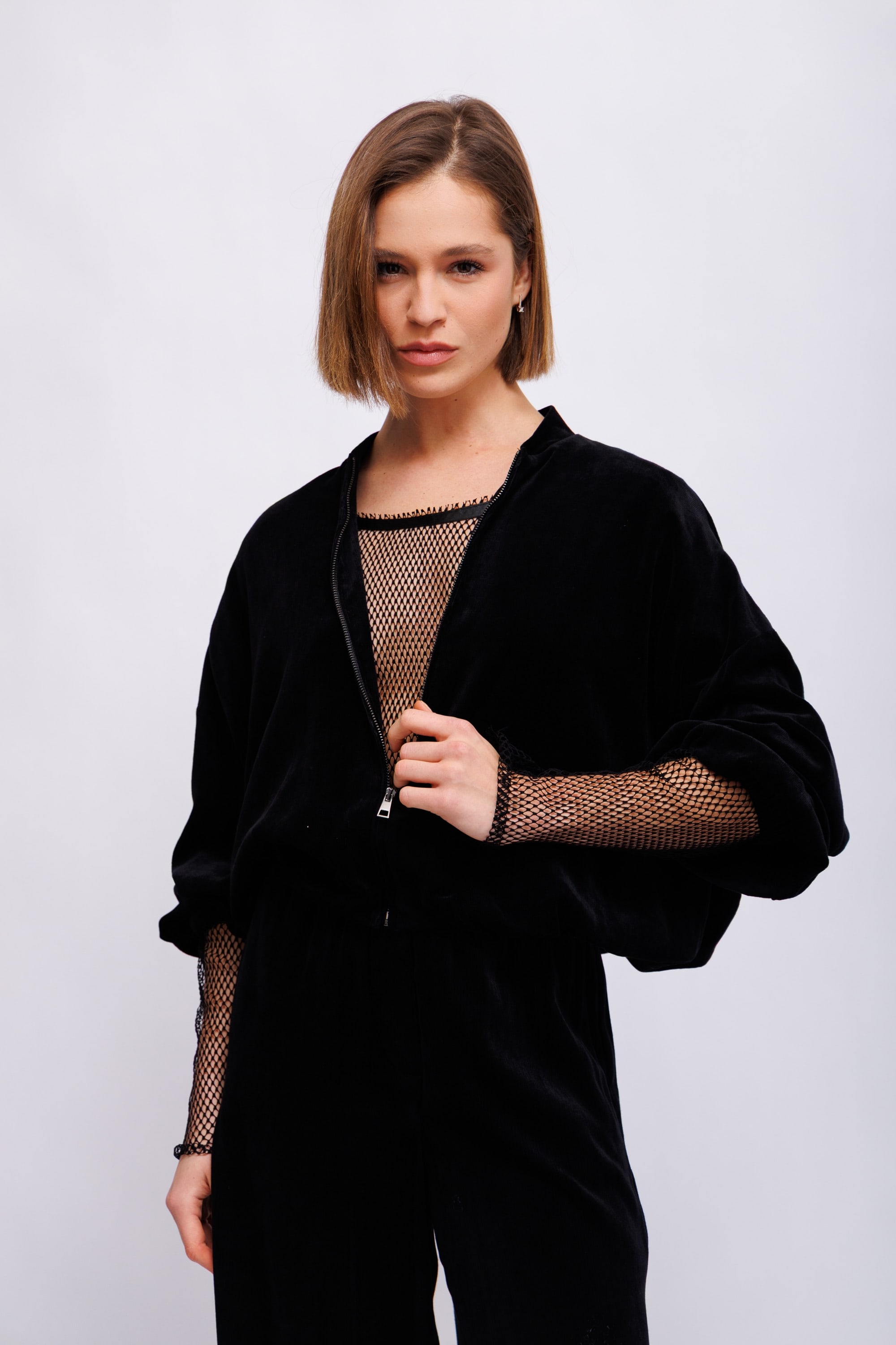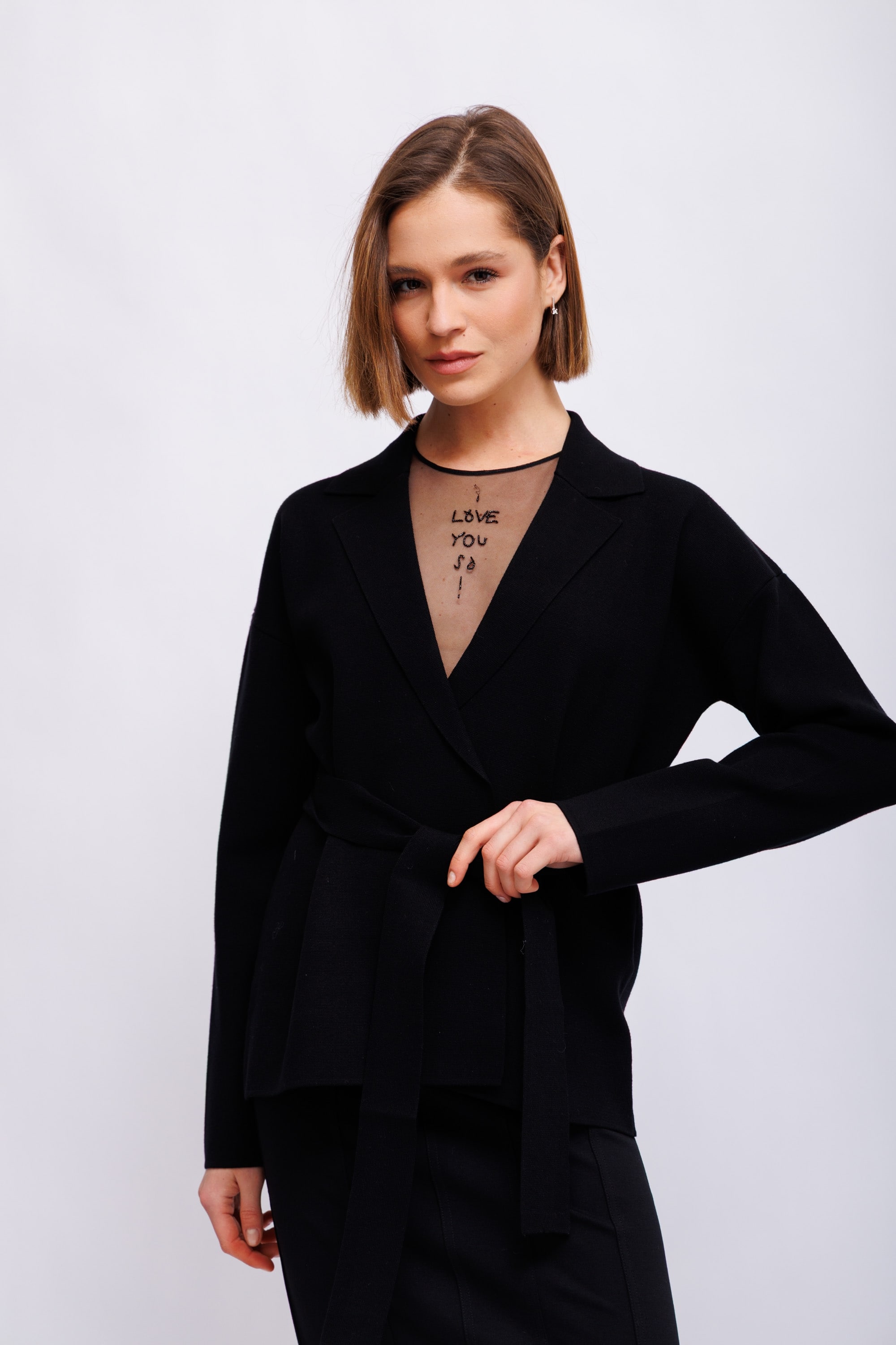 Полупрозрачный топ черного цвета без рукавов укороченный свободного кроя. Спереди на груди- надпись бисером «I LOVE YOU SO» («Я ТАК ТЕБЯ ЛЮБЛЮ»,- пер. с англ.). Сзади- вырез — капля на пуговице