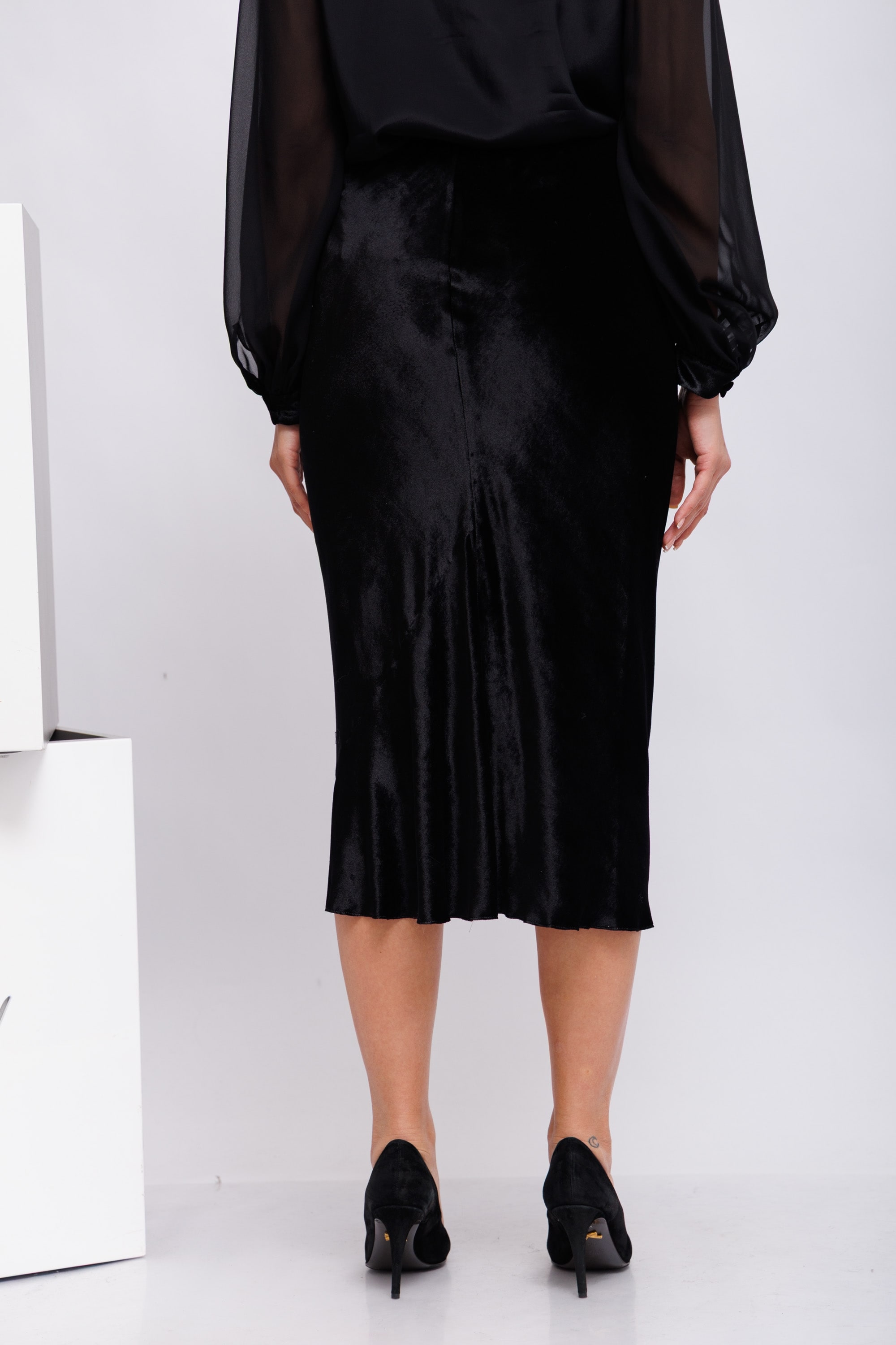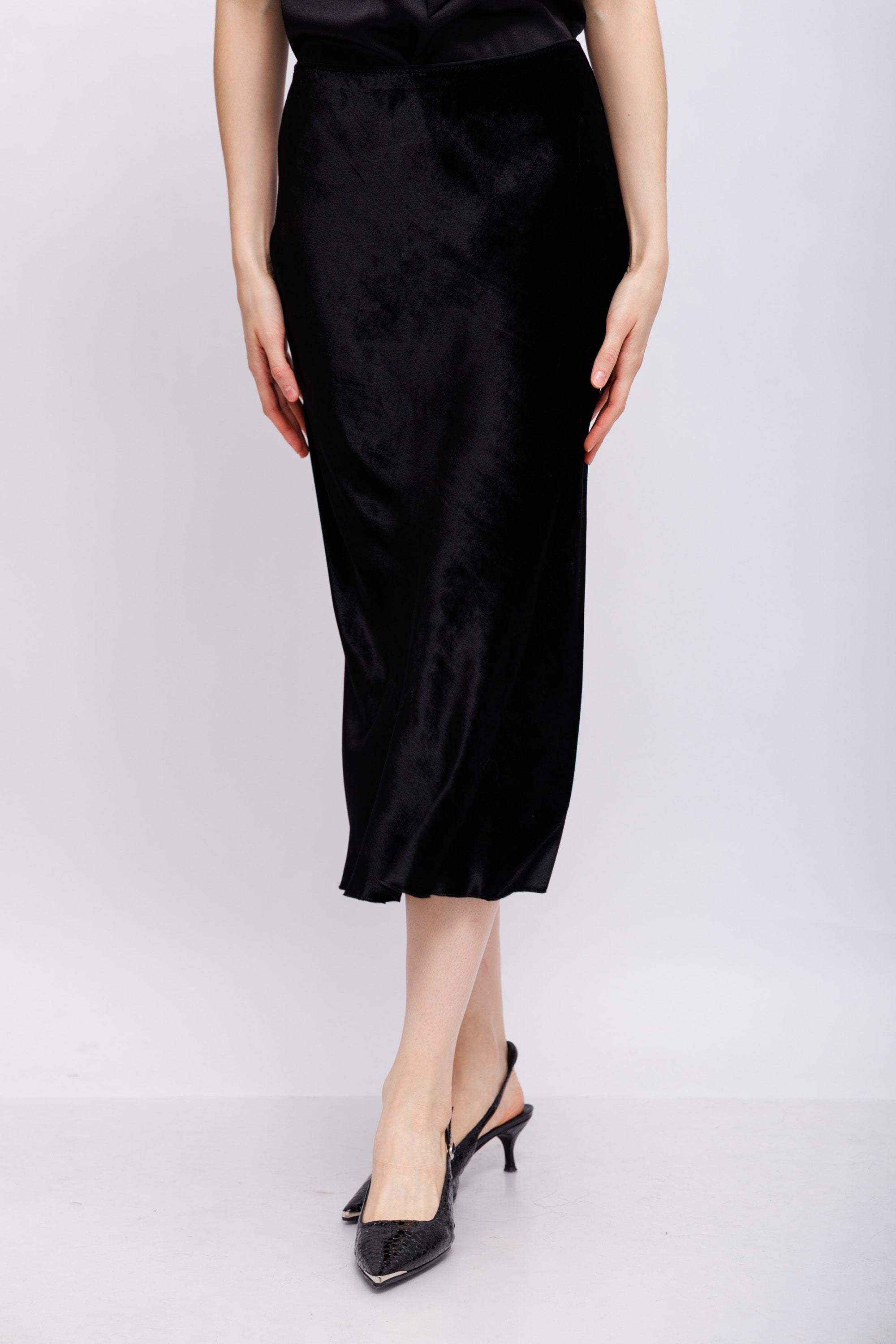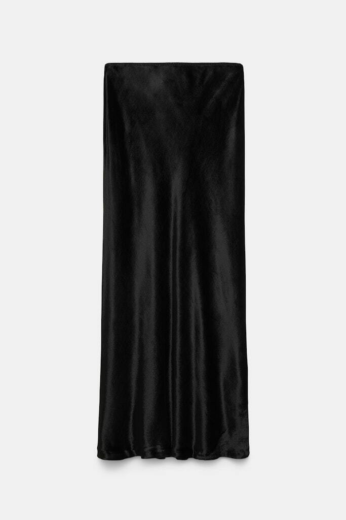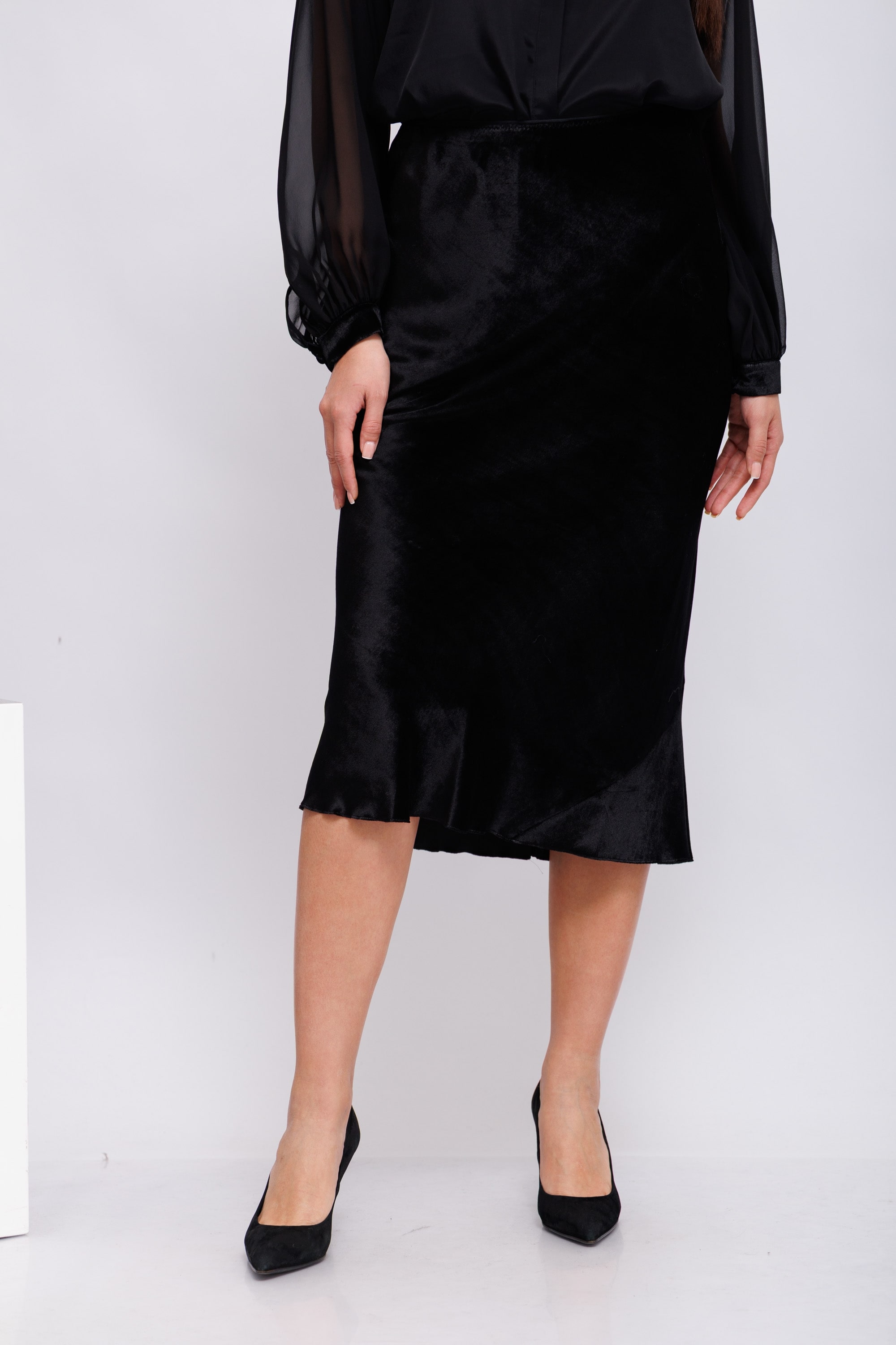 Юбка-миди косого кроя выполнена из блестящего бархата и имеет эластичный пояс. Юбку можно носить в комплекте с подходящей бархатной блузкой с воротником. Эластичный пояс